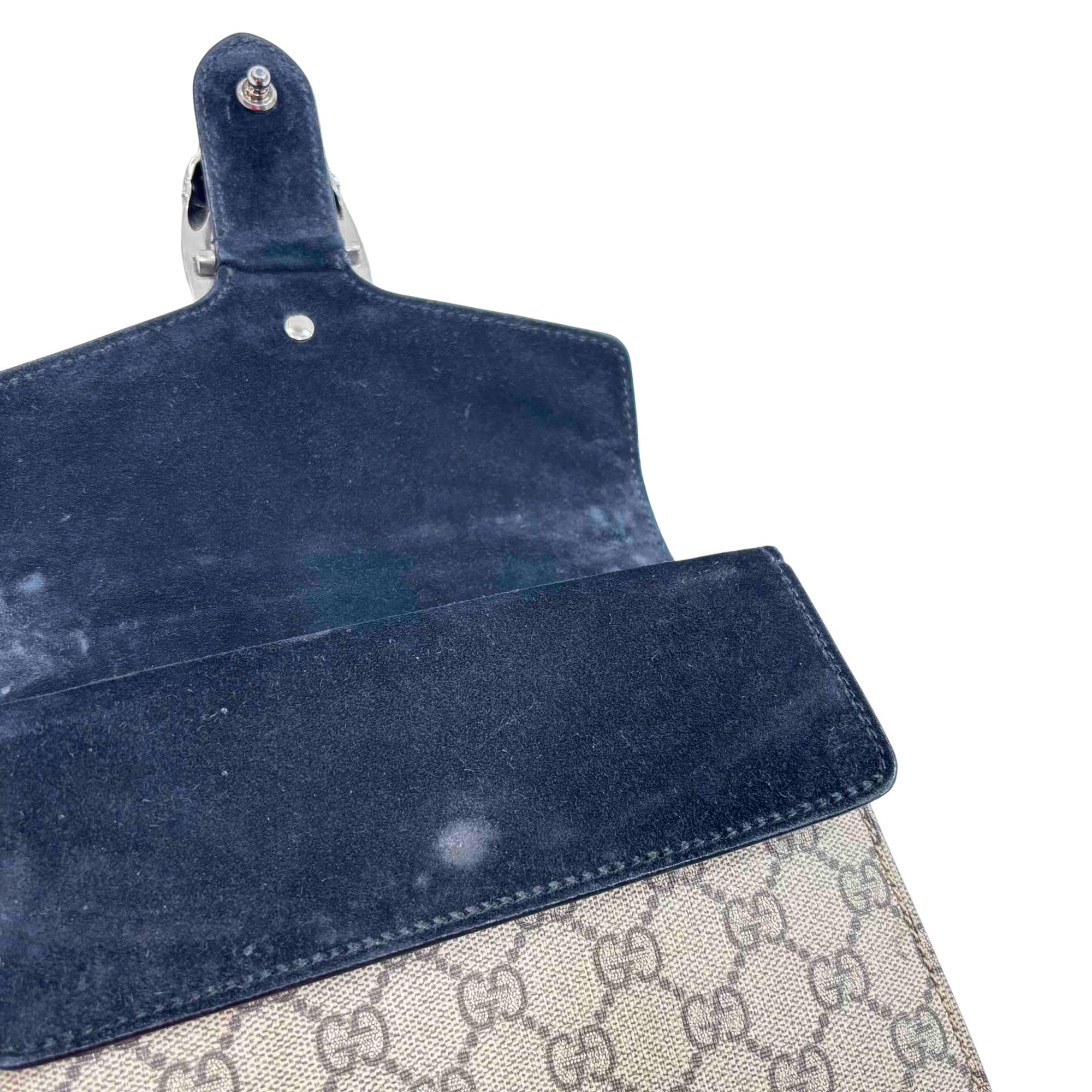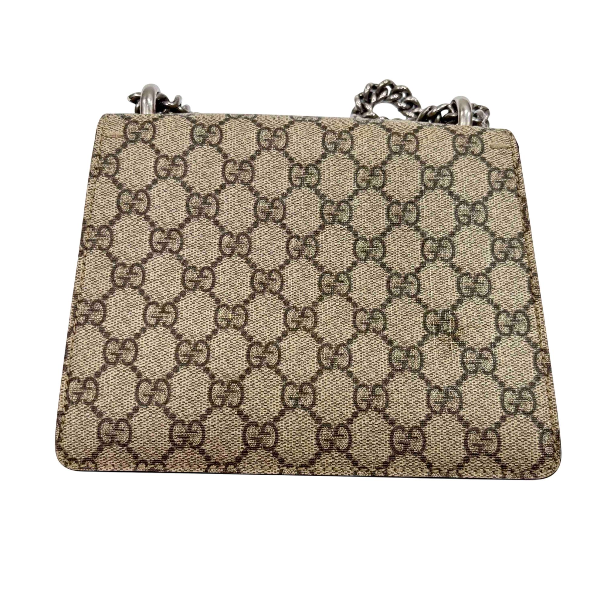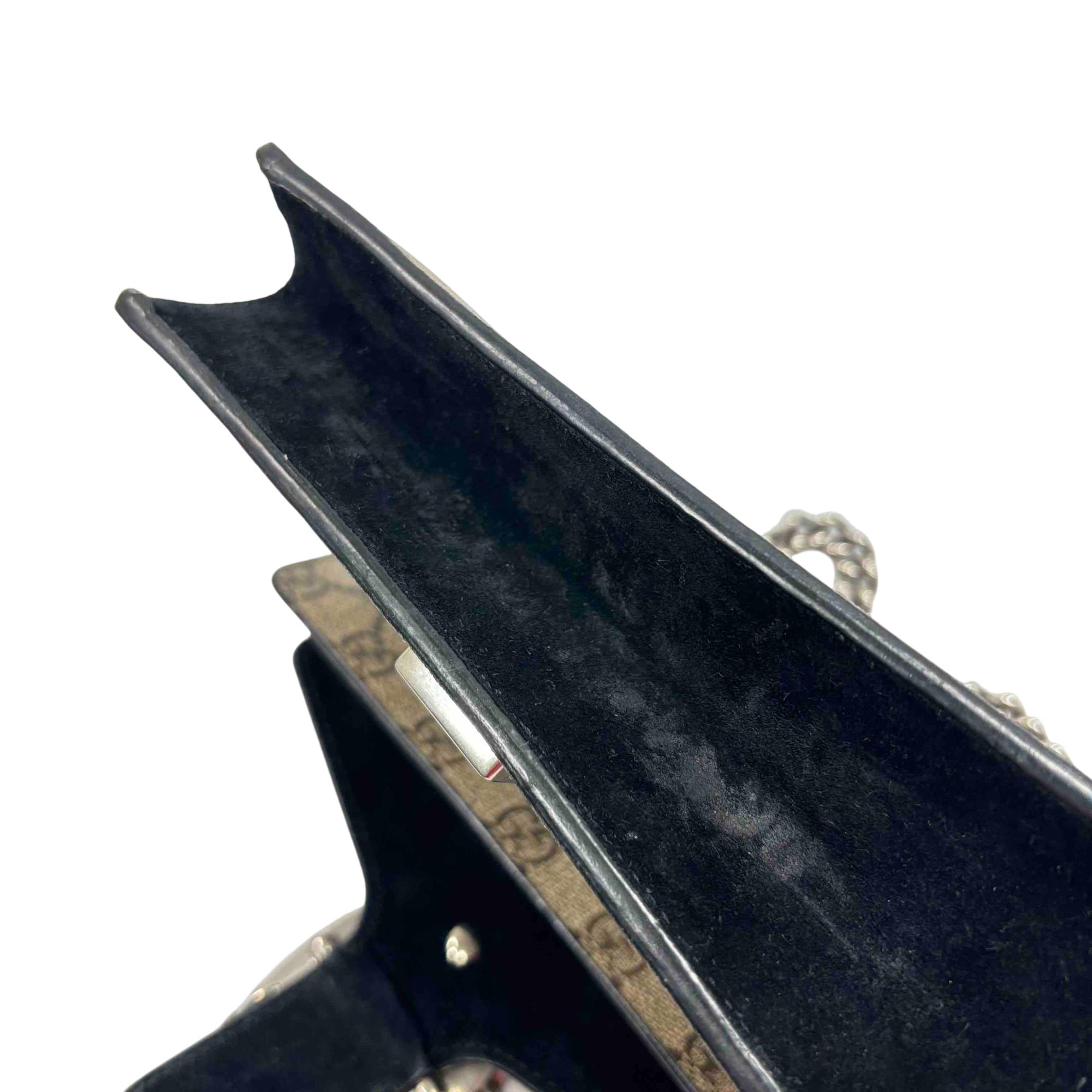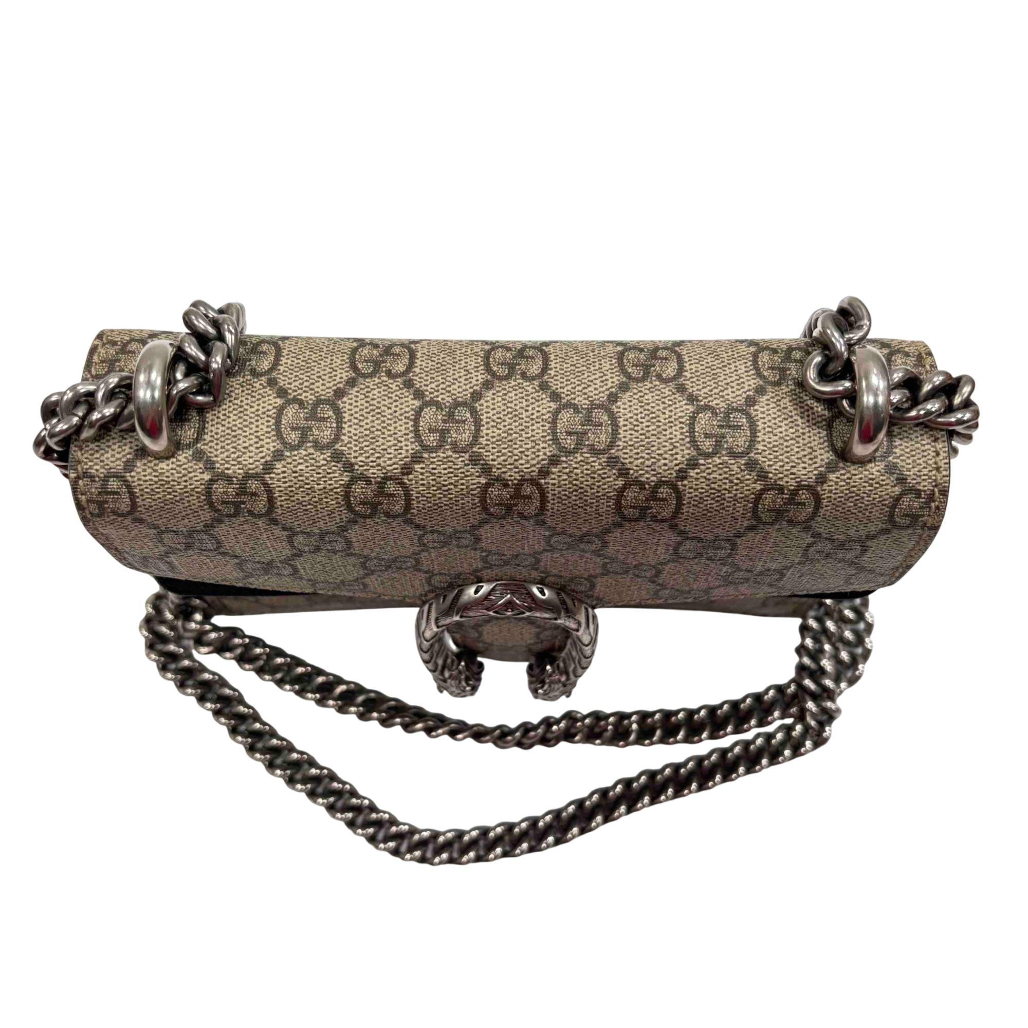 Elevate your style with the Gucci Dionysus GG Supreme Mini Shoulder Bag. Featuring a sleek black leather design, this iconic accessory is adorned with a silver chain strap and the distinctive Dionysus buckle, complete with a unique snake-skin pattern. Perfectly blending luxury and function, this bag makes a bold statement for any fashion-forward individual.