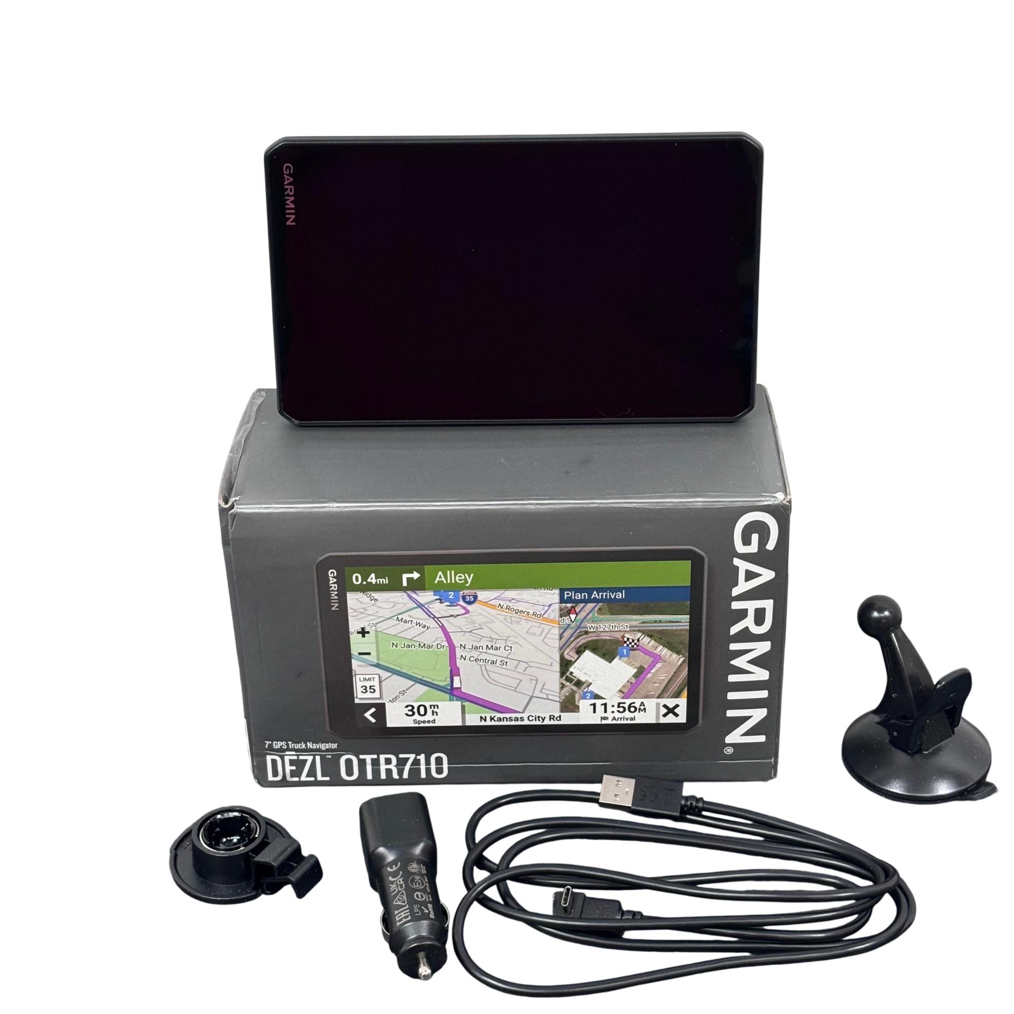 Garmin dezl OTR710 7" GPS Truck Navigator offers a large, easy-to-read 7-inch display designed specifically for truck drivers, featuring custom routing tailored to truck dimensions and road restrictions. This device provides detailed maps with real-time traffic updates and optimized navigation for efficient and safe trucking routes.