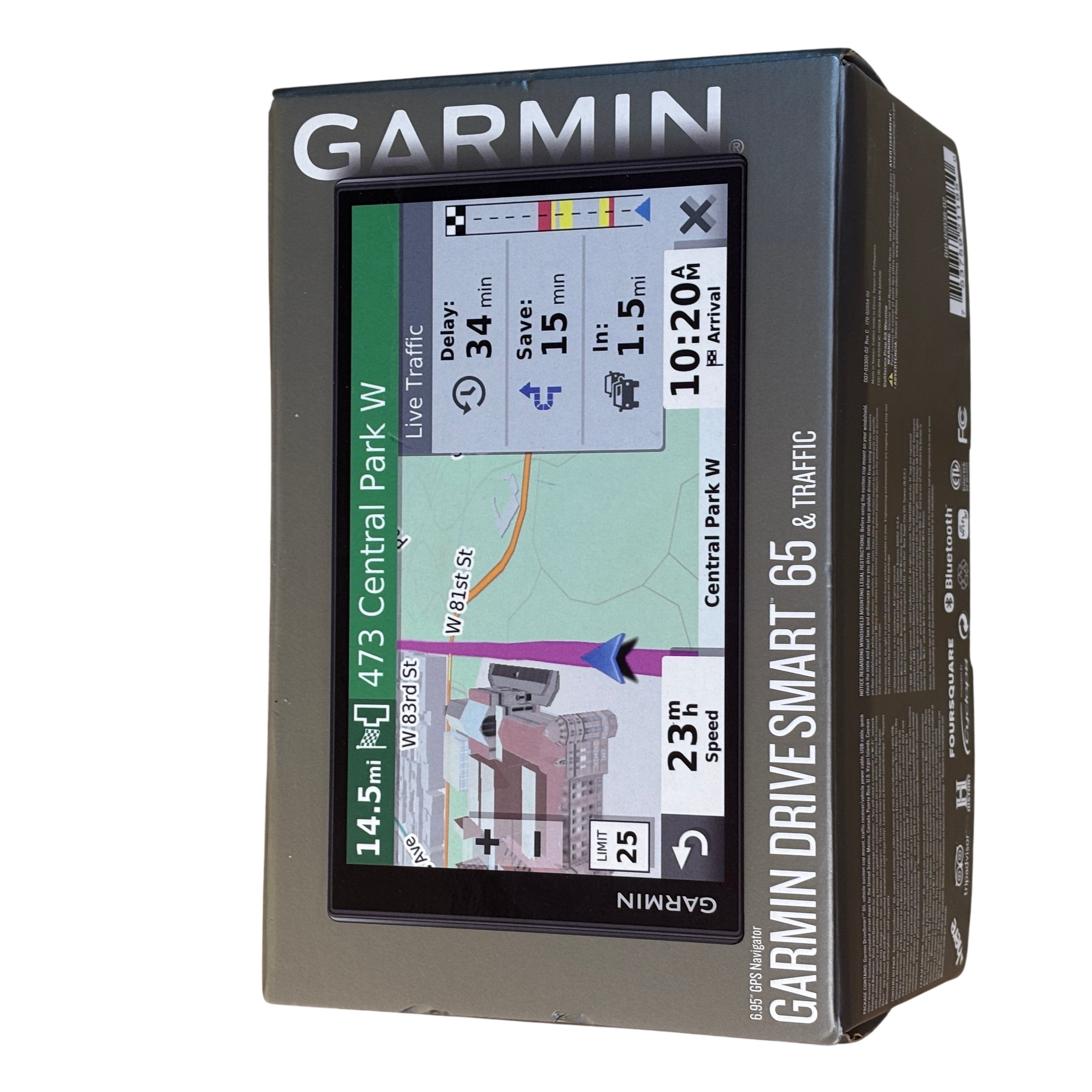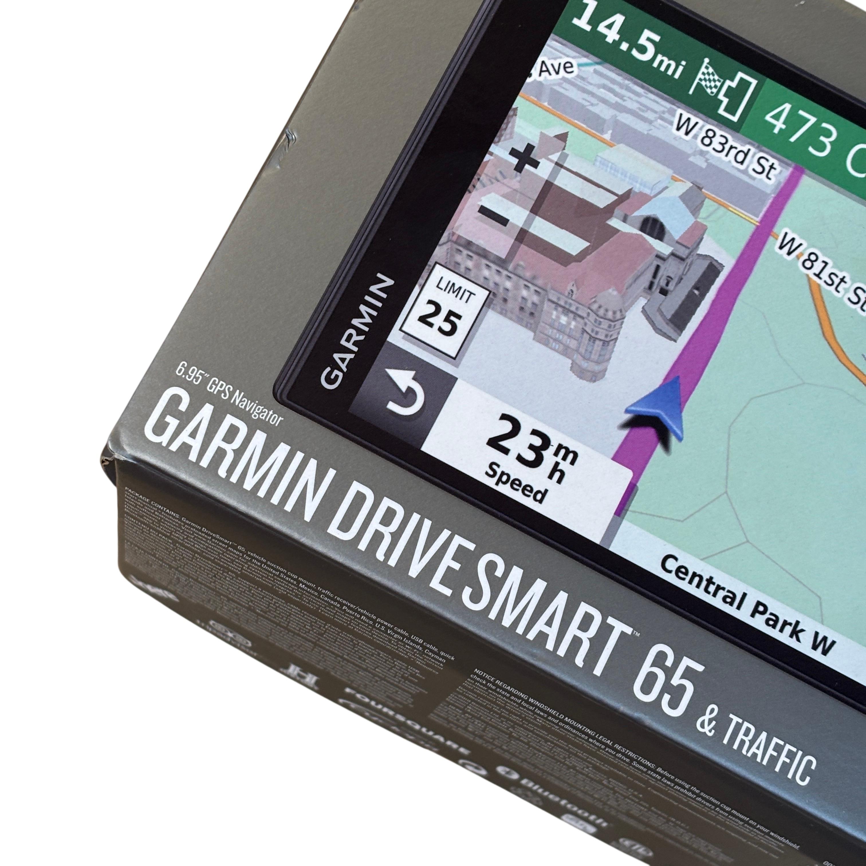 The Garmin DriveSmart 65 MT is a high-resolution automotive GPS navigator featuring a 6.95-inch edge-to-edge display. The "MT" designation indicates it includes Lifetime Maps and Traffic updates. It is designed for drivers who want a dedicated navigation device with a large, easy-to-read screen and integrated smart features like voice control and Wi-Fi connectivity.