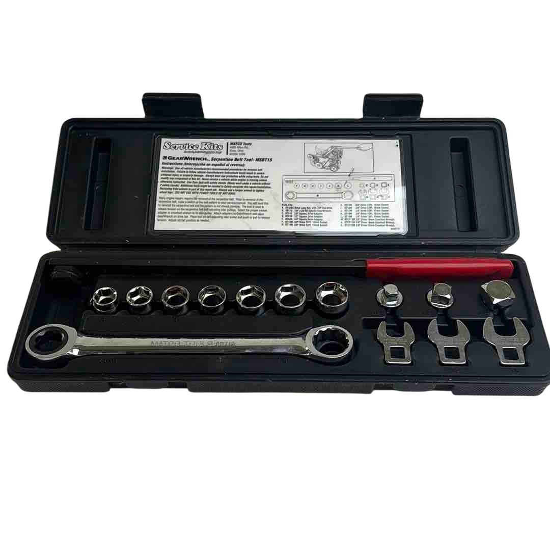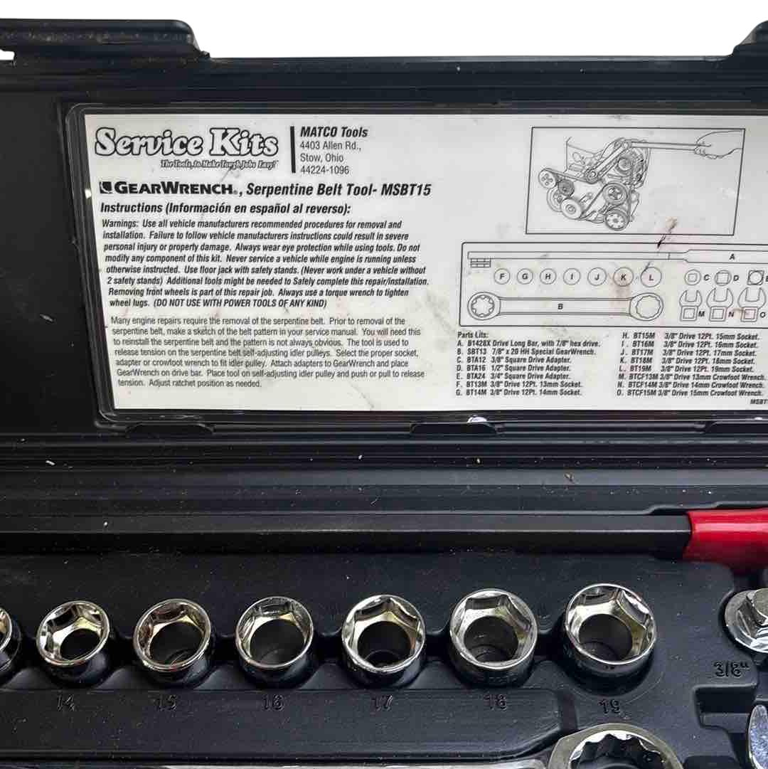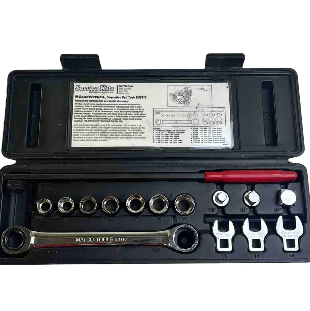 Enhance your automotive repair efficiency with the Matco MSBT15 Serpentine Belt Tool! This comprehensive service kit includes a GearWrench, a variety of sockets, and adapters designed for quick and safe serpentine belt removal and installation. Perfect for professionals and DIY enthusiasts, it ensures precise tension release on self-adjusting idler pulleys for a smooth, worry-free operation.