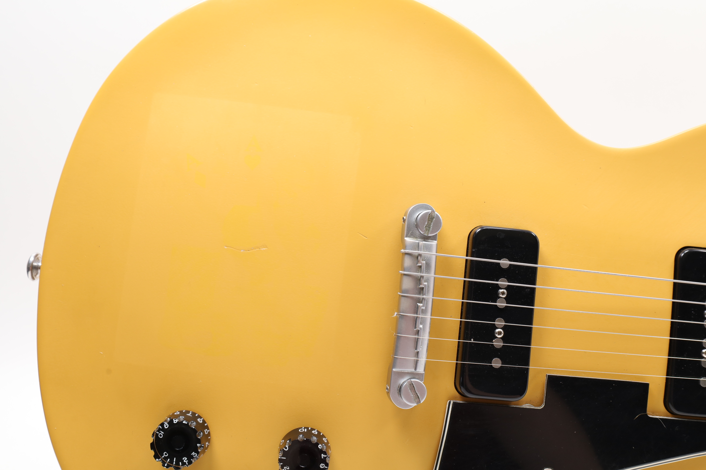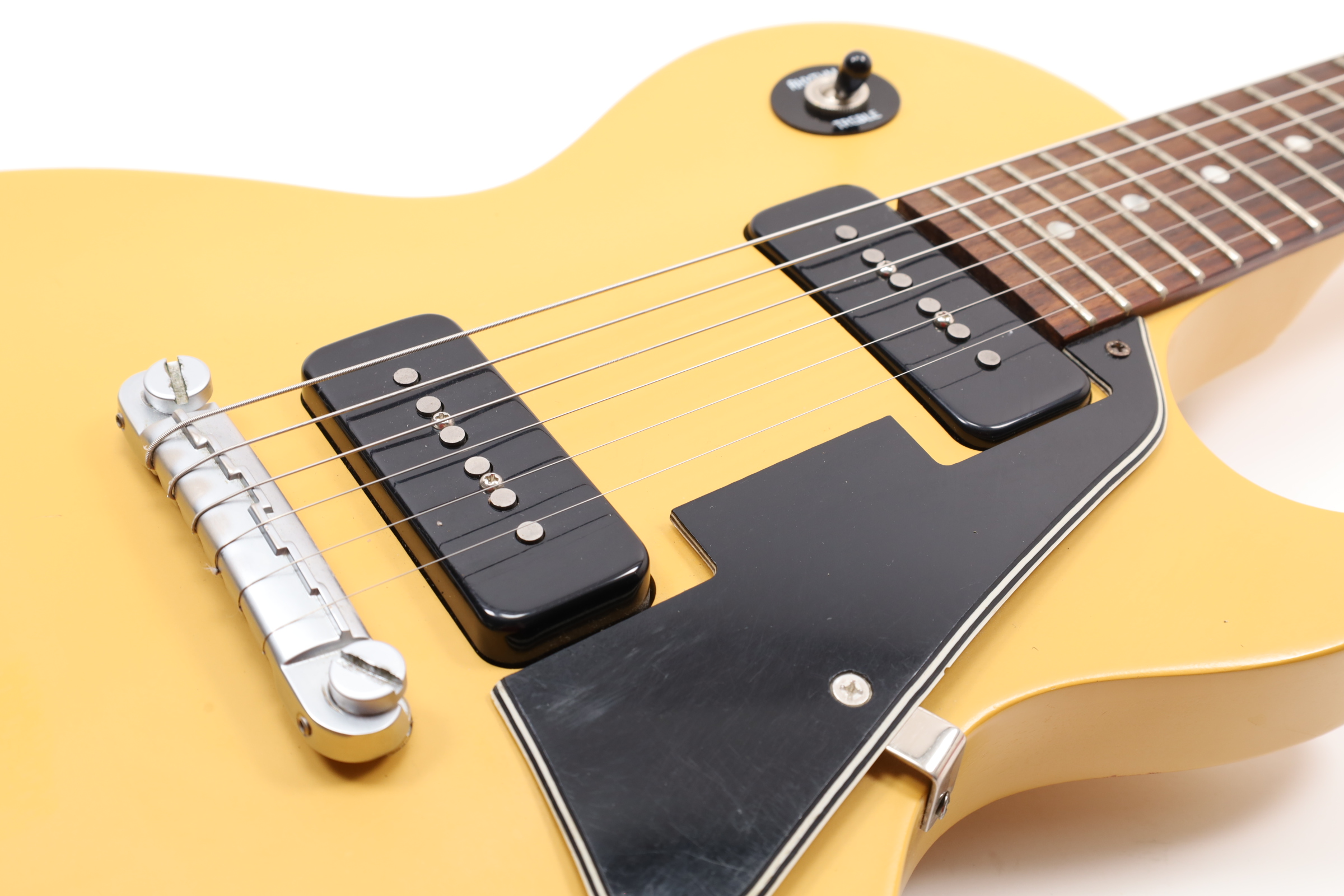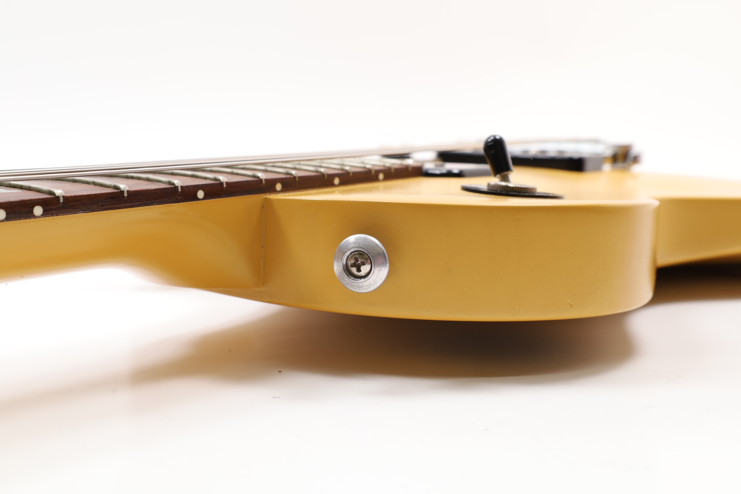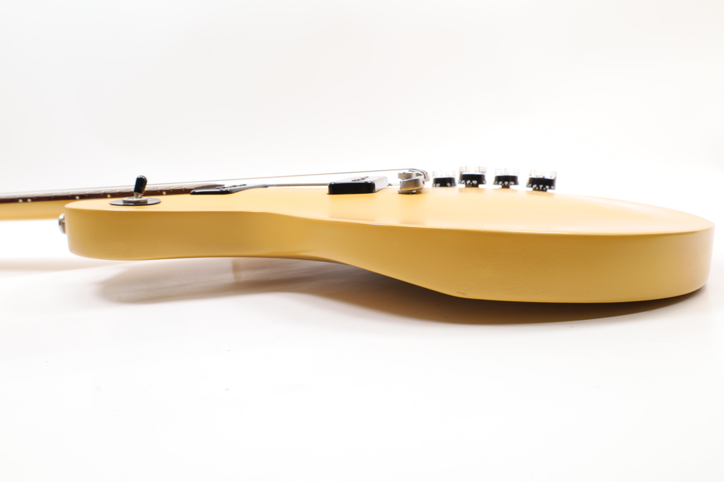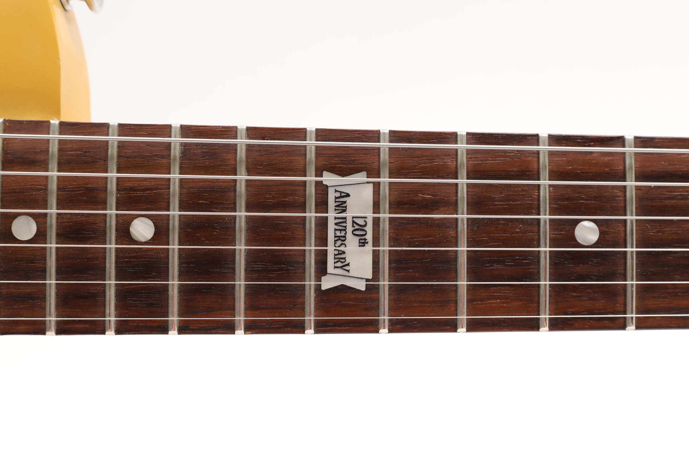 Marking the 120th anniversary, is a right-handed electric guitar with six strings, manufactured in the United States. This model features a thin mahogany body with a custom light maple top, all finished in a subtle satin. The neck, made of maple, adopts a '50s rounded profile and is set into the body, topped with a rosewood fingerboard adorned with dot inlays and a distinctive 120th Anniversary banner at the 12th fret. It boasts a pair of P-90 pickups, a satin chrome wraparound bridge, Graph Tech nut, and vintage-inspired retro-white button tuners. The guitar uses max grip speed knobs for volume and tone control, providing a reliable and dynamic playing experience across various music genres.