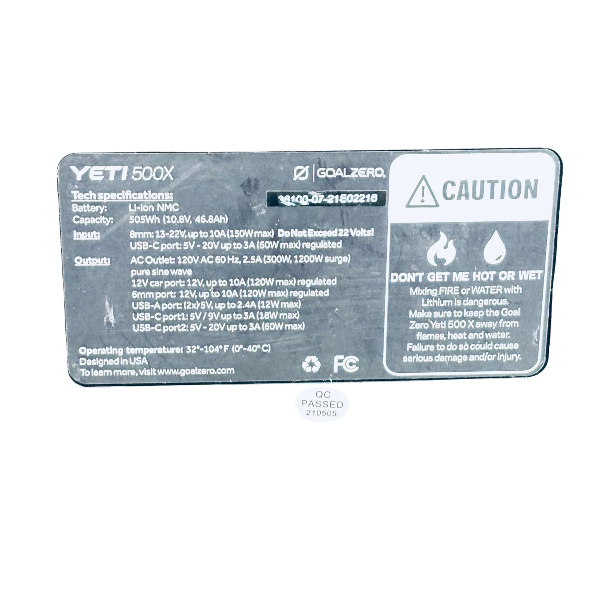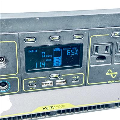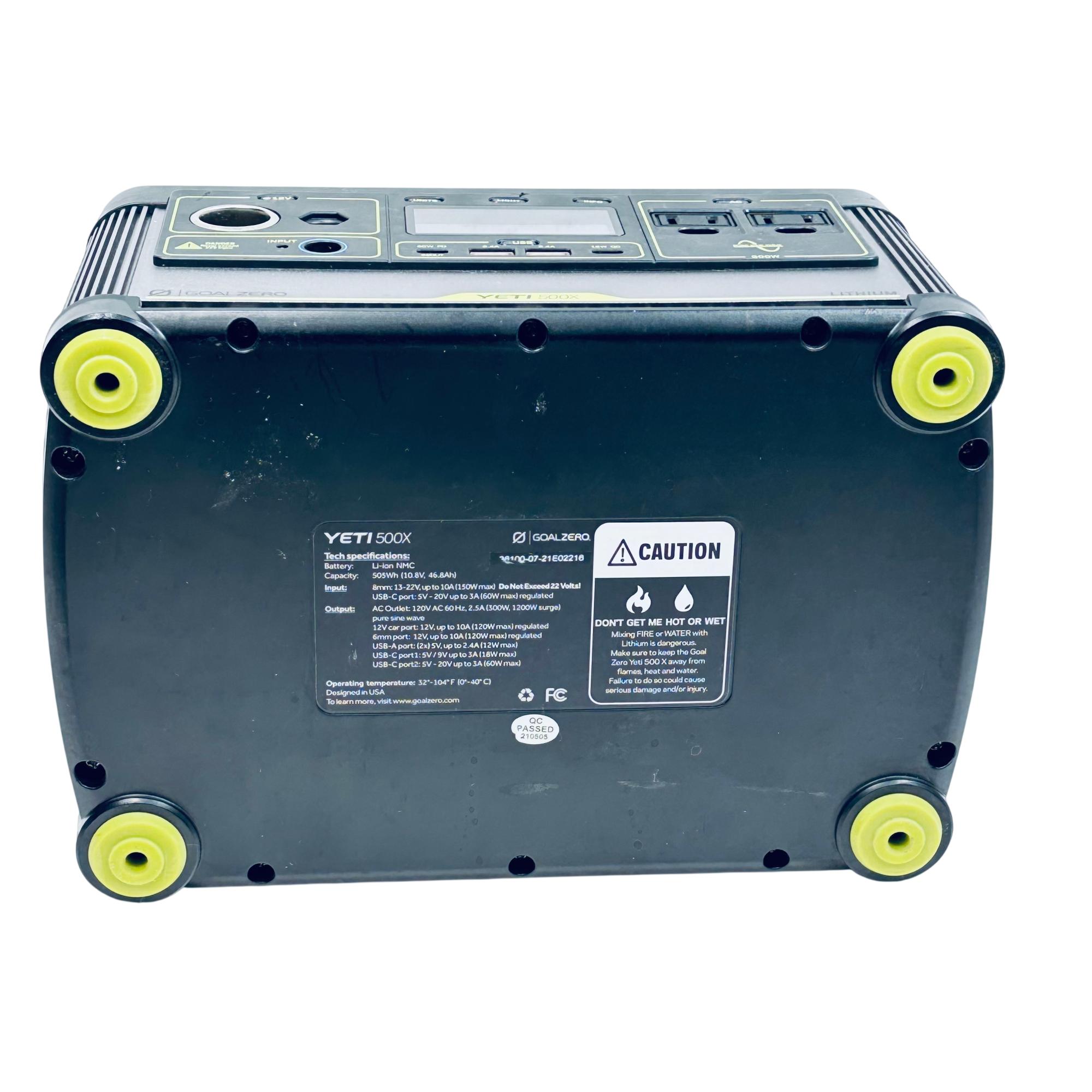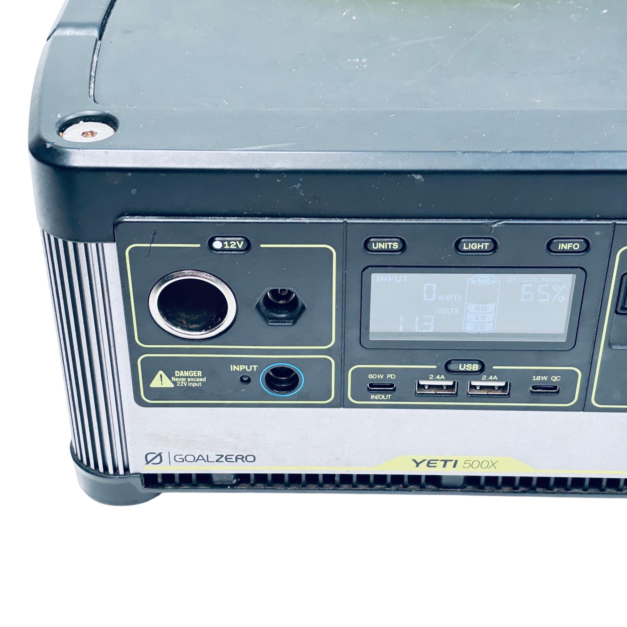 Goal Zero Yeti 500X Portable Power Station offers a compact and versatile power solution with a 500Wh lithium battery capacity. Designed with a robust black and silver metal casing, it features multiple input and output options, including USB and 12V ports, suitable for charging a variety of devices on the go. Its durable build includes a comfortable handle for easy transport, making it ideal for outdoor adventures and emergency power needs.