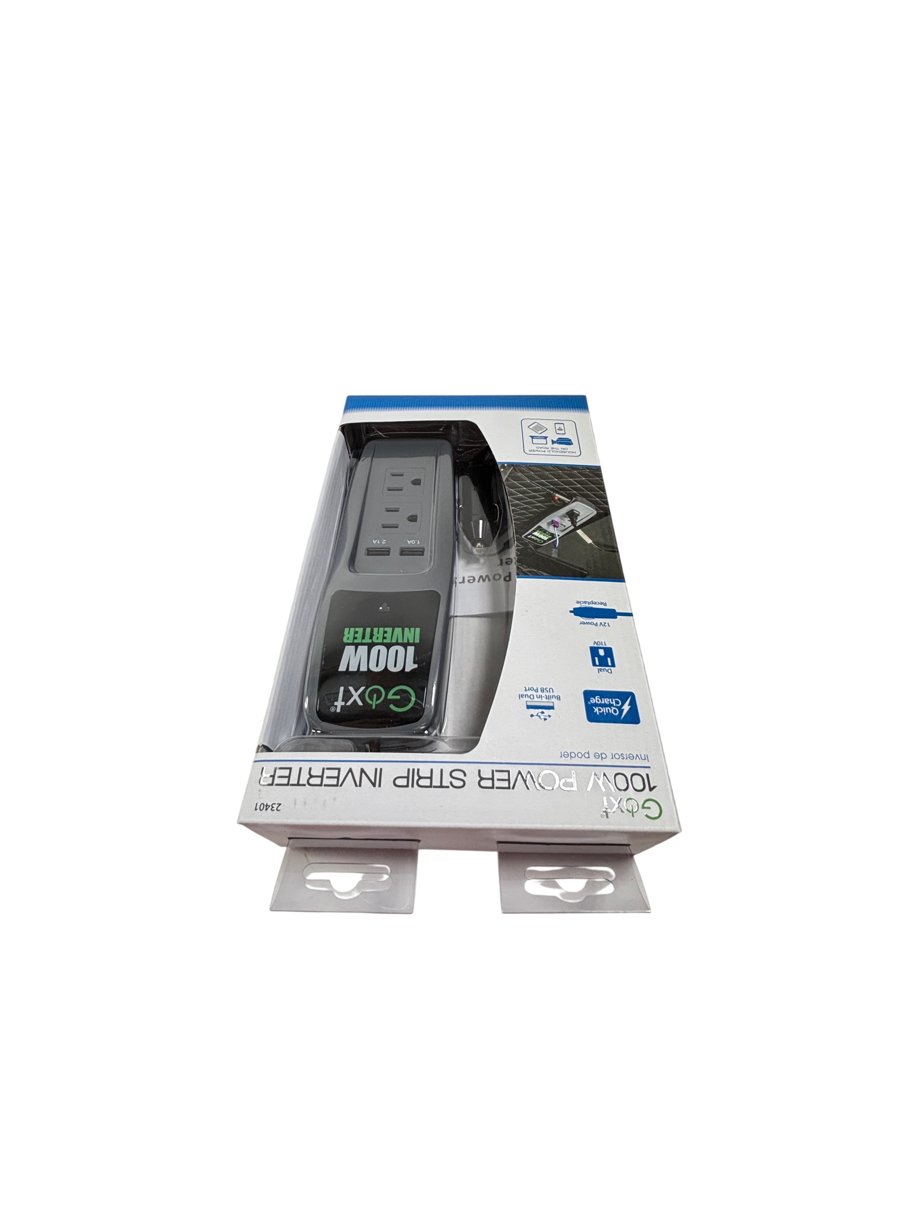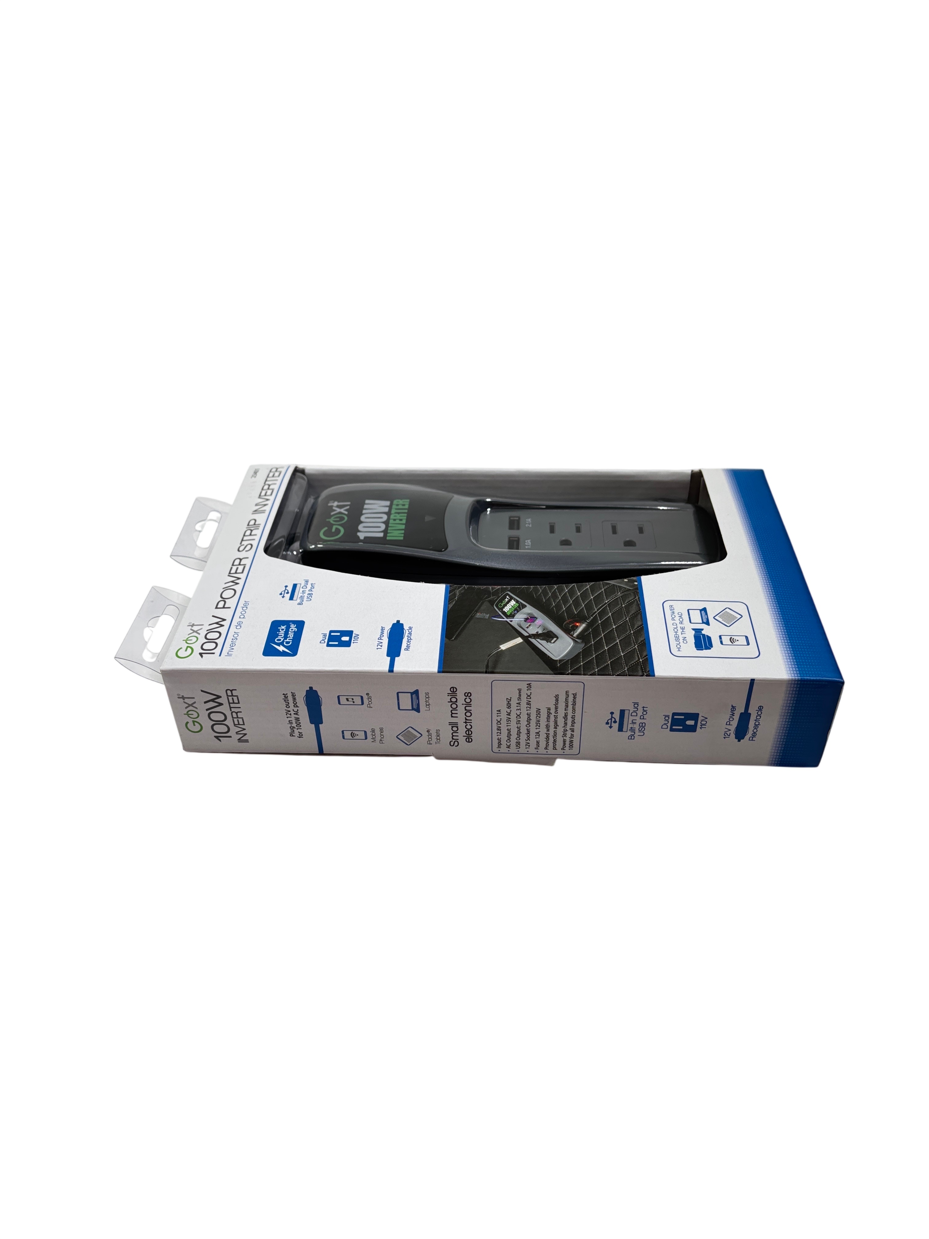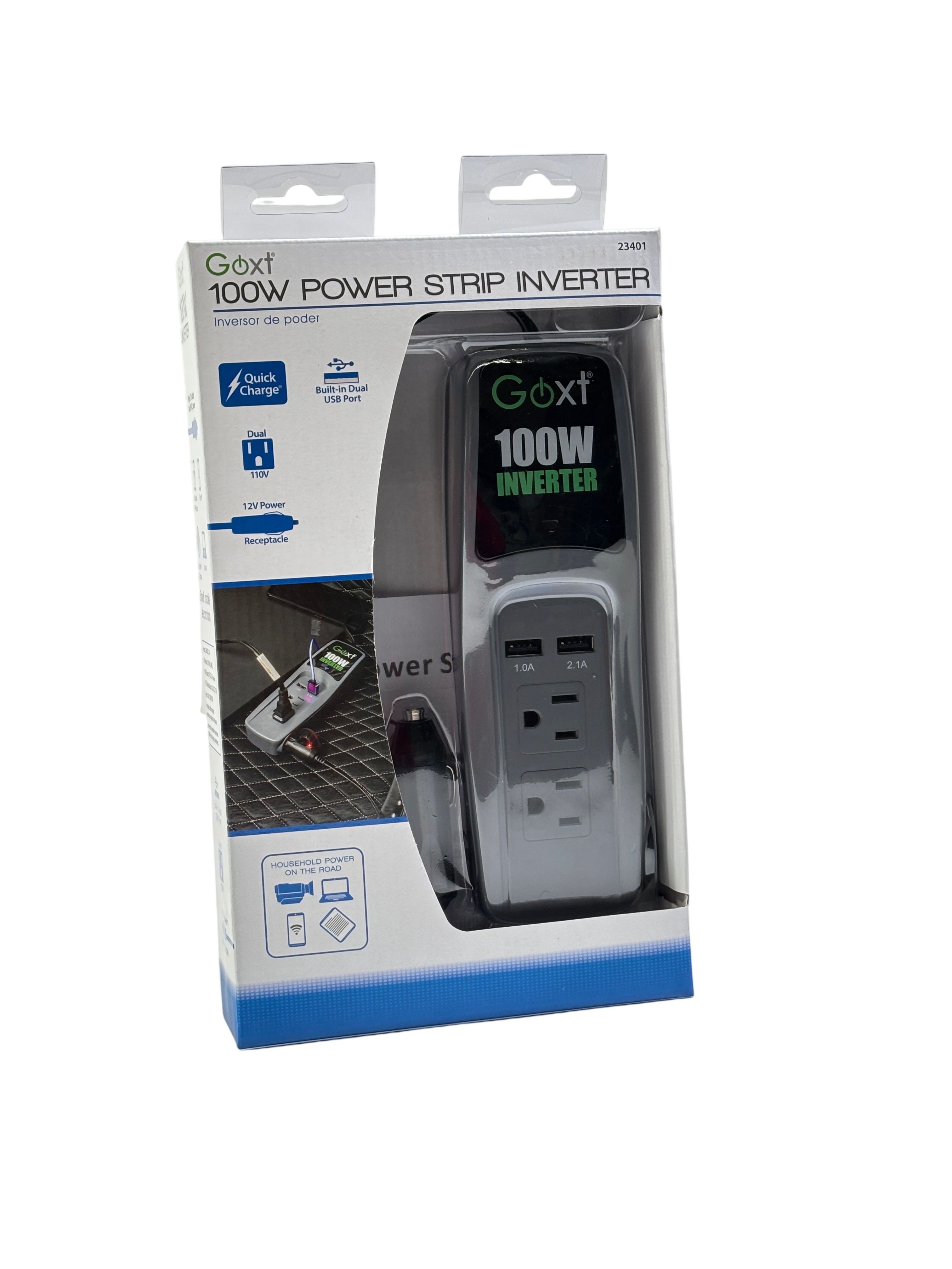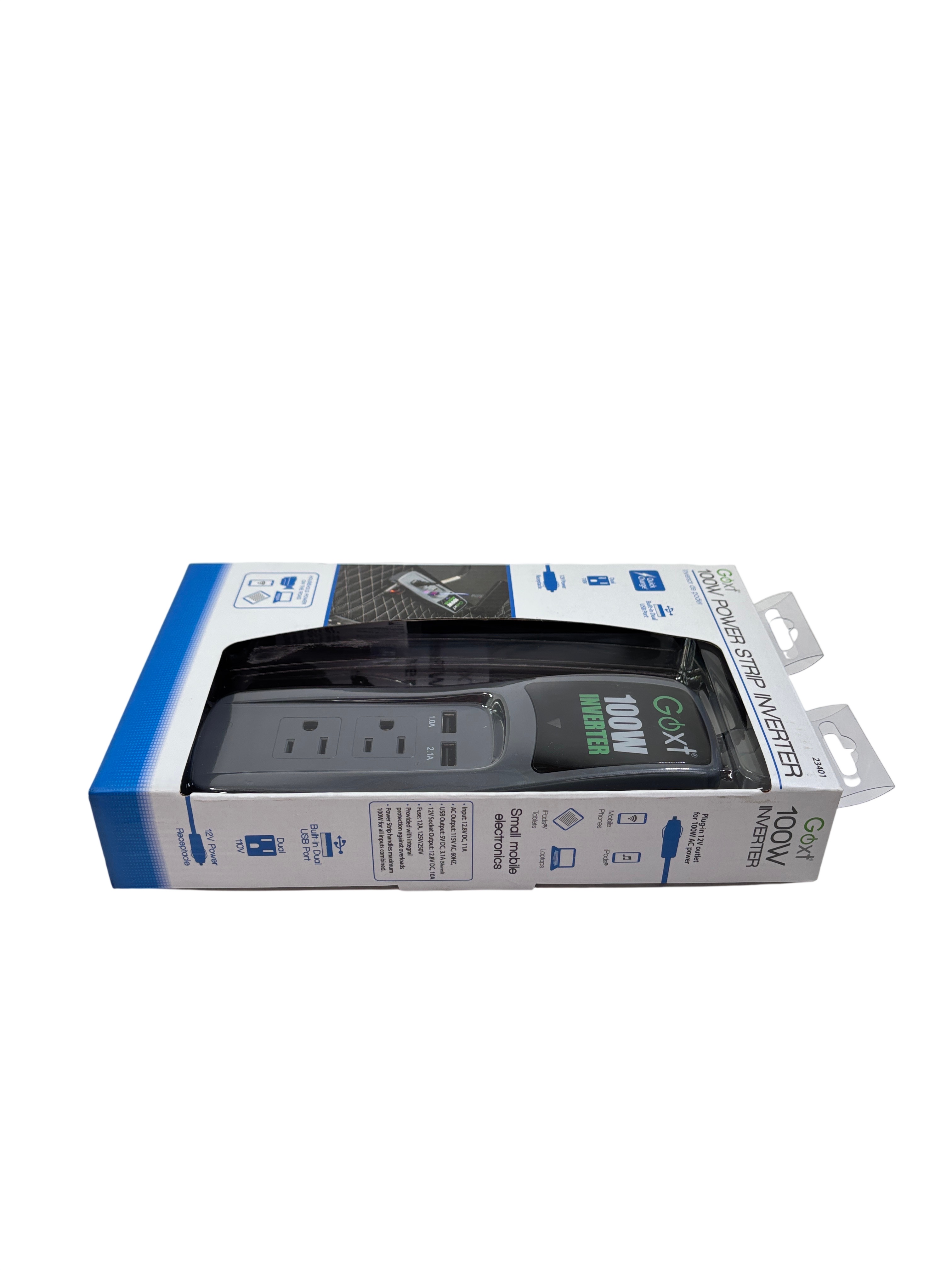 The Goxt 100W Power Strip Inverter (Model 23401) offers a versatile power solution for on-the-go use. Featuring dual 110V outlets and built-in dual USB ports with quick charge capability, this inverter supports charging multiple devices simultaneously. It is ideal for powering small electronics, laptops, and mobile devices while traveling or during power outages. Compact and lightweight, it provides convenient household power on the road.