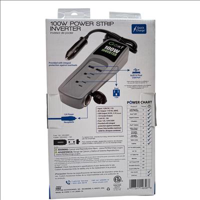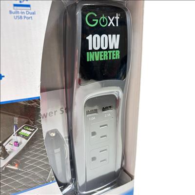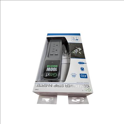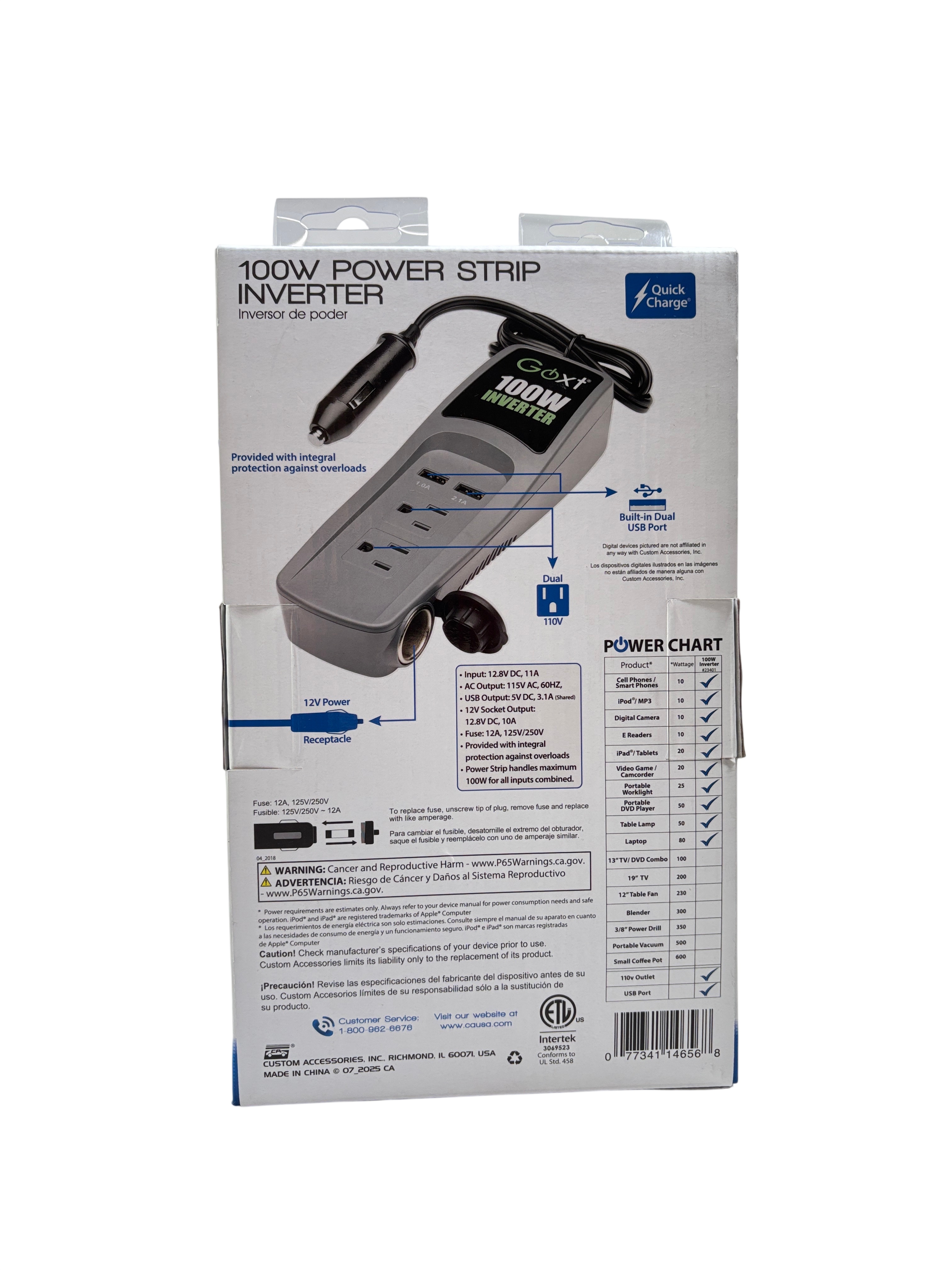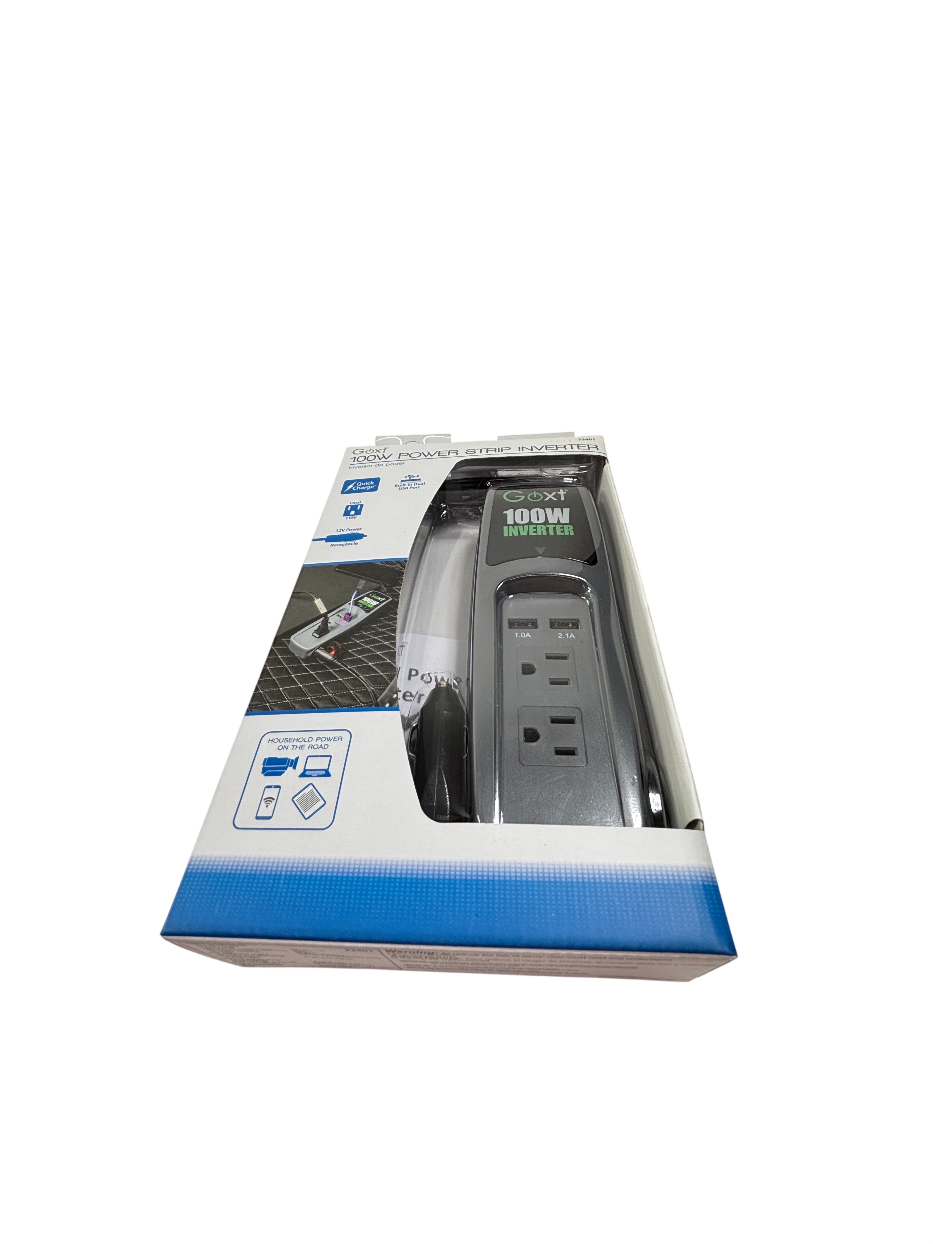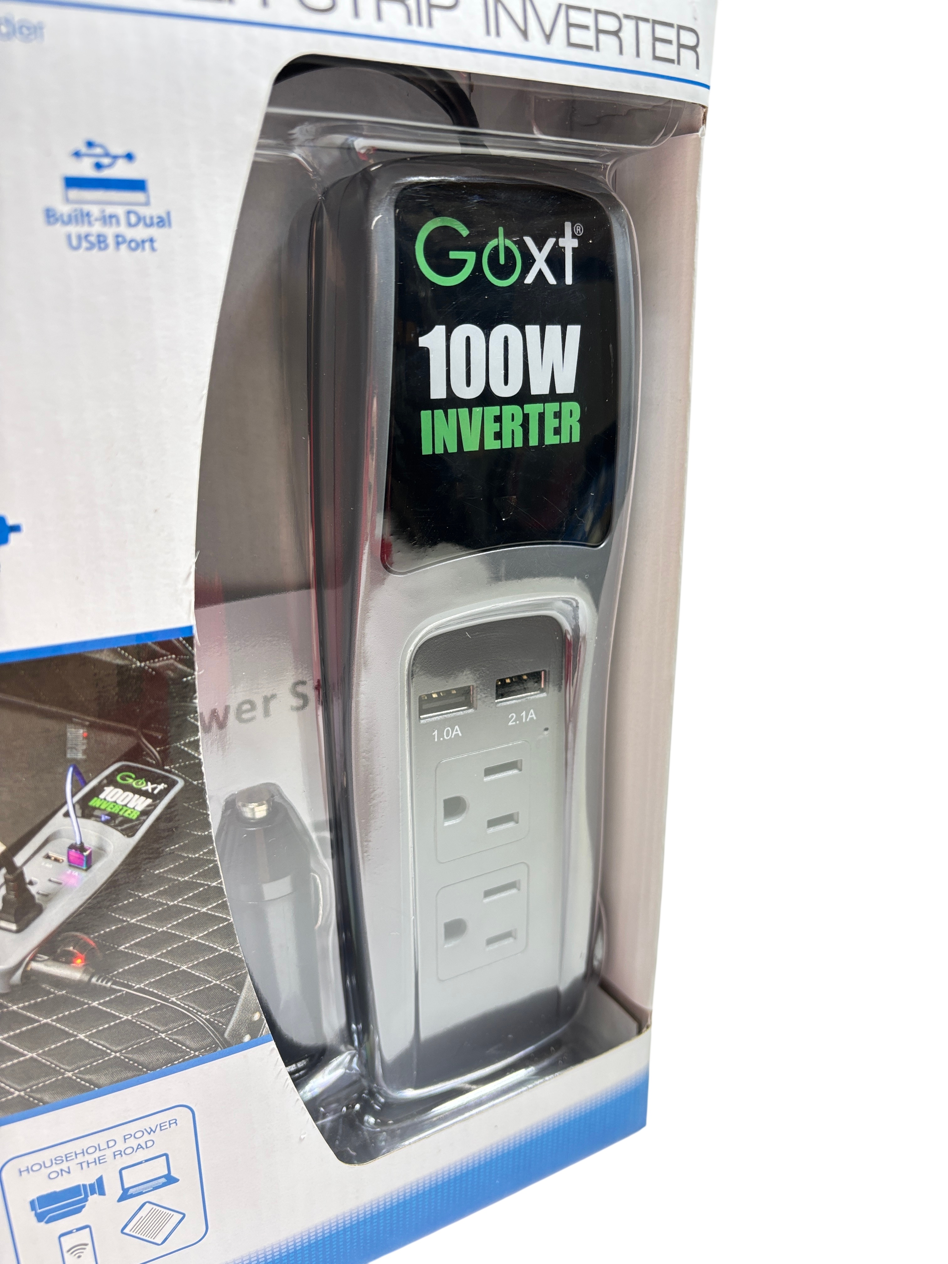 The Goxt 100W Power Strip Inverter (Model 23401) offers a versatile power solution for on-the-go use. Featuring dual 110V outlets and built-in dual USB ports with quick charge capability, this inverter supports charging multiple devices simultaneously. It is ideal for powering small electronics, laptops, and mobile devices while traveling or during power outages. Compact and lightweight, it provides convenient household power on the road.