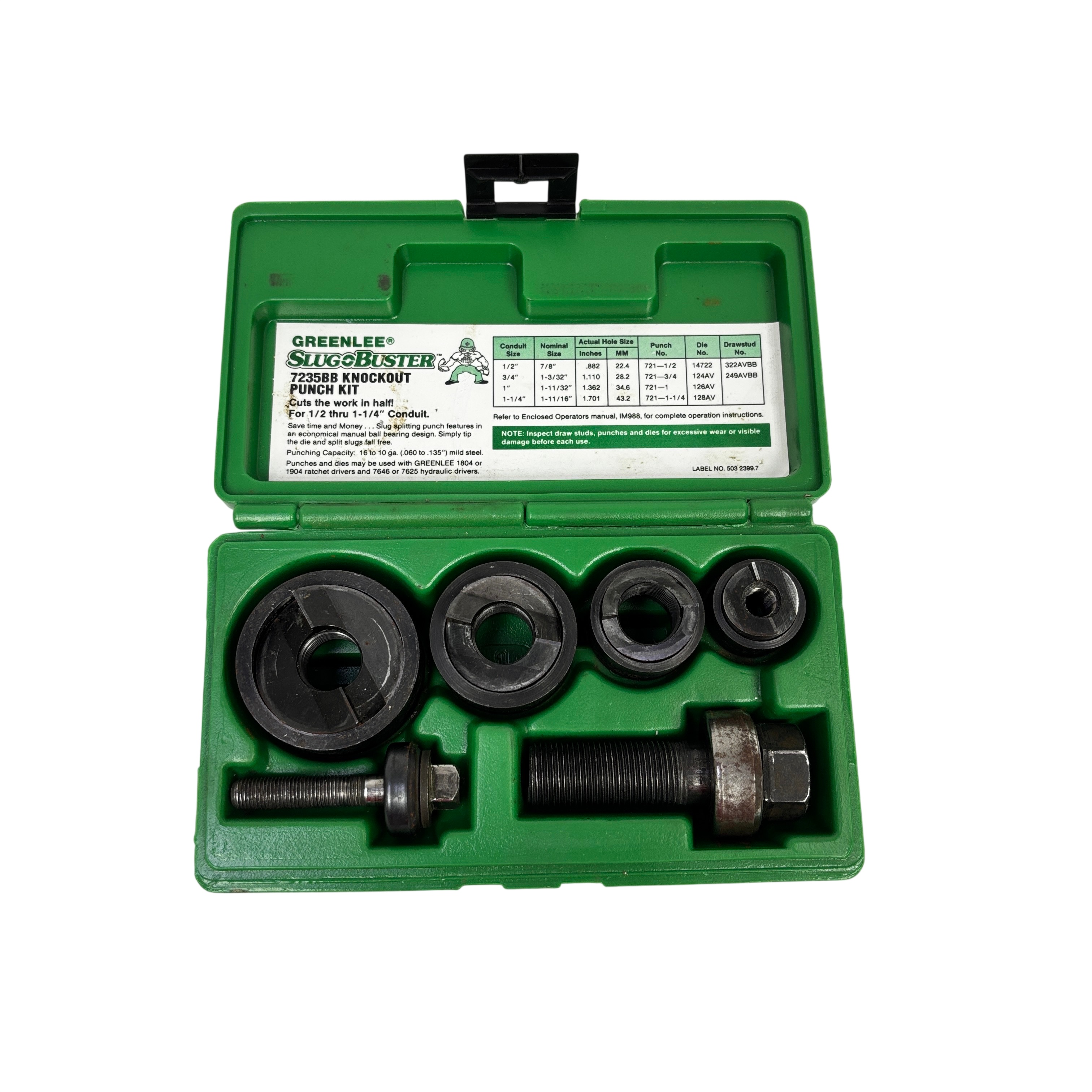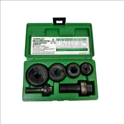 This Greenlee 7235BB Knockout Punch Set features the innovative SlugBuster design for efficient manual punching of holes in mild steel. This set includes a variety of punches and dies, draw studs, and a durable carrying case, making it ideal for electrical and construction professionals. The compact design and manual operation allow for easy handling and precise results, saving time and effort on the job.