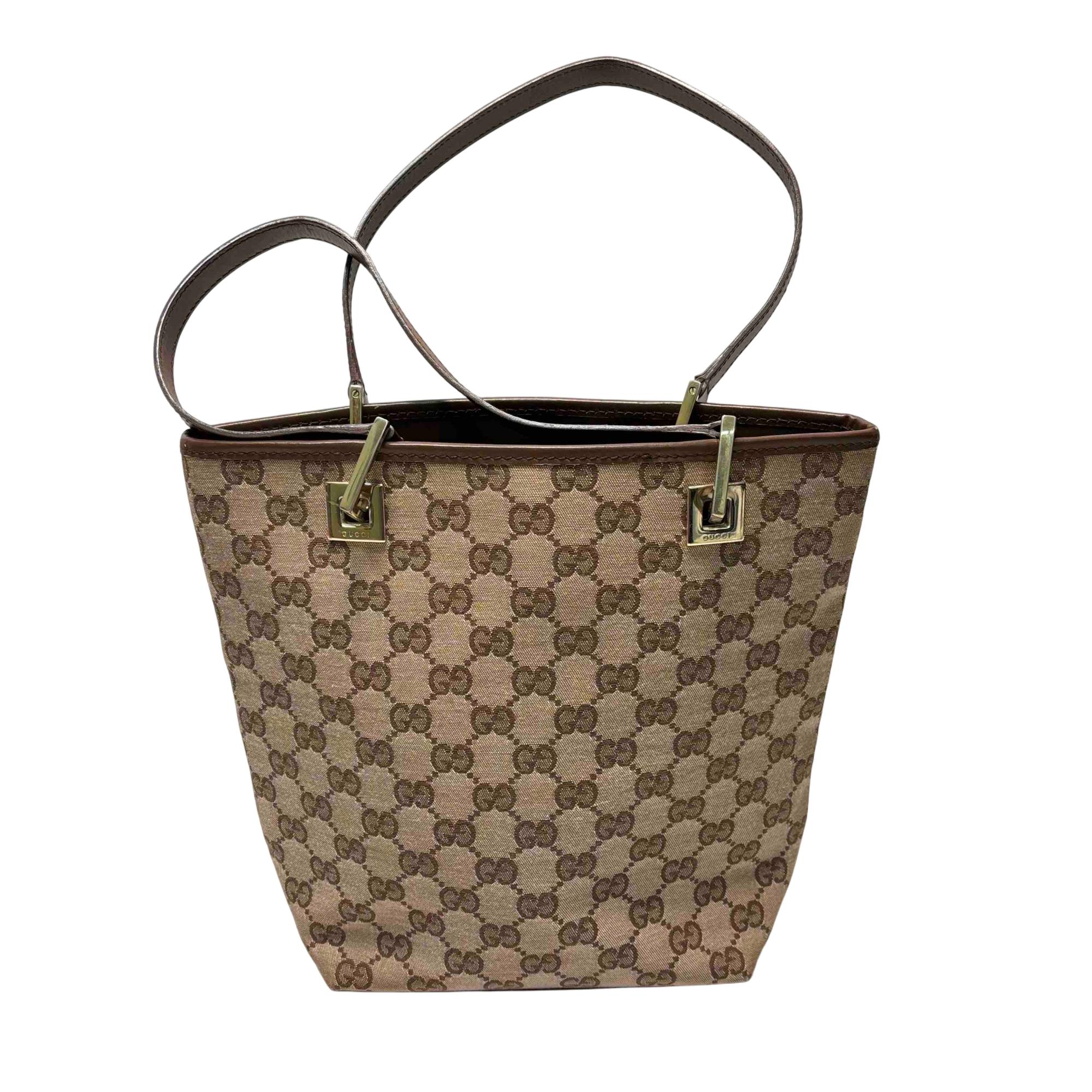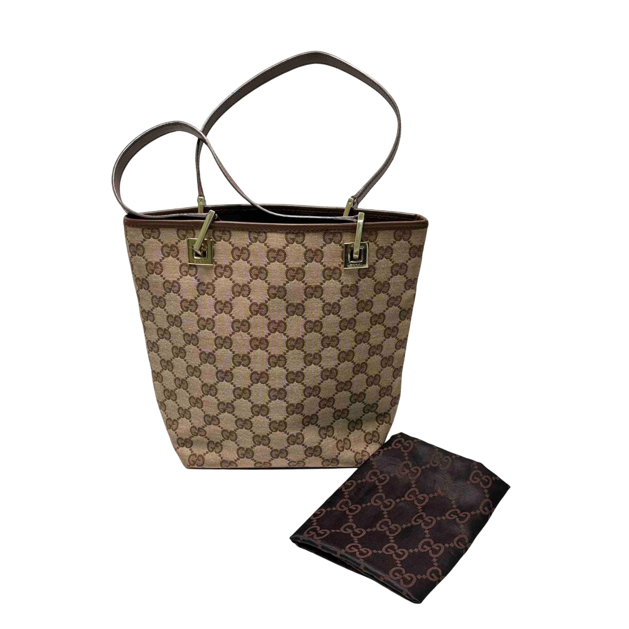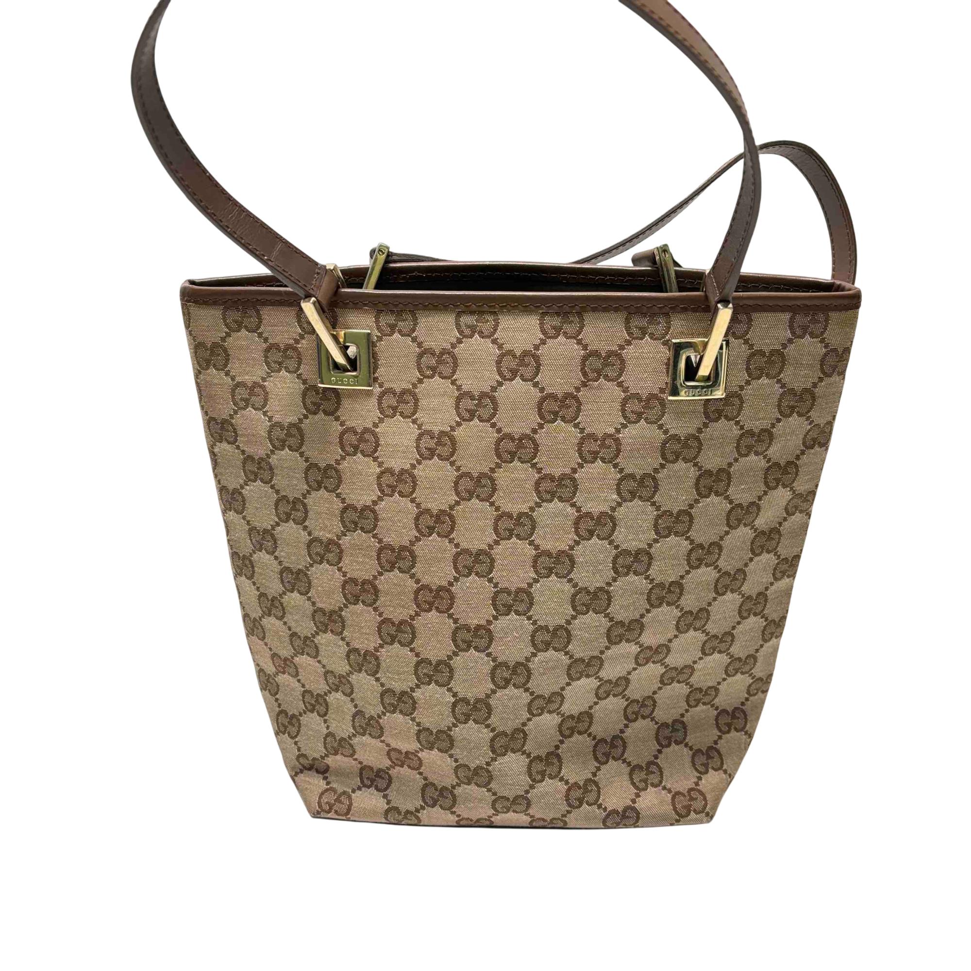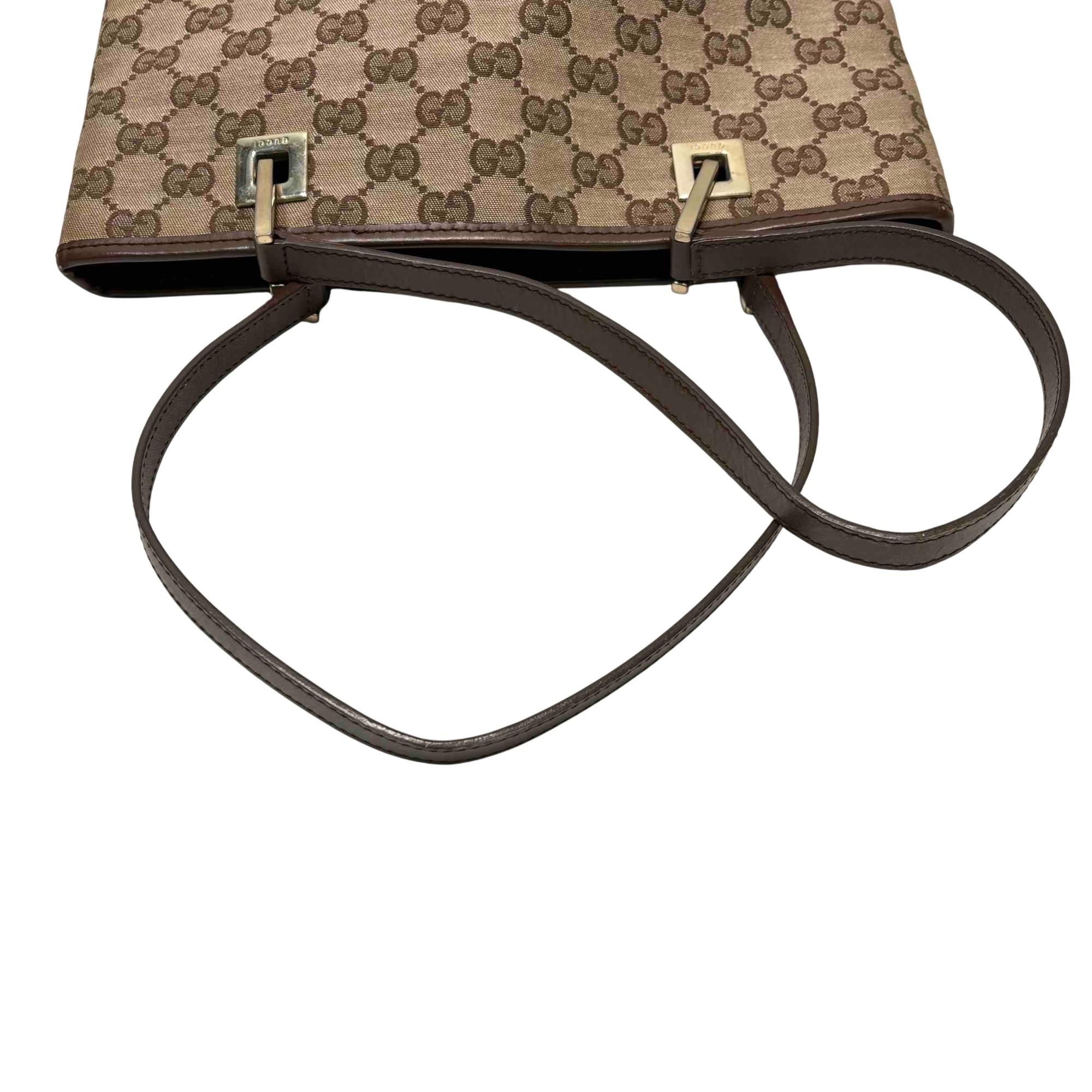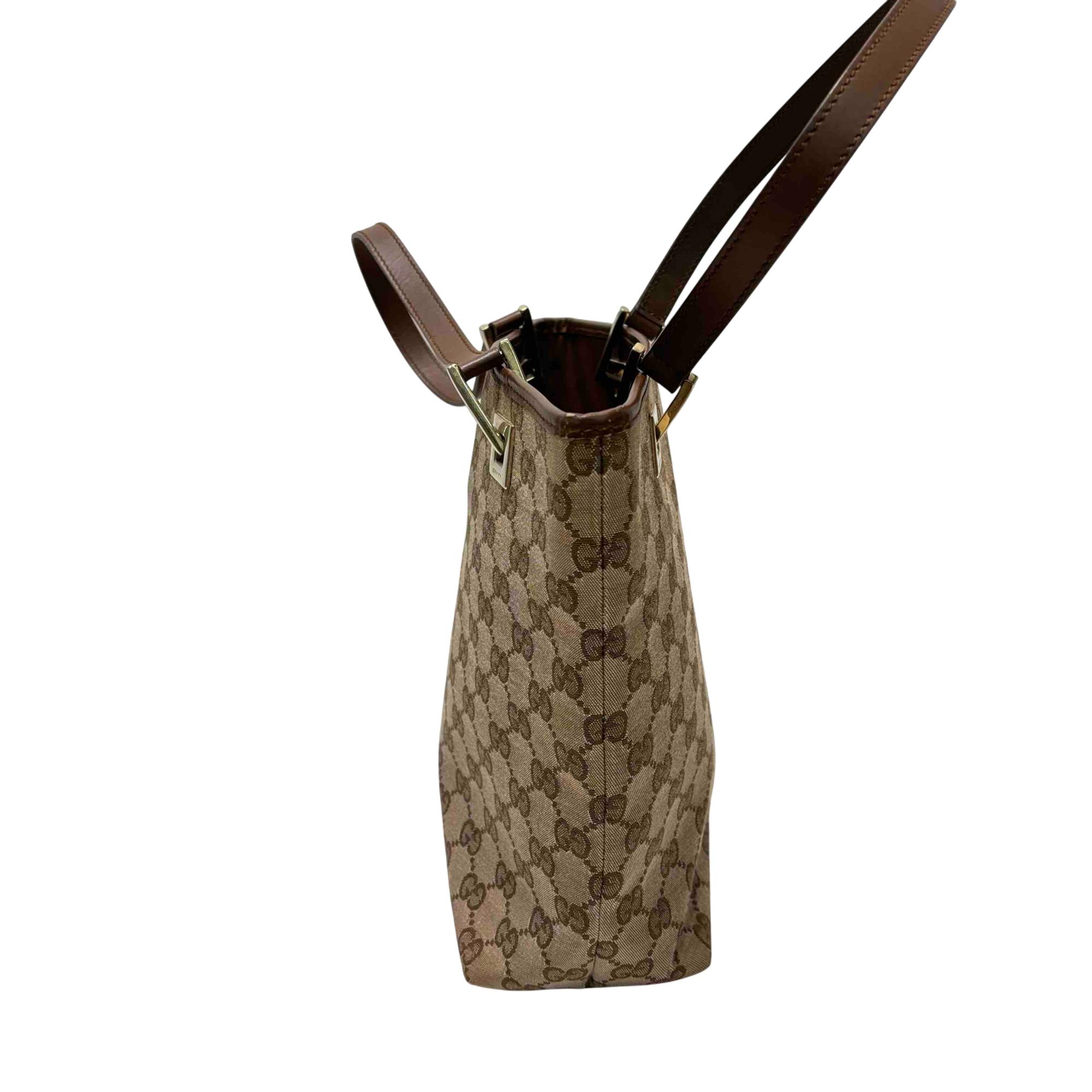Elevate your ensemble with the Gucci 0021099 GG Canvas Monogram Tote Bag. This luxurious brown and tan bag showcases the iconic GG canvas, offering both style and functionality. With a comfortable strap and ample space, its perfect for any fashion-forward individual seeking sophistication and practicality in one.
