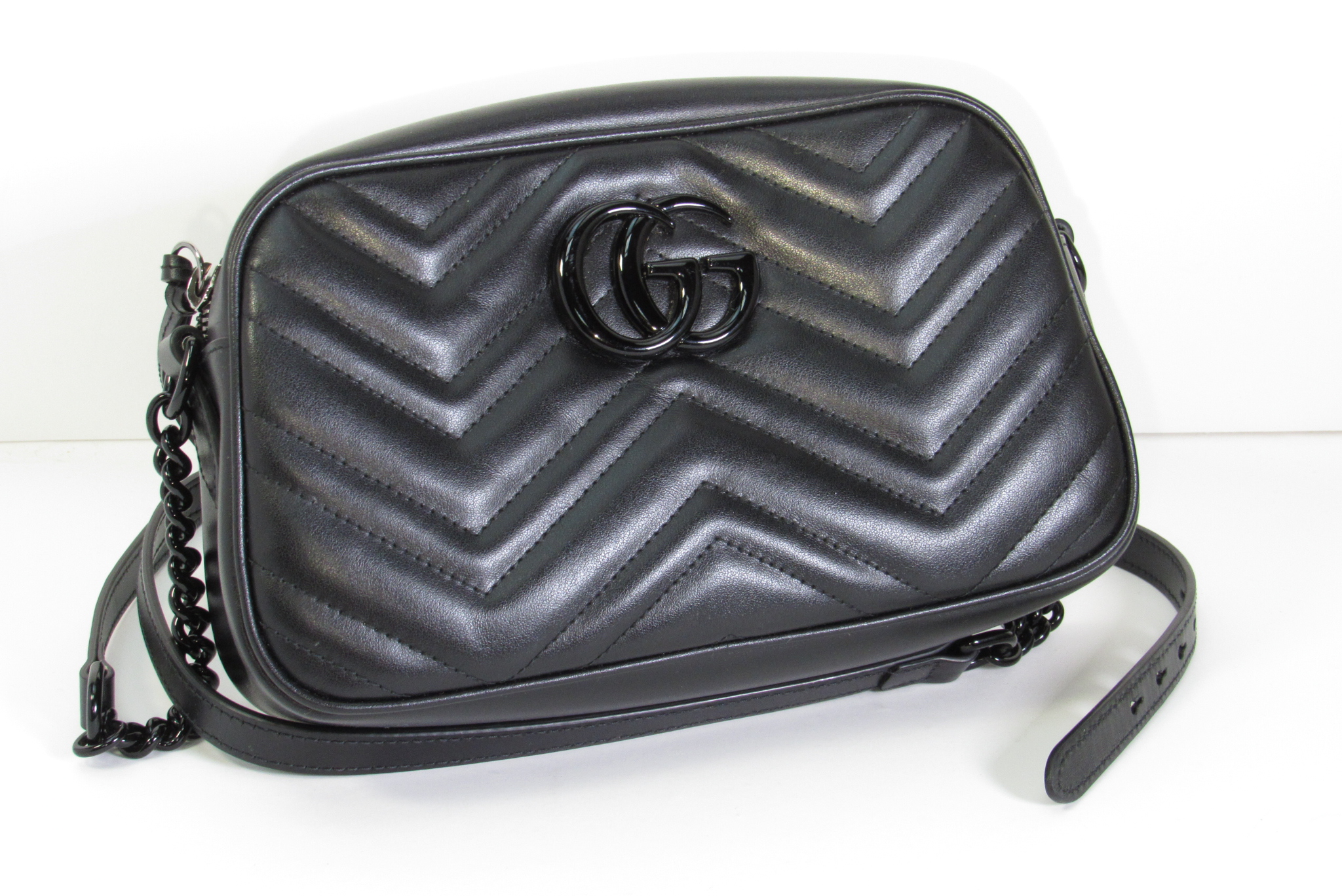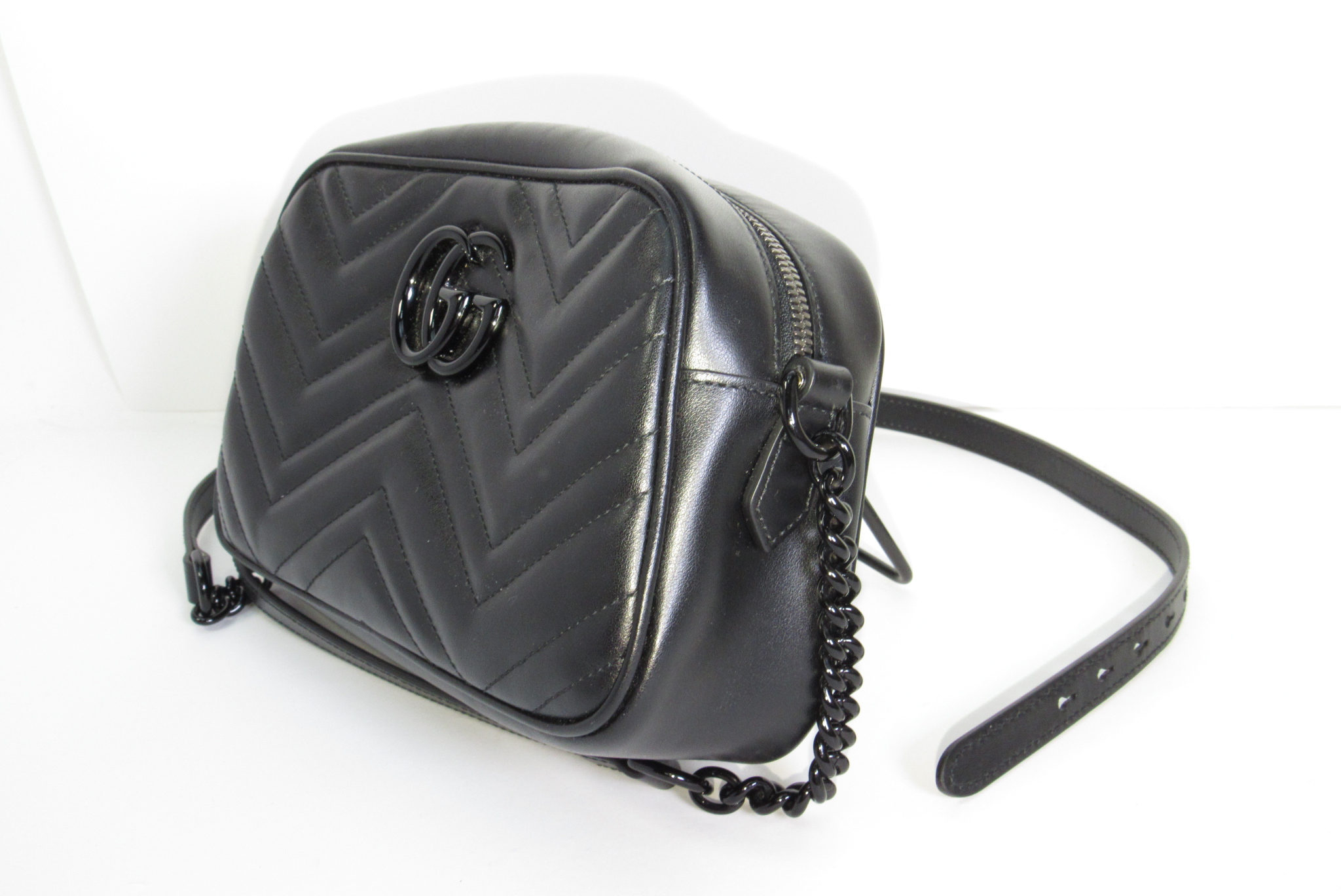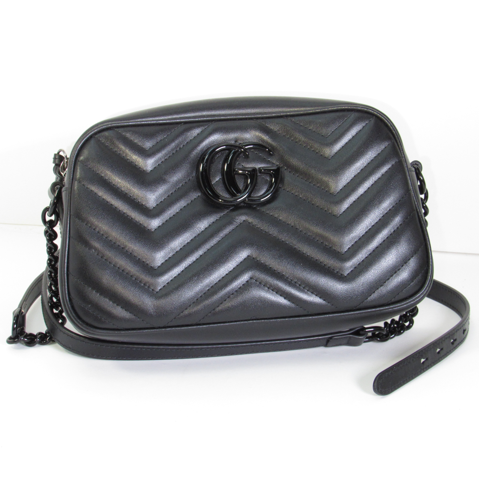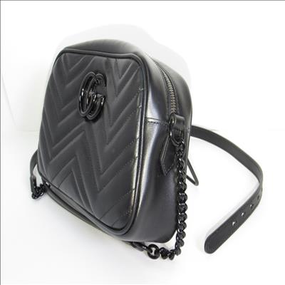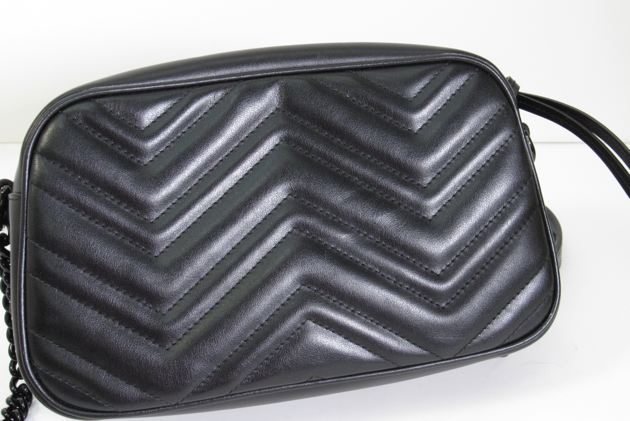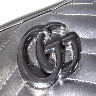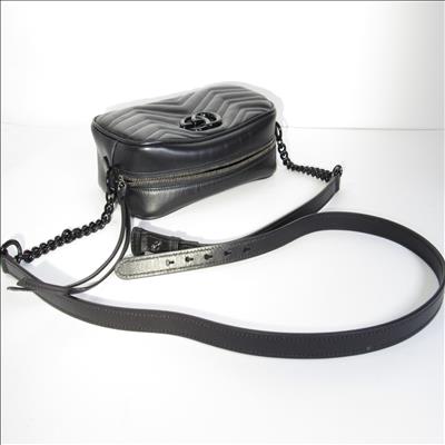 The GG Marmont small camera bag has a softly structured shape and a zip top closure with the Double G hardware. The chain shoulder strap has a leather shoulder detail. Made in matelassé leather with a chevron design.