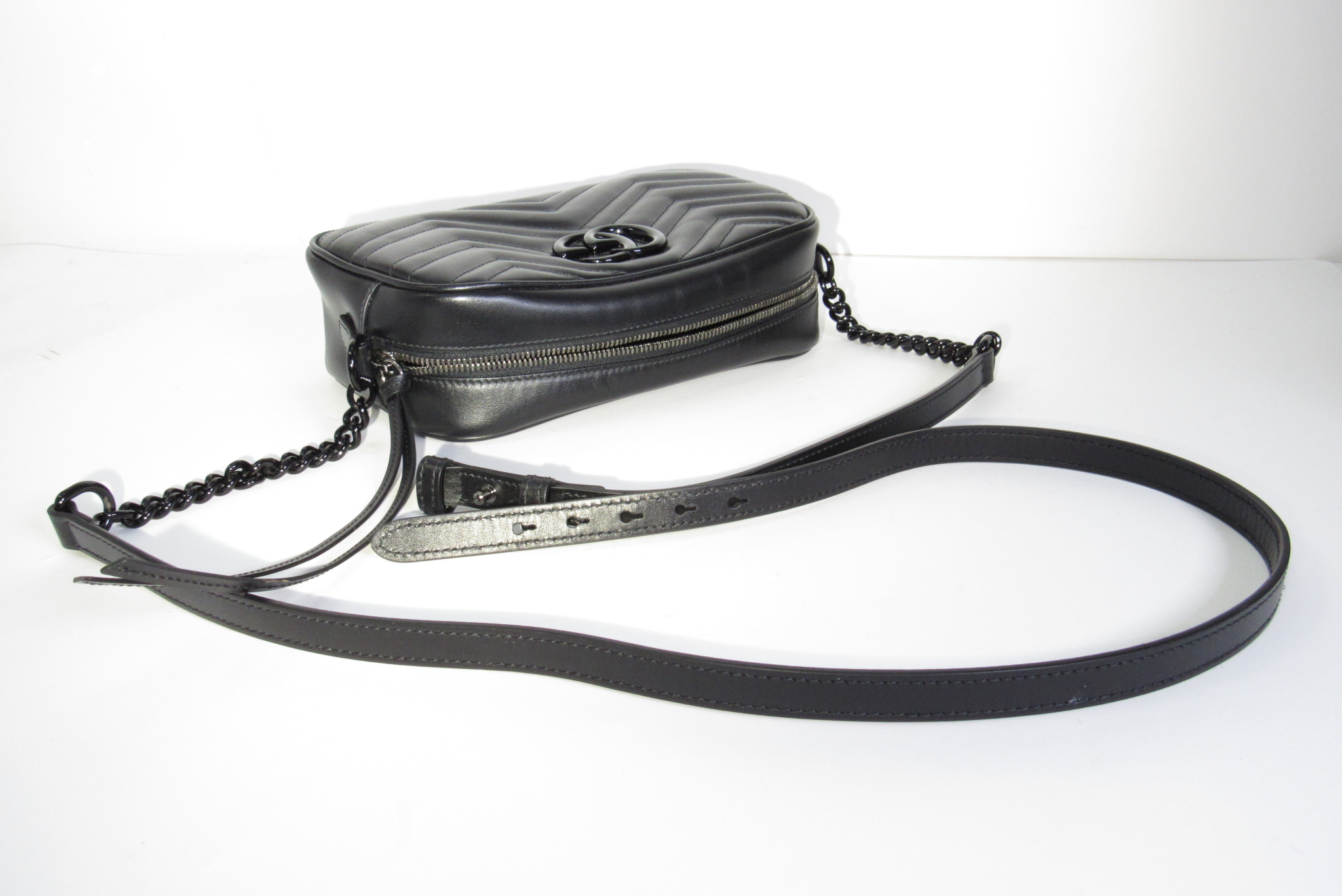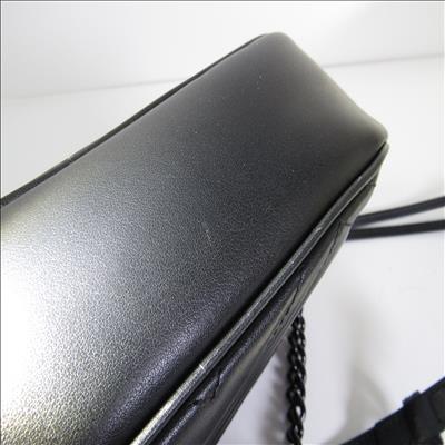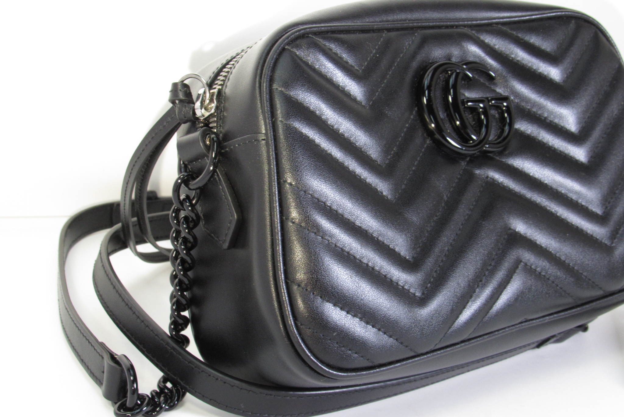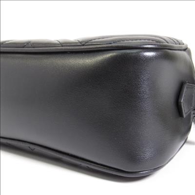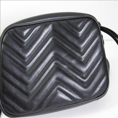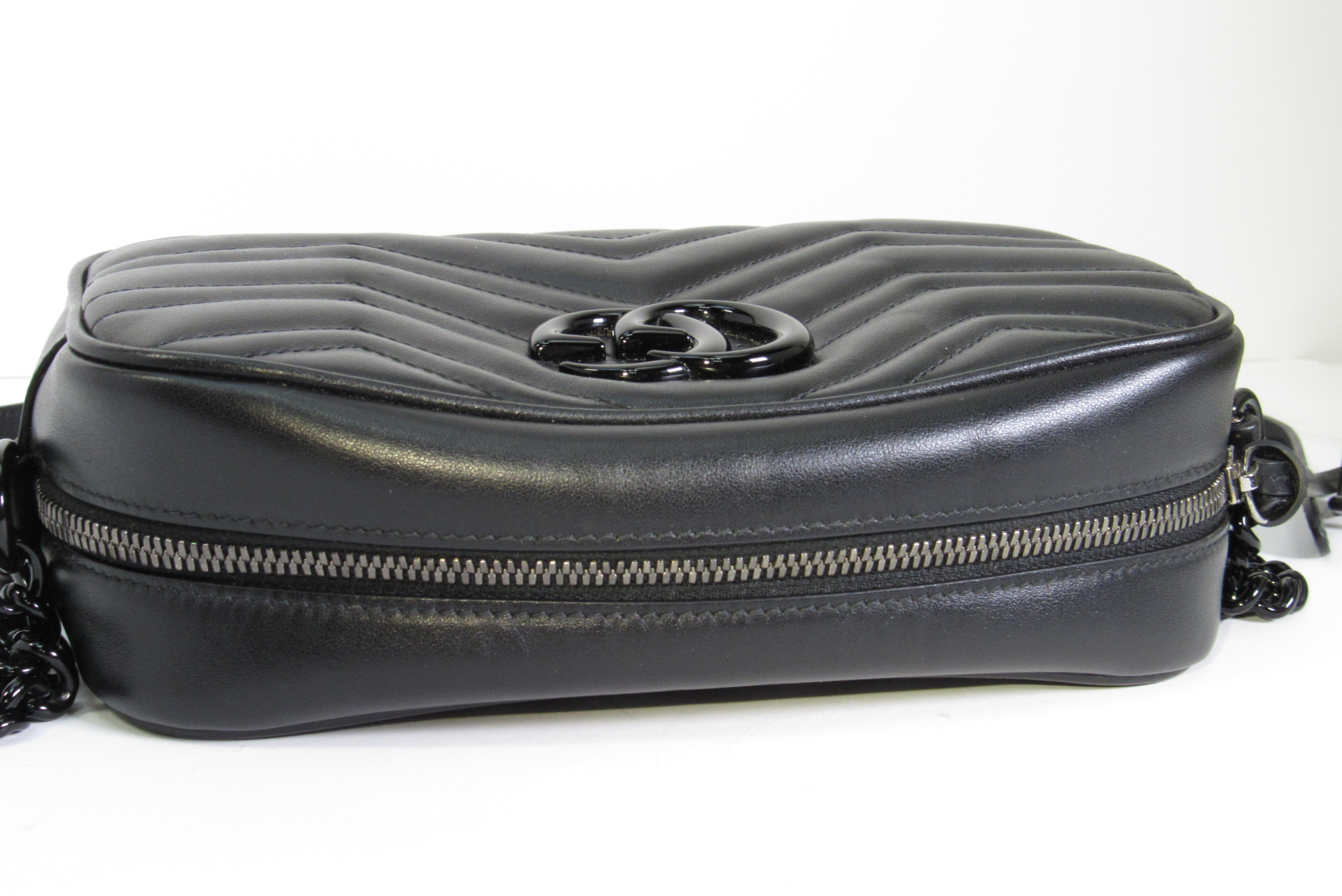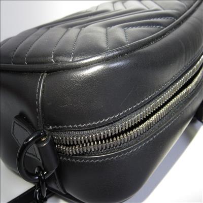 The GG Marmont small camera bag has a softly structured shape and a zip top closure with the Double G hardware. The chain shoulder strap has a leather shoulder detail. Made in matelassé leather with a chevron design.