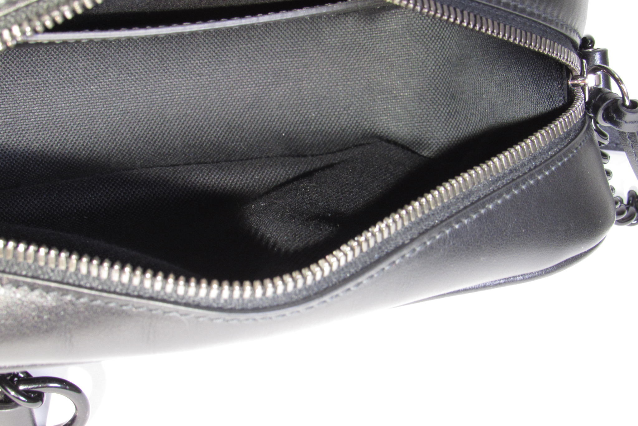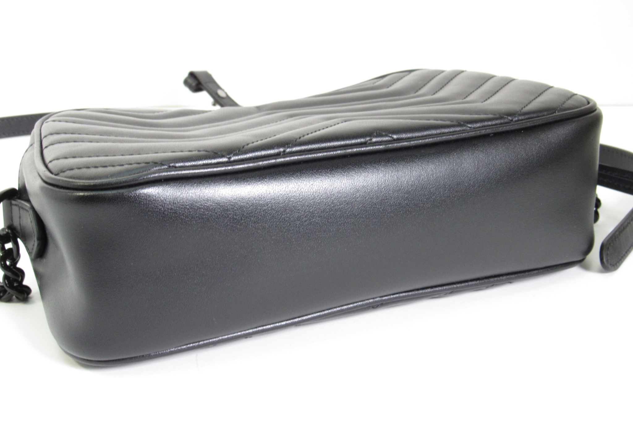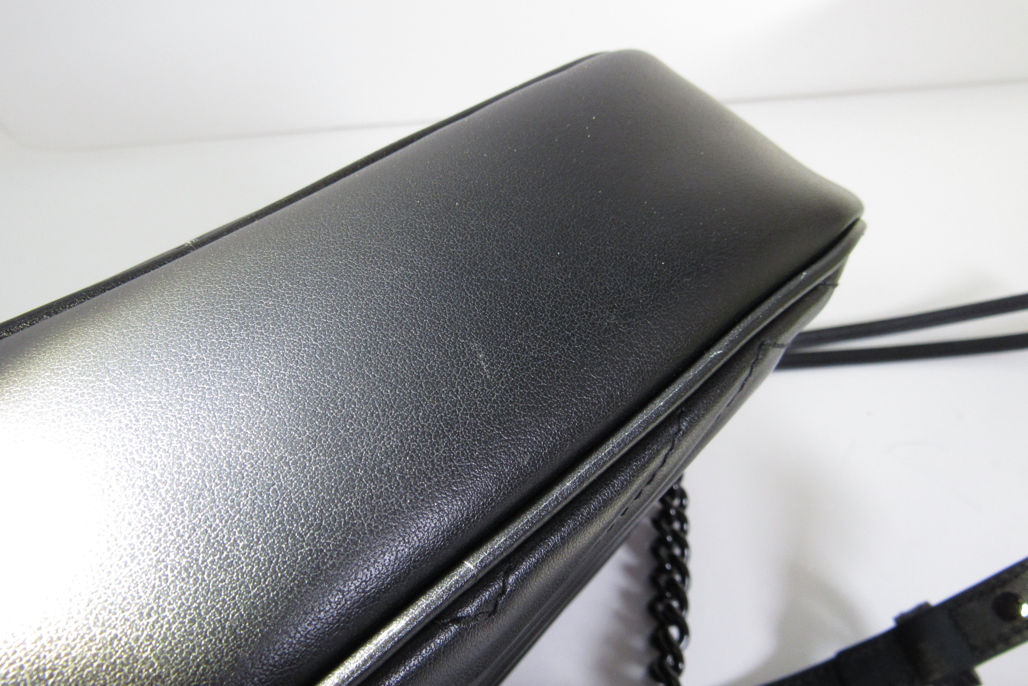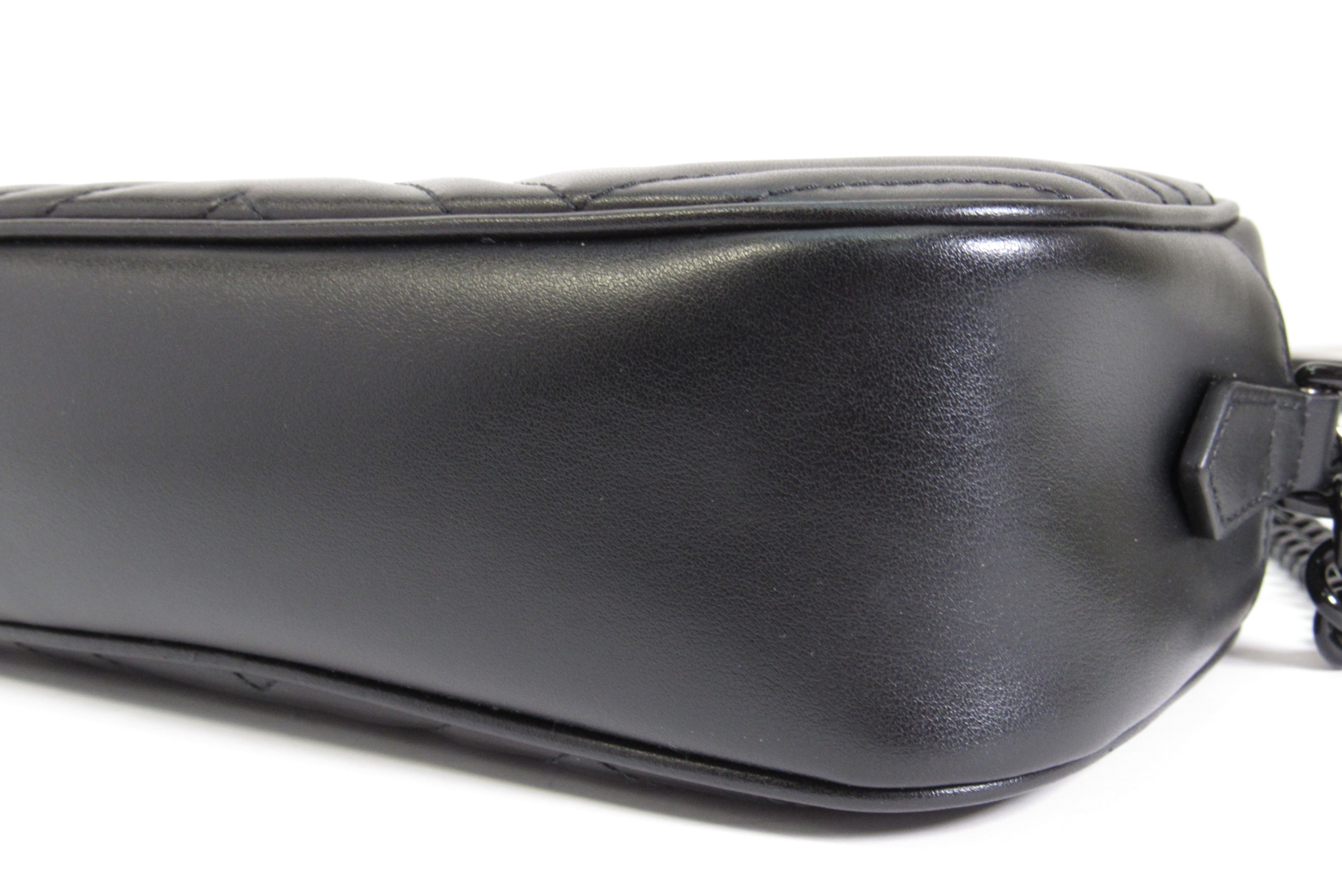The GG Marmont small camera bag has a softly structured shape and a zip top closure with the Double G hardware. The chain shoulder strap has a leather shoulder detail. Made in matelassé leather with a chevron design.