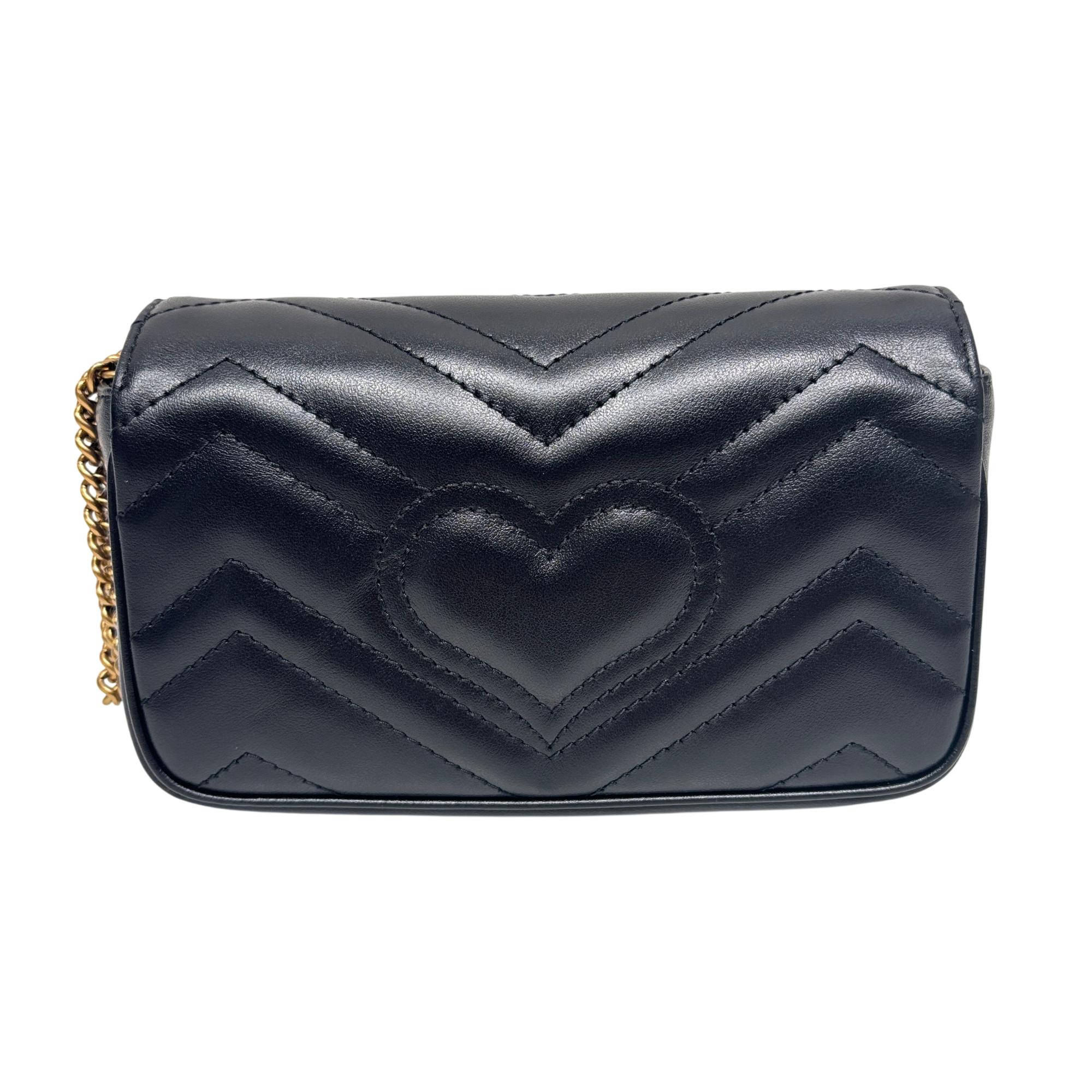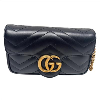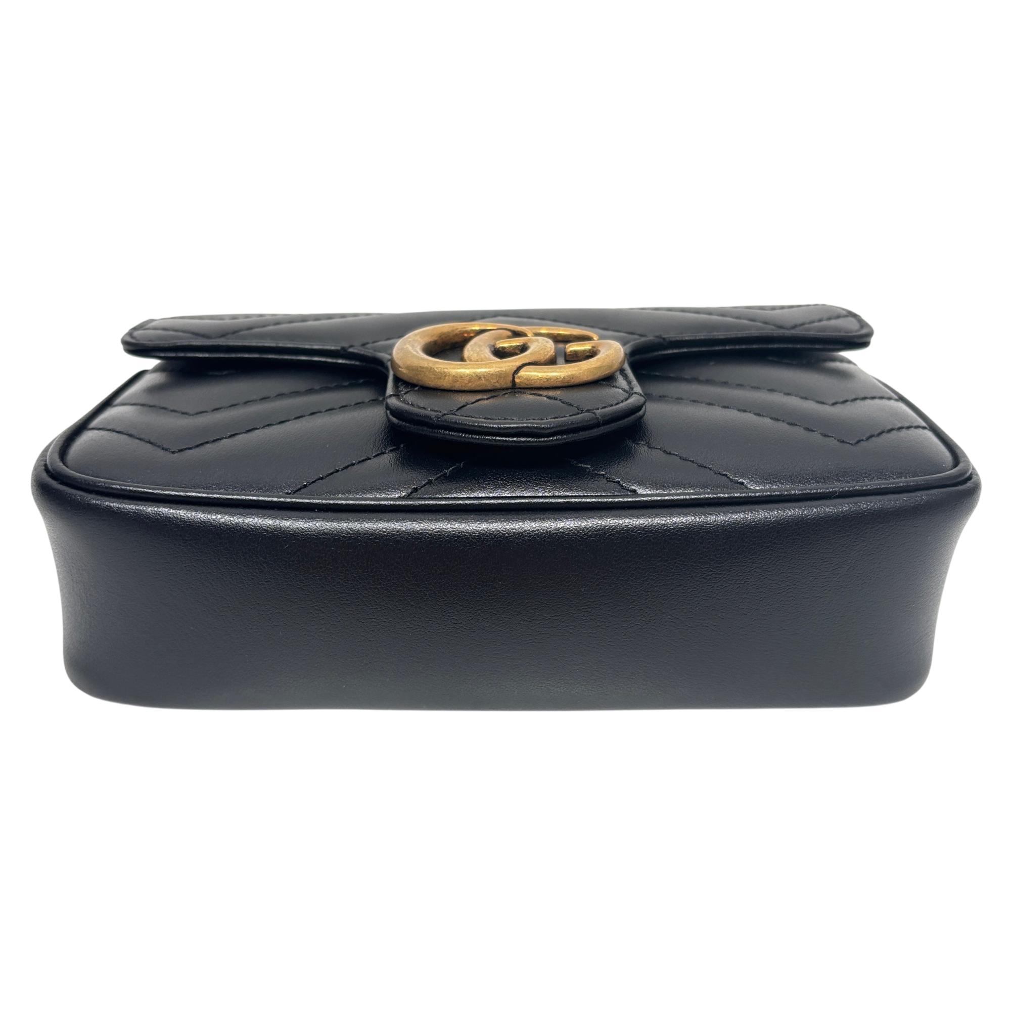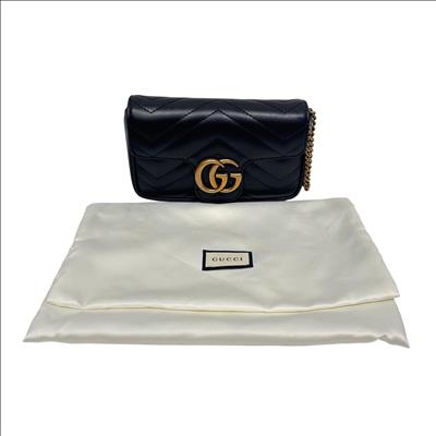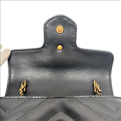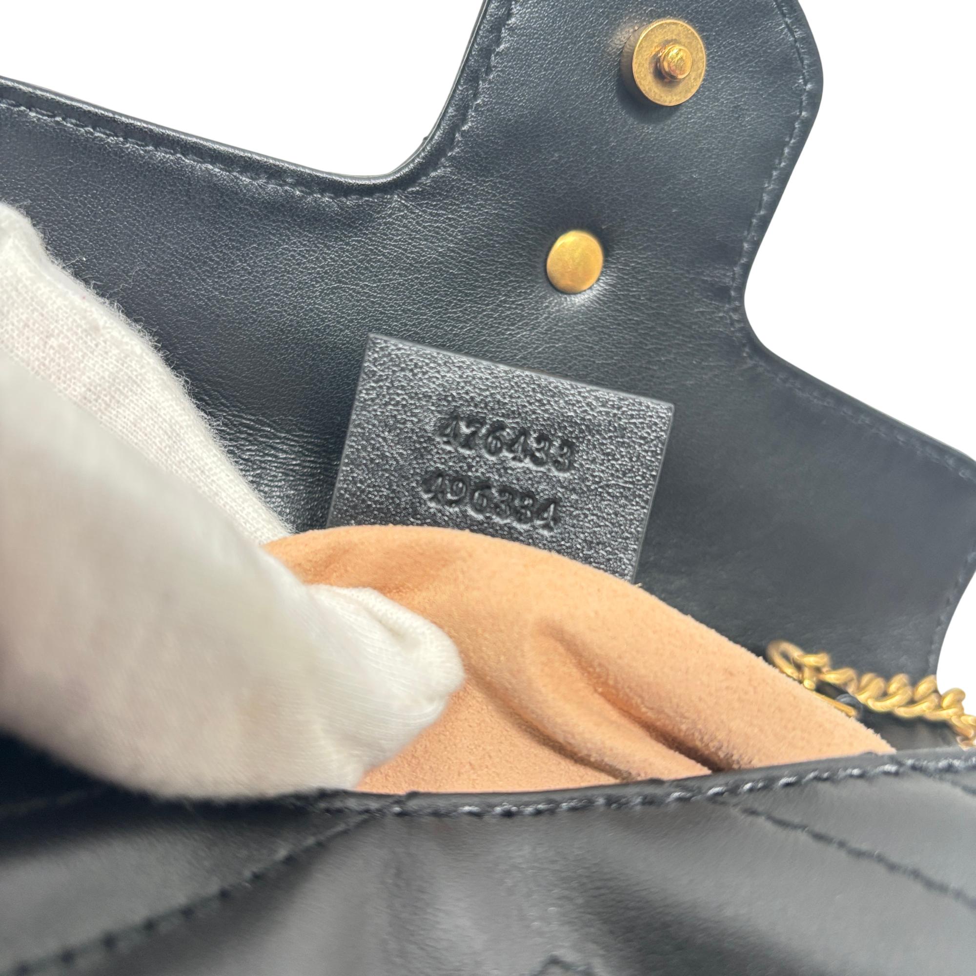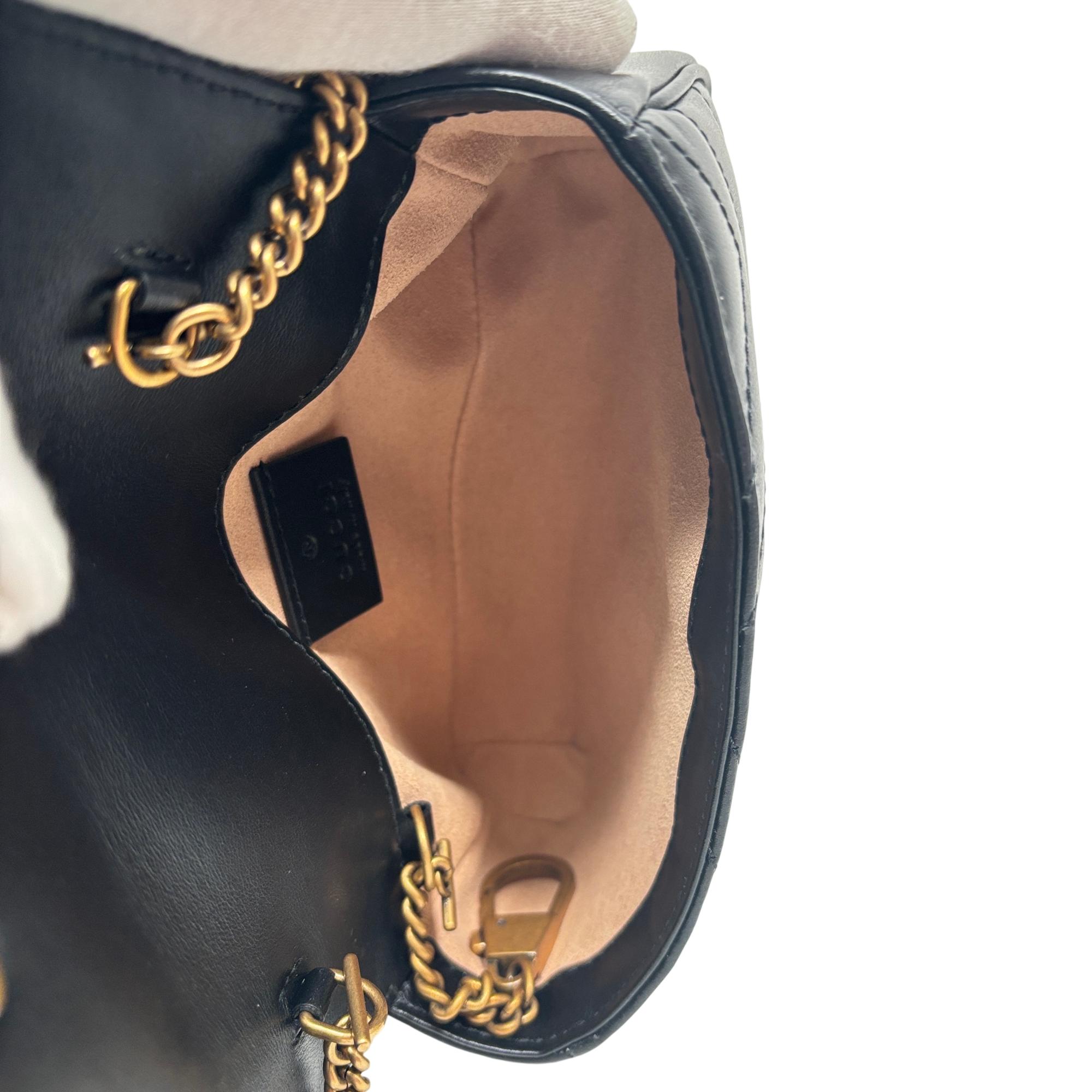 The Gucci GG Marmont Mini Matelassé Black Leather Crossbody Bag features a luxurious black leather exterior with distinctive chevron quilting and a gold double G logo on the front. This compact and stylish accessory offers a chic silhouette with a chain strap, making it an elegant choice for both day and evening wear.