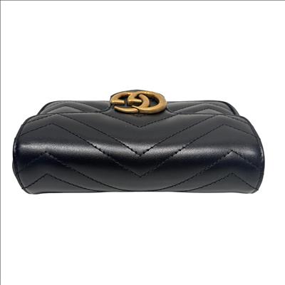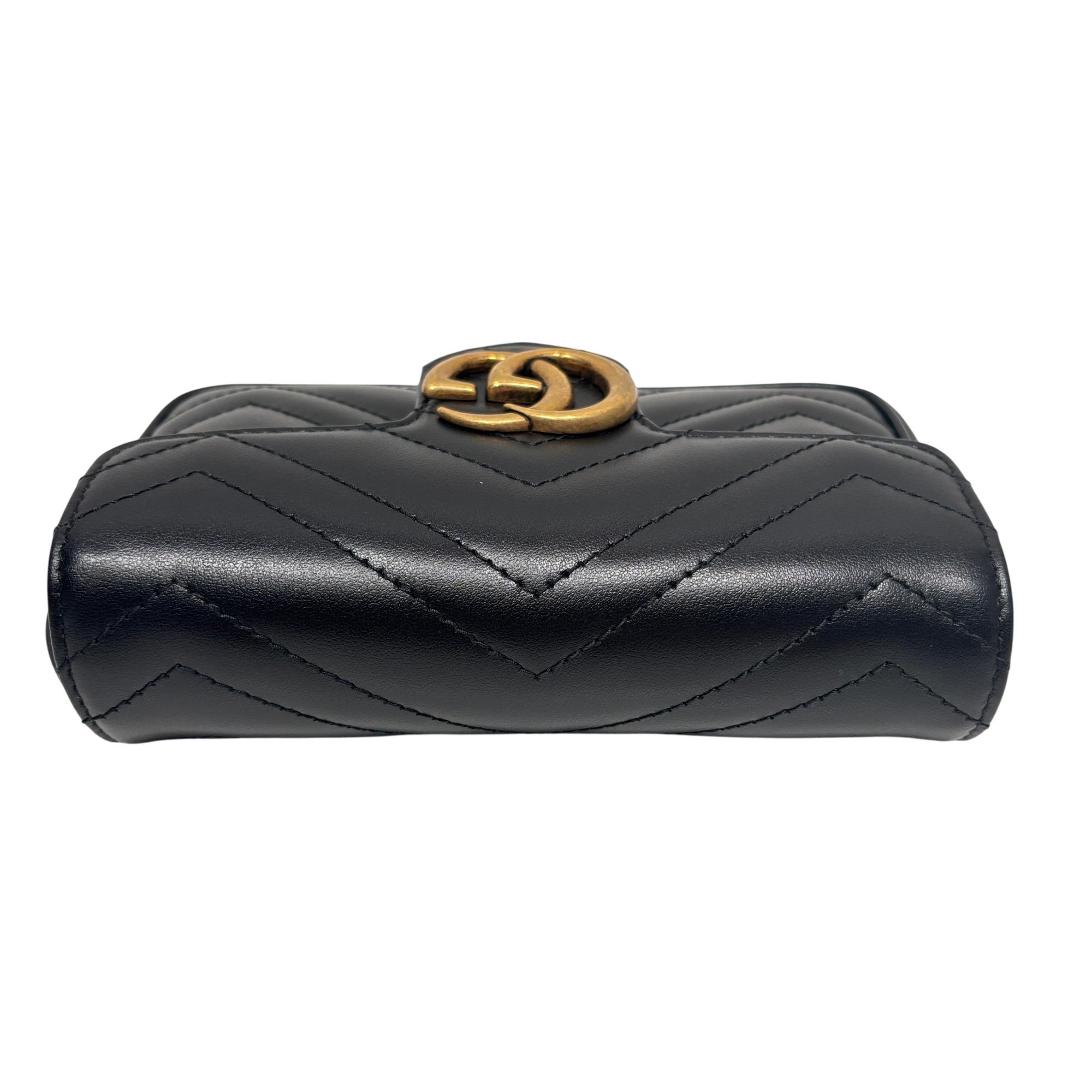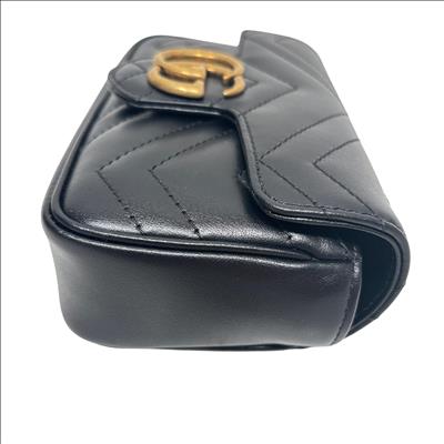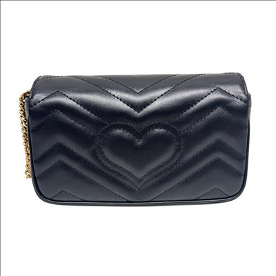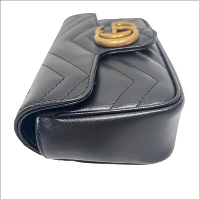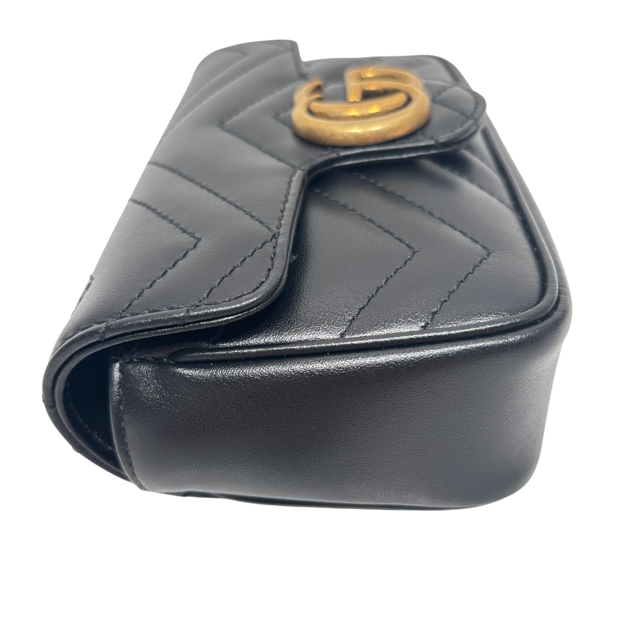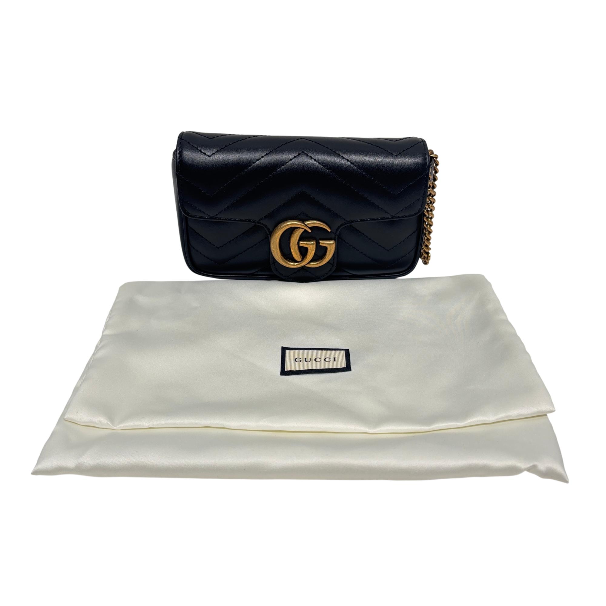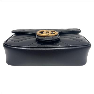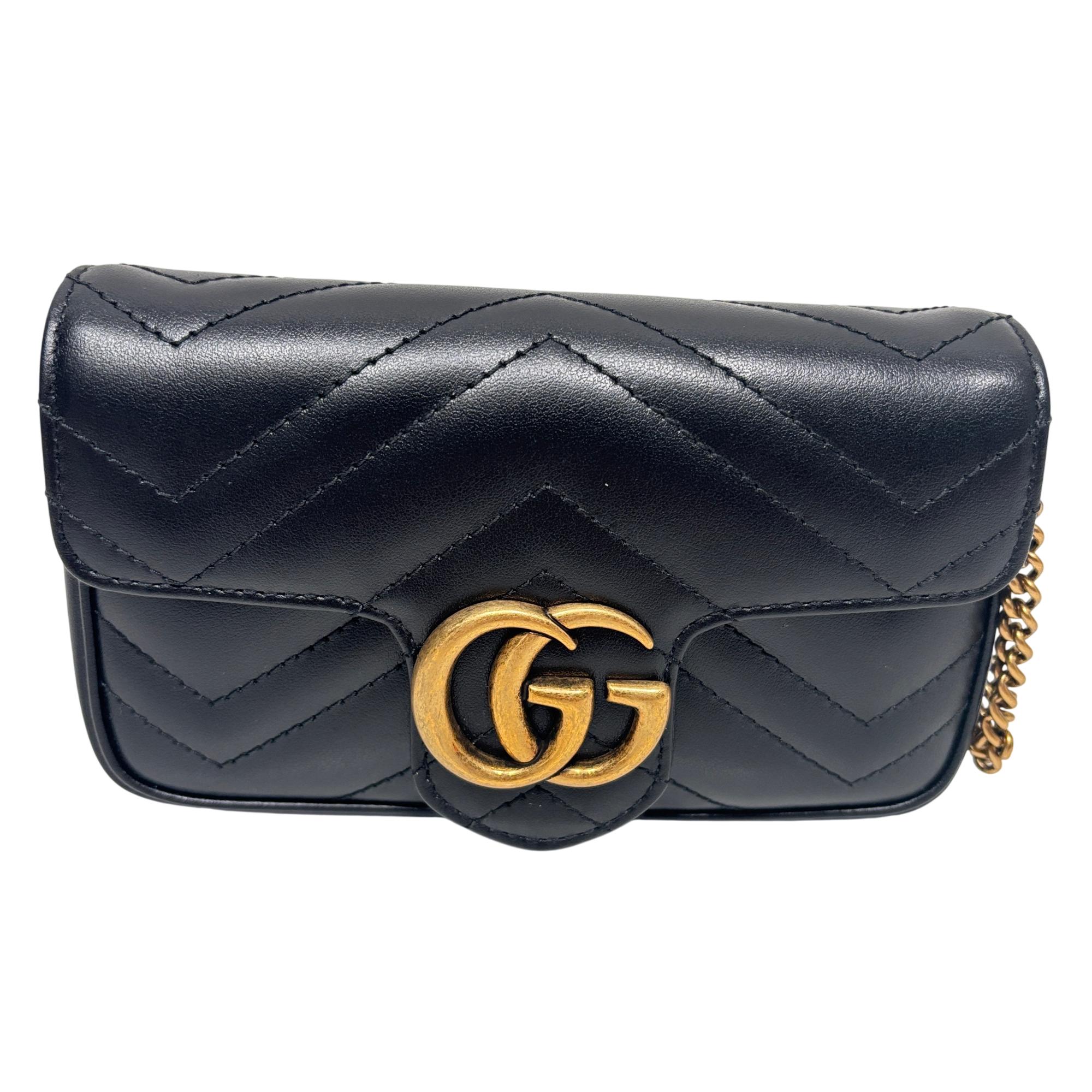 The Gucci GG Marmont Mini Matelassé Black Leather Crossbody Bag features a luxurious black leather exterior with distinctive chevron quilting and a gold double G logo on the front. This compact and stylish accessory offers a chic silhouette with a chain strap, making it an elegant choice for both day and evening wear.