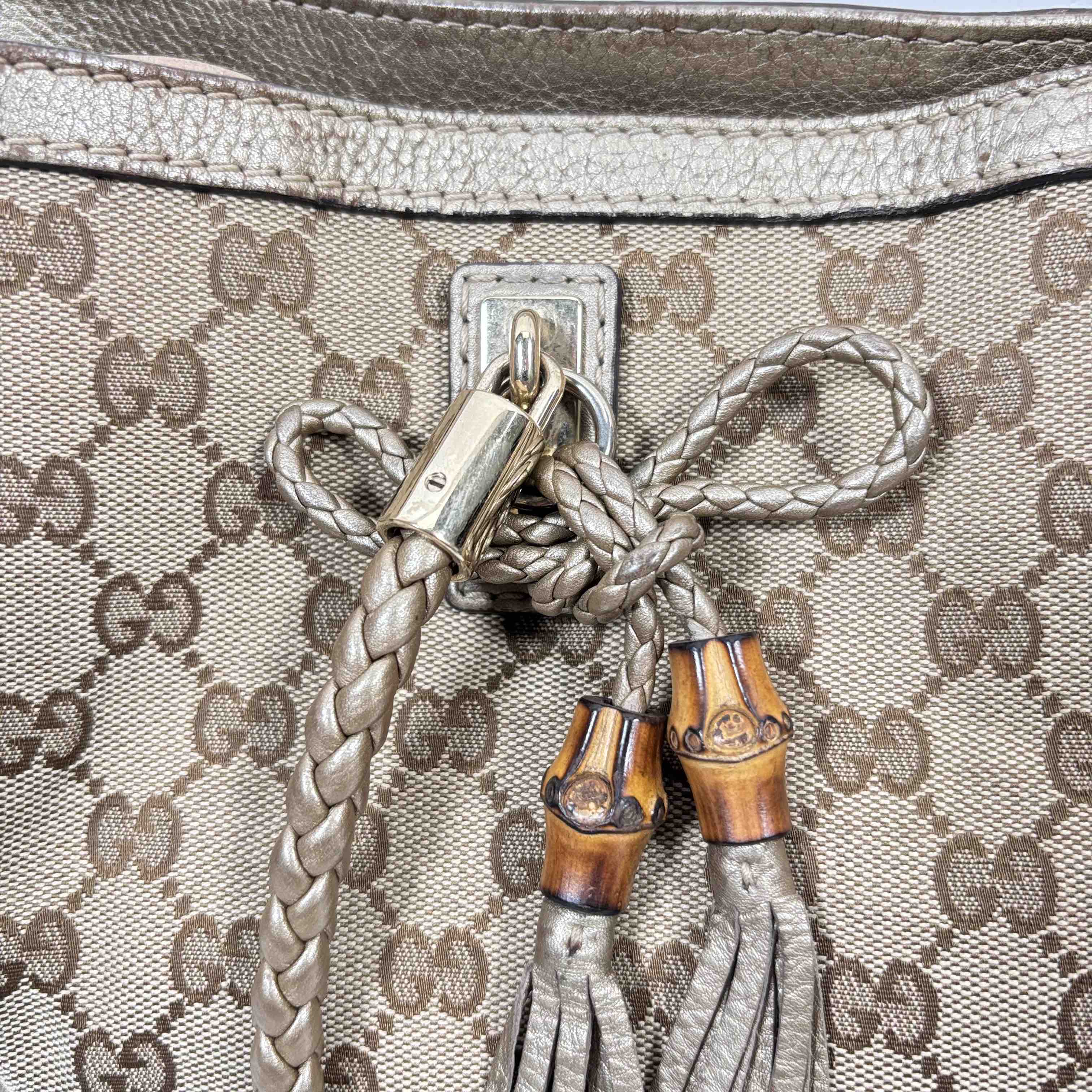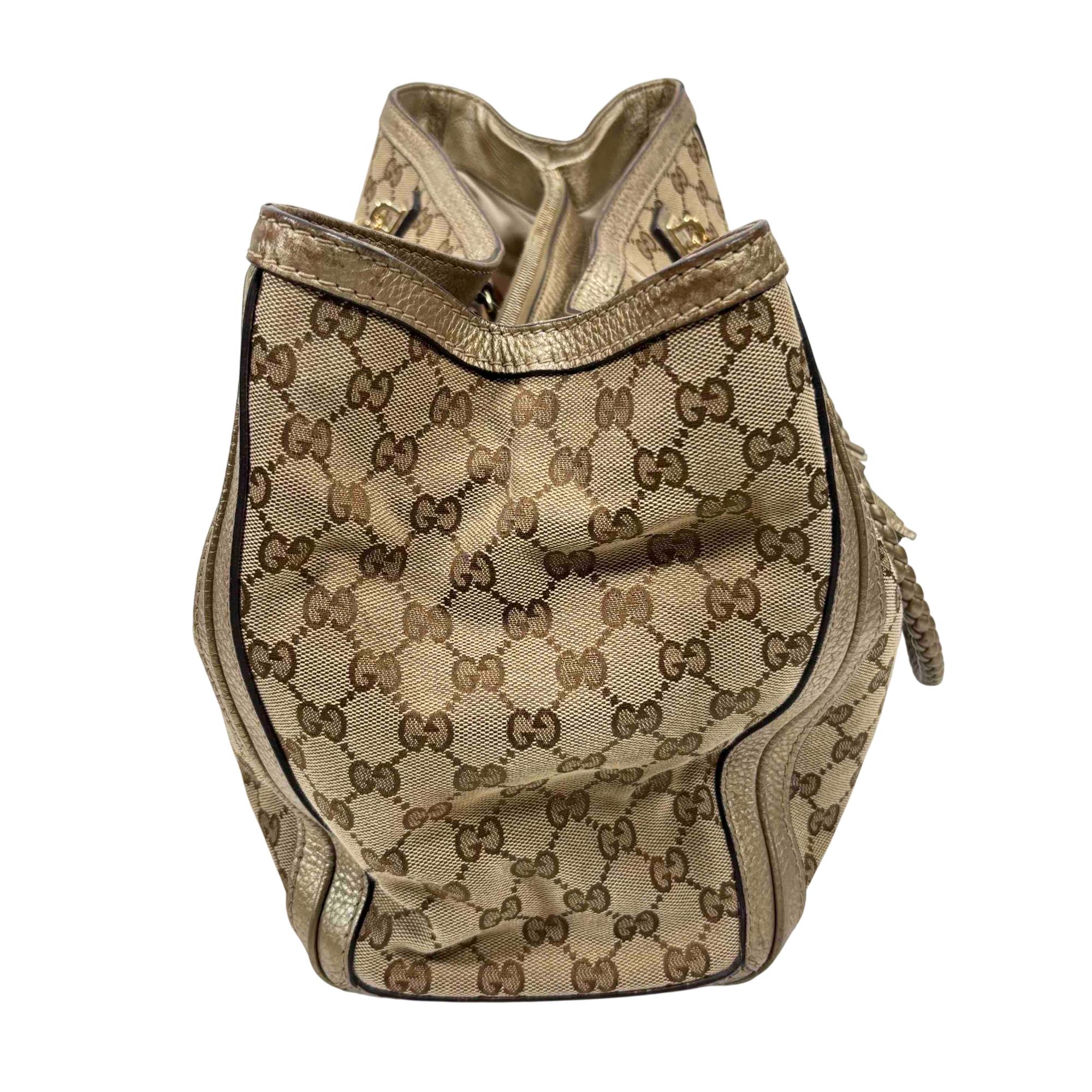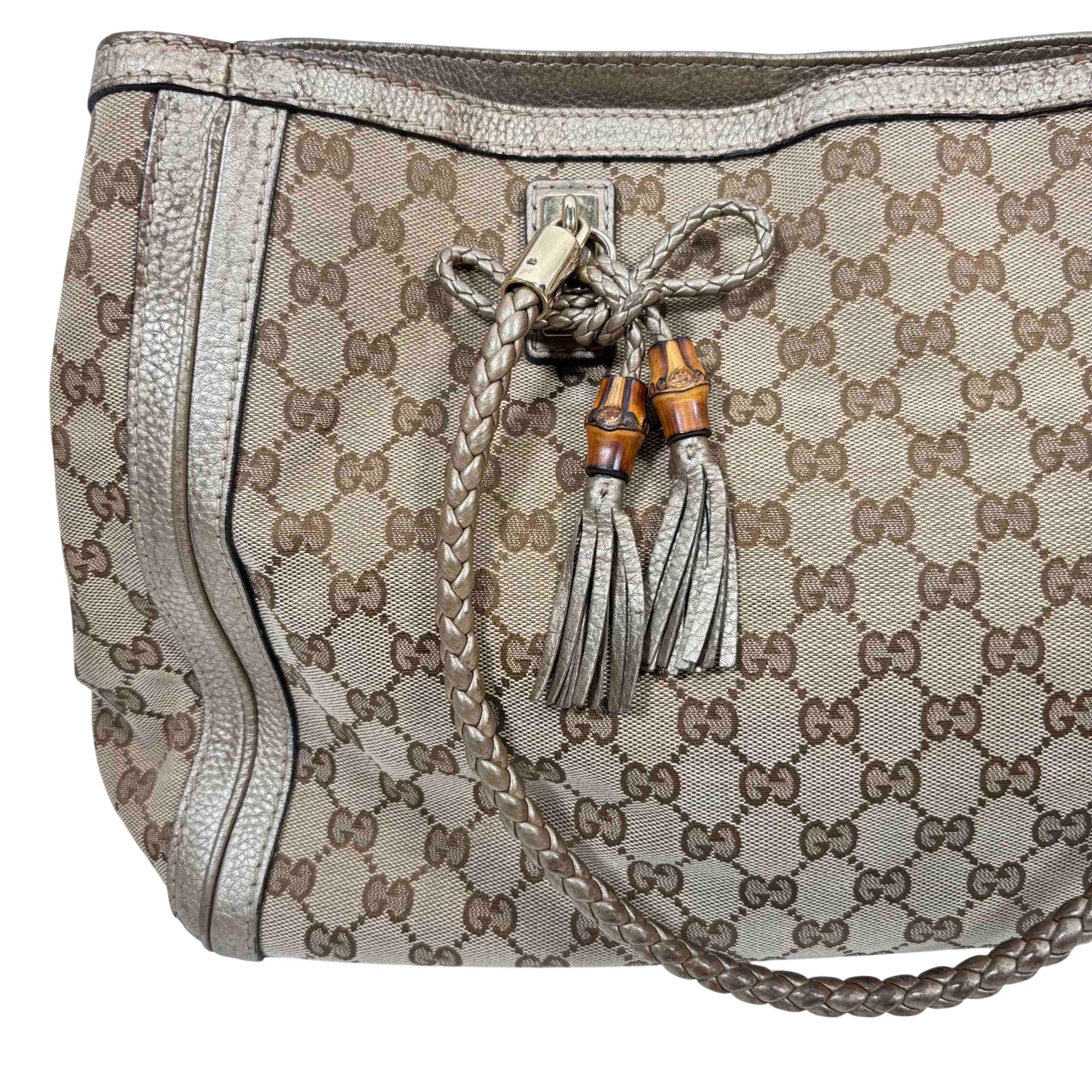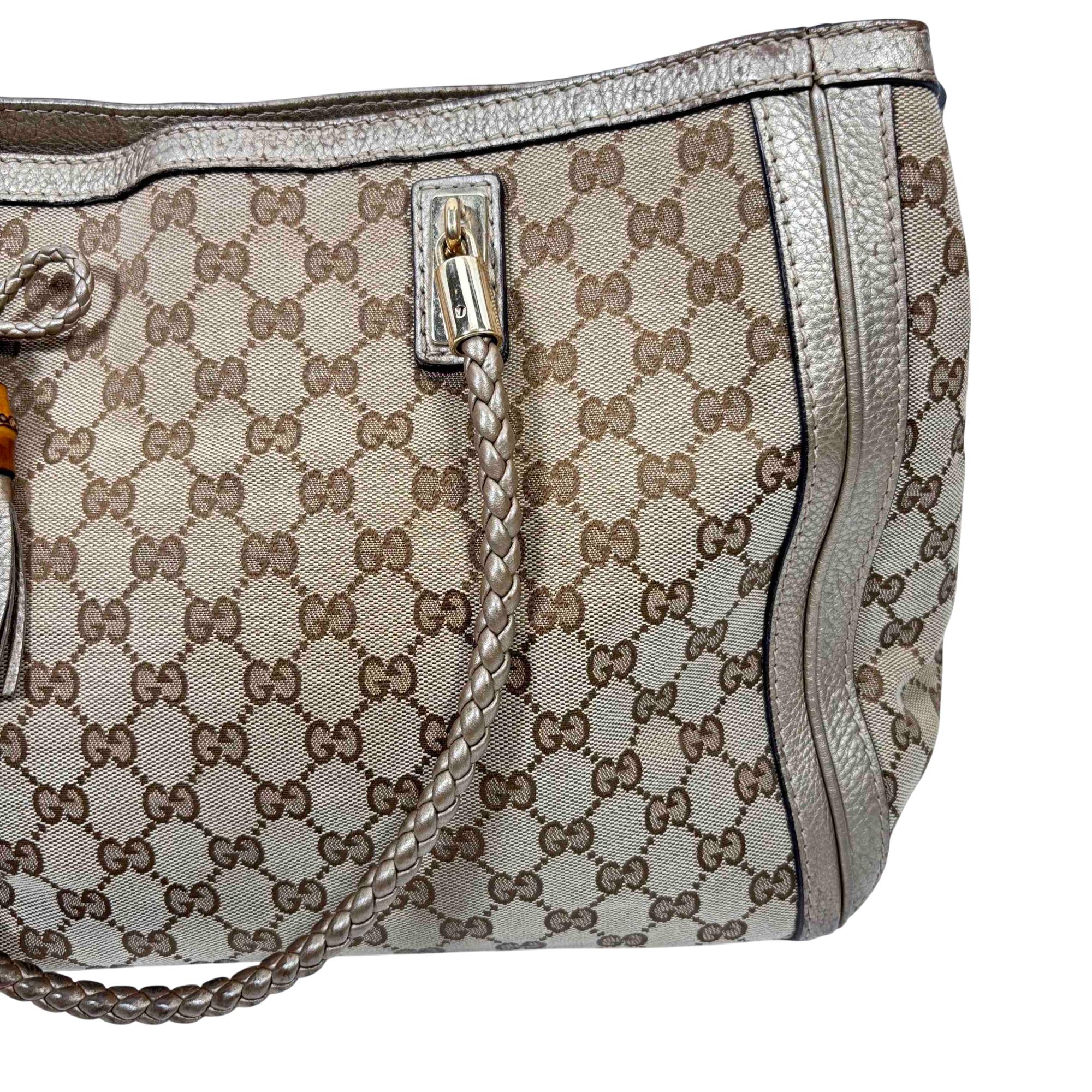 Elevate your style with this authentic Gucci Bella Tote, featuring the iconic GG monogram canvas accented with luxurious metallic pebbled leather trim and striking bamboo tassel details. This spacious designer bag is perfect for everyday wear or travel, combining Italian craftsmanship with practicality and timeless elegance. Show off your fashion-forward sensibility with an accessory thats instantly recognizable and highly sought after.
