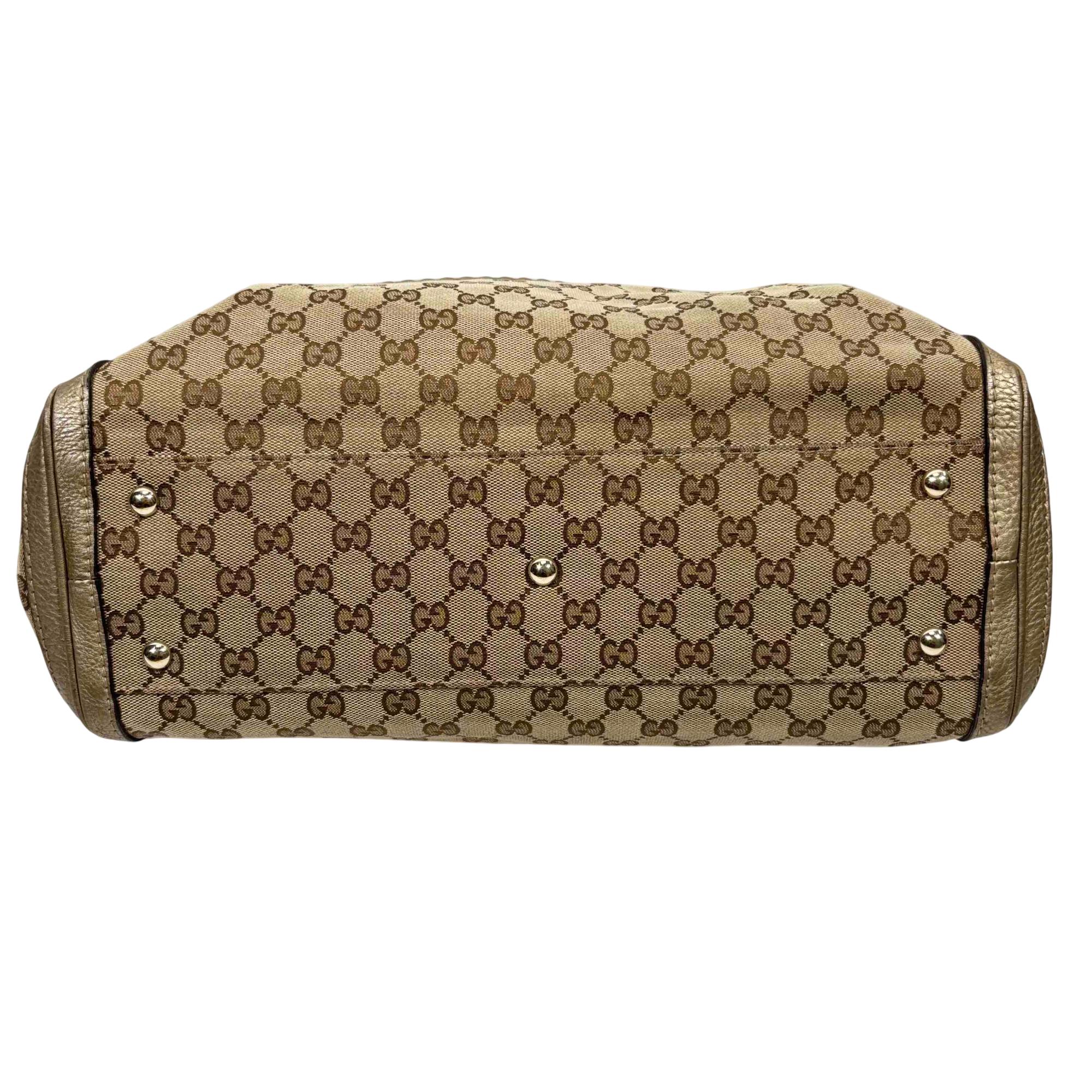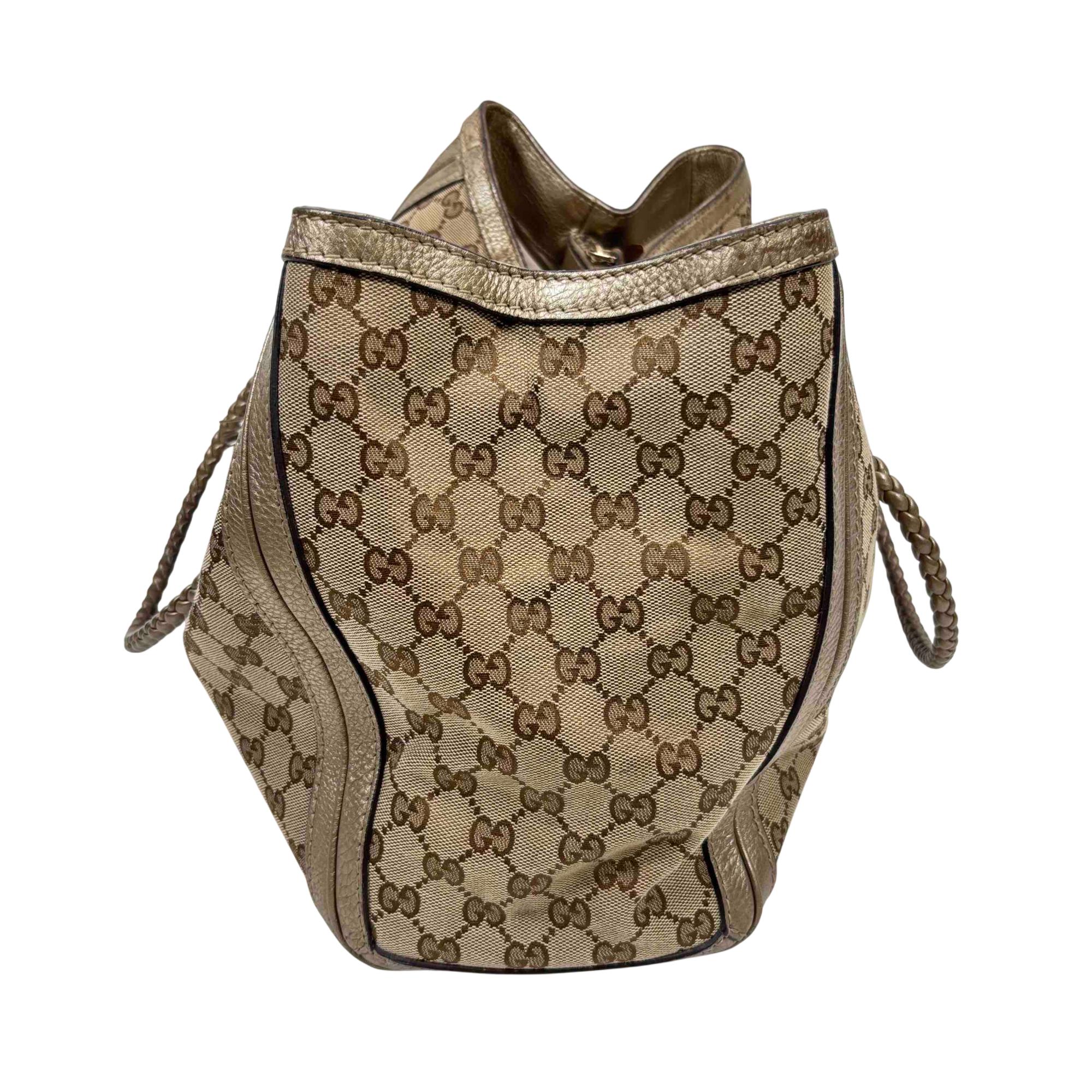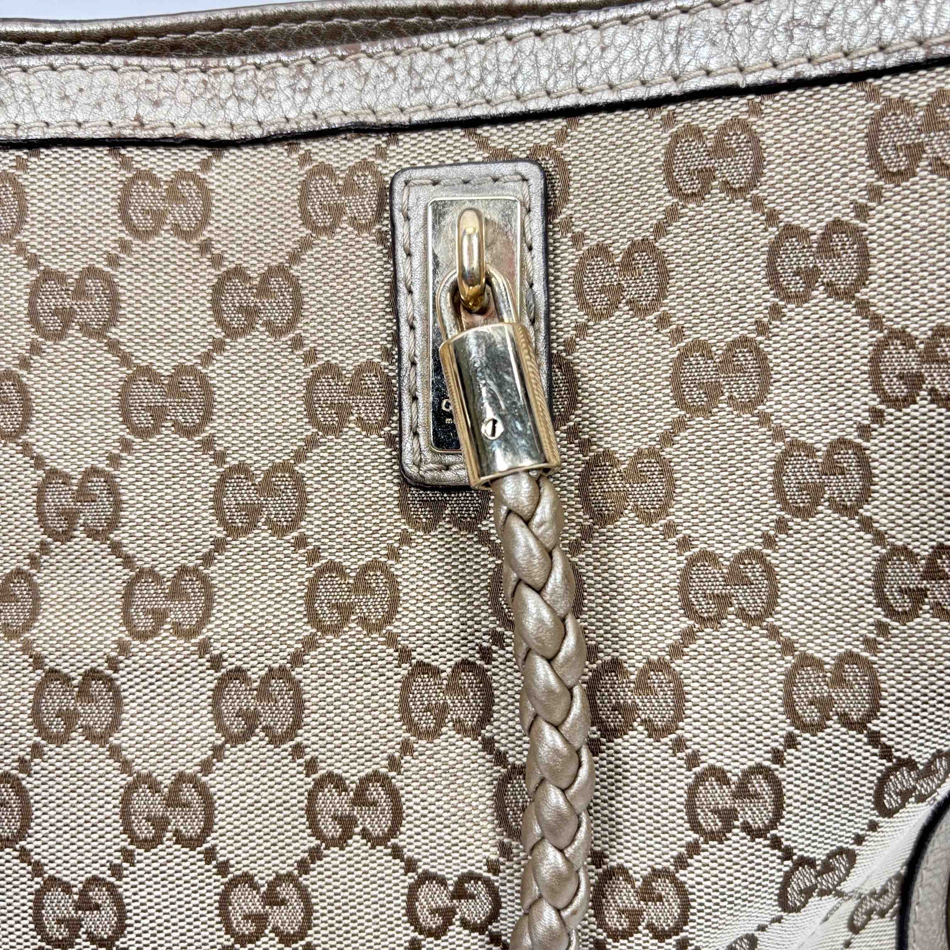 Elevate your style with this authentic Gucci Bella Tote, featuring the iconic GG monogram canvas accented with luxurious metallic pebbled leather trim and striking bamboo tassel details. This spacious designer bag is perfect for everyday wear or travel, combining Italian craftsmanship with practicality and timeless elegance. Show off your fashion-forward sensibility with an accessory thats instantly recognizable and highly sought after.