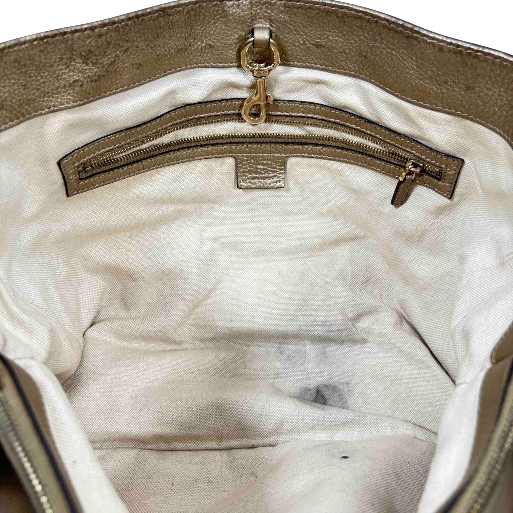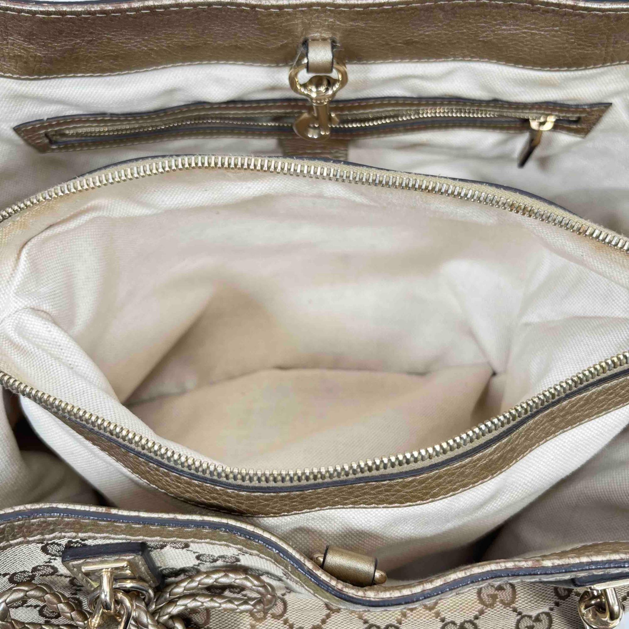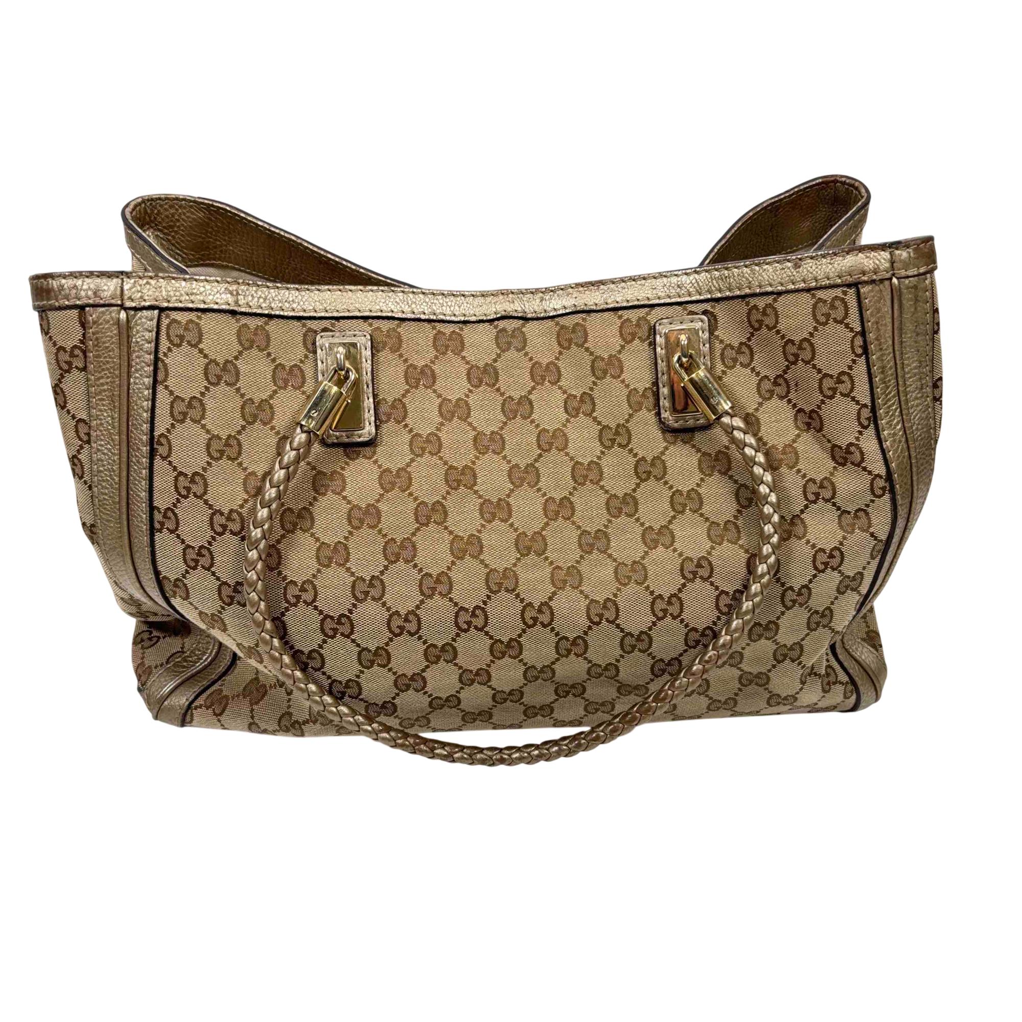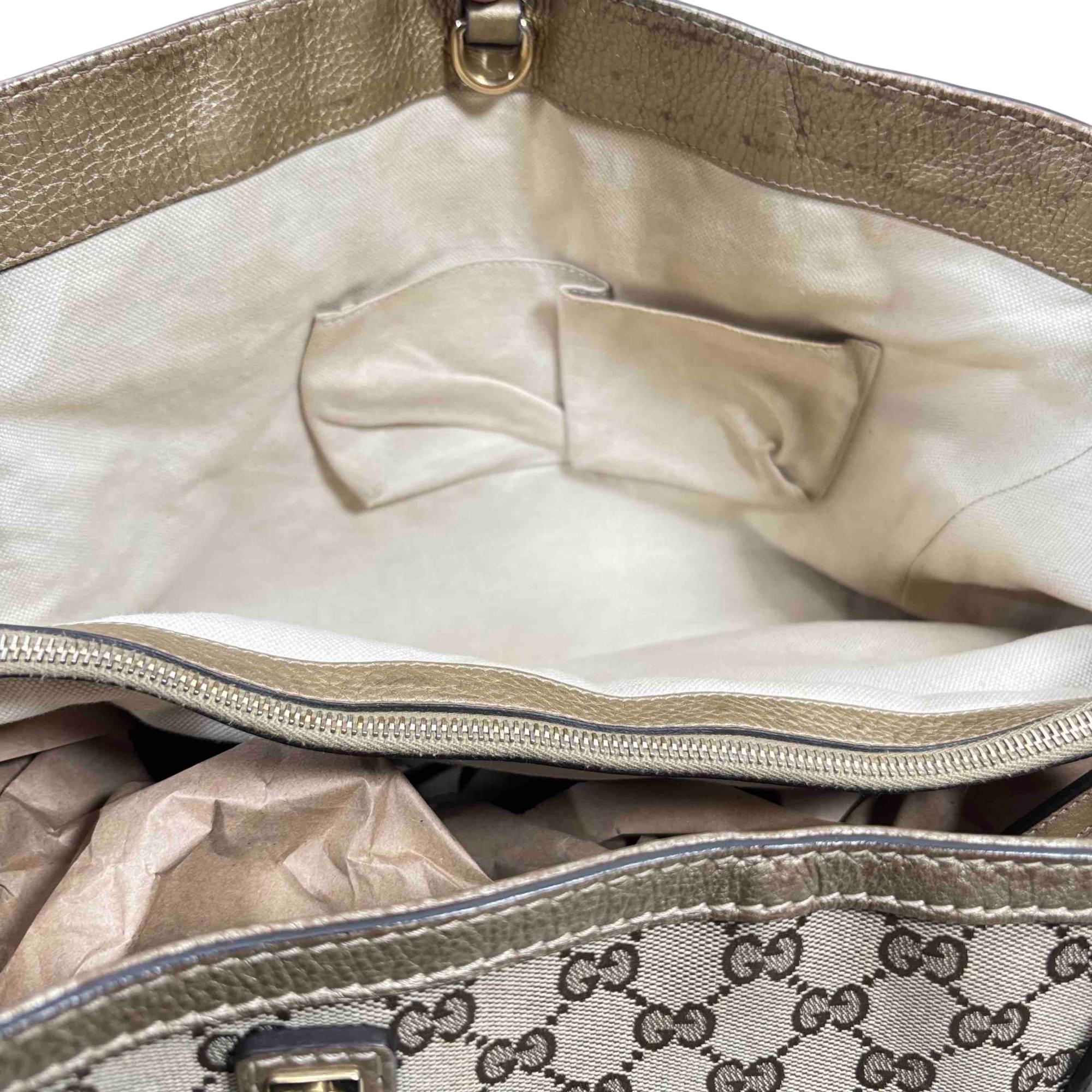 Elevate your style with this authentic Gucci Bella Tote, featuring the iconic GG monogram canvas accented with luxurious metallic pebbled leather trim and striking bamboo tassel details. This spacious designer bag is perfect for everyday wear or travel, combining Italian craftsmanship with practicality and timeless elegance. Show off your fashion-forward sensibility with an accessory thats instantly recognizable and highly sought after.