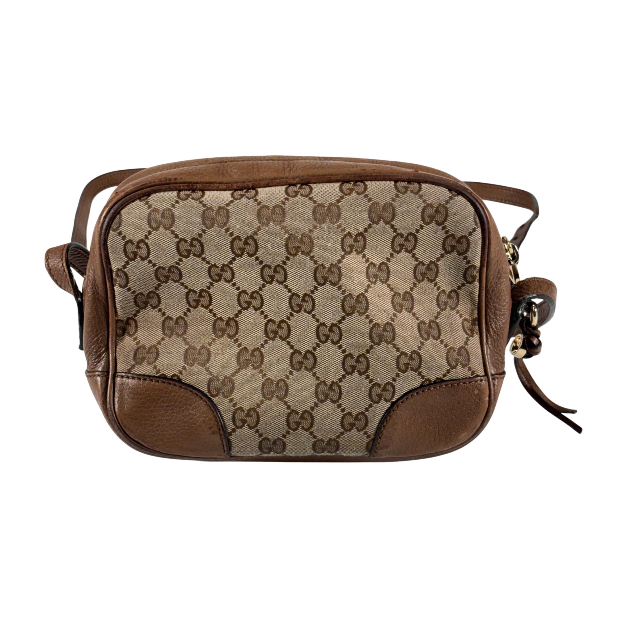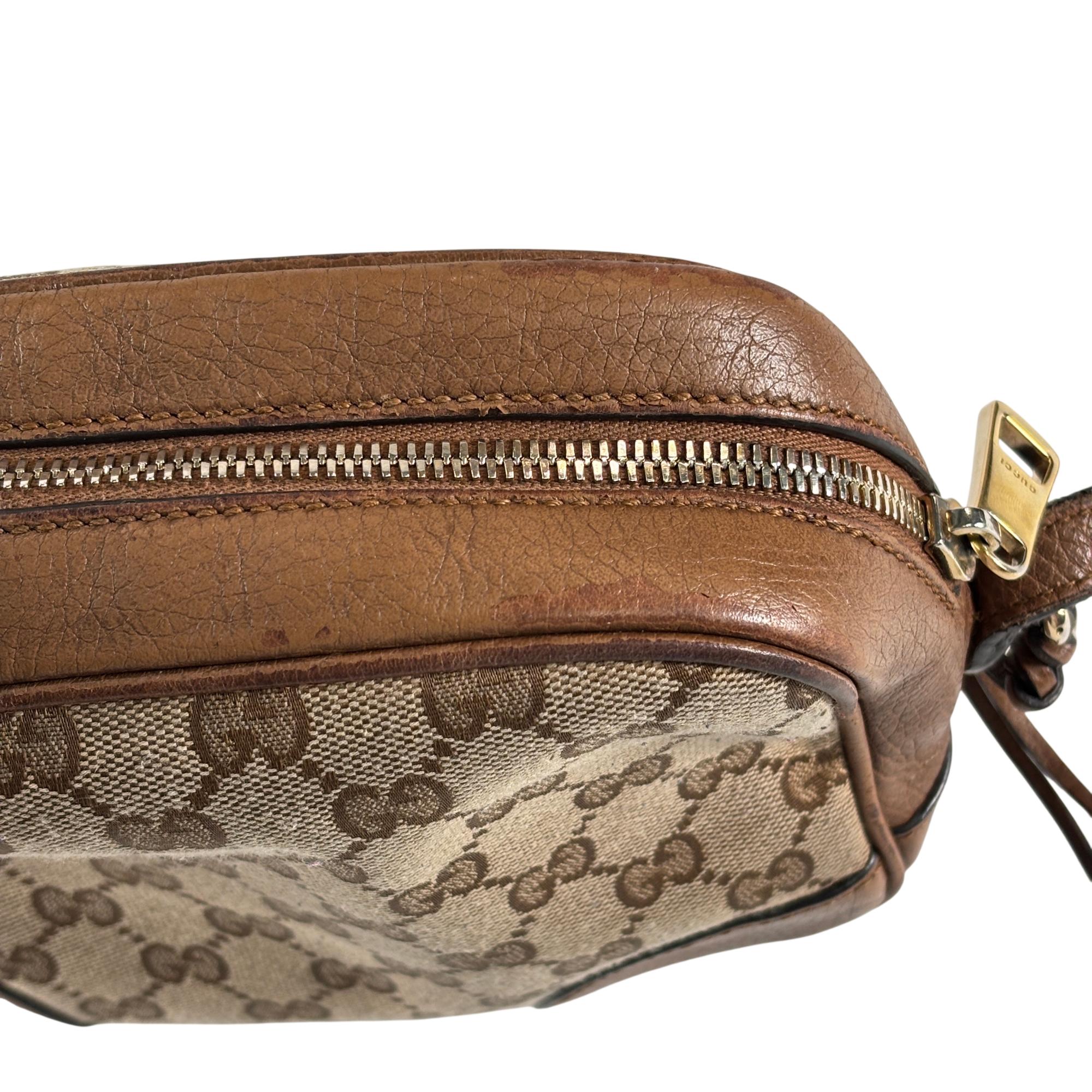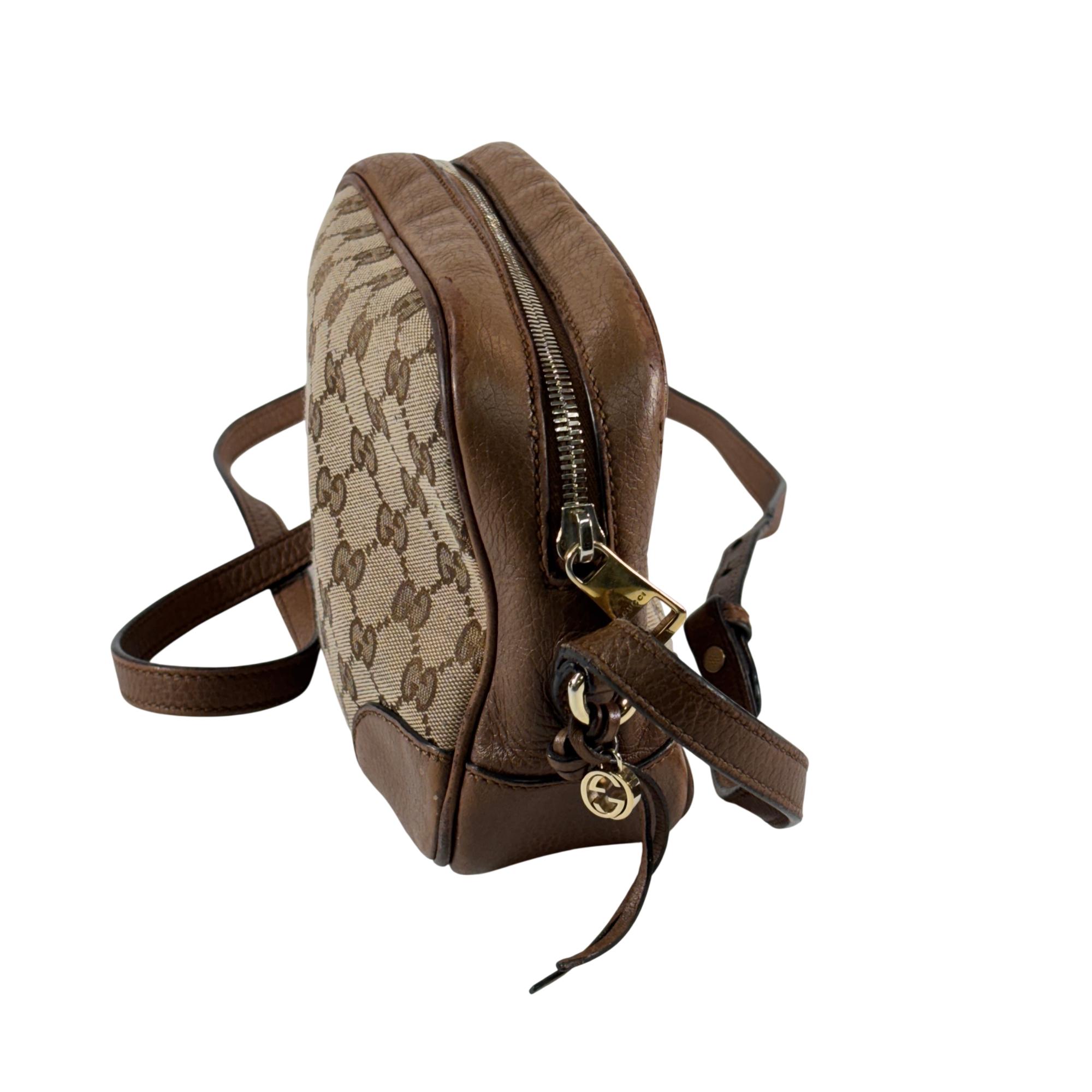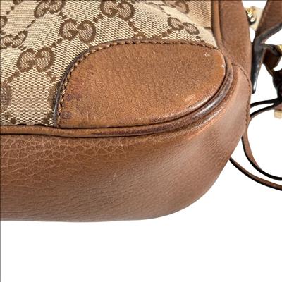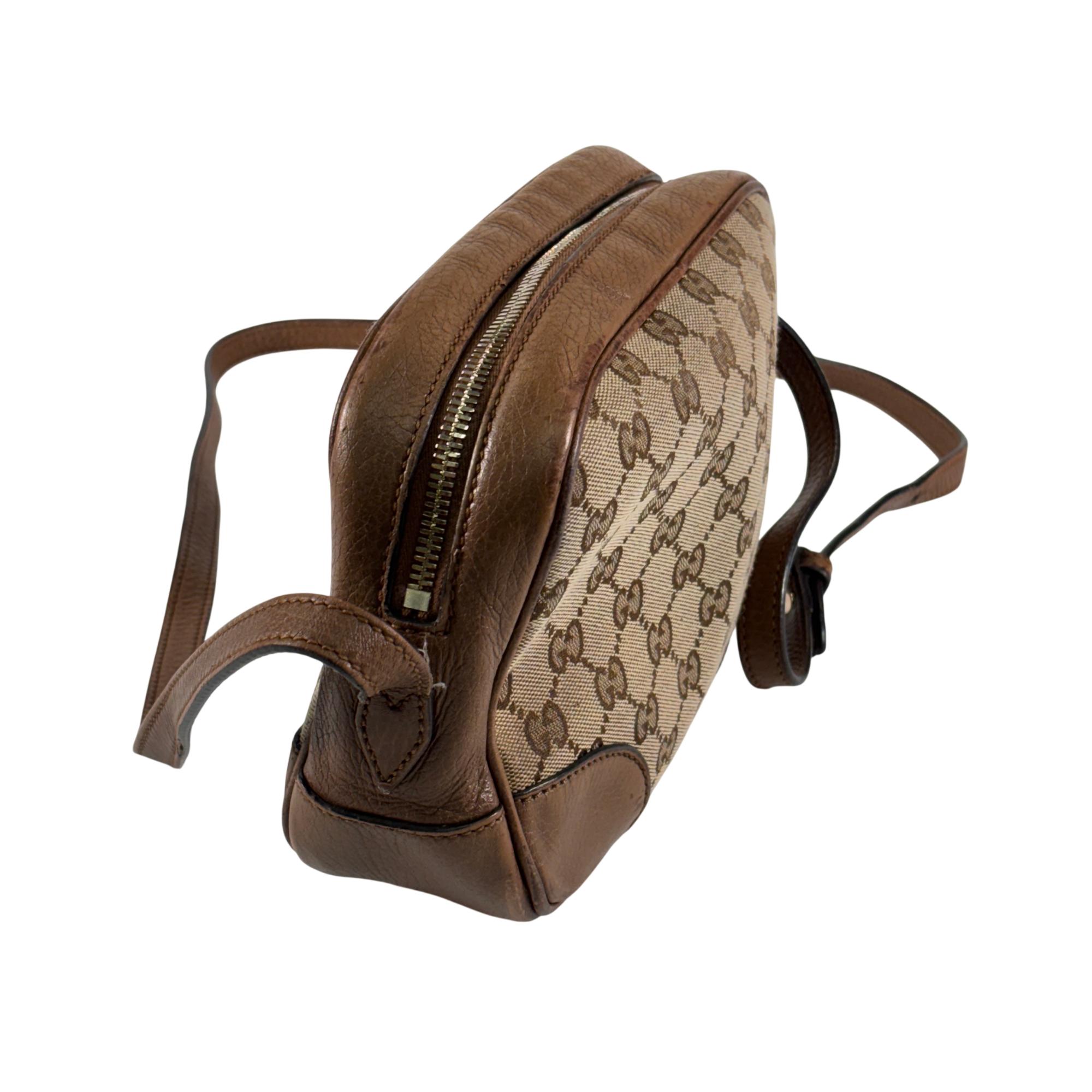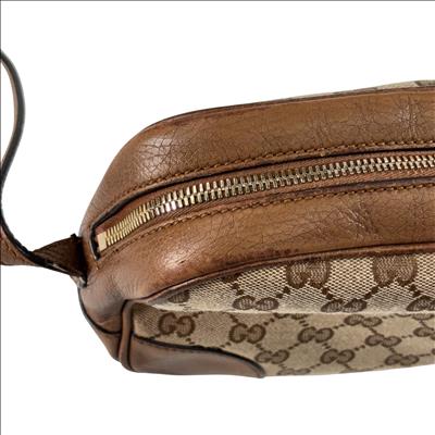 Featuring a distinctive GG canvas pattern combined with brown leather accents, this Gucci GG Canvas Bree Brown Leather Crossbody Bag (Model 449413 204991) offers refined craftsmanship and sophisticated style. The bag includes a sturdy zipper closure and a mix of durable fabric and smooth leather surfaces, making it an elegant and functional accessory for everyday use.