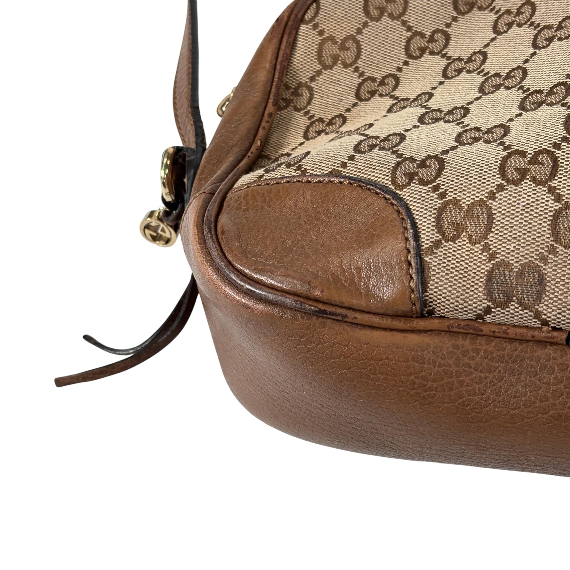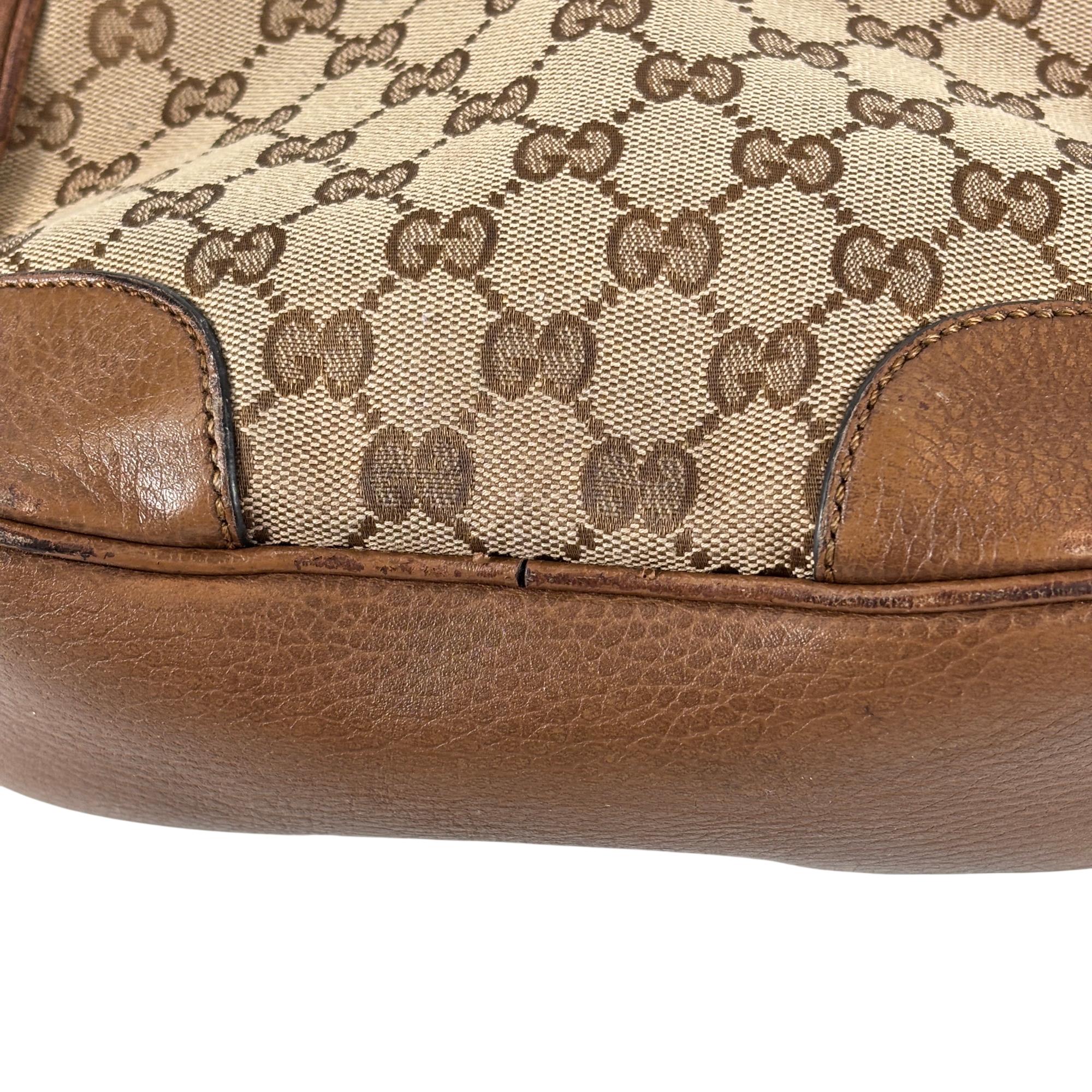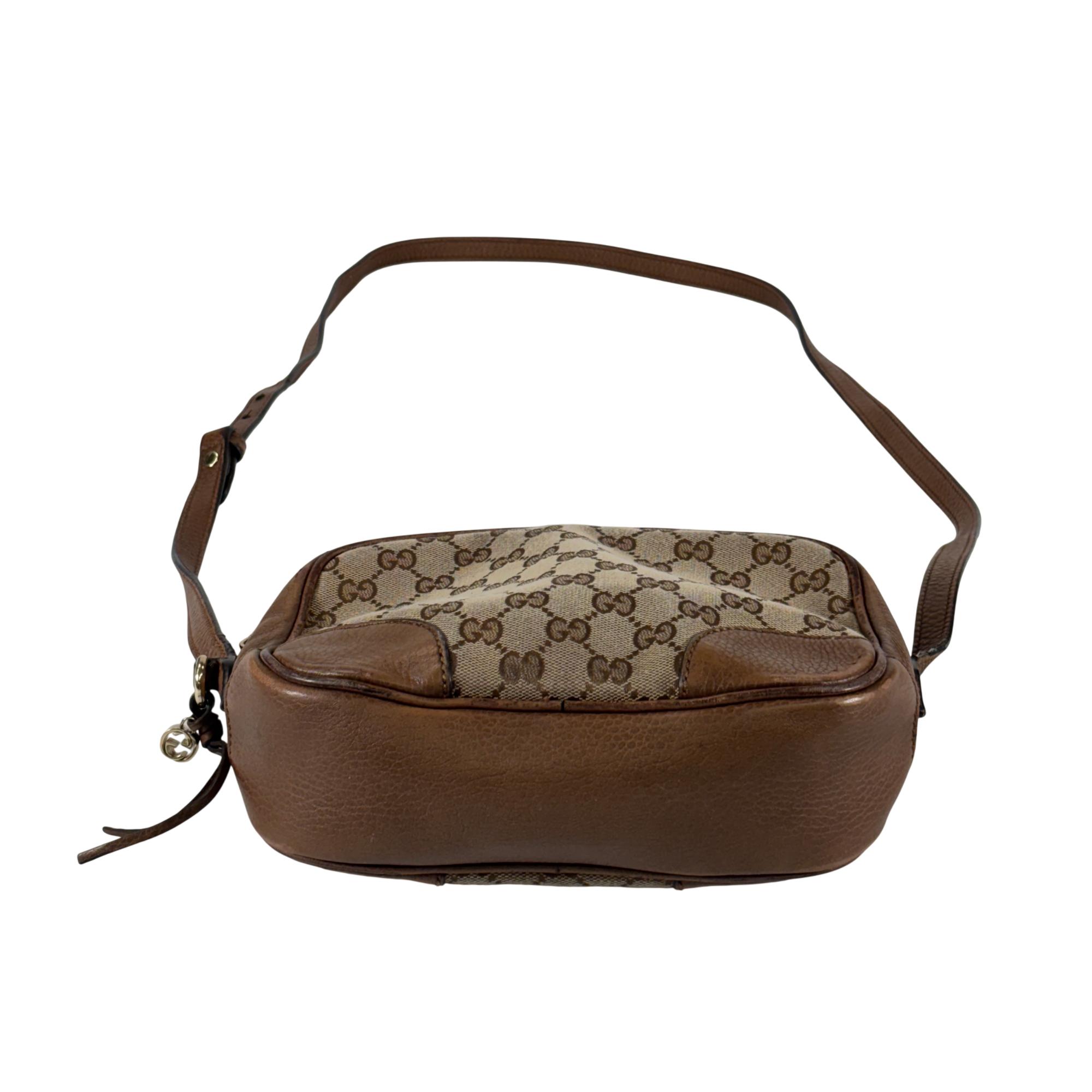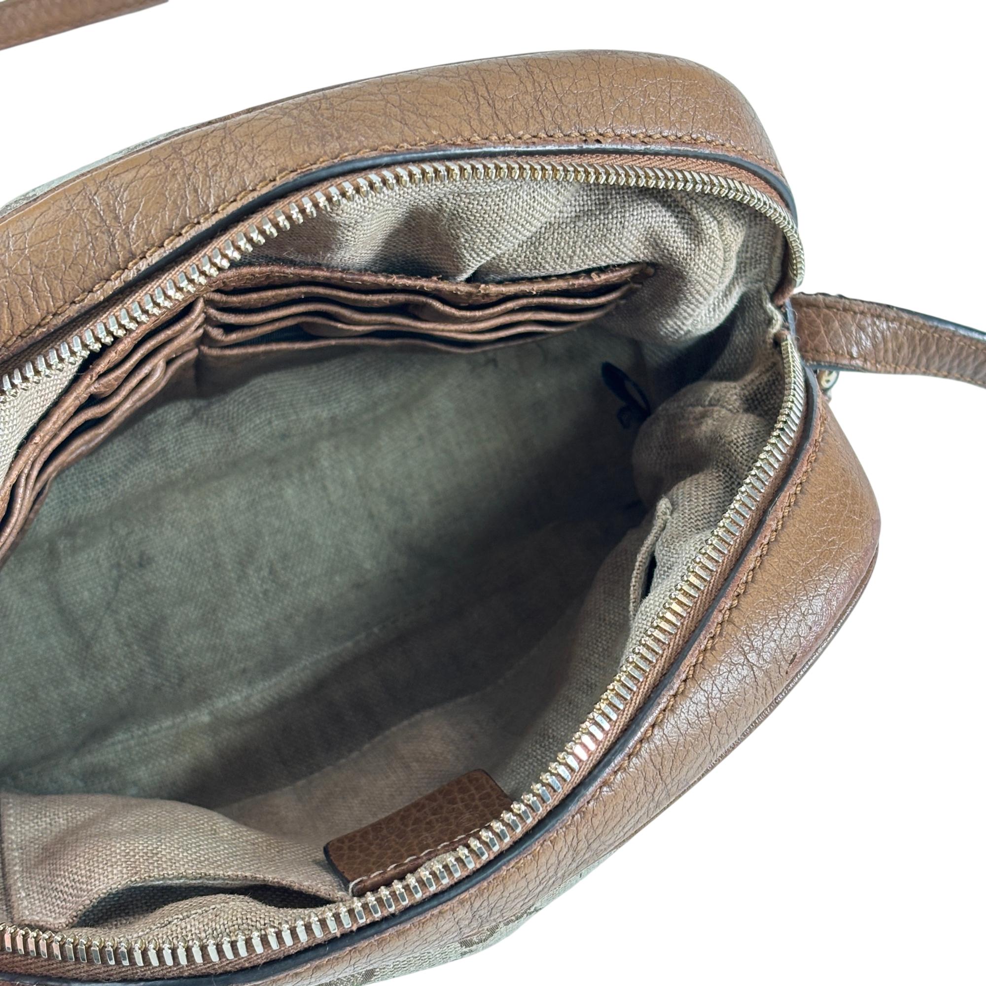 Featuring a distinctive GG canvas pattern combined with brown leather accents, this Gucci GG Canvas Bree Brown Leather Crossbody Bag (Model 449413 204991) offers refined craftsmanship and sophisticated style. The bag includes a sturdy zipper closure and a mix of durable fabric and smooth leather surfaces, making it an elegant and functional accessory for everyday use.