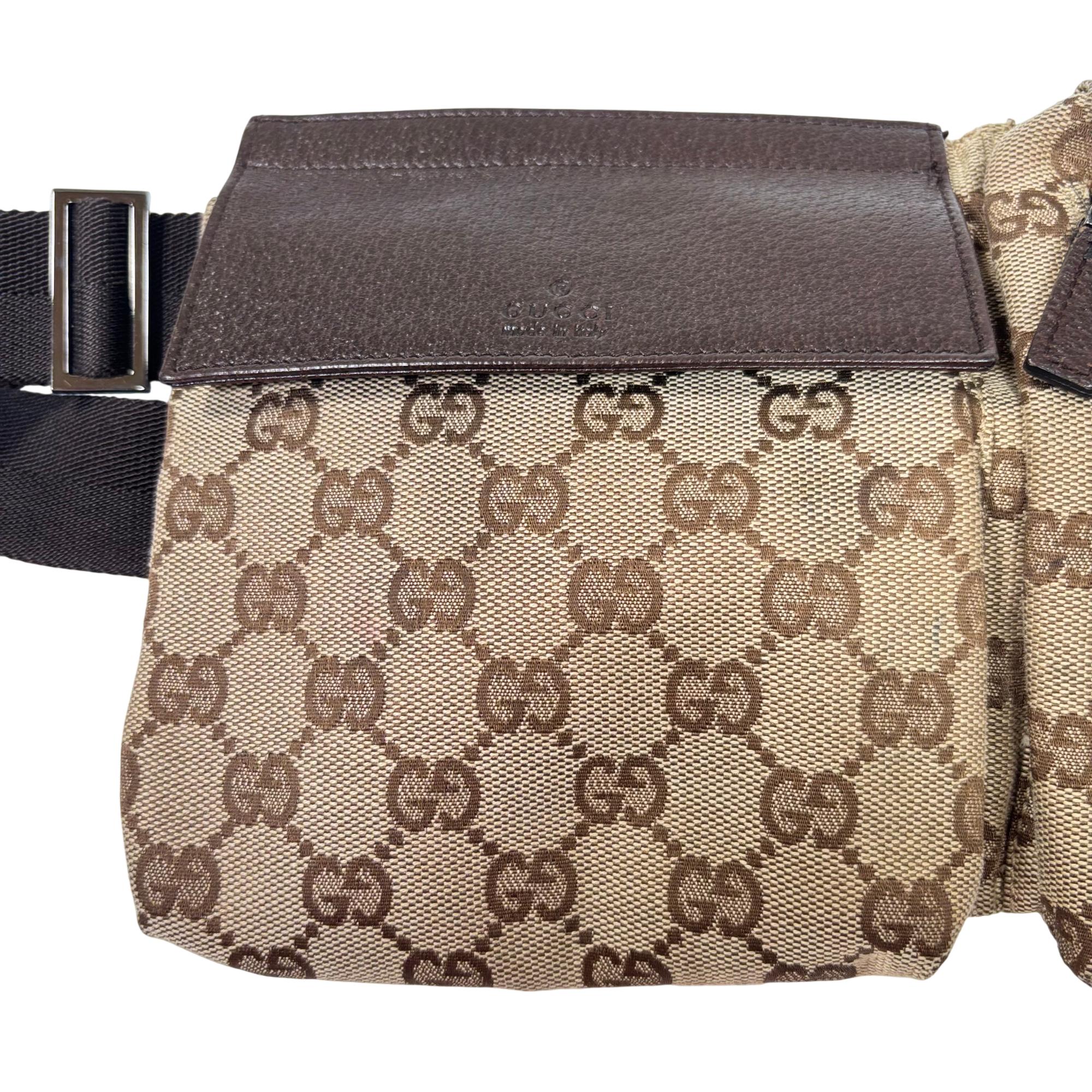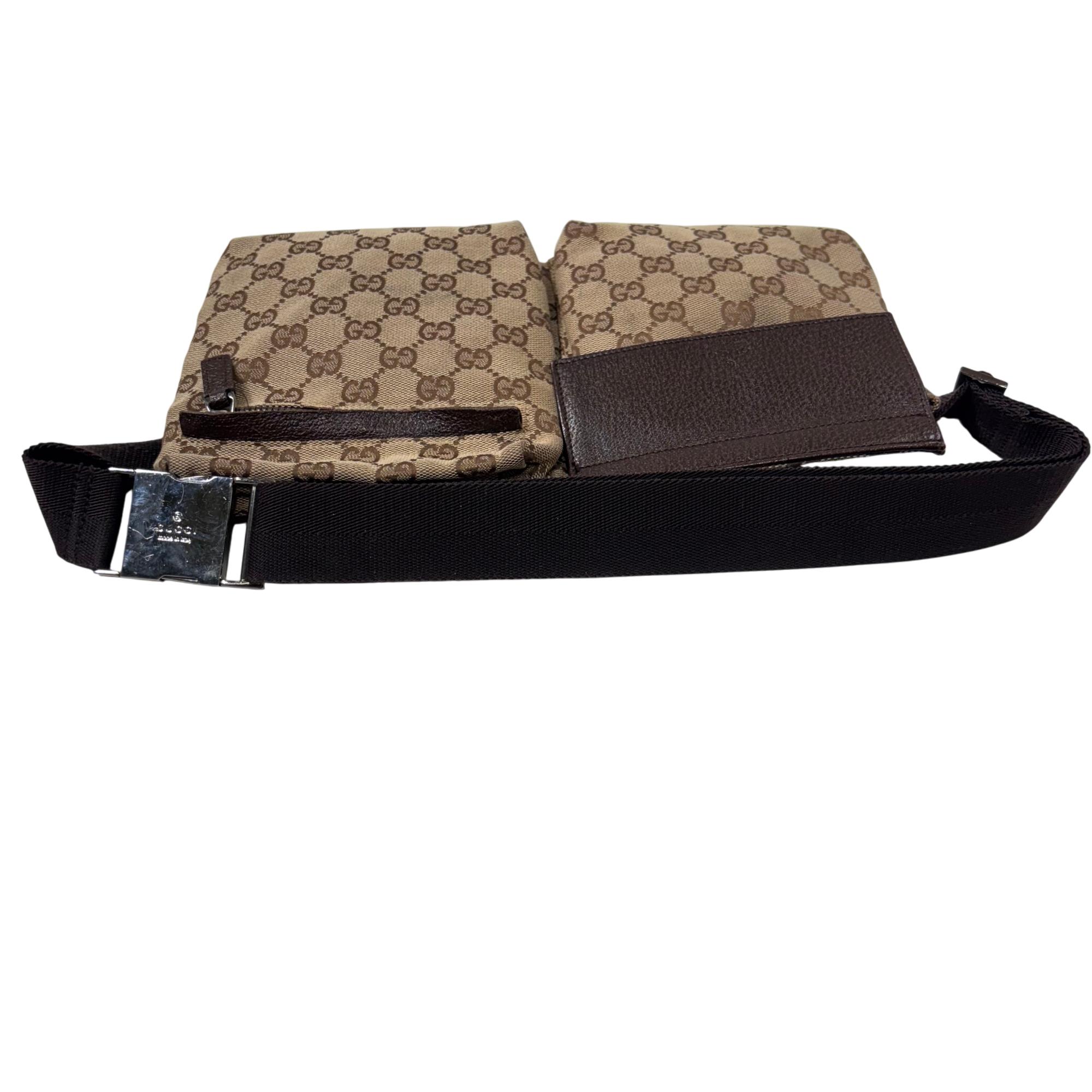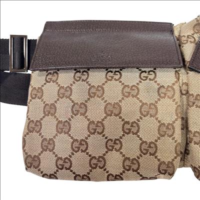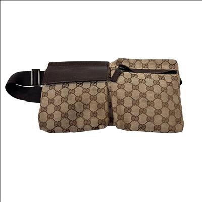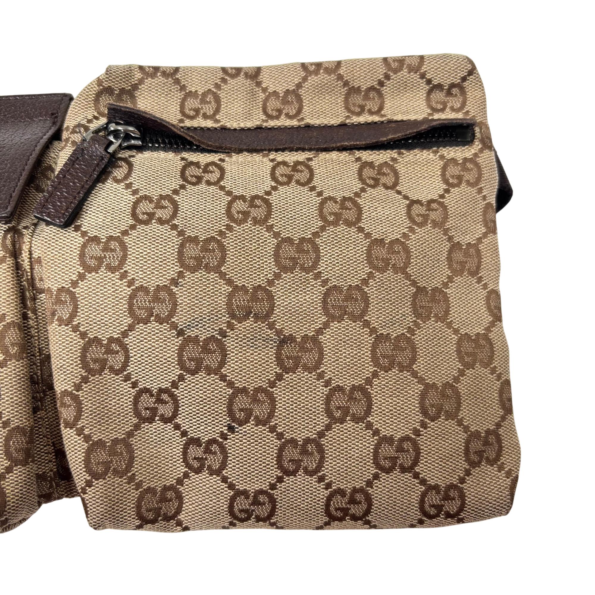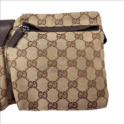 Gucci GG Canvas Double Pocket Belt Bag 28566 features a brown monogram canvas design with dual pockets for organized carry. The bag is accented with leather straps and a buckle, combining classic fashion with functional convenience ideal for hands-free use. Its textured fabric and neutral tones make it a versatile accessory for everyday wear or travel.