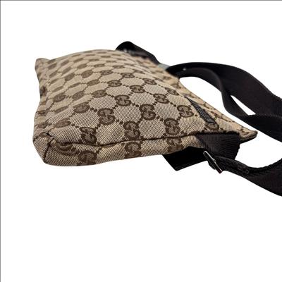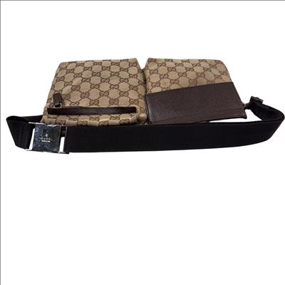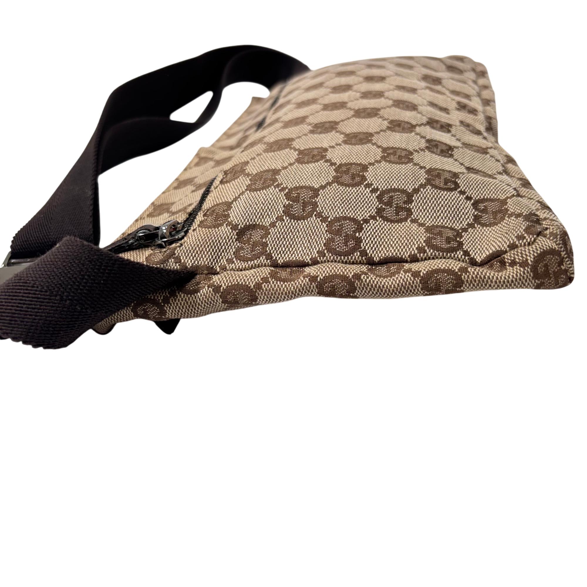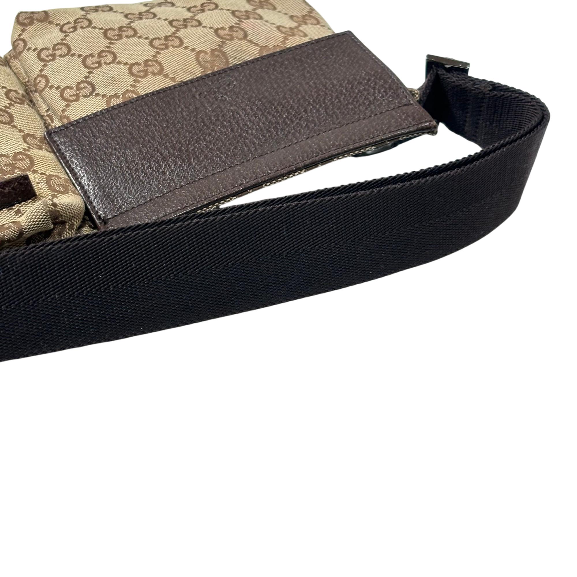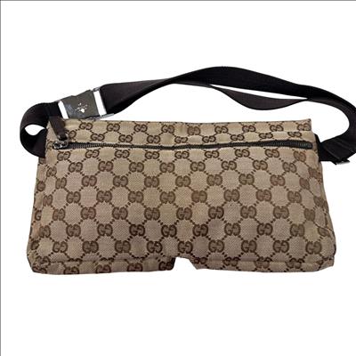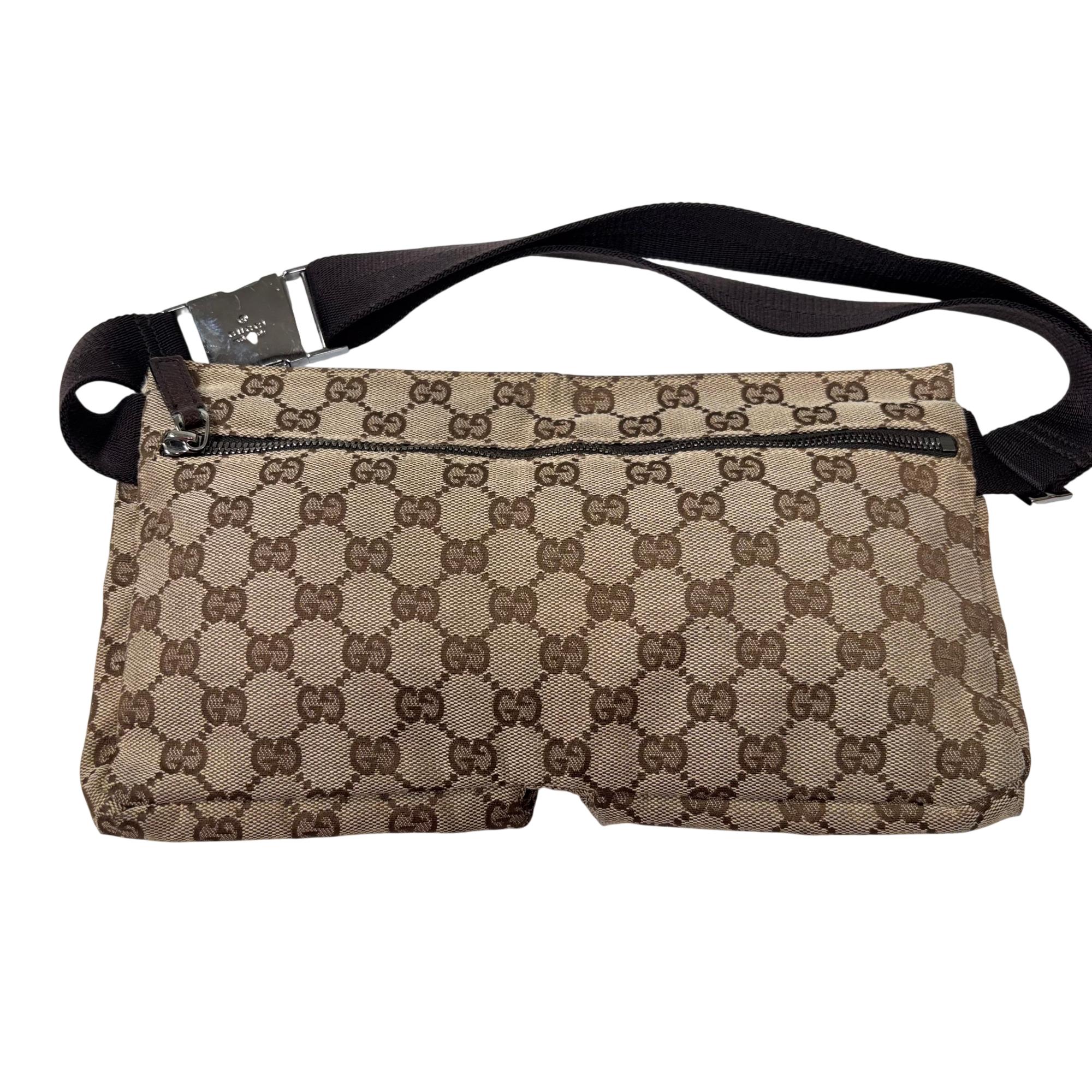 Gucci GG Canvas Double Pocket Belt Bag 28566 features a brown monogram canvas design with dual pockets for organized carry. The bag is accented with leather straps and a buckle, combining classic fashion with functional convenience ideal for hands-free use. Its textured fabric and neutral tones make it a versatile accessory for everyday wear or travel.