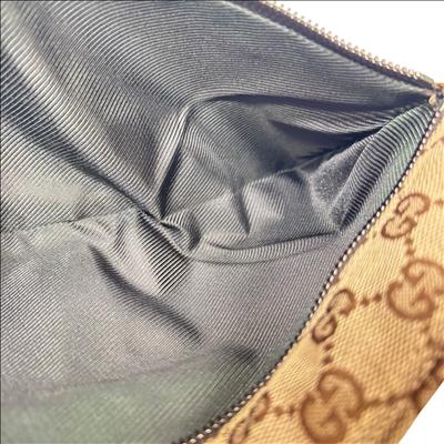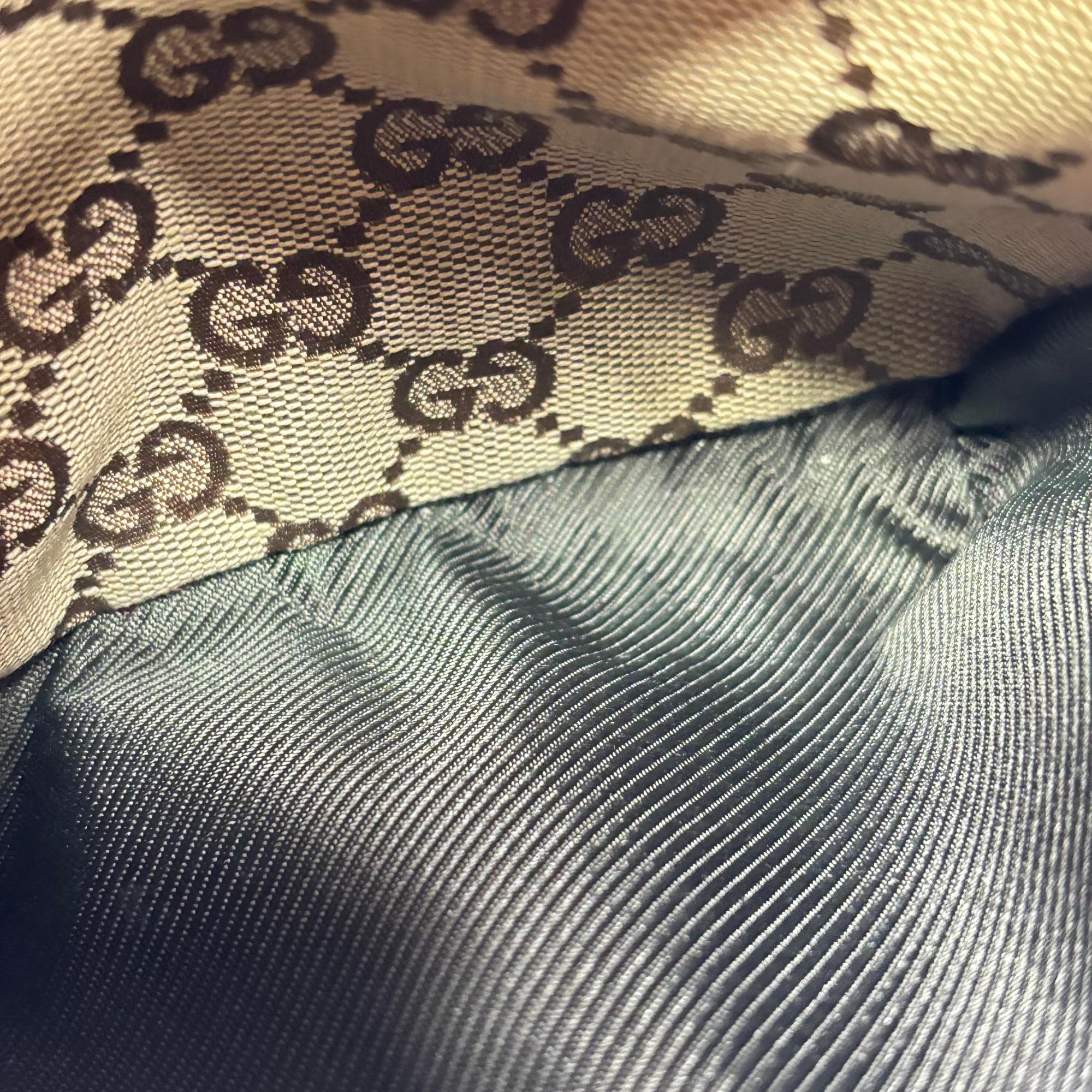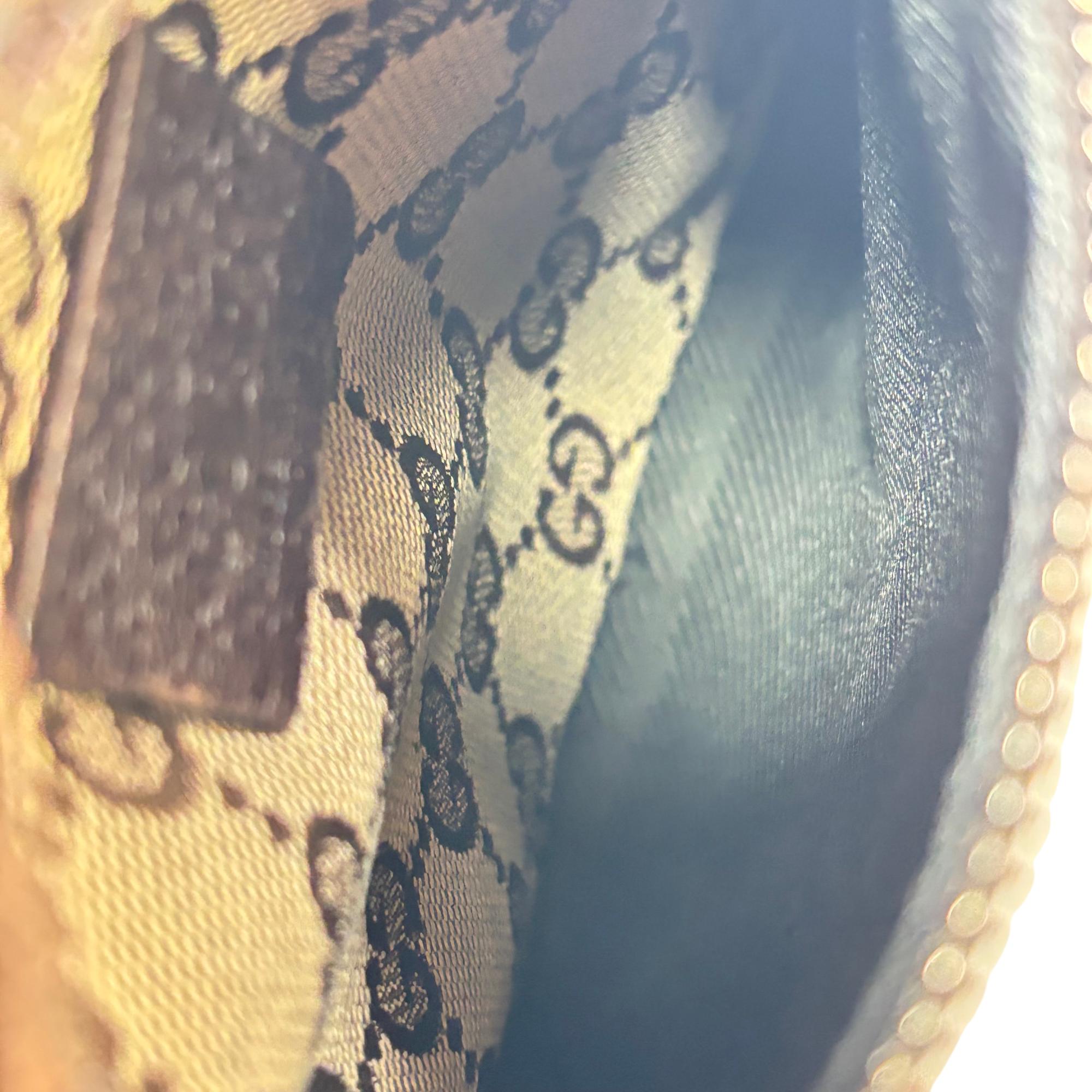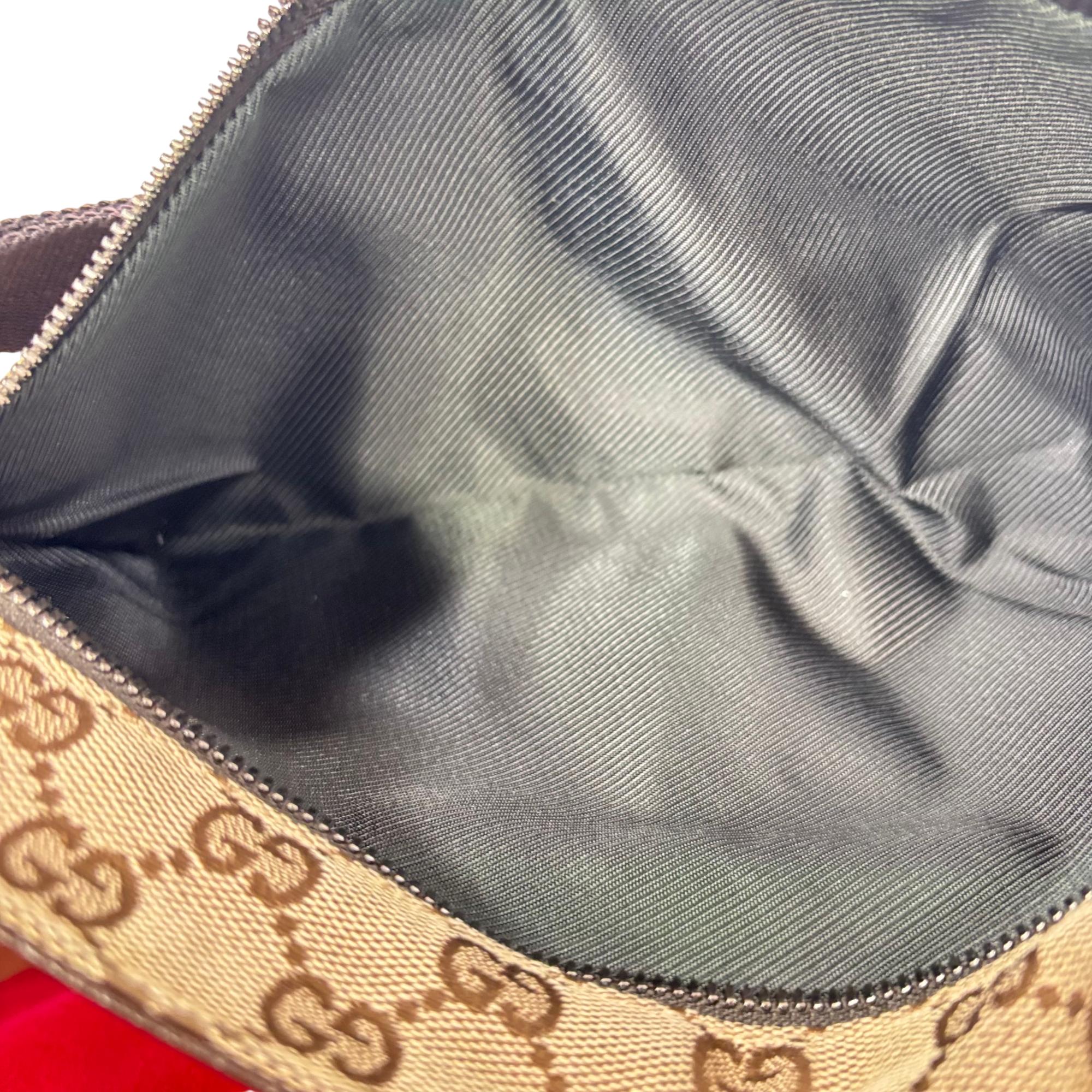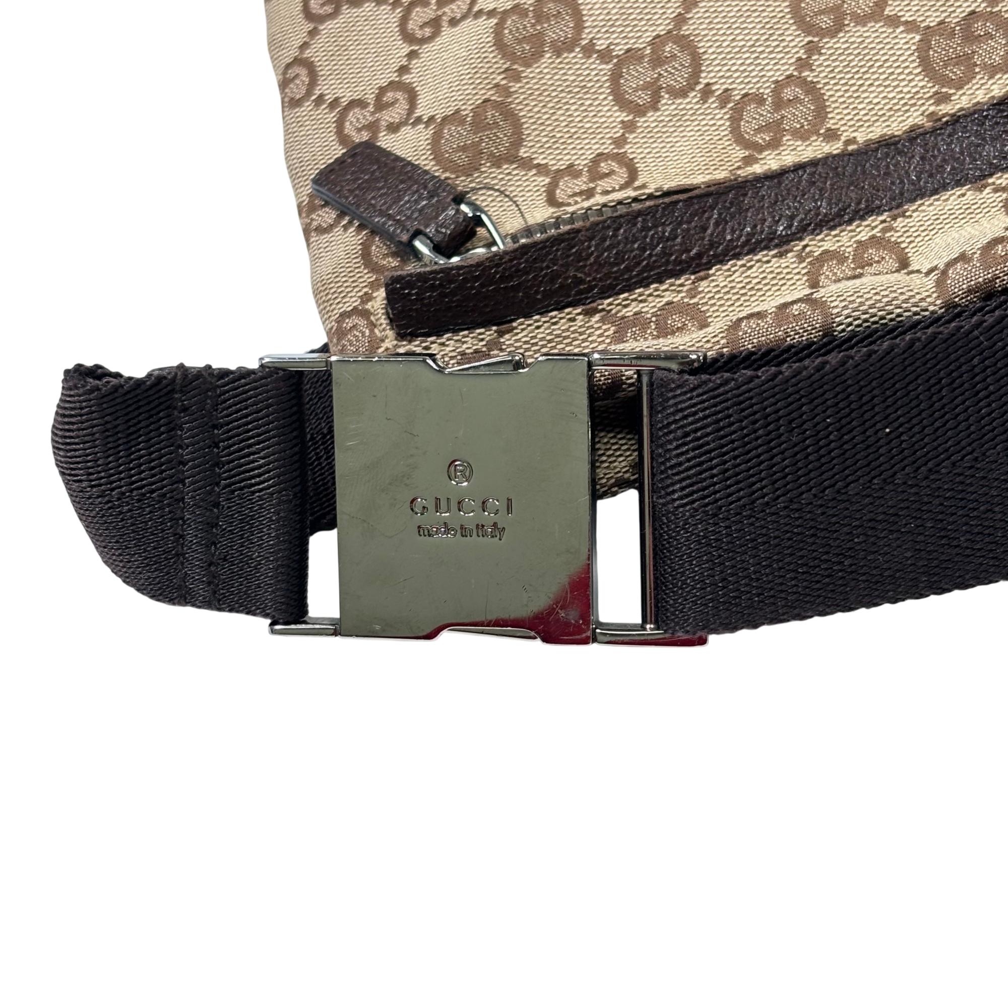 Gucci GG Canvas Double Pocket Belt Bag 28566 features a brown monogram canvas design with dual pockets for organized carry. The bag is accented with leather straps and a buckle, combining classic fashion with functional convenience ideal for hands-free use. Its textured fabric and neutral tones make it a versatile accessory for everyday wear or travel.