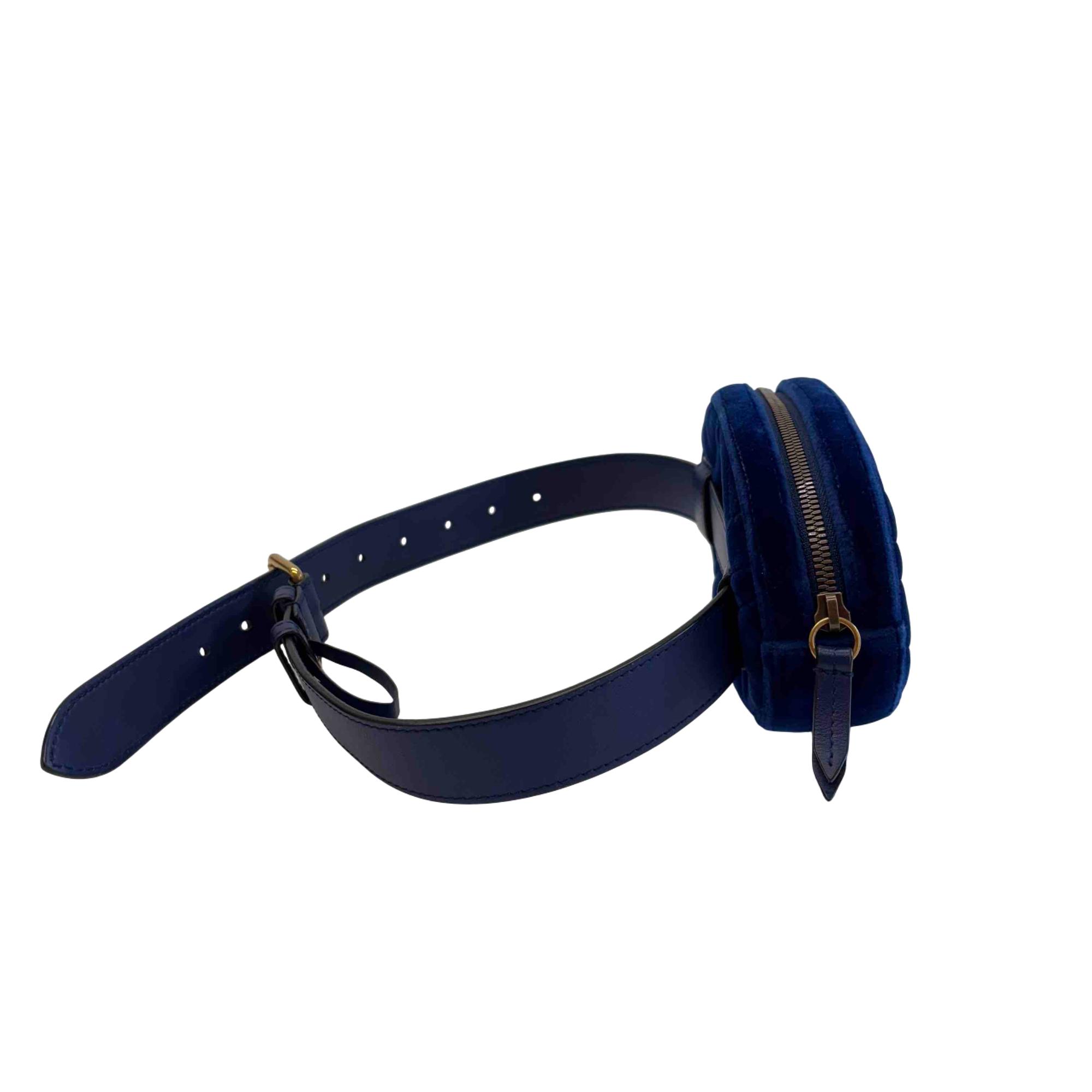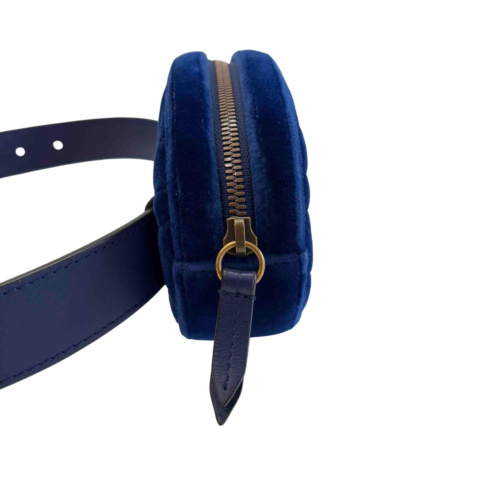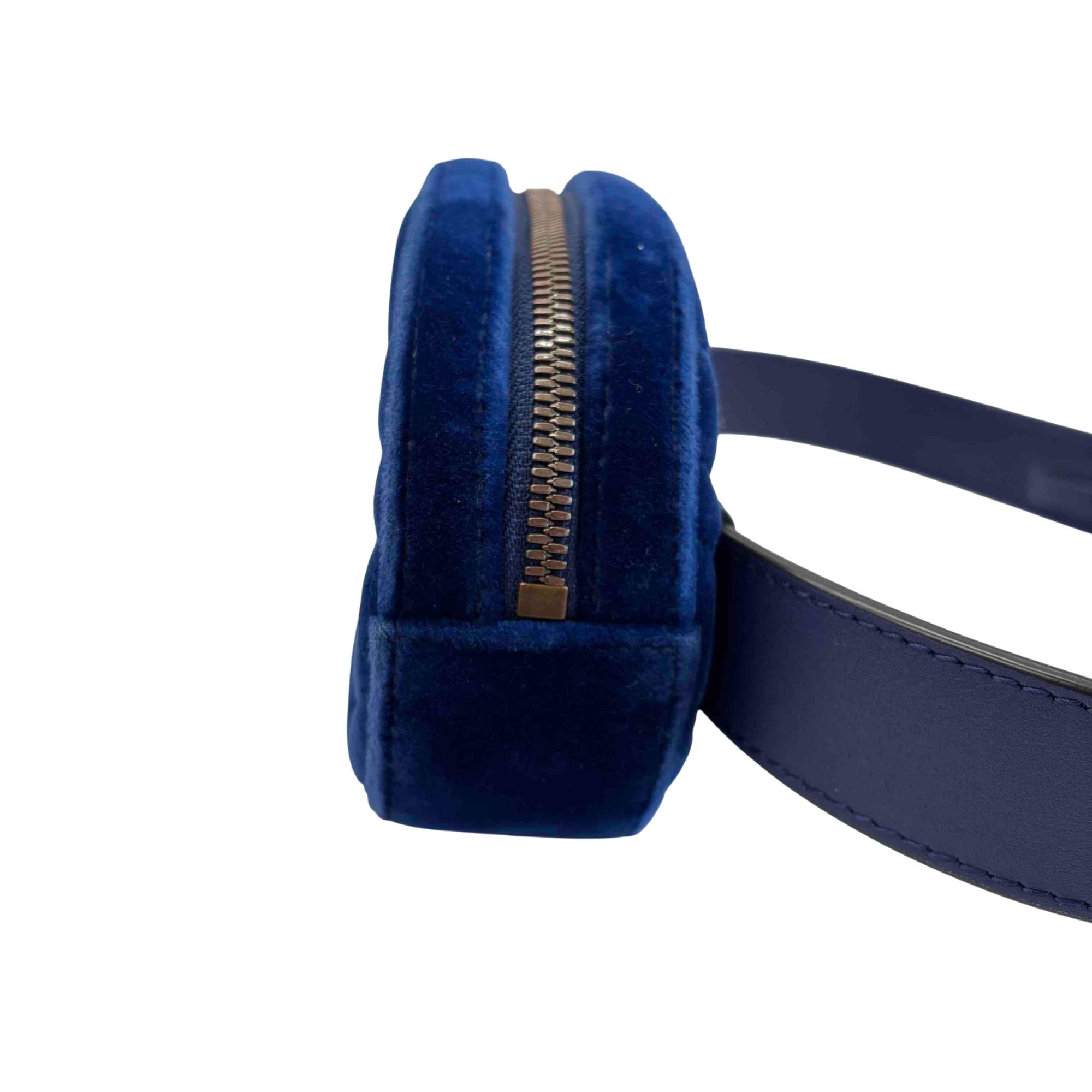 Step up your accessory game with this stunning Gucci GG Marmont Belt Bag, fashioned in luxurious blue velvet suede and accented with a sophisticated gold GG logo. This versatile waist bag combines timeless elegance with modern edge, making it perfect for both everyday wear and special occasions. Enjoy hands-free convenience and unmistakable Gucci style, all in one iconic accessory.