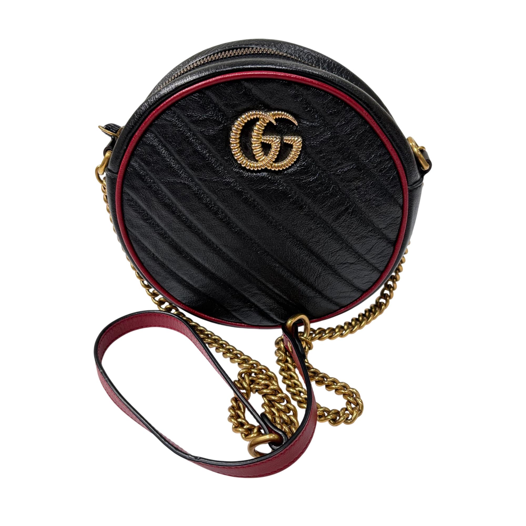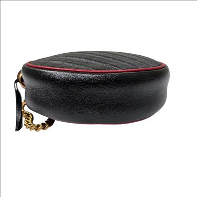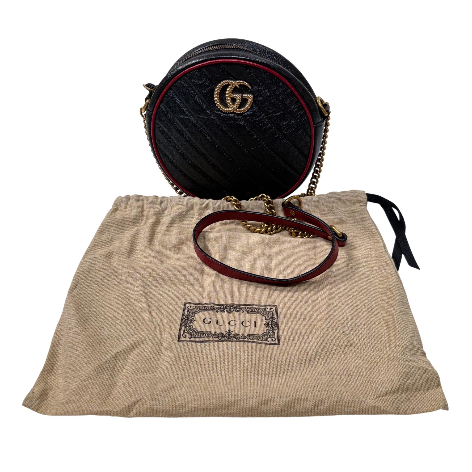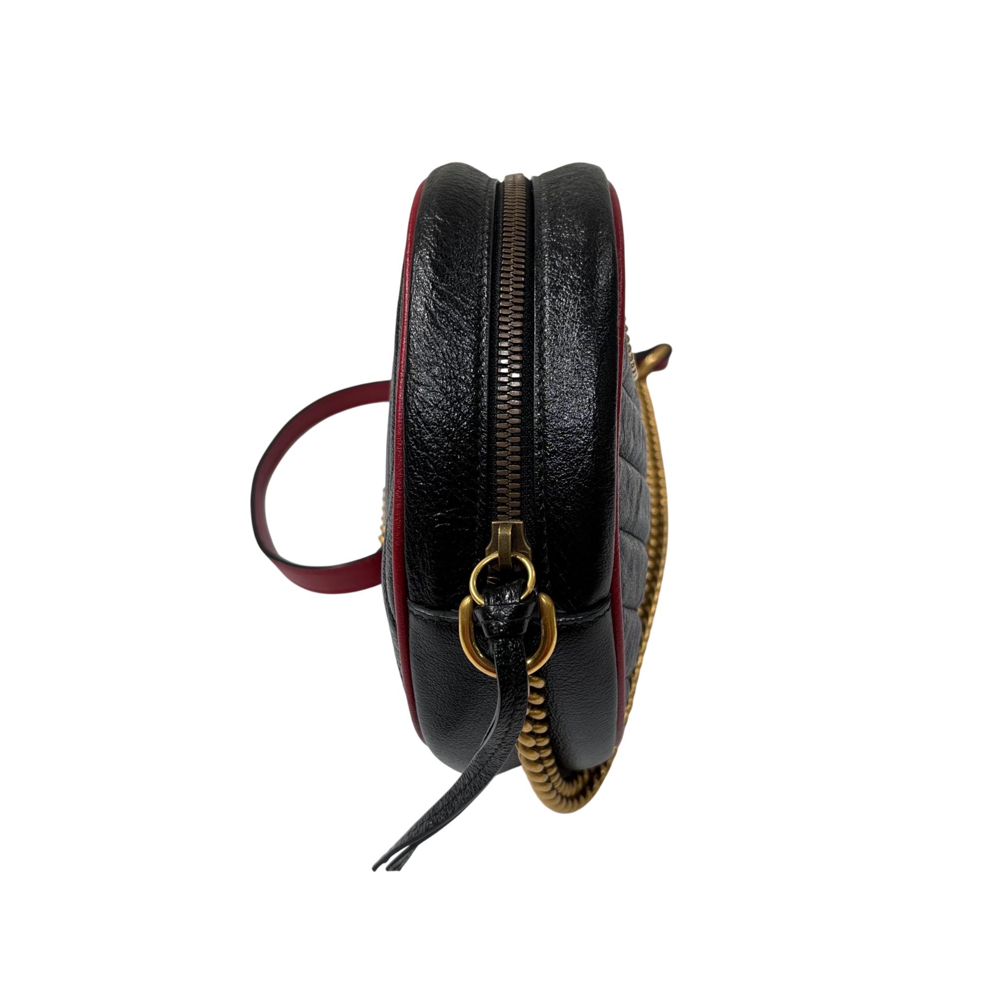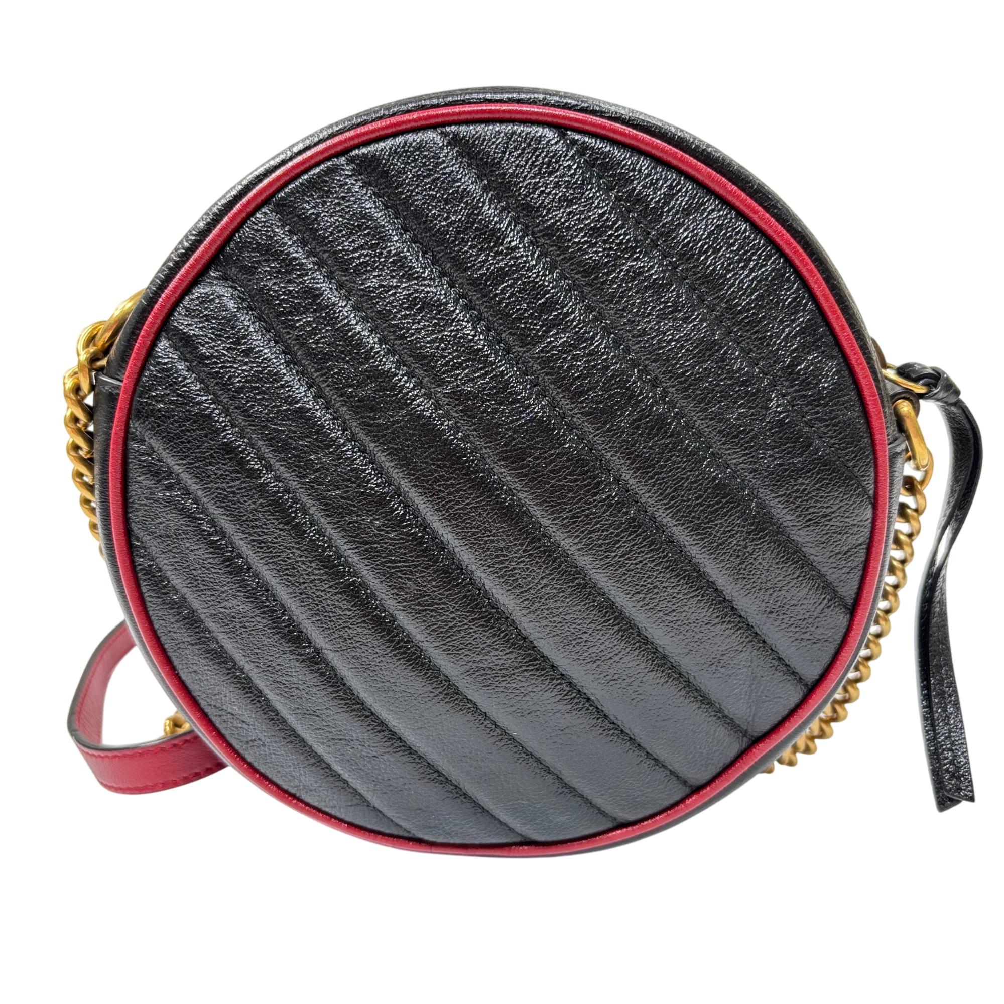 Gucci GG Marmont Mini Round Leather Crossbody Bag, Model 550154, Black/Red Quilted Leather features a distinctive round silhouette crafted from quilted black and red leather accented with a striking gold chain strap. This mini bag showcases elegant craftsmanship with its nuanced textures and iconic design elements, making it a luxurious and fashionable accessory for everyday wear.