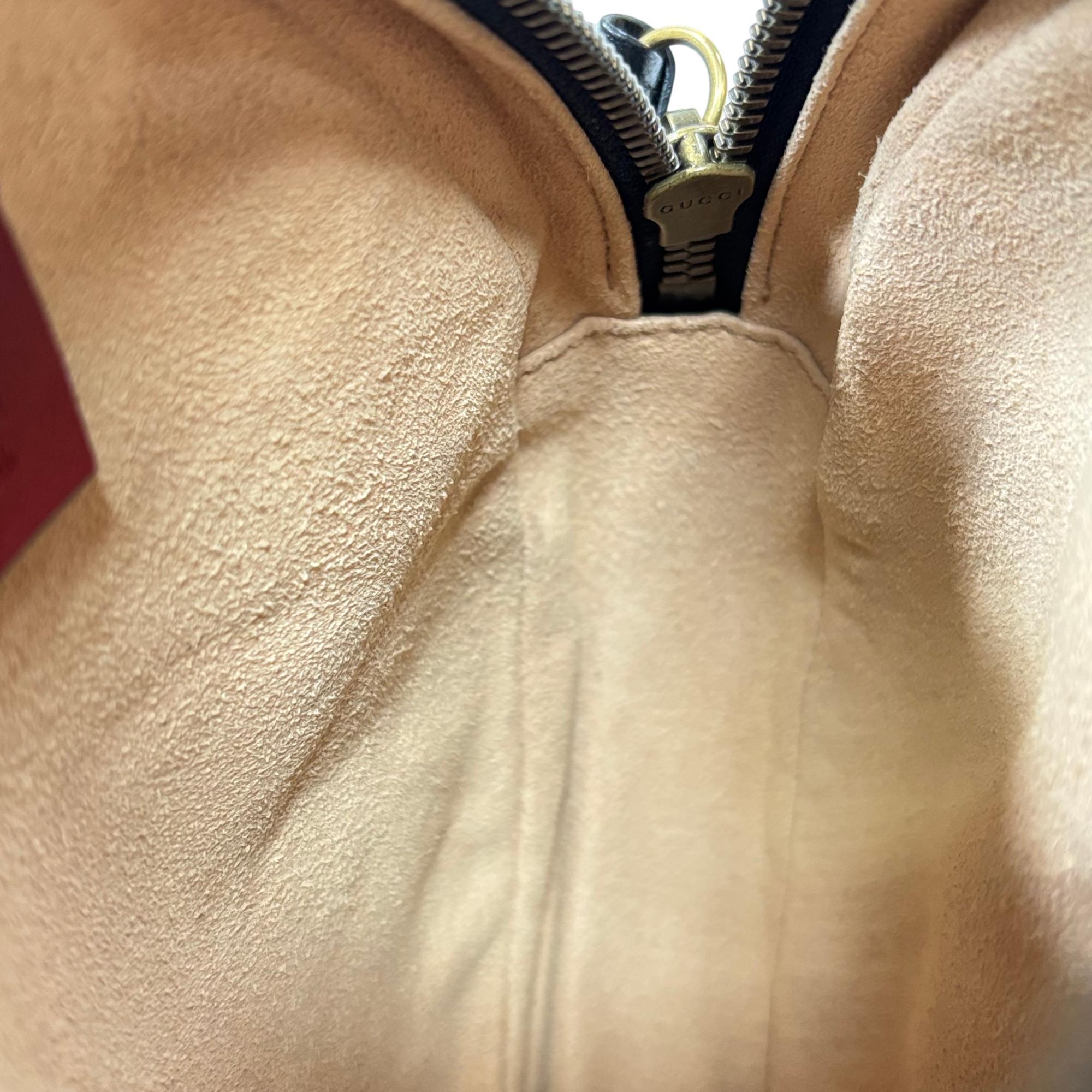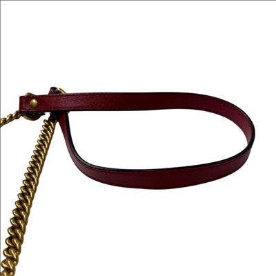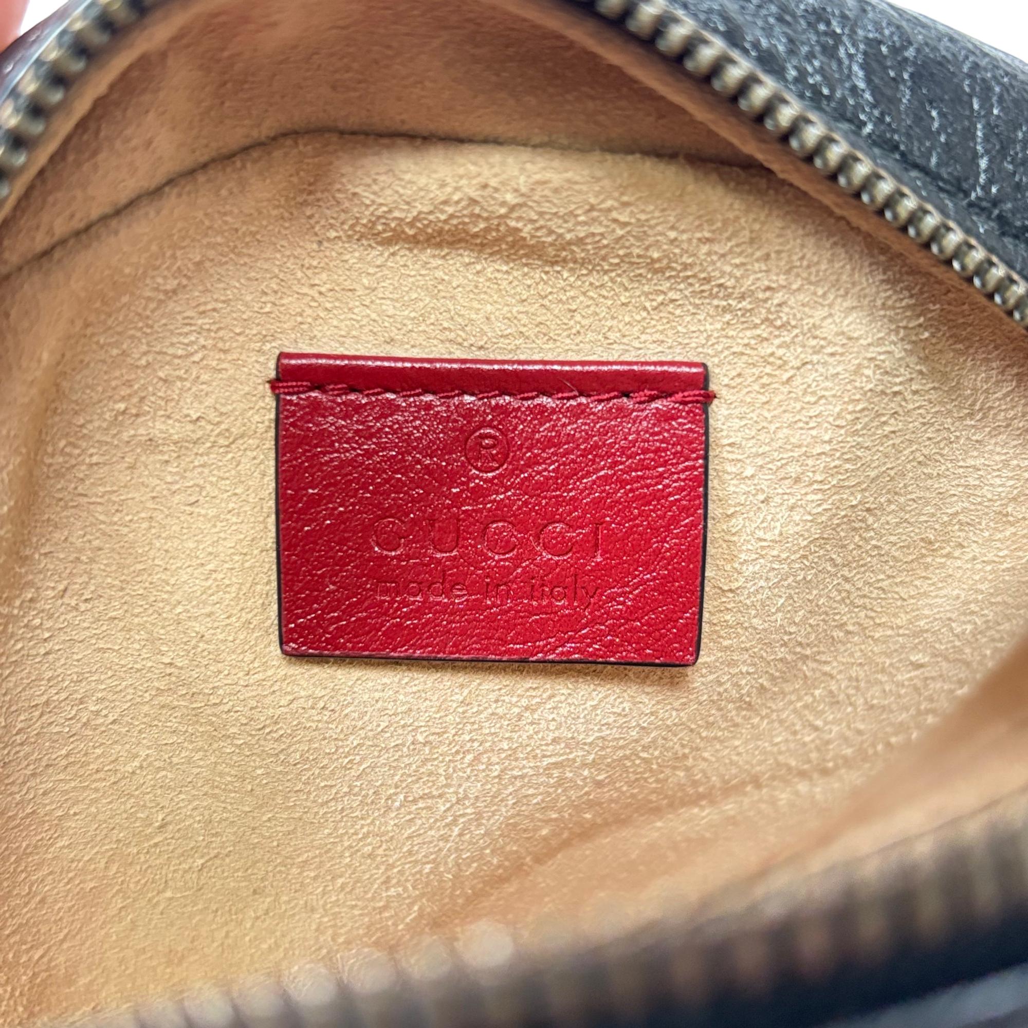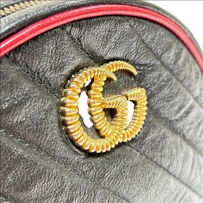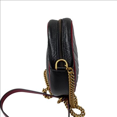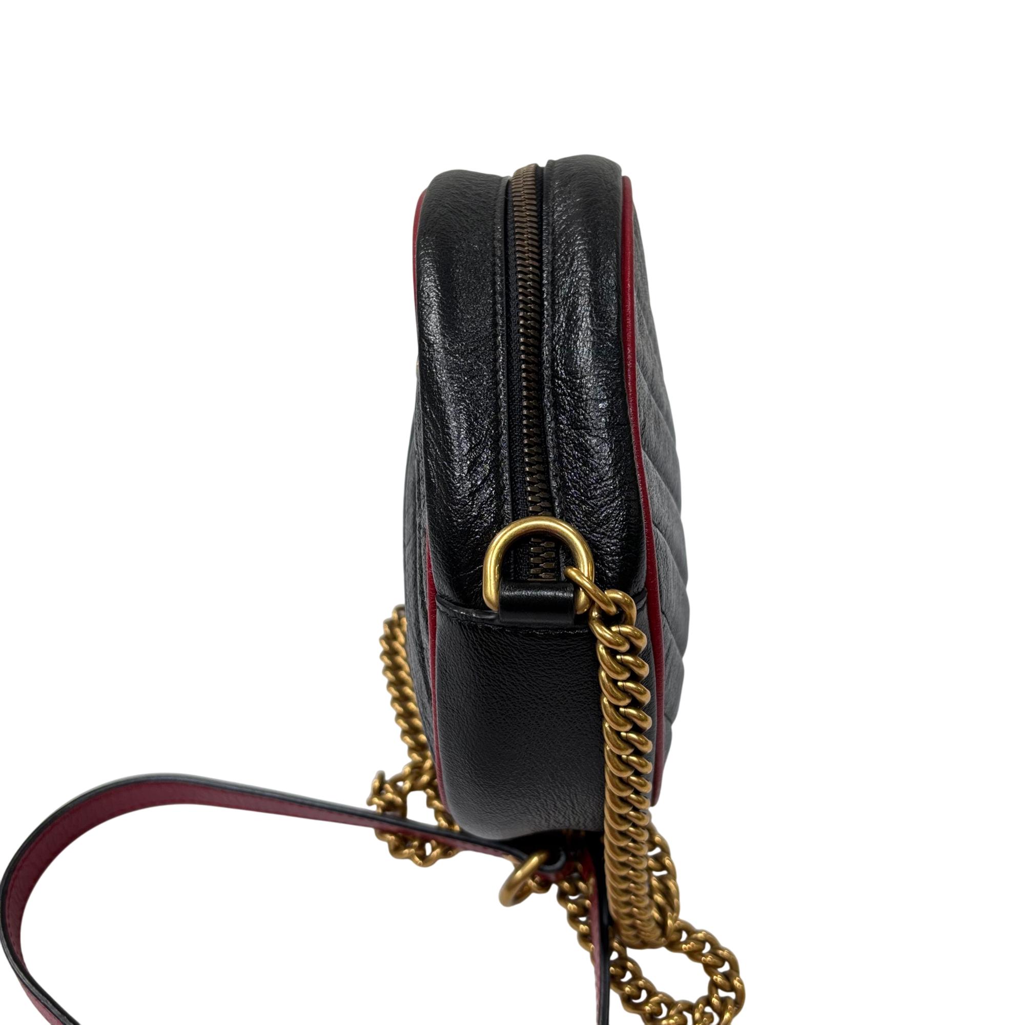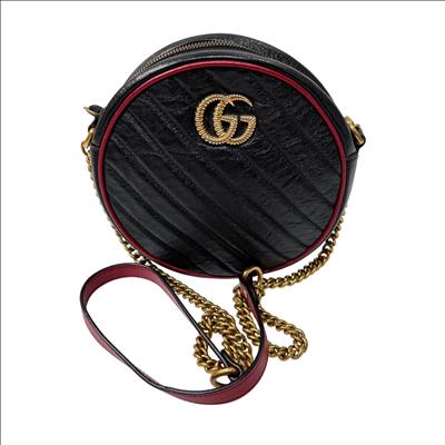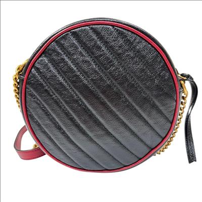 Gucci GG Marmont Mini Round Leather Crossbody Bag, Model 550154, Black/Red Quilted Leather features a distinctive round silhouette crafted from quilted black and red leather accented with a striking gold chain strap. This mini bag showcases elegant craftsmanship with its nuanced textures and iconic design elements, making it a luxurious and fashionable accessory for everyday wear.