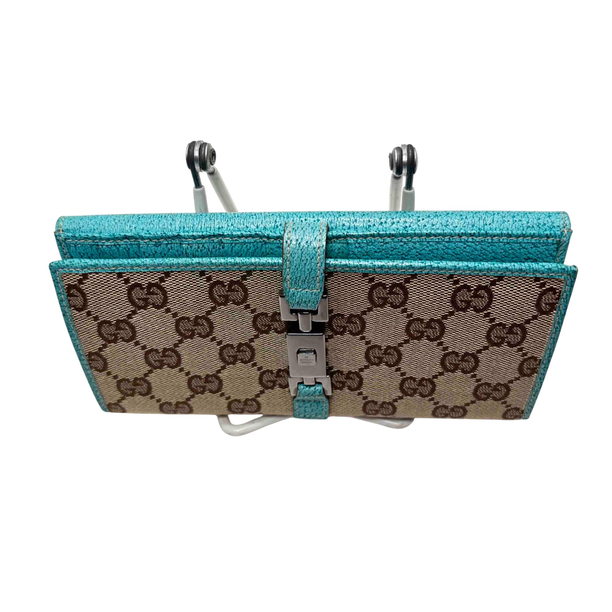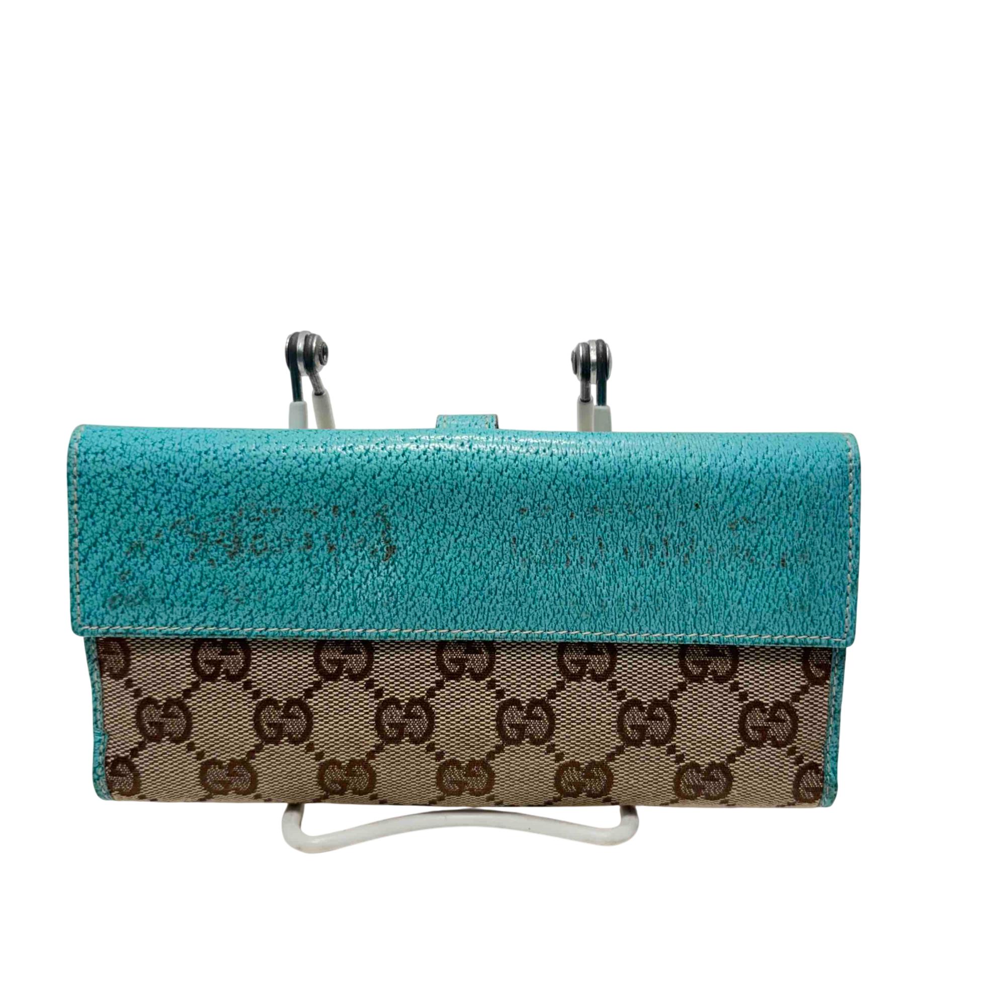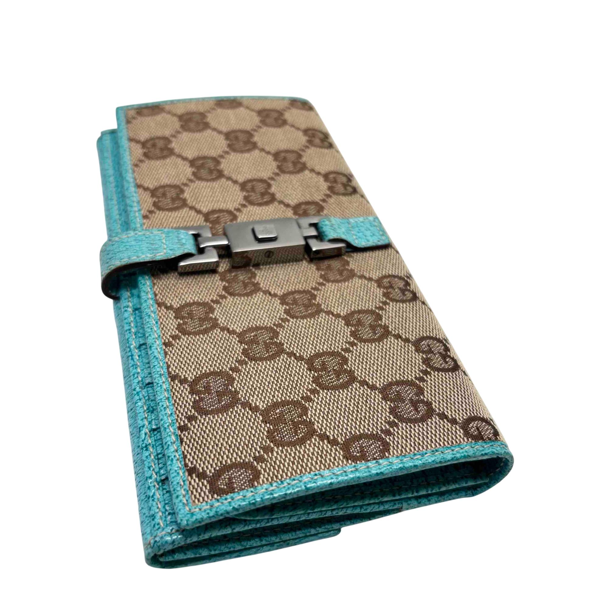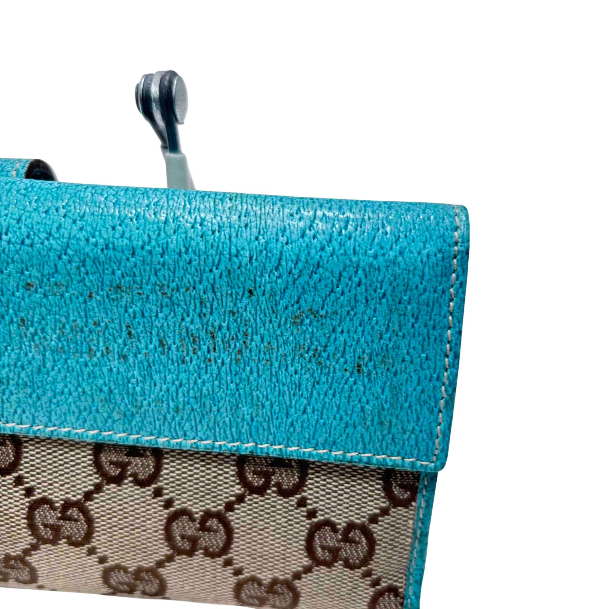 Elevate your style with the exquisite Gucci GG Monogram Canvas Blue Wallet. Featuring a luxurious blend of blue and brown tones with a turquoise trim, this wallet exudes sophistication and charm. Complete with a secure clasp, its the perfect accessory for effortlessly organizing your essentials while making a bold fashion statement.