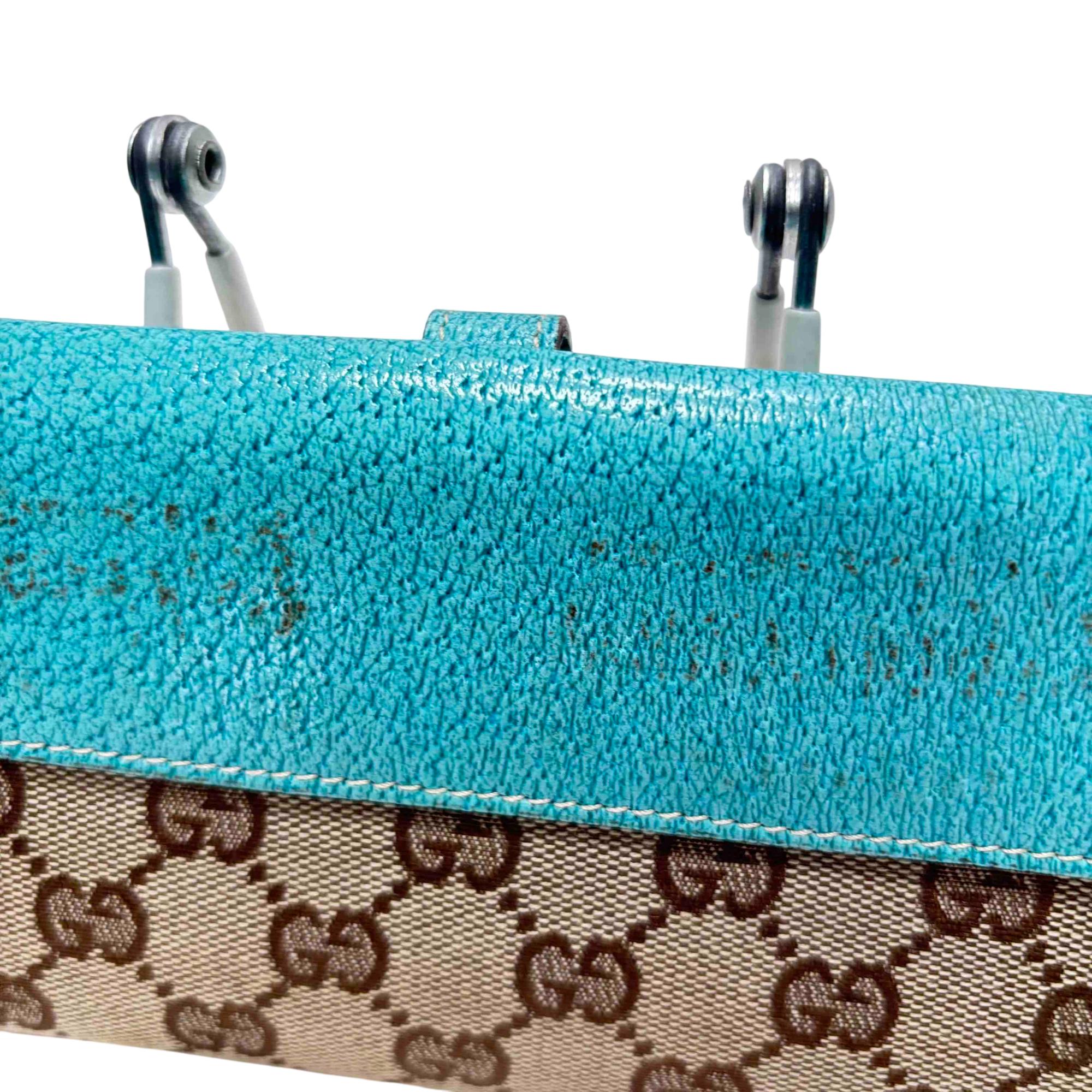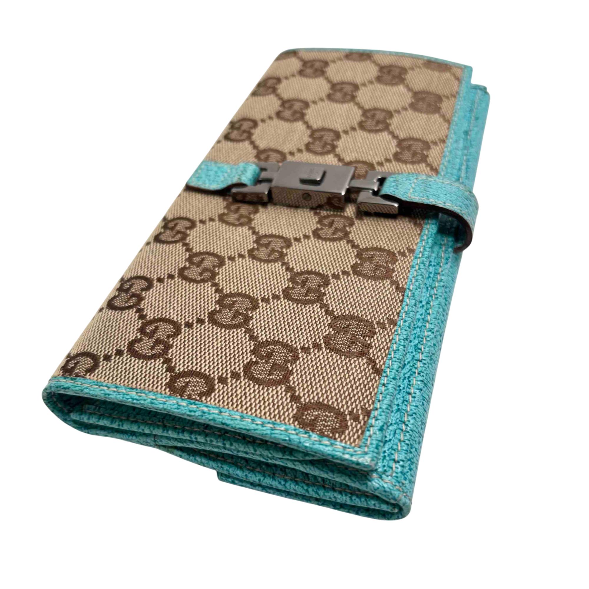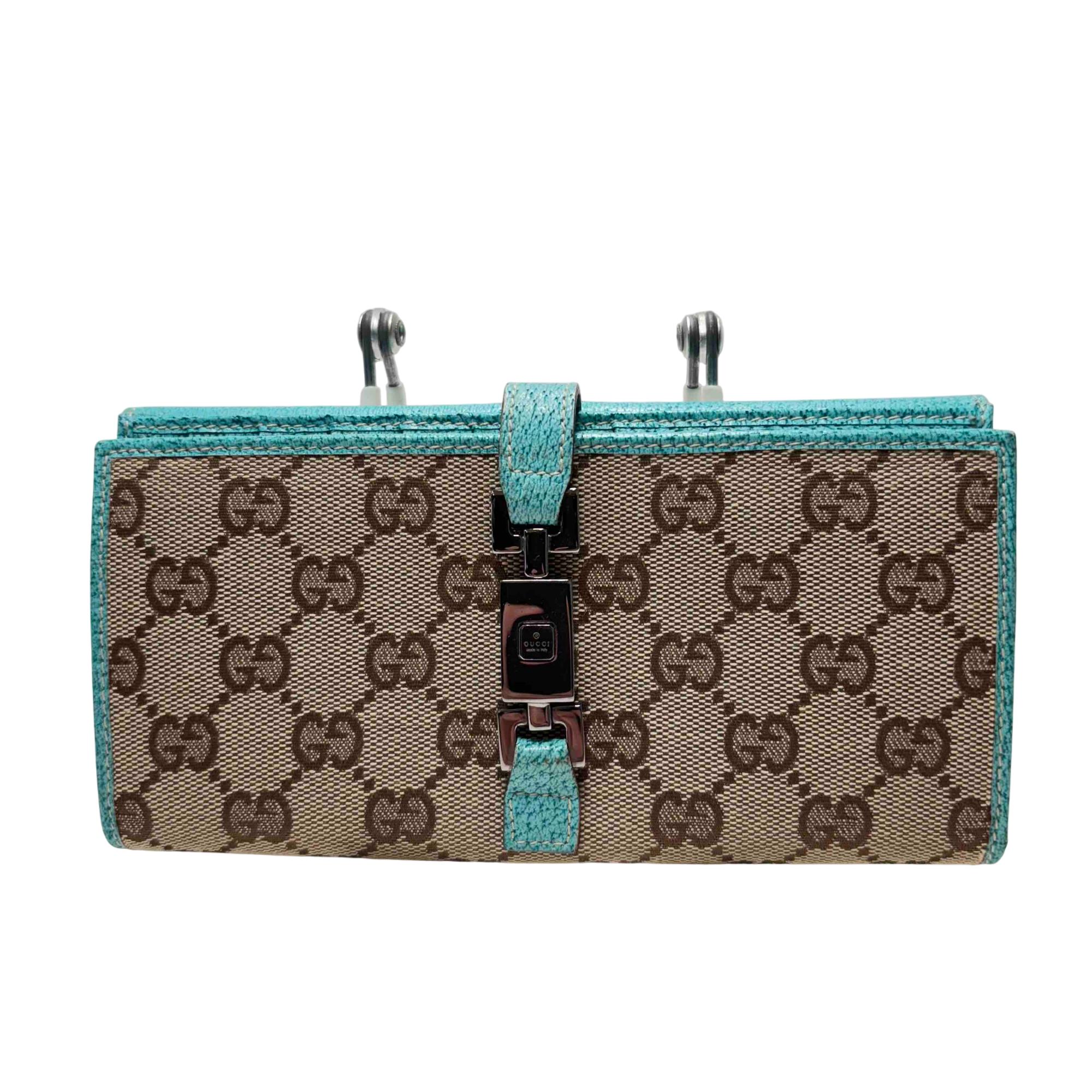 Elevate your style with the exquisite Gucci GG Monogram Canvas Blue Wallet. Featuring a luxurious blend of blue and brown tones with a turquoise trim, this wallet exudes sophistication and charm. Complete with a secure clasp, its the perfect accessory for effortlessly organizing your essentials while making a bold fashion statement.