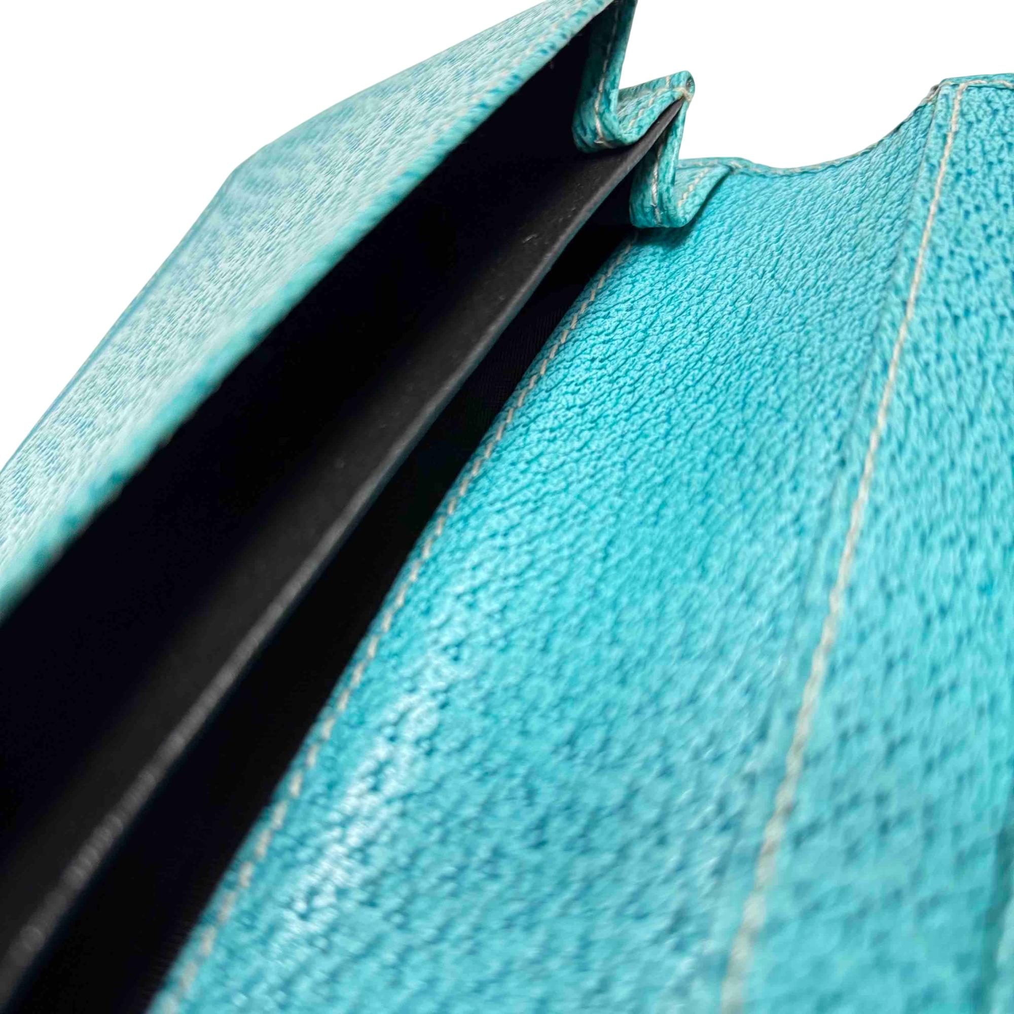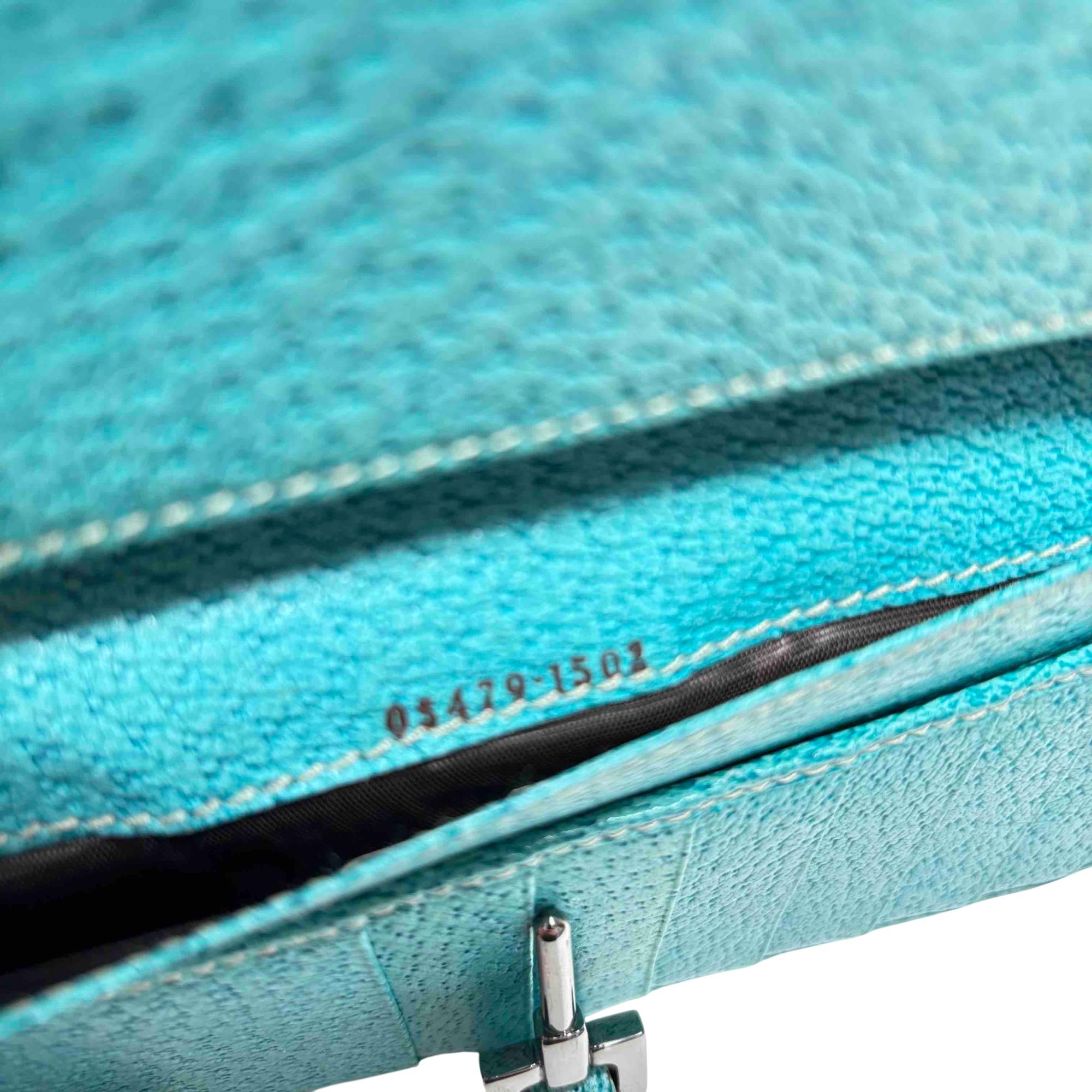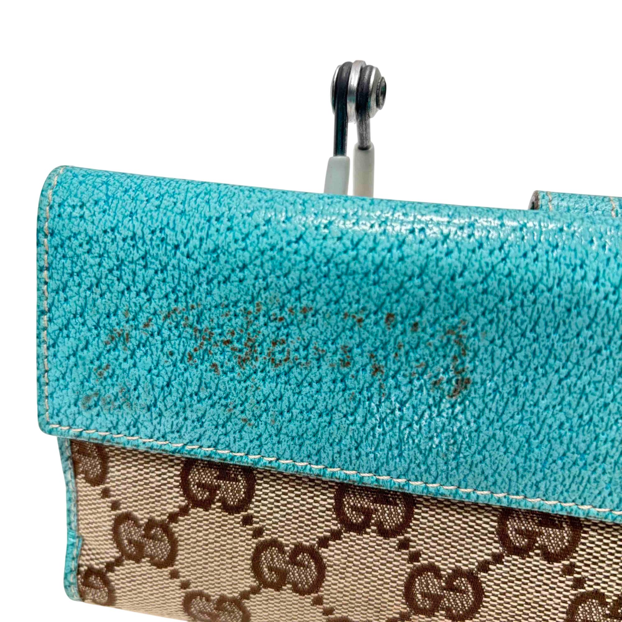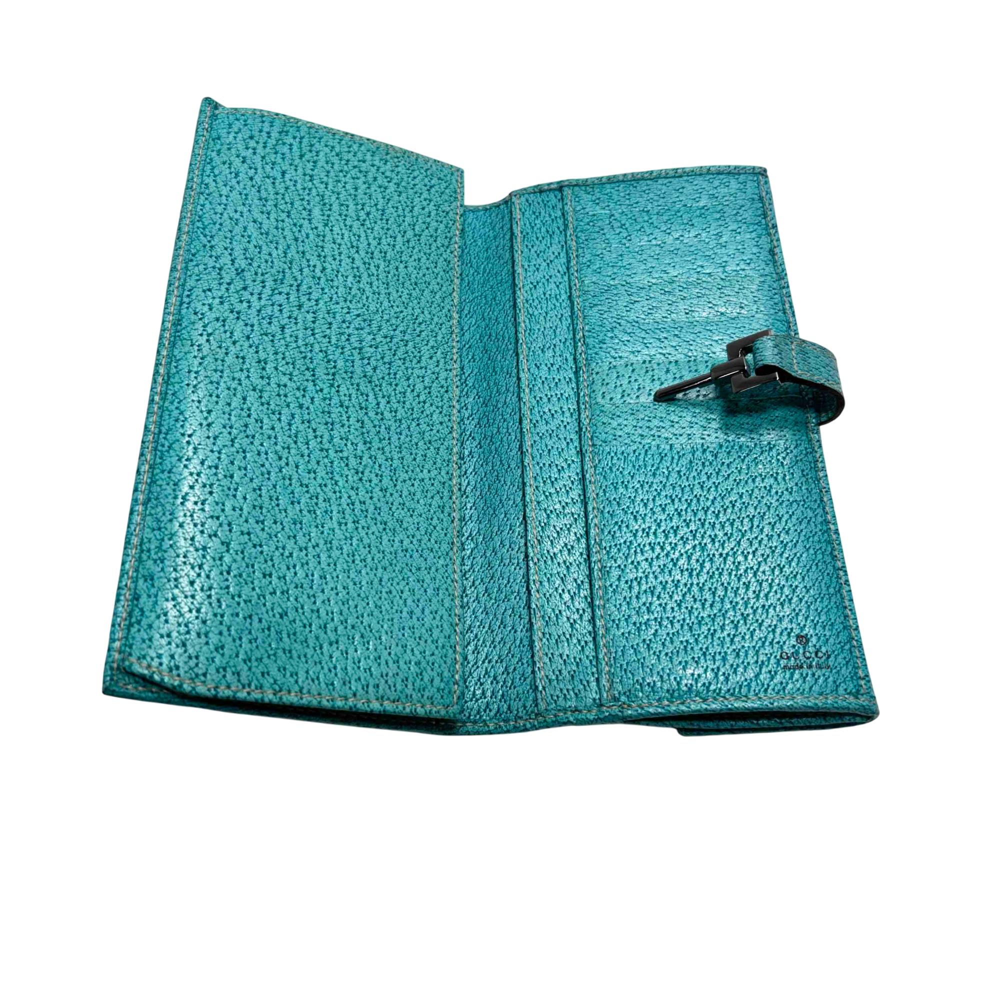 Elevate your style with the exquisite Gucci GG Monogram Canvas Blue Wallet. Featuring a luxurious blend of blue and brown tones with a turquoise trim, this wallet exudes sophistication and charm. Complete with a secure clasp, its the perfect accessory for effortlessly organizing your essentials while making a bold fashion statement.