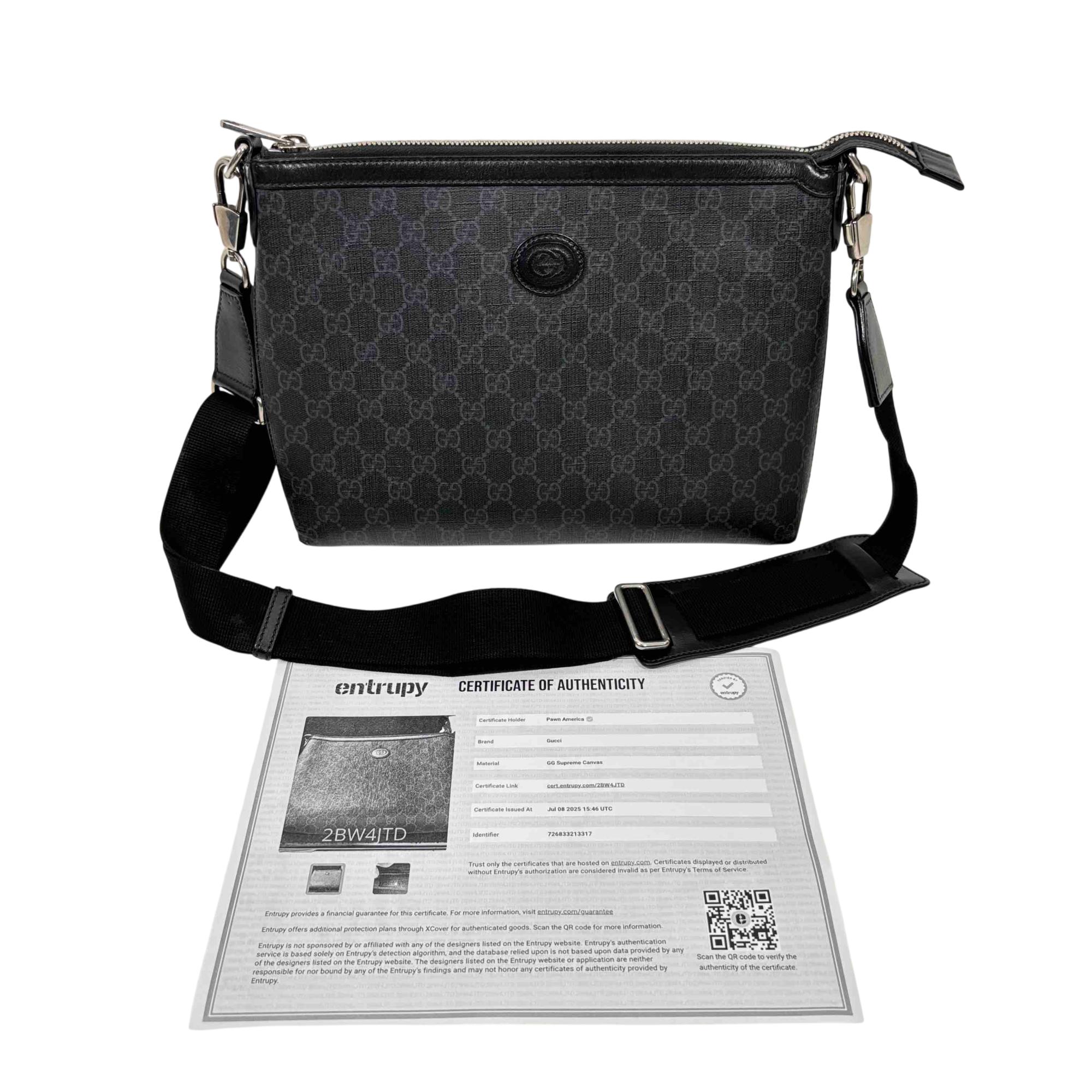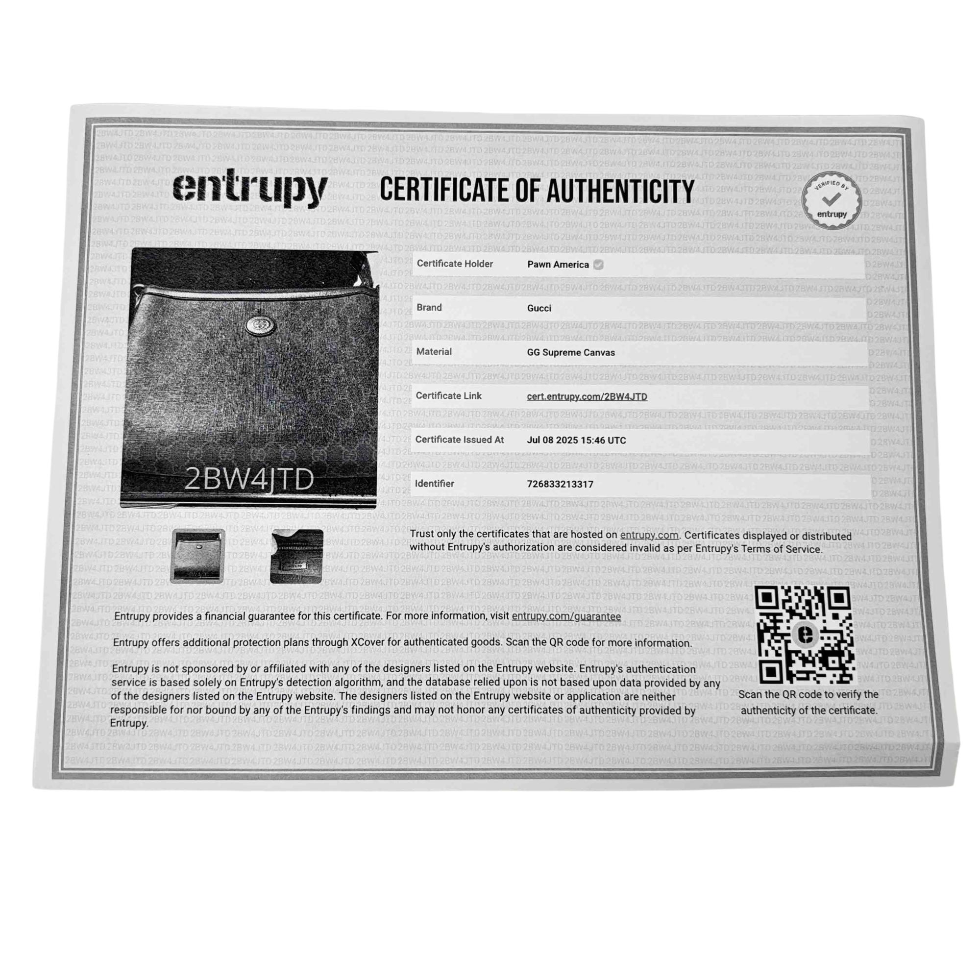 Elevate your collection with this authentic Gucci GG Supreme Canvas handbag, expertly crafted and certified genuine by Entrupy with Certificate ID 726833213317. The classic GG Supreme Canvas material offers durability and timeless style, while the included certificate of authenticity ensures you’re investing in a verified luxury piece. Perfect for fashion-forward individuals who value both sophistication and integrity in their accessories.