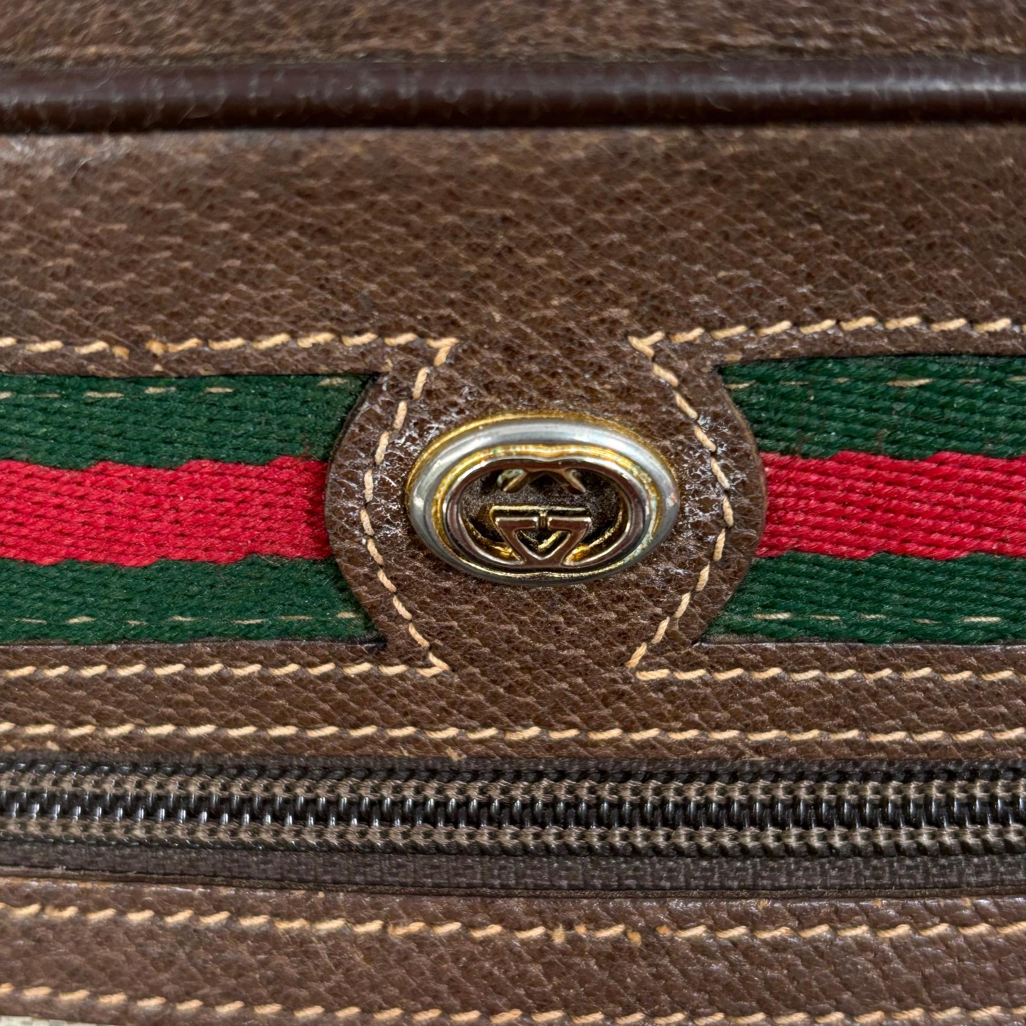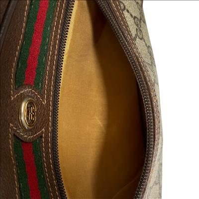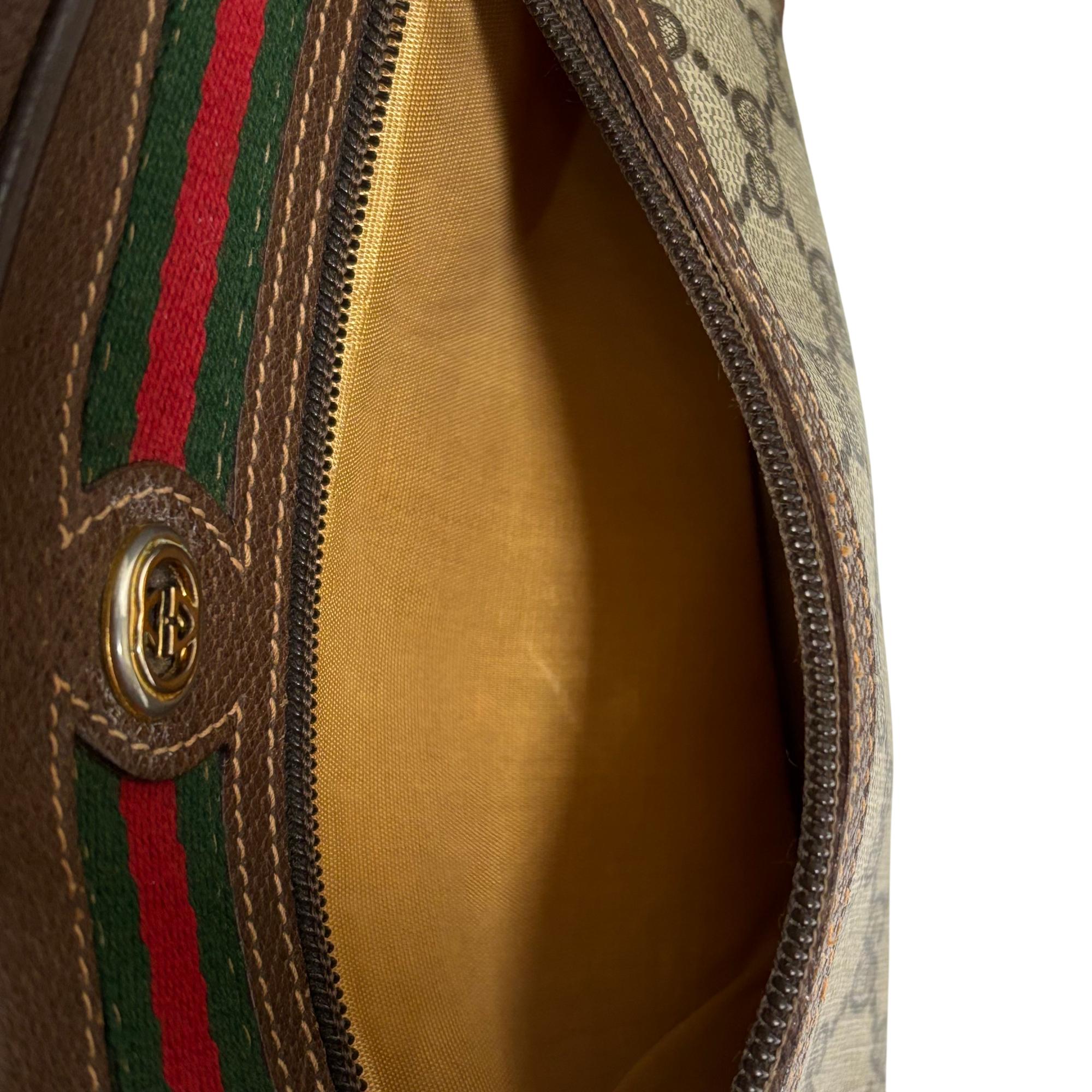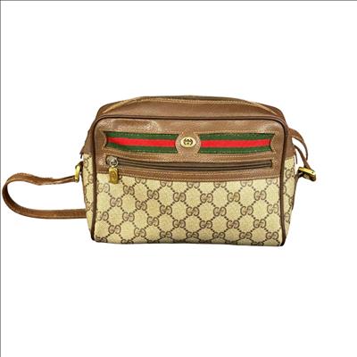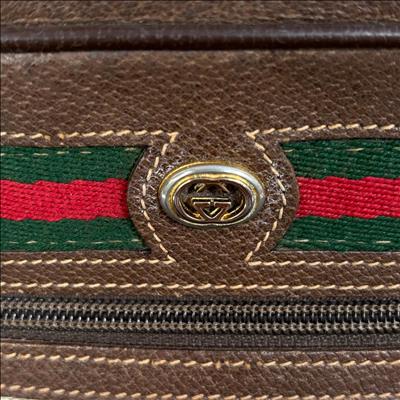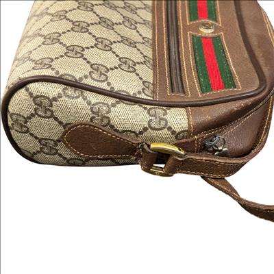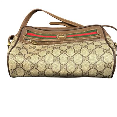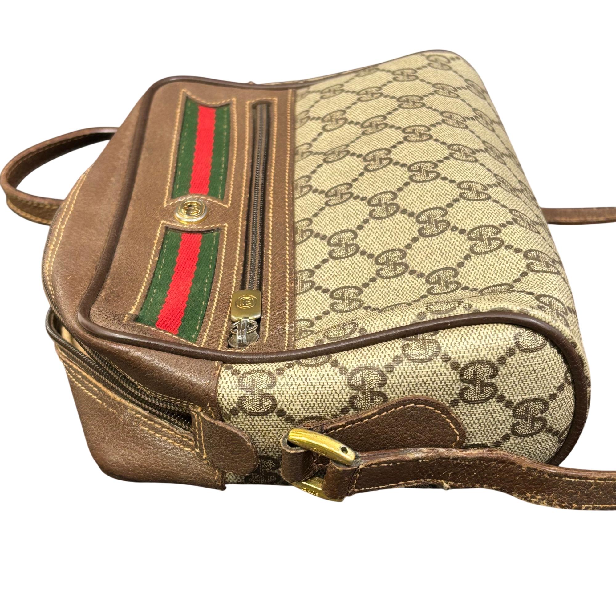 Gucci GG Supreme Web Sherry Line Shoulder Bag 5608087 Vintage showcases a signature brown and green canvas with a distinctive red and green stripe detail. This luxury shoulder bag features durable PVC material accented with leather trims, a gold-tone buckle with keyhole design, and elegant hardware that highlight its timeless style. Its compact yet functional silhouette makes it a fashionable accessory perfect for everyday use.