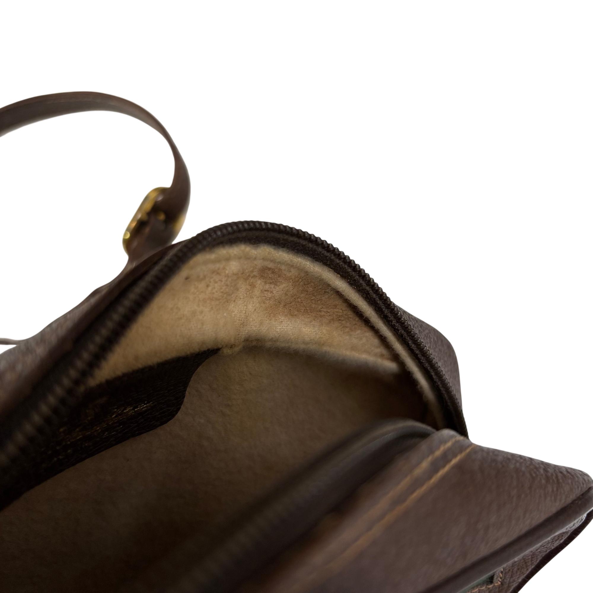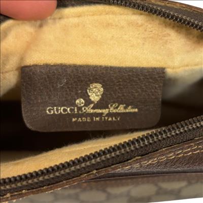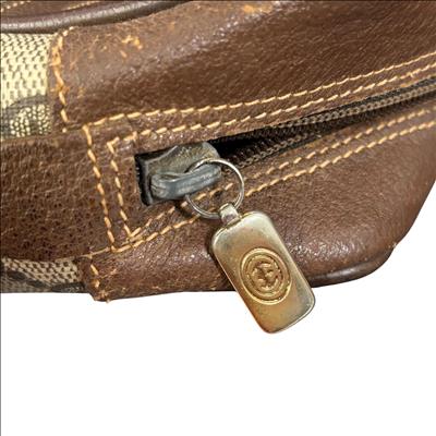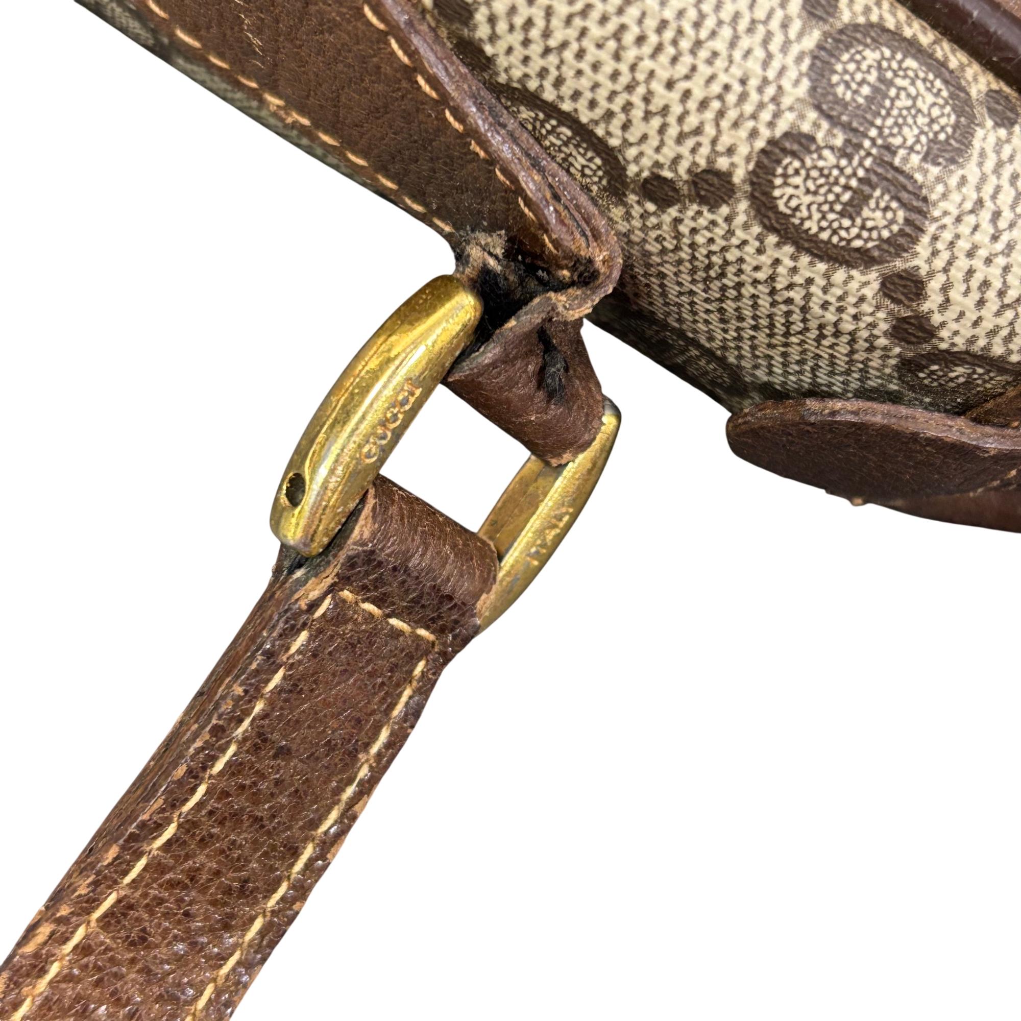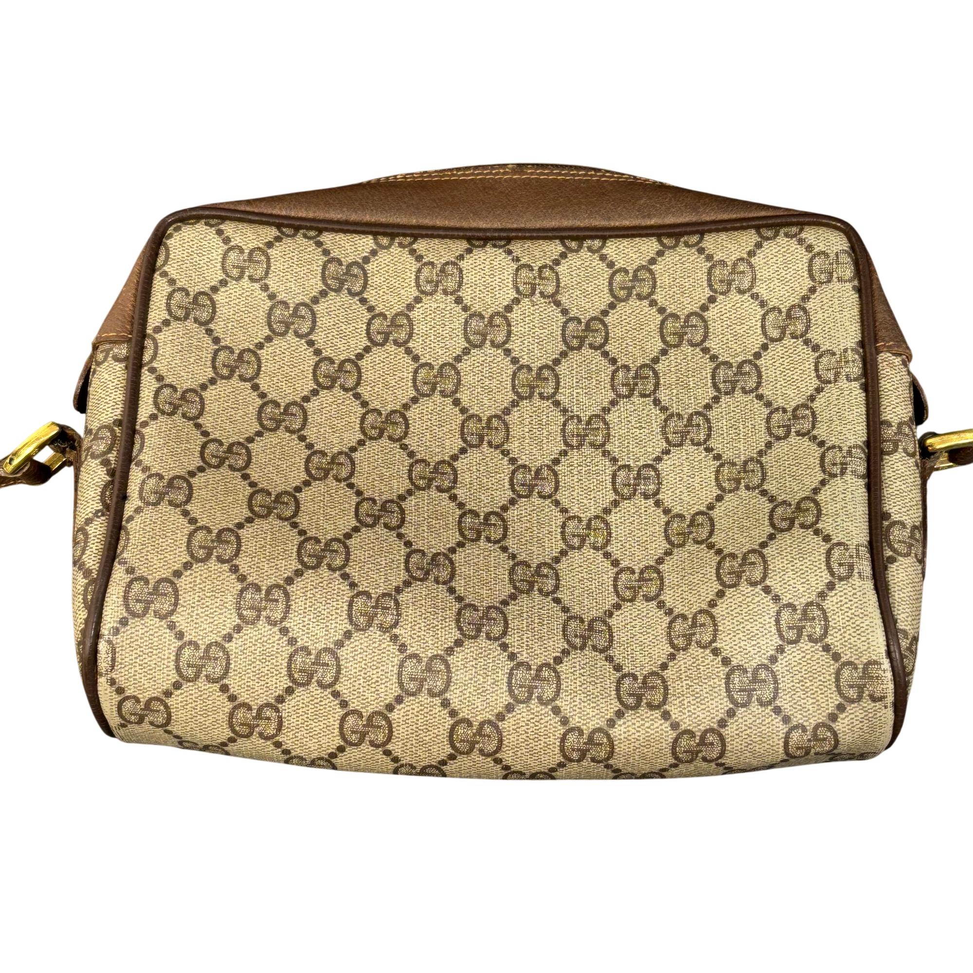 Gucci GG Supreme Web Sherry Line Shoulder Bag 5608087 Vintage showcases a signature brown and green canvas with a distinctive red and green stripe detail. This luxury shoulder bag features durable PVC material accented with leather trims, a gold-tone buckle with keyhole design, and elegant hardware that highlight its timeless style. Its compact yet functional silhouette makes it a fashionable accessory perfect for everyday use.