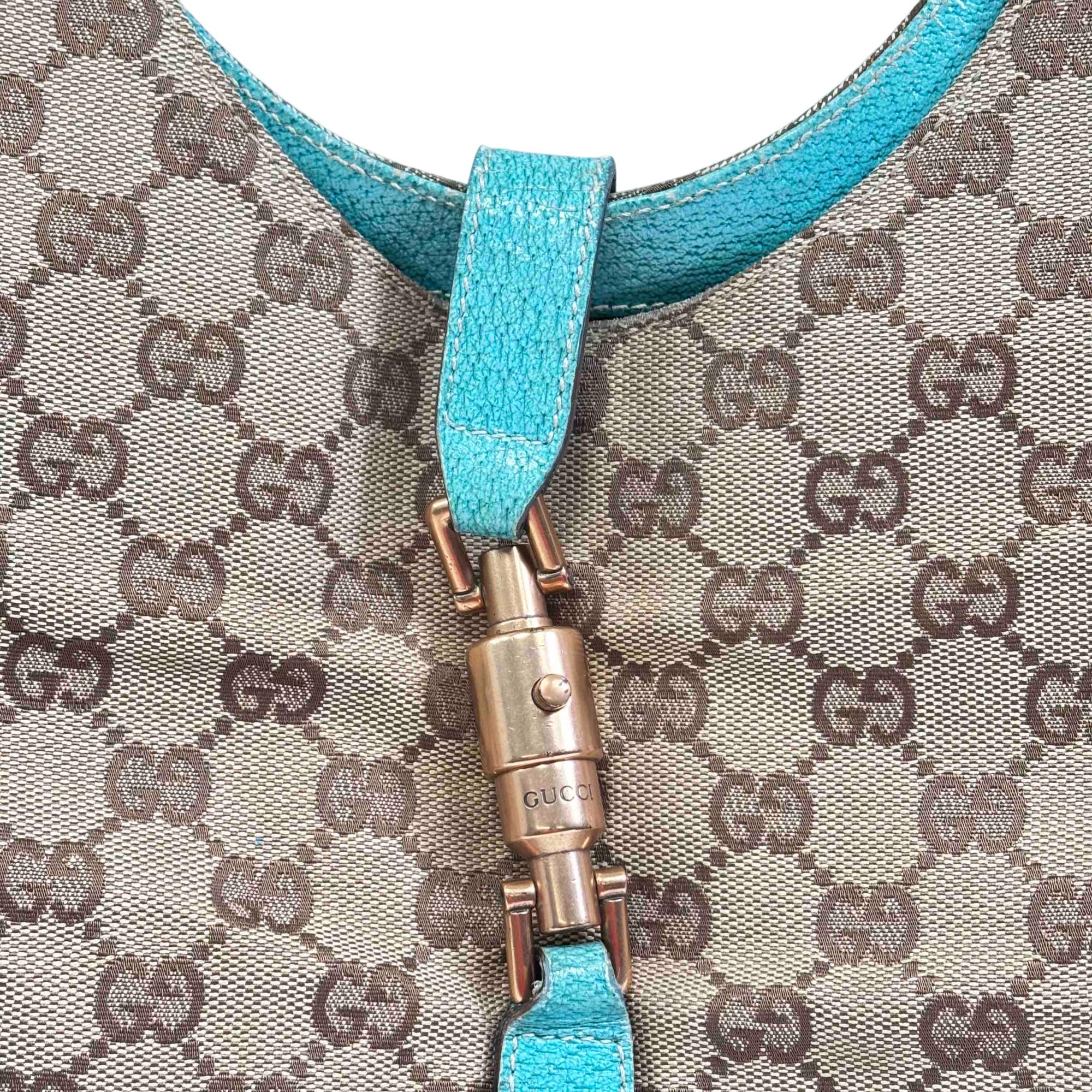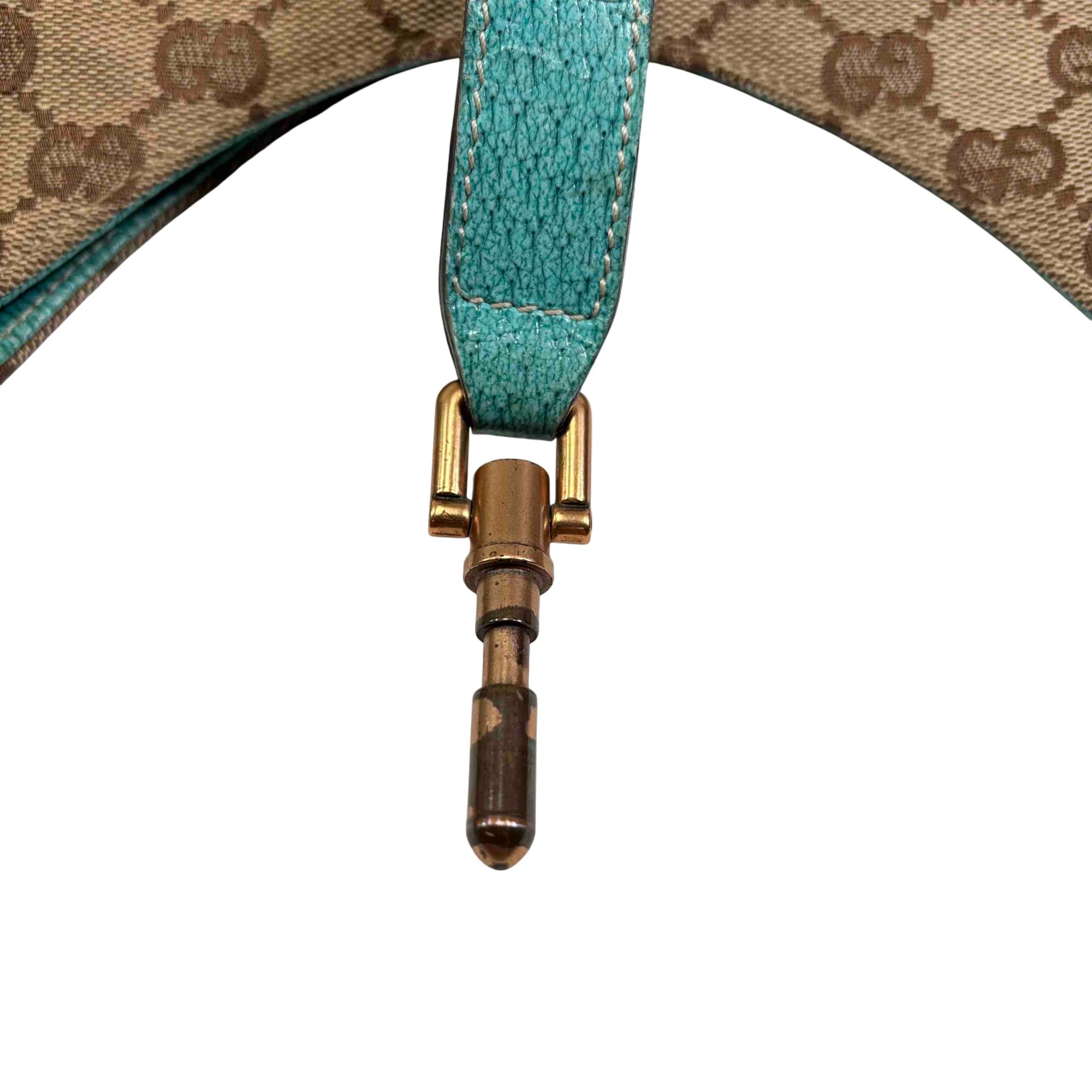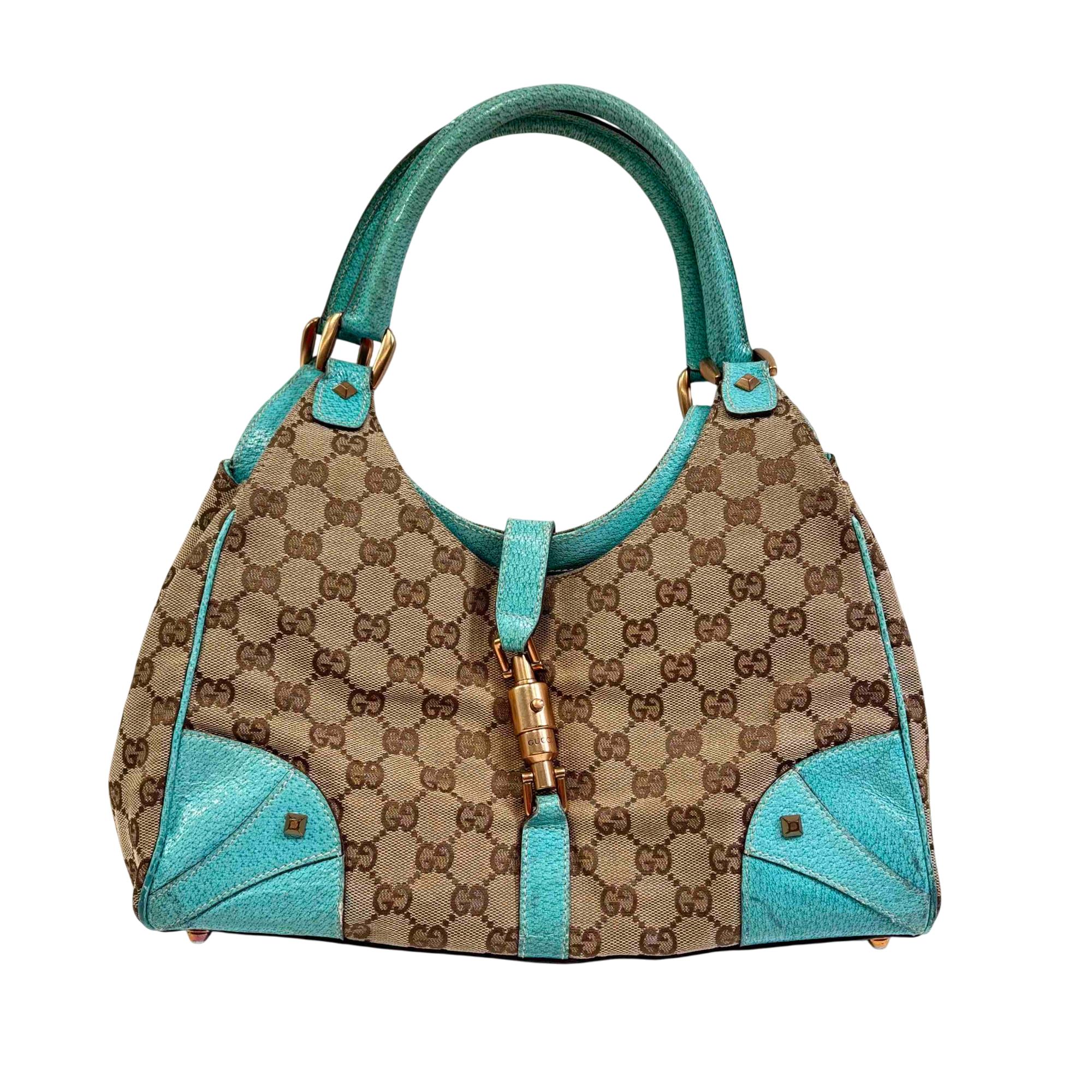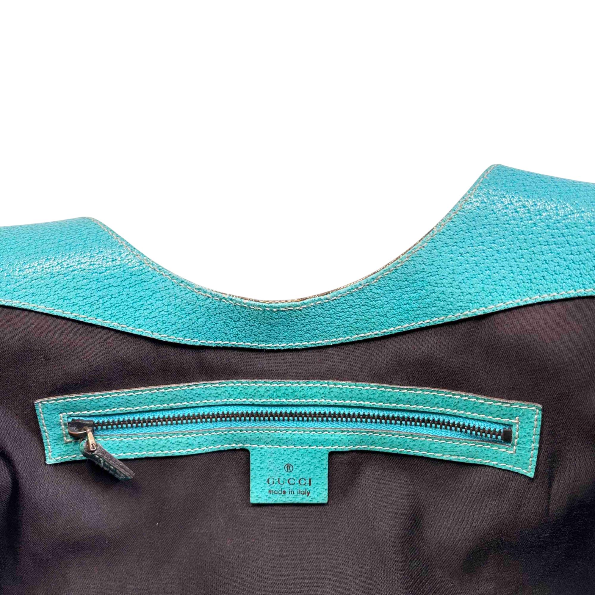 Introducing the Gucci Jackie Piston Lock Hobo Bag in a stunning teal color. This luxurious bag, crafted from a blend of canvas and leather, embodies elegance and sophistication with its classic design and exquisite detailing. A must-have accessory for any fashion enthusiast, this bag adds a bold pop of color to your wardrobe while offering ample space and style.