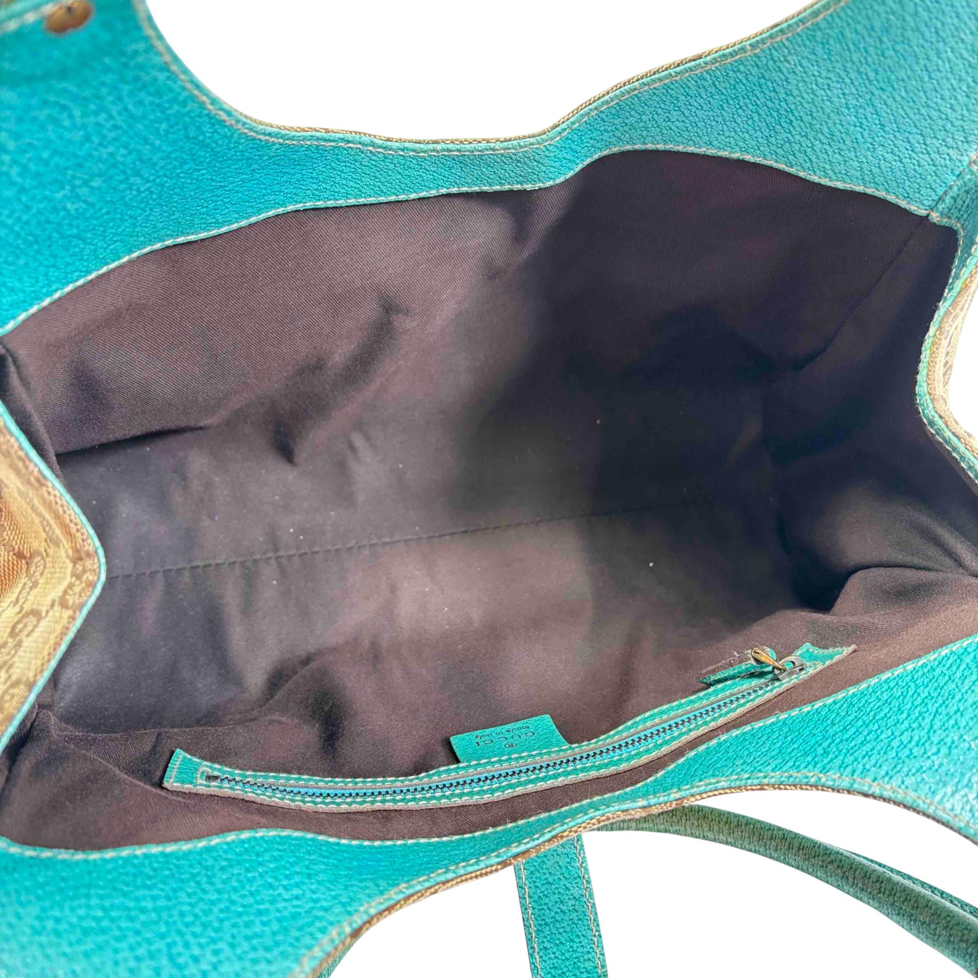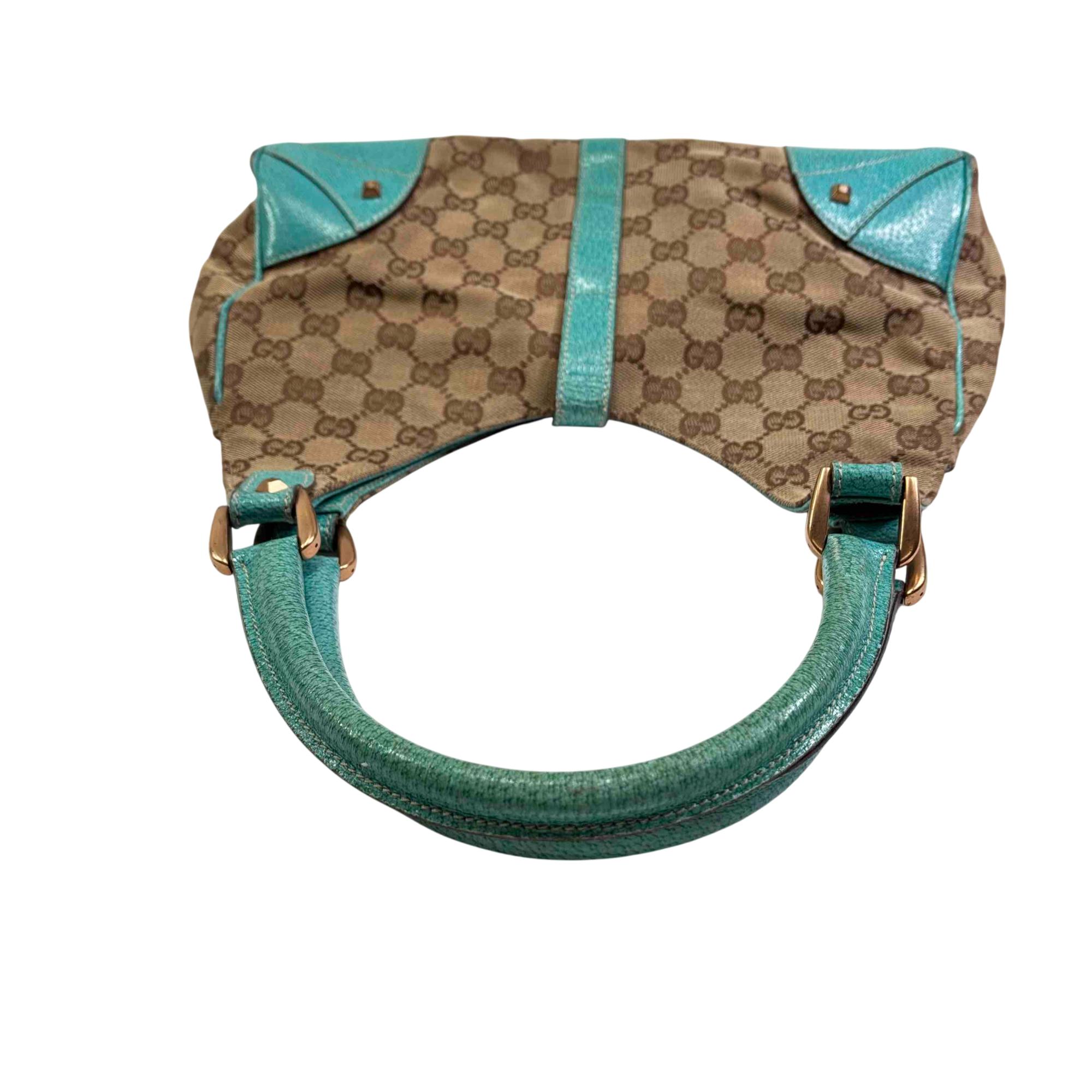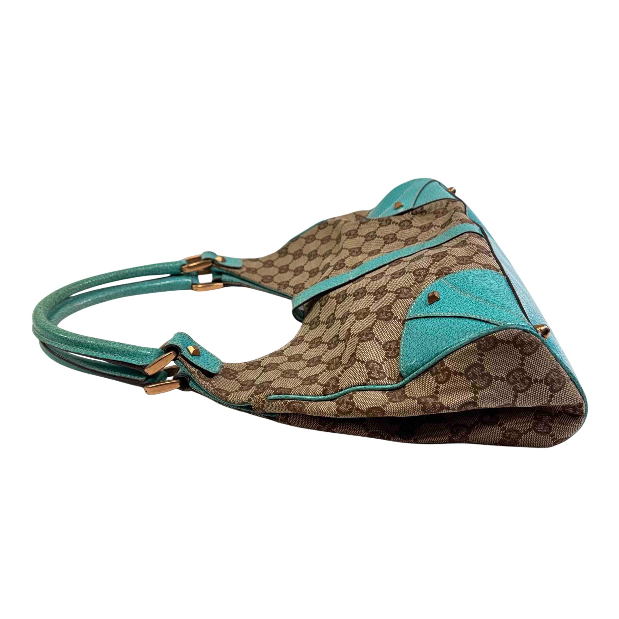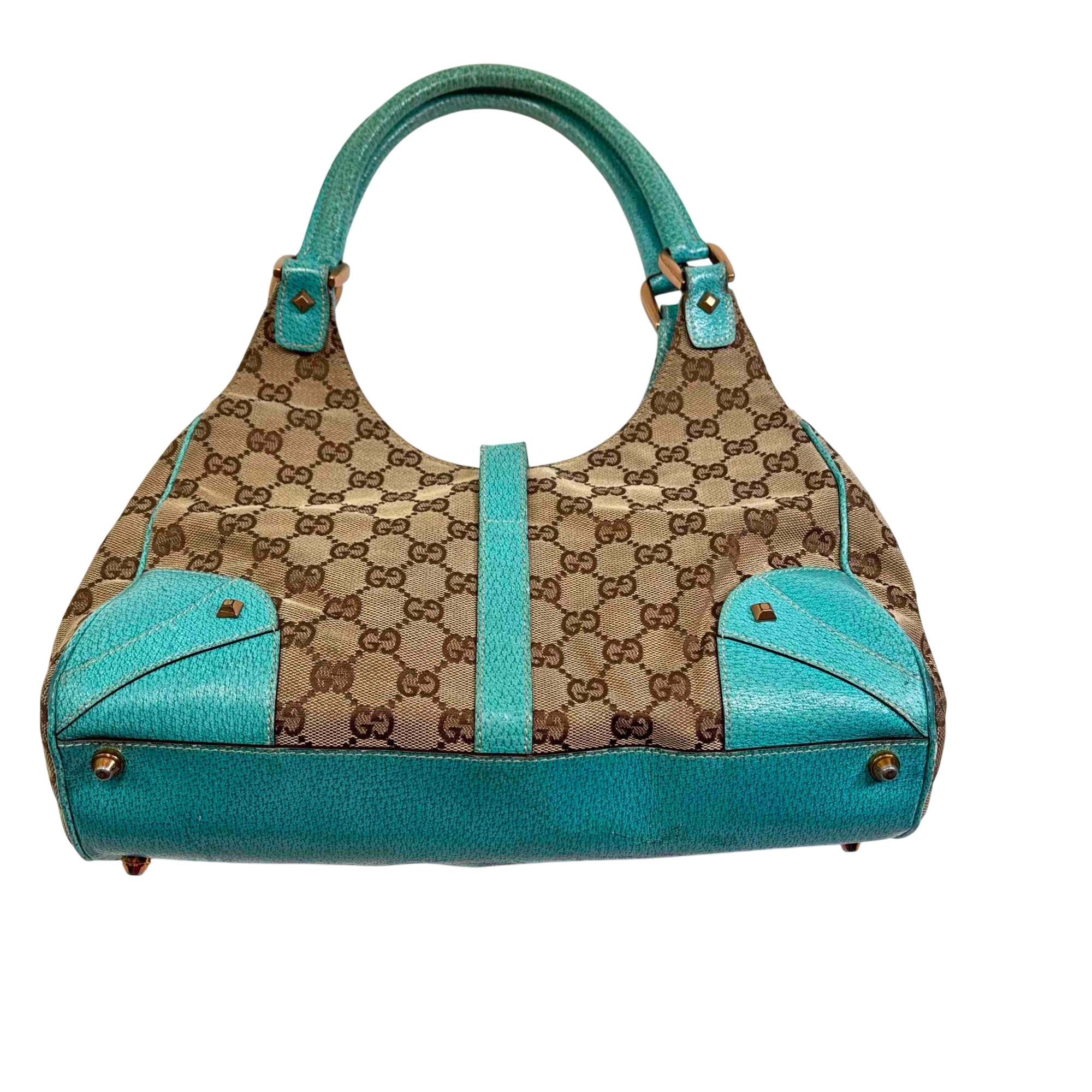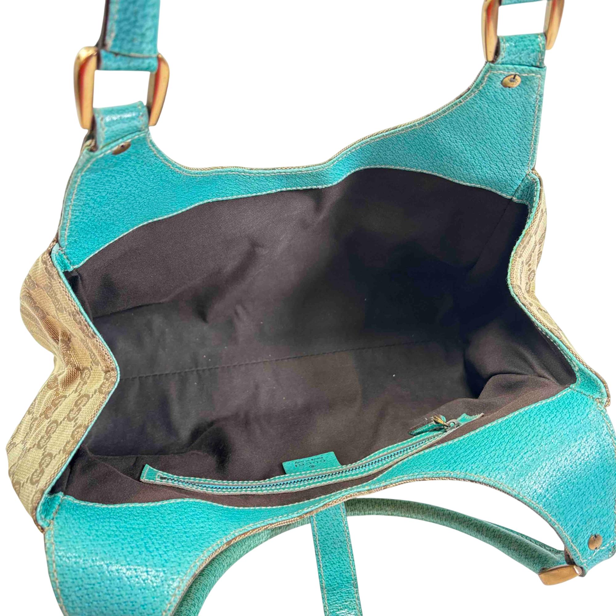 Introducing the Gucci Jackie Piston Lock Hobo Bag in a stunning teal color. This luxurious bag, crafted from a blend of canvas and leather, embodies elegance and sophistication with its classic design and exquisite detailing. A must-have accessory for any fashion enthusiast, this bag adds a bold pop of color to your wardrobe while offering ample space and style.