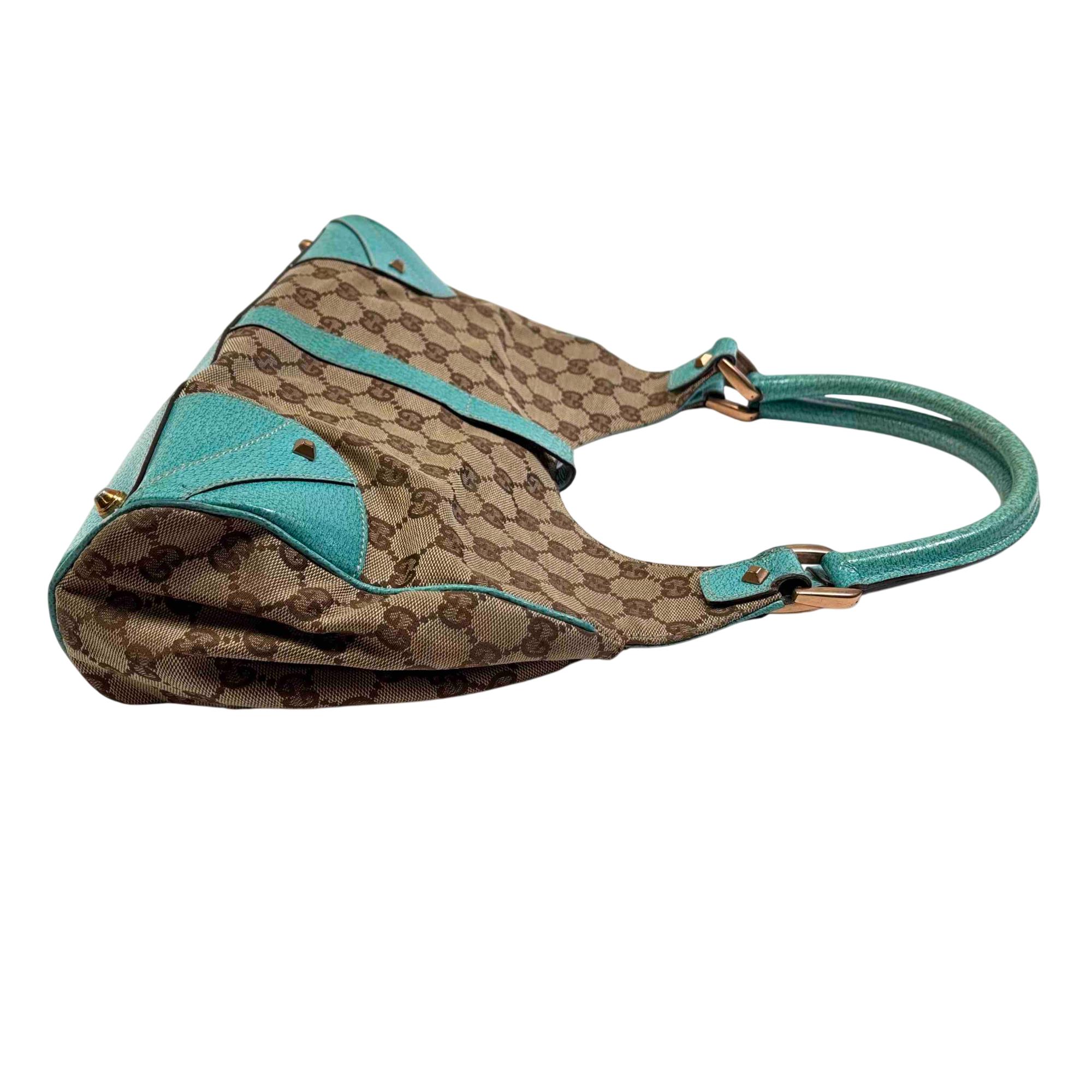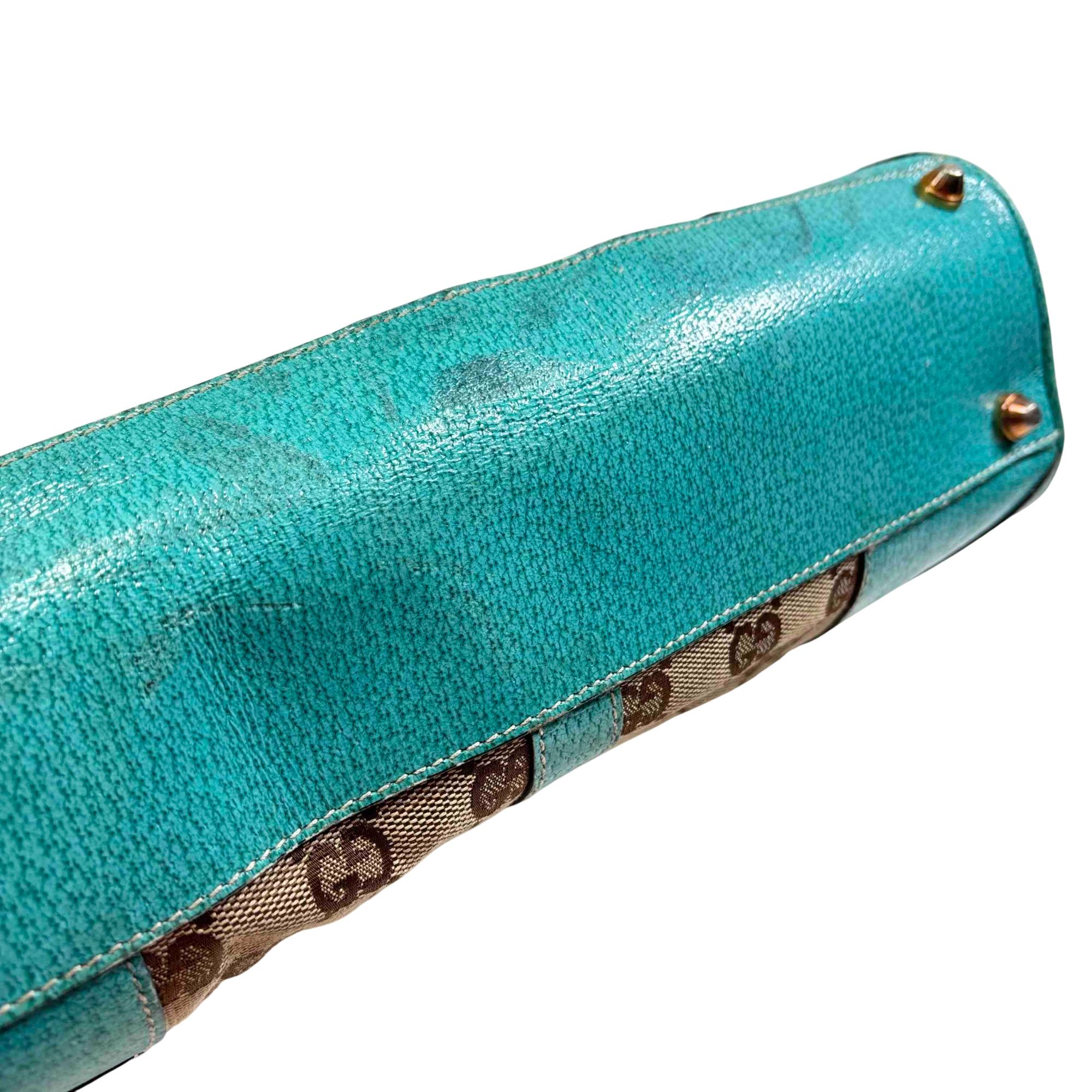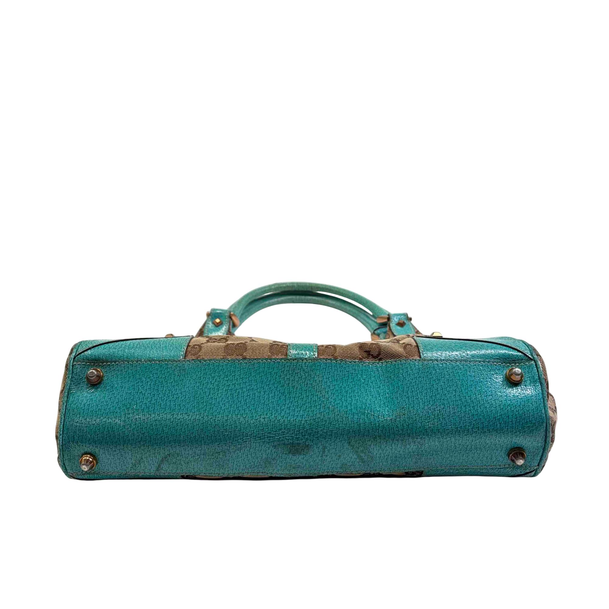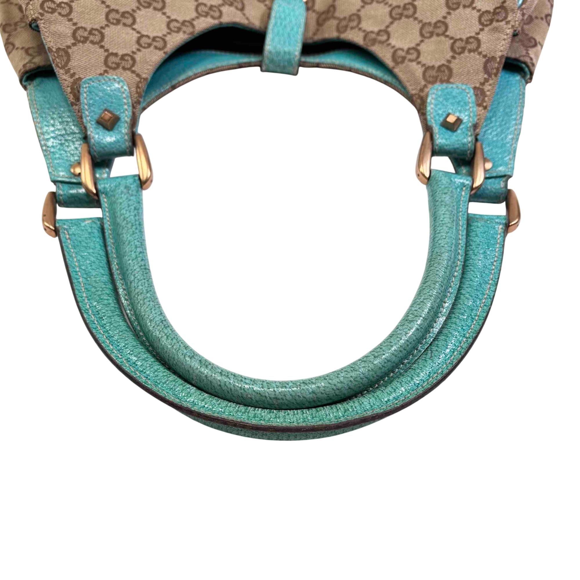 Introducing the Gucci Jackie Piston Lock Hobo Bag in a stunning teal color. This luxurious bag, crafted from a blend of canvas and leather, embodies elegance and sophistication with its classic design and exquisite detailing. A must-have accessory for any fashion enthusiast, this bag adds a bold pop of color to your wardrobe while offering ample space and style.