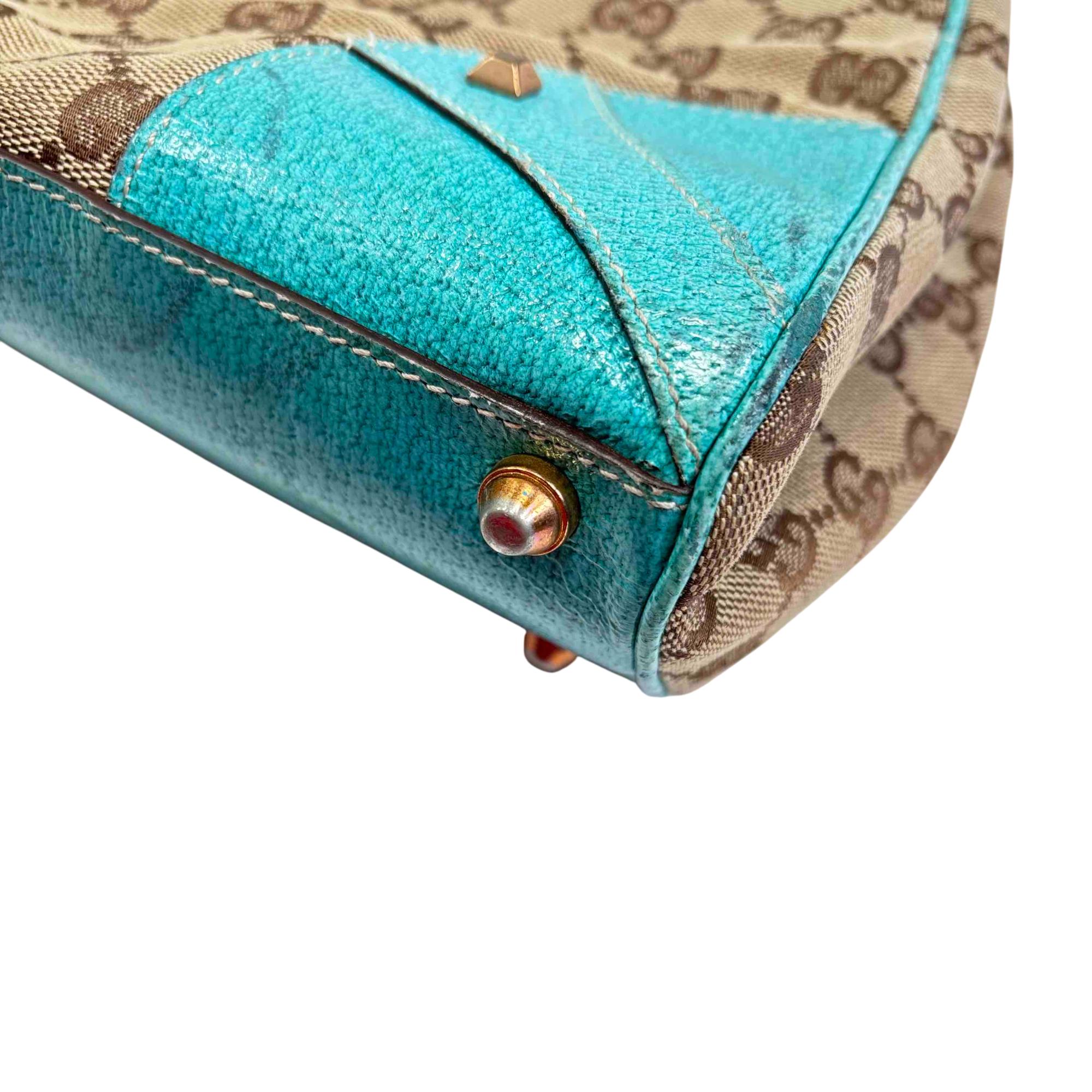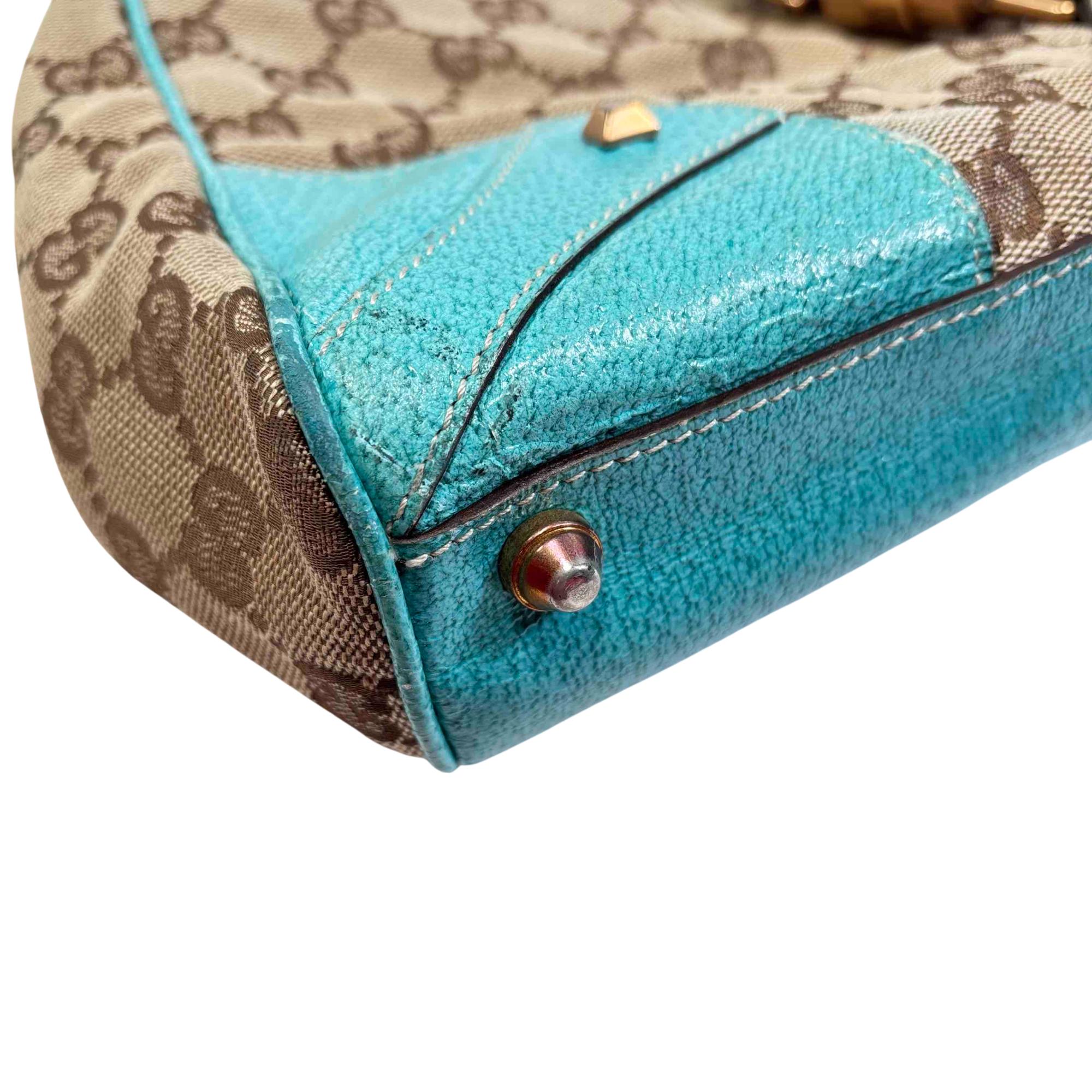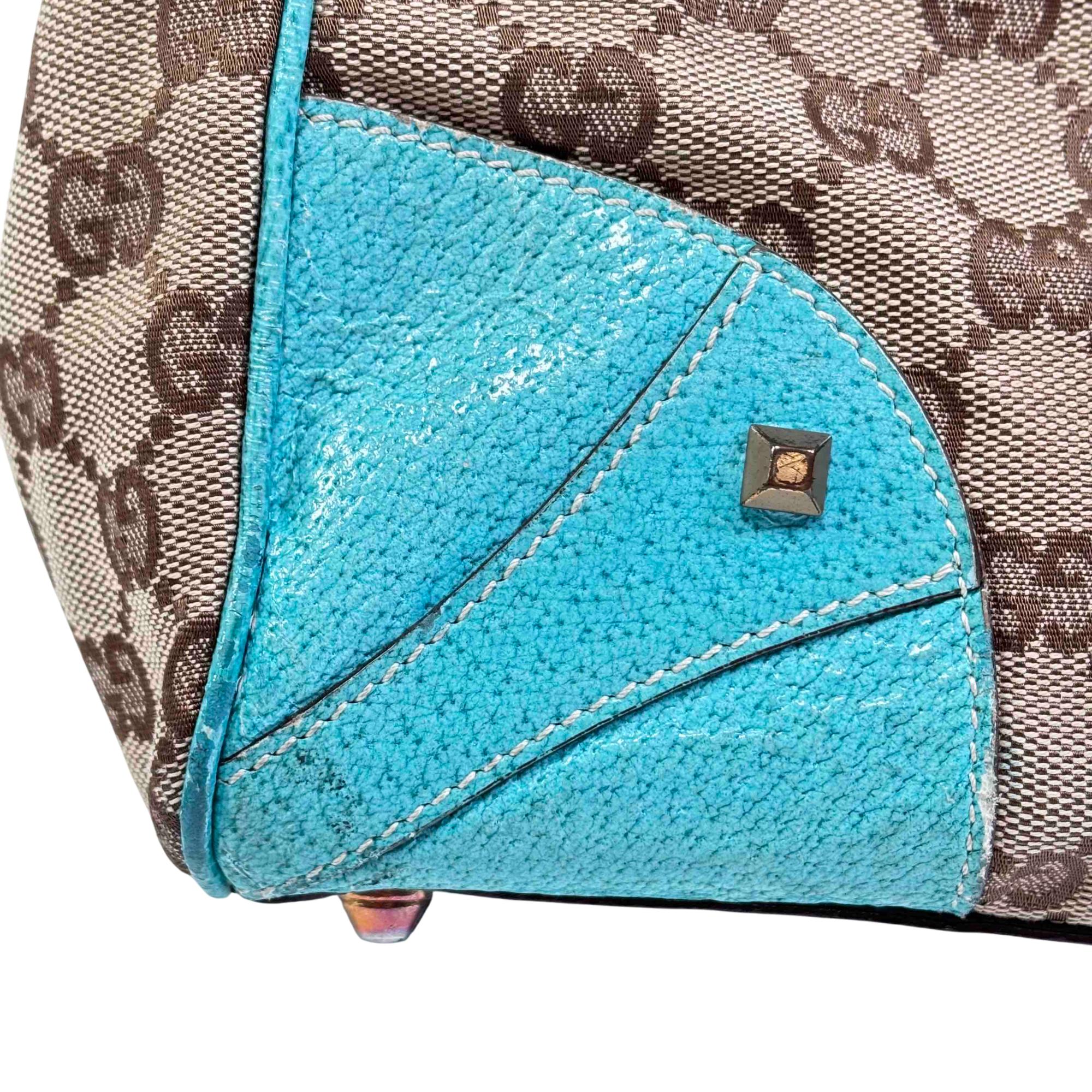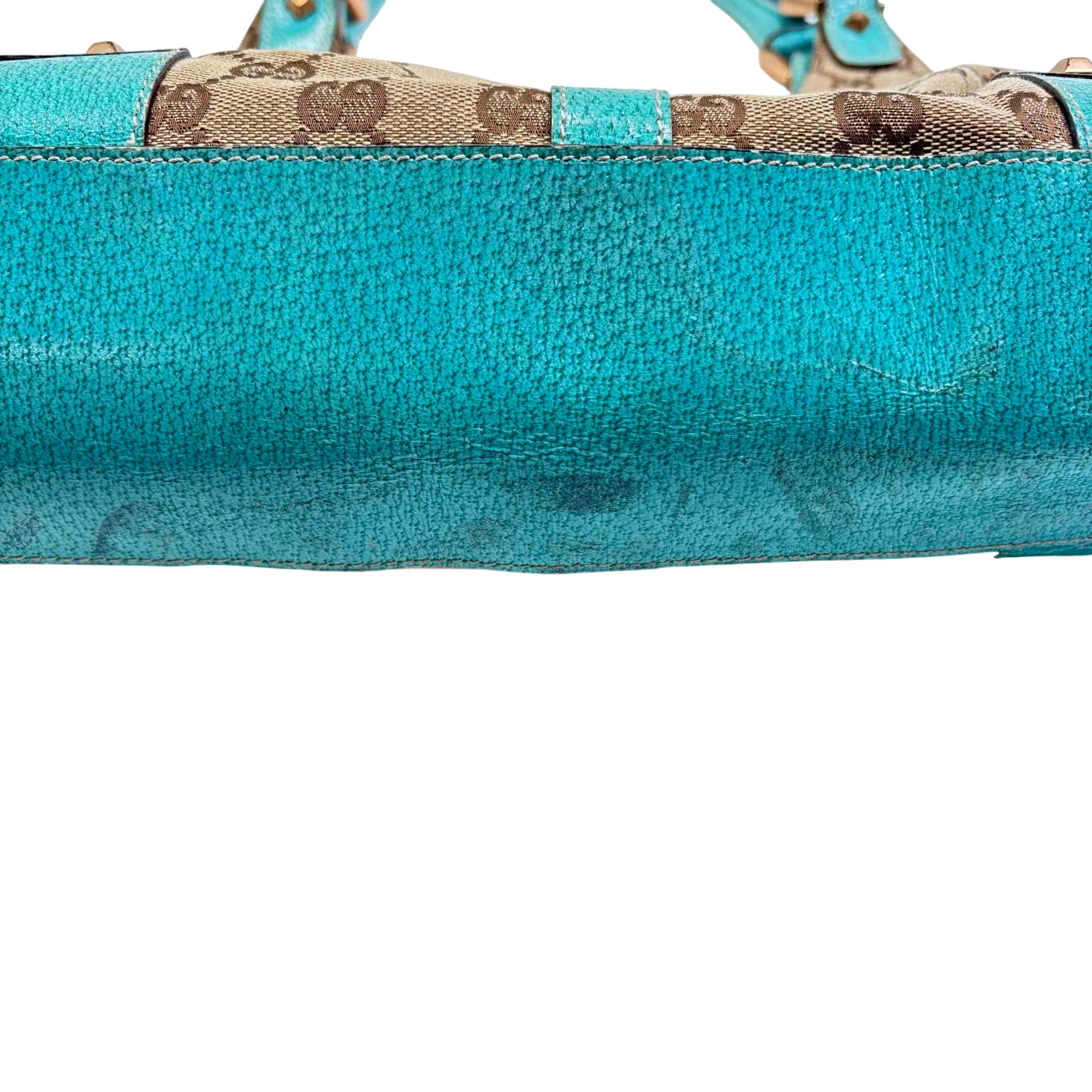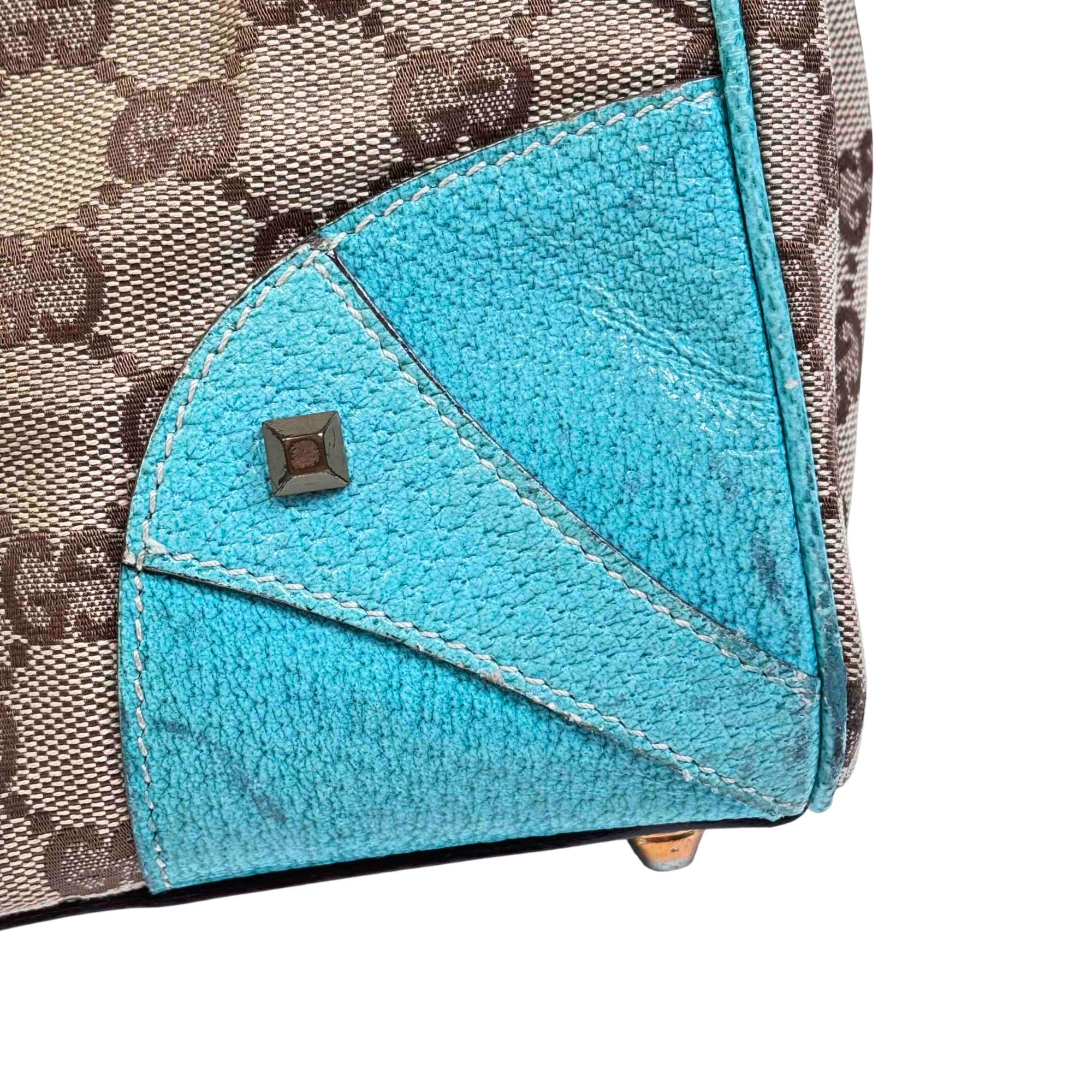 Introducing the Gucci Jackie Piston Lock Hobo Bag in a stunning teal color. This luxurious bag, crafted from a blend of canvas and leather, embodies elegance and sophistication with its classic design and exquisite detailing. A must-have accessory for any fashion enthusiast, this bag adds a bold pop of color to your wardrobe while offering ample space and style.