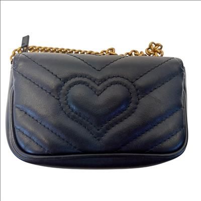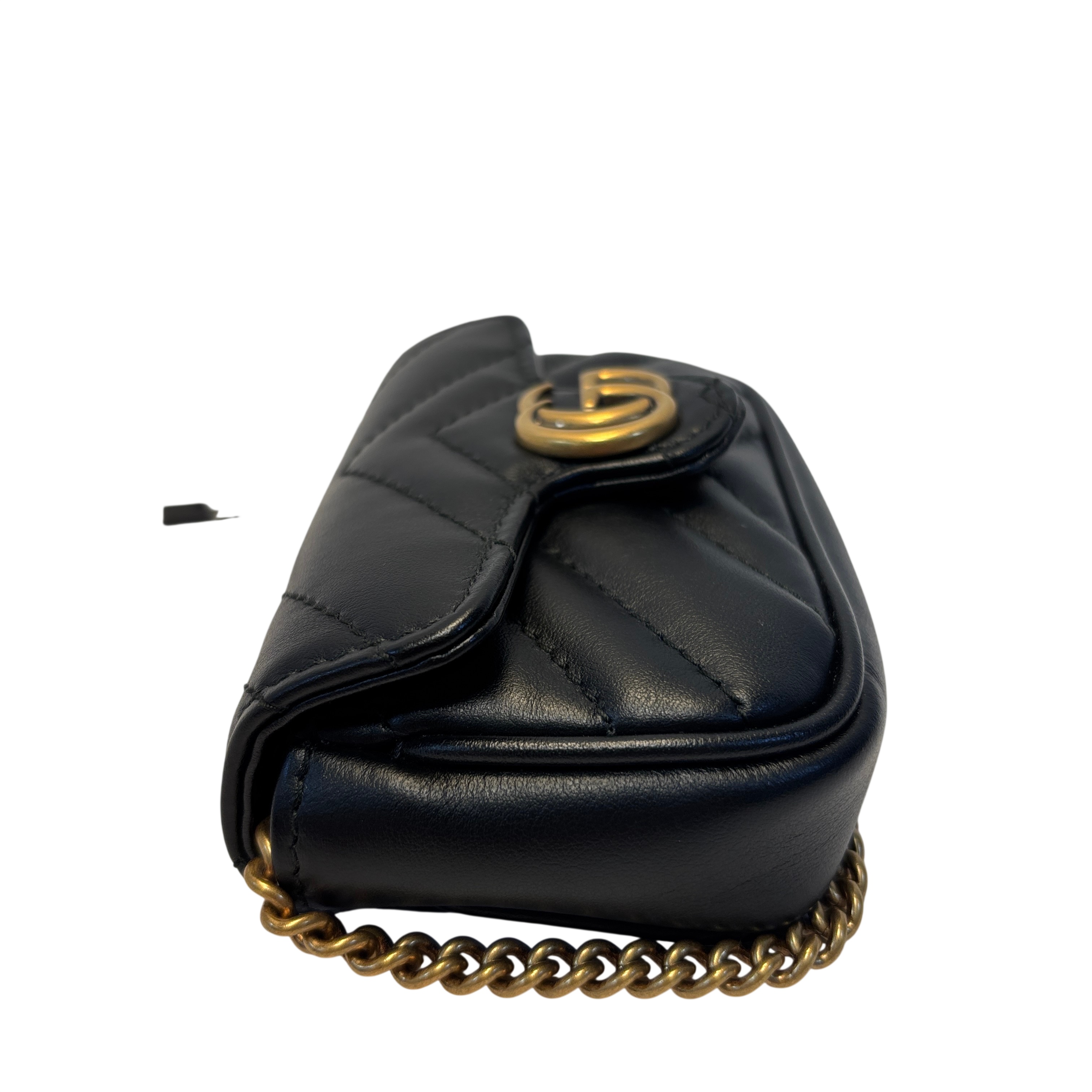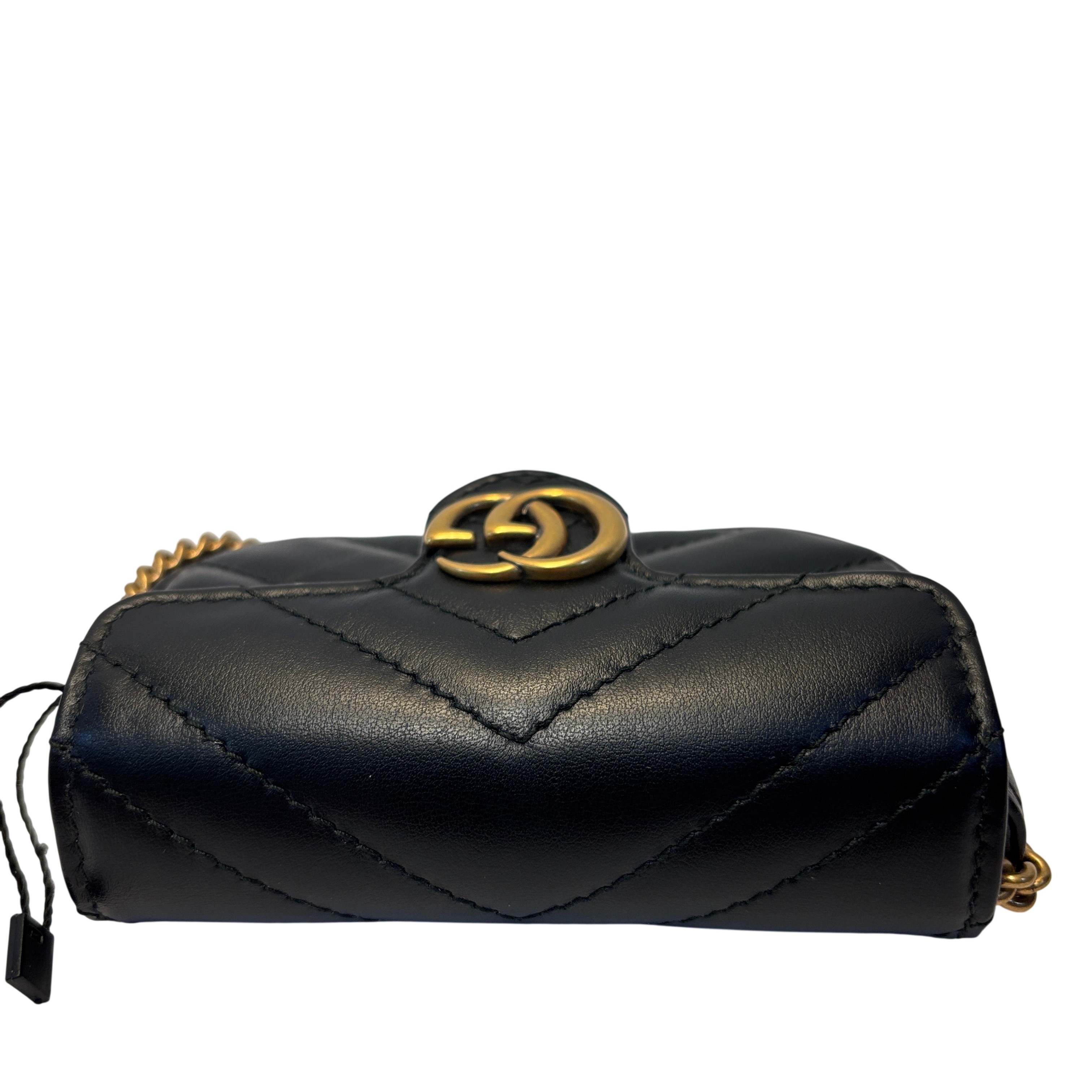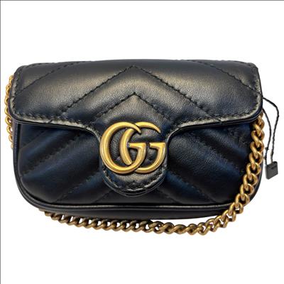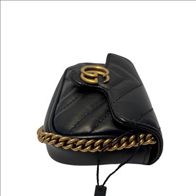 The Gucci Marmont Mini Shoulder Bag is a luxurious black leather bag featuring the iconic GG logo in antique gold hardware. The quilted chevron pattern and chain shoulder strap add elegance and versatility, ideal for both day and evening wear. Crafted with premium leather, this bag combines timeless design with practical size for fashion-forward users.
