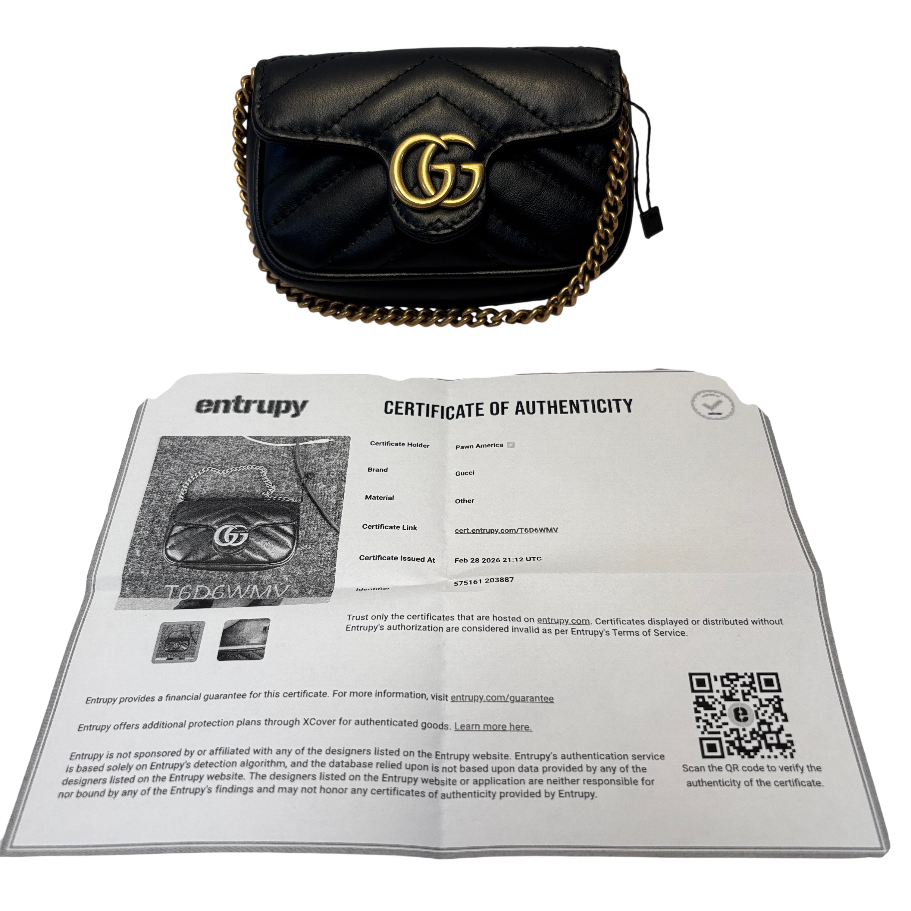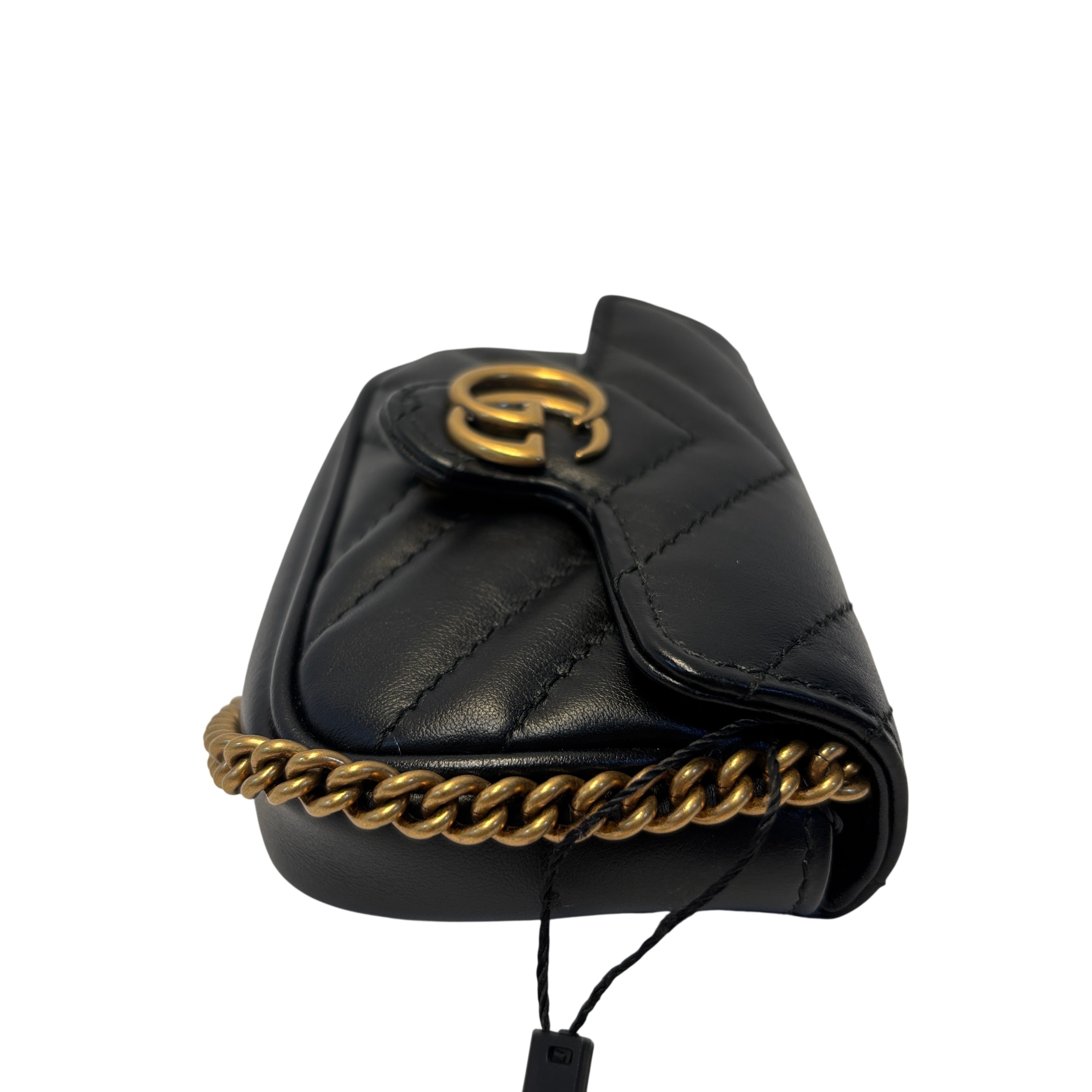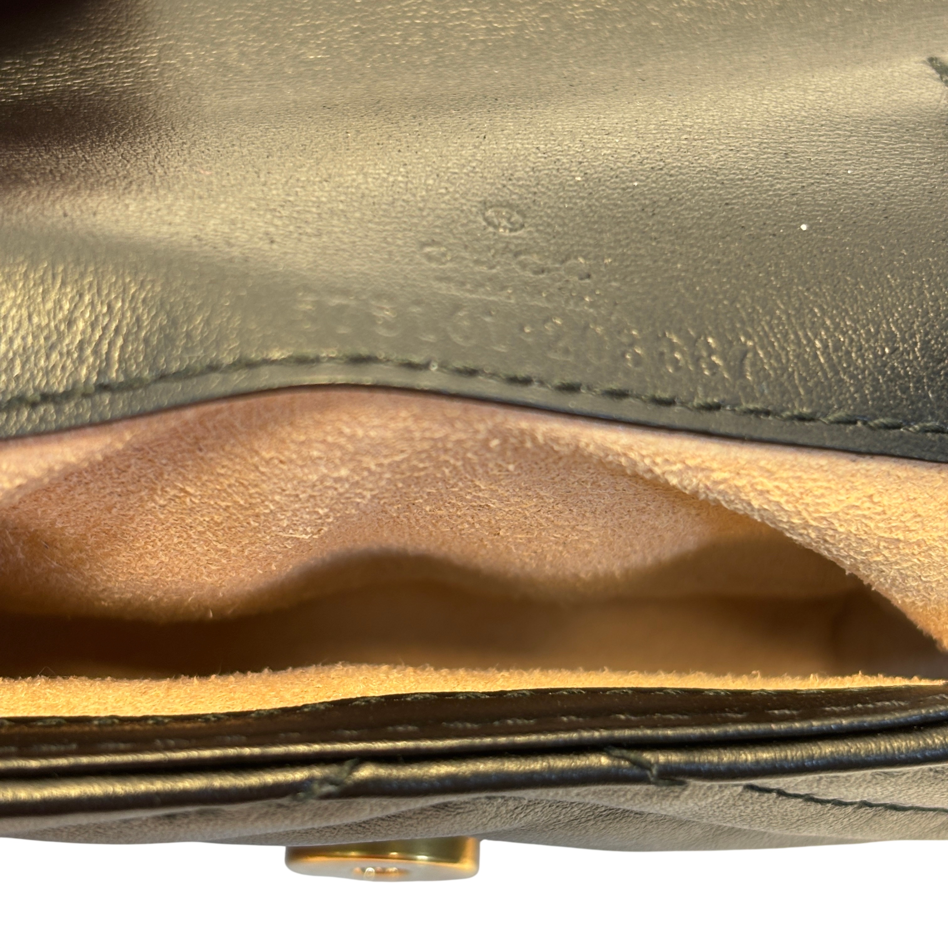 The Gucci Marmont Mini Shoulder Bag is a luxurious black leather bag featuring the iconic GG logo in antique gold hardware. The quilted chevron pattern and chain shoulder strap add elegance and versatility, ideal for both day and evening wear. Crafted with premium leather, this bag combines timeless design with practical size for fashion-forward users.