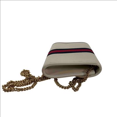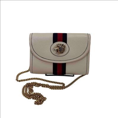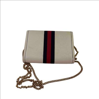 Elevate your accessory collection with this stunning Gucci Rajah Web Chain Mini Bag in Mystic White. Featuring luxurious textured calfskin leather, elegant gold-tone chain strap, and the signature Web stripe, this compact crossbody is the perfect blend of classic Gucci heritage and contemporary chic. Make a statement at any event with this sought-after designer piece.