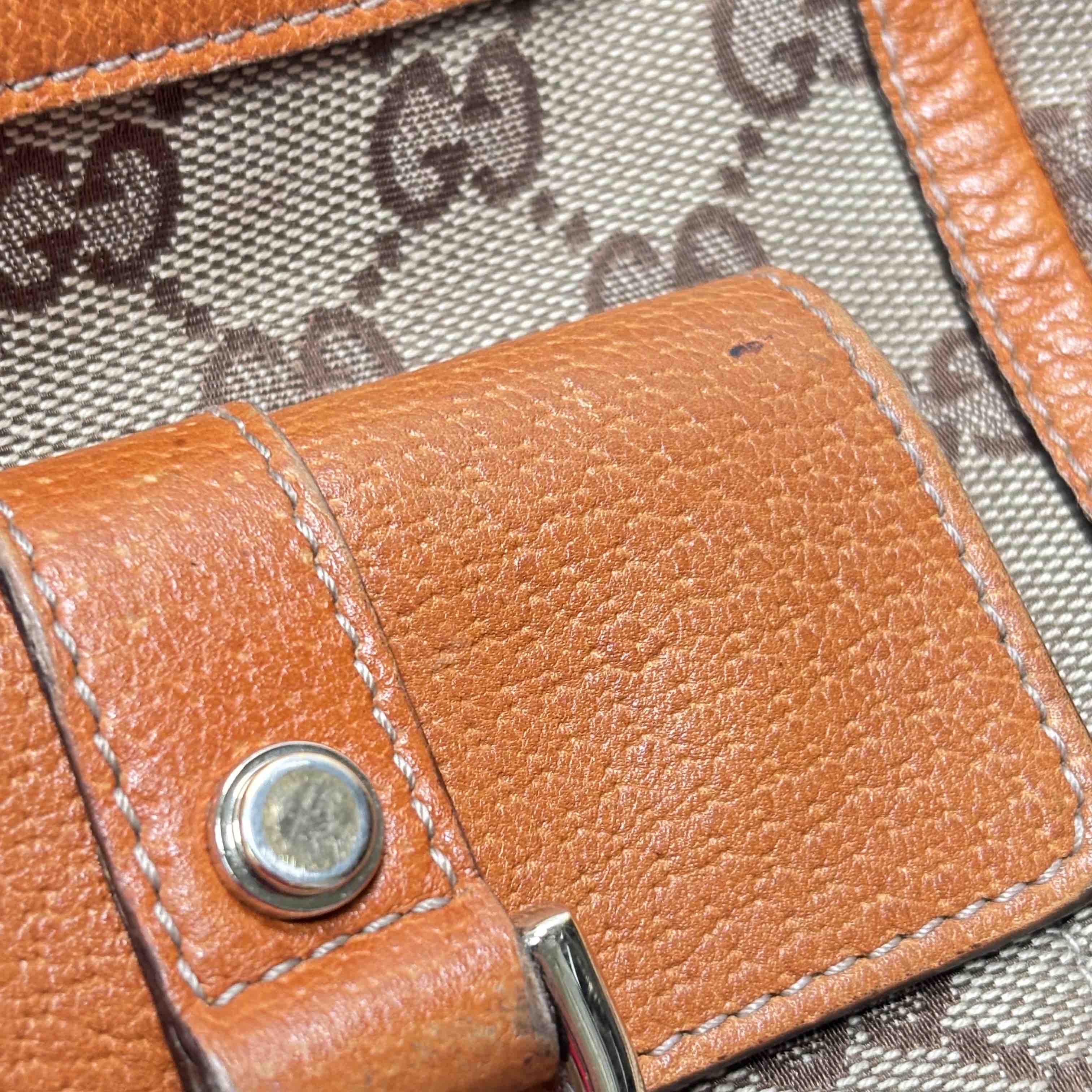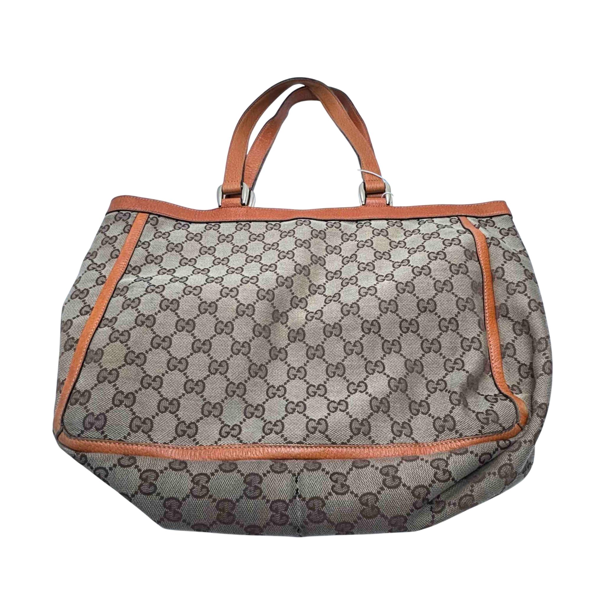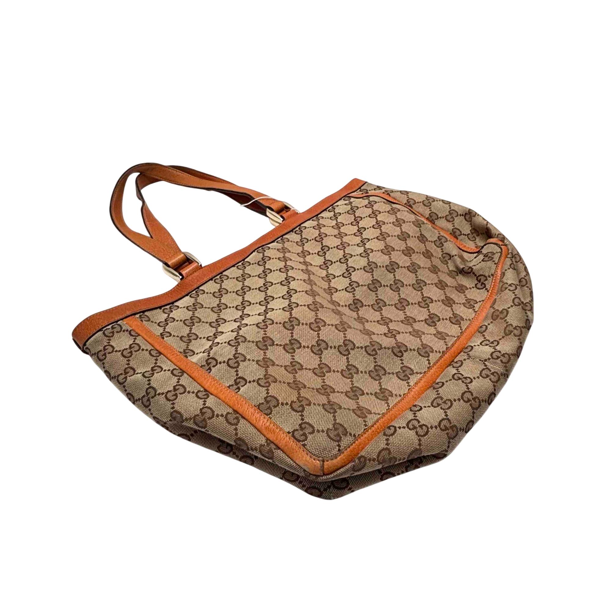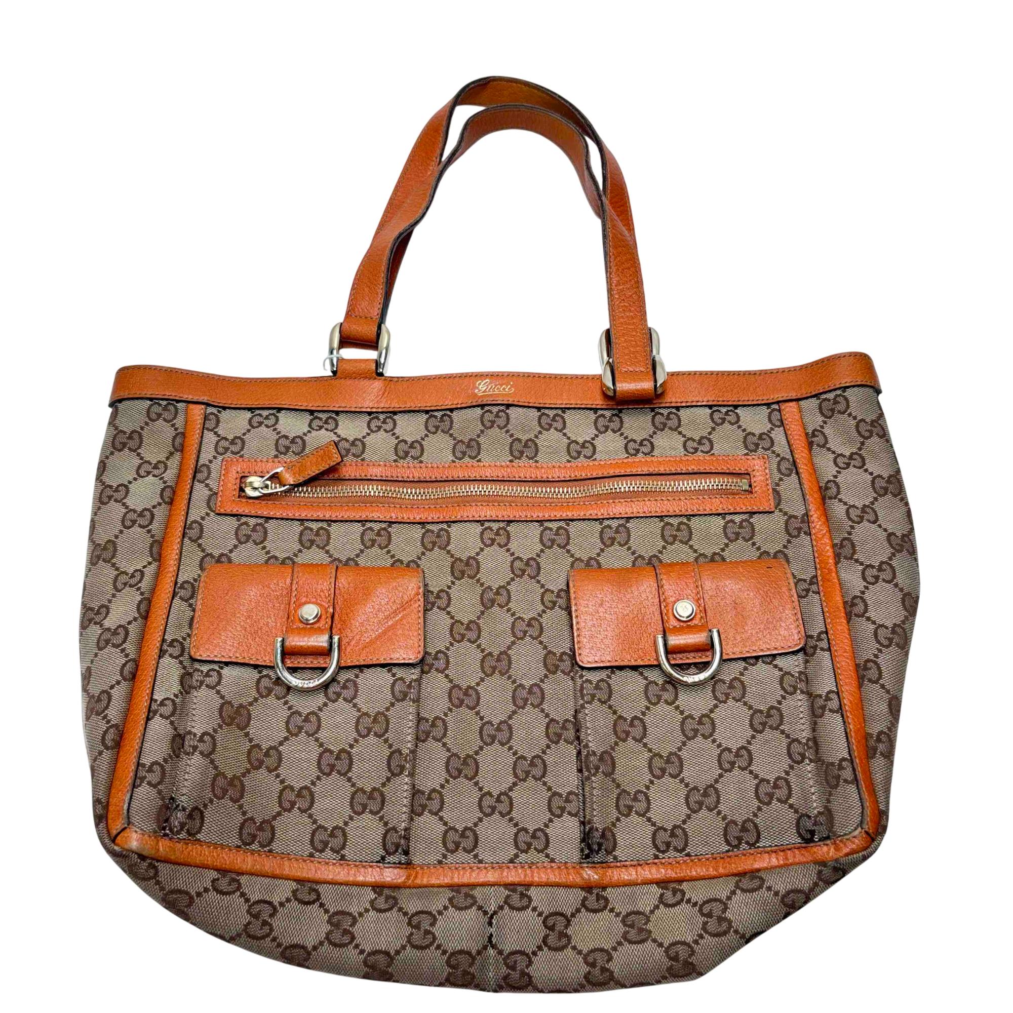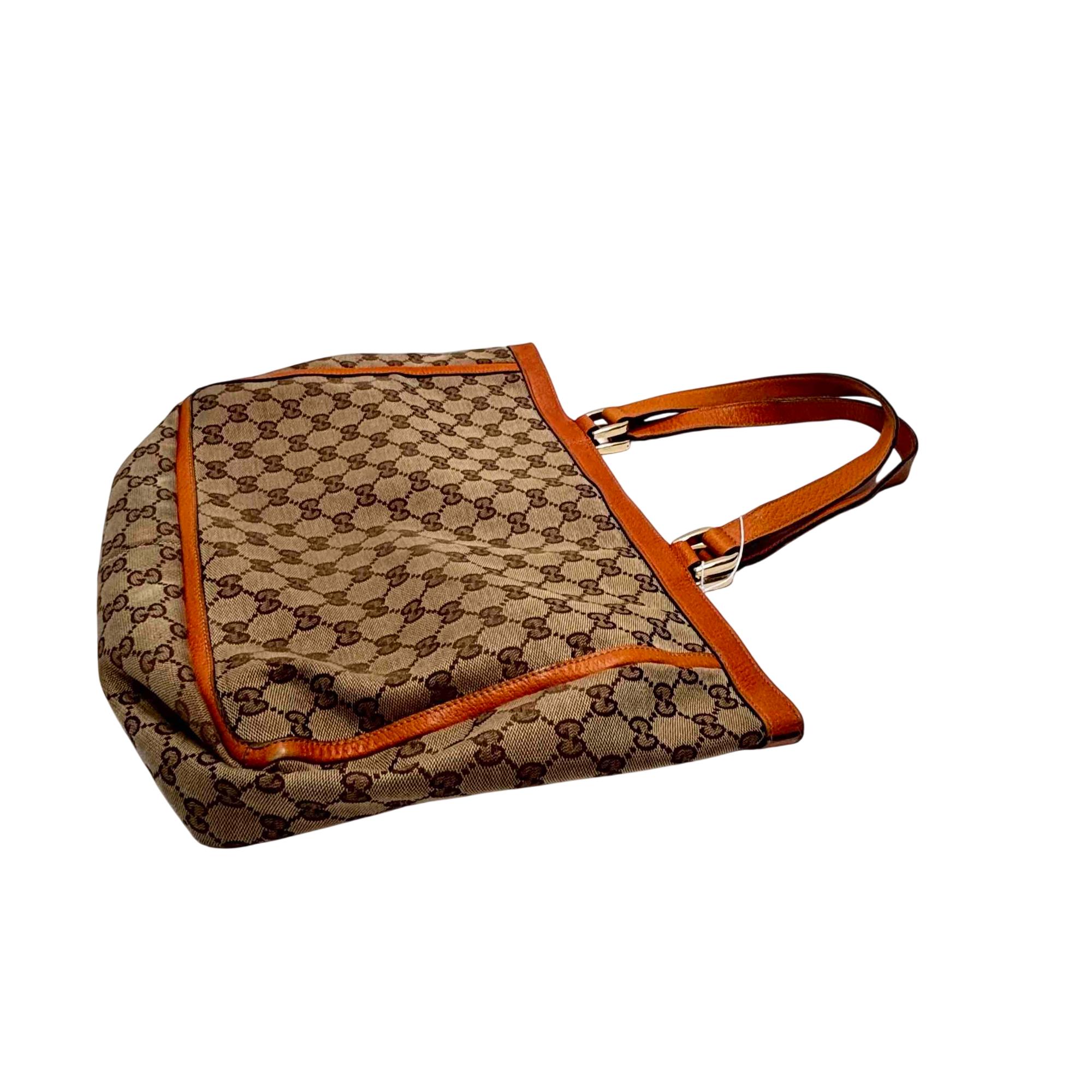 Elevate your style with this authentic Gucci Vintage Abbey Tote Bag, crafted from iconic GG monogram canvas and rich brown leather accents. This spacious and elegant bag features dual handles, a secure front zip pocket, and twin buckle flap pockets for added functionality and timeless luxury. Perfect for the fashion-forward individual seeking a classic statement piece that combines Italian craftsmanship and sophistication.