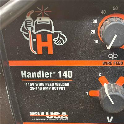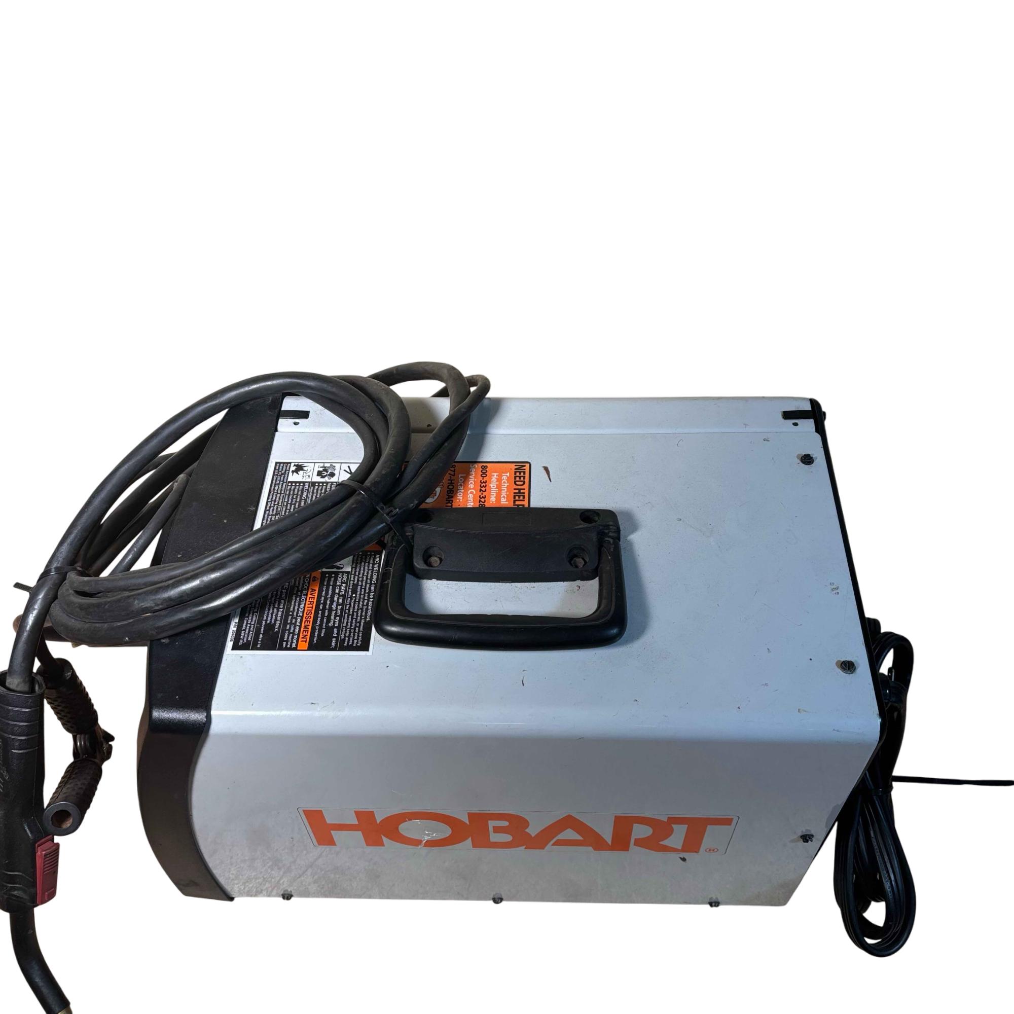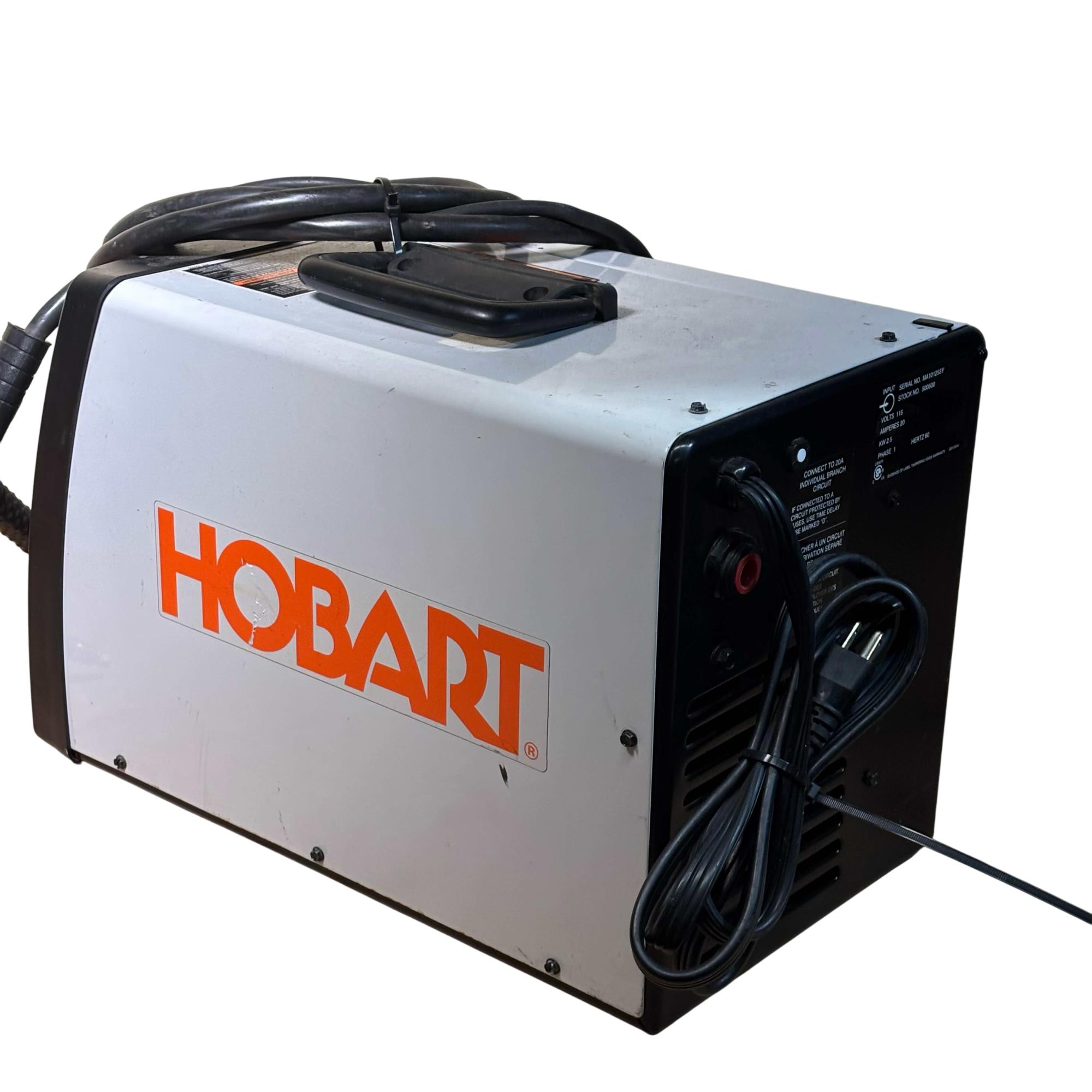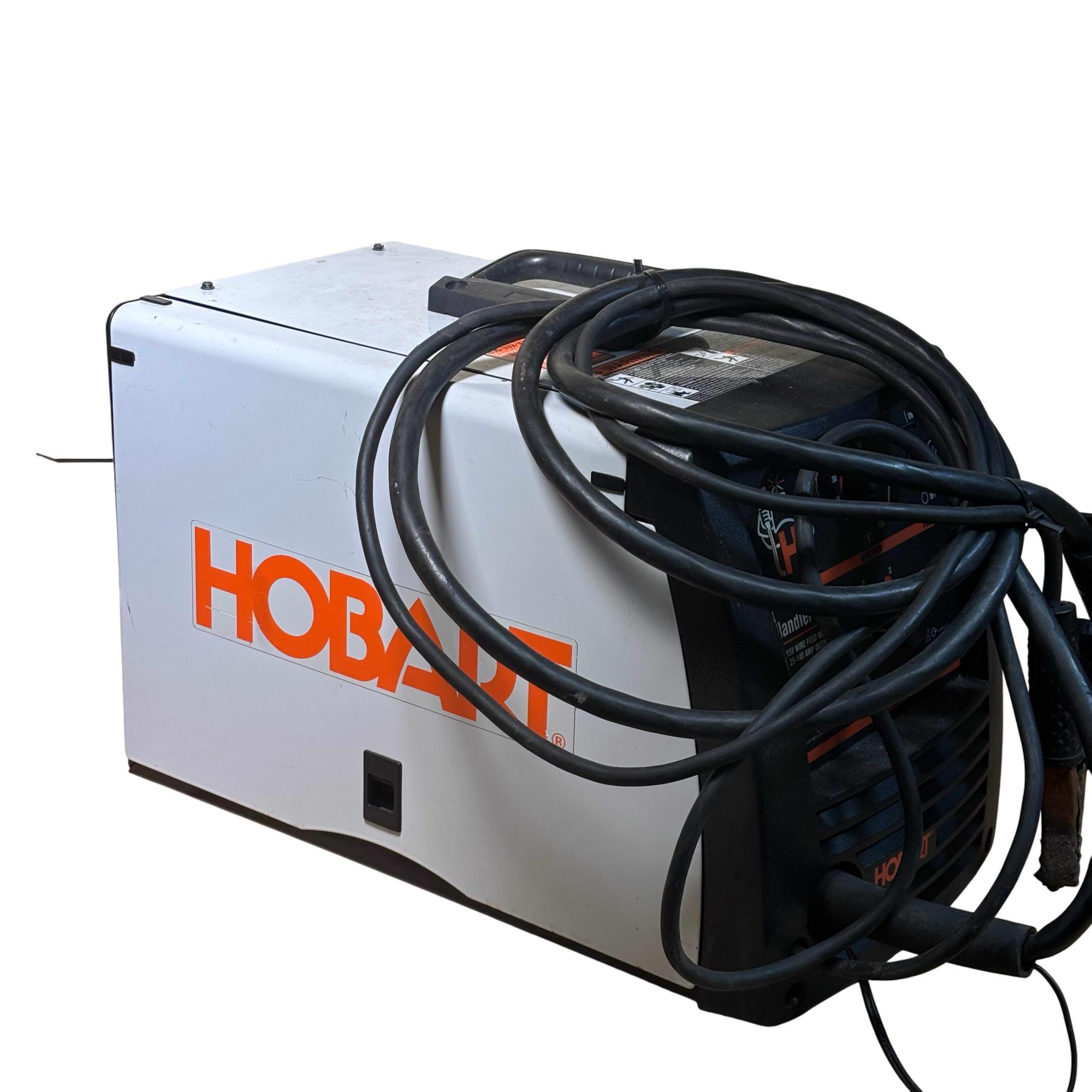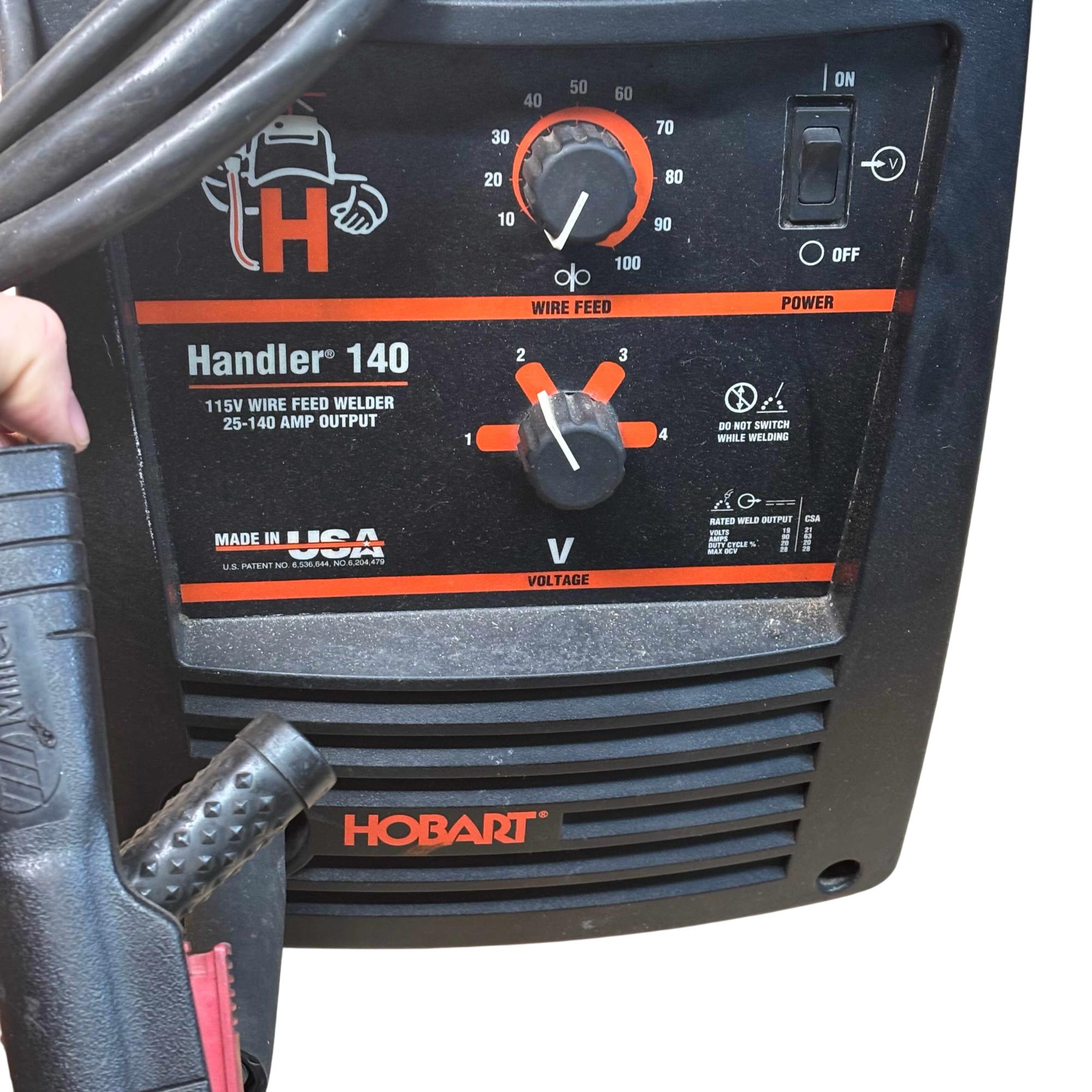 Hobart Handler 140 MIG Welder, Model 500500, is designed for reliable welding performance with a 115-volt, 20-amp power requirement. This welder features a sturdy white housing with black wiring components visible on the exterior, providing durability and ease of operation. Ideal for hobbyists and light industrial tasks, it supports single-phase, 60-hertz power supply to deliver consistent welding output.