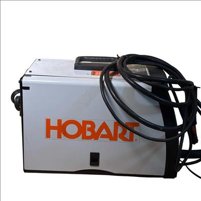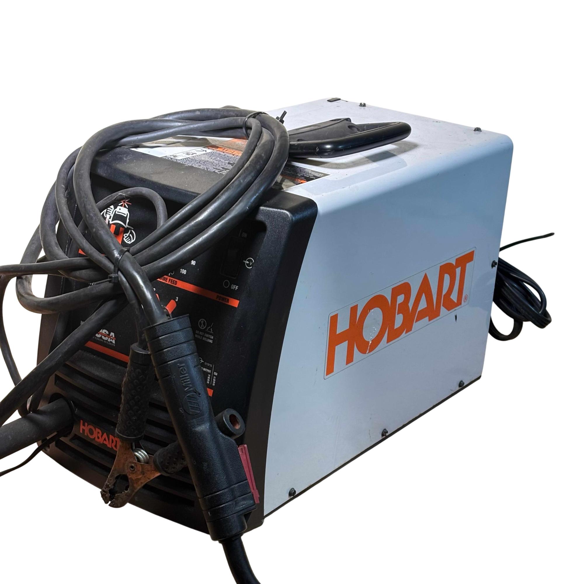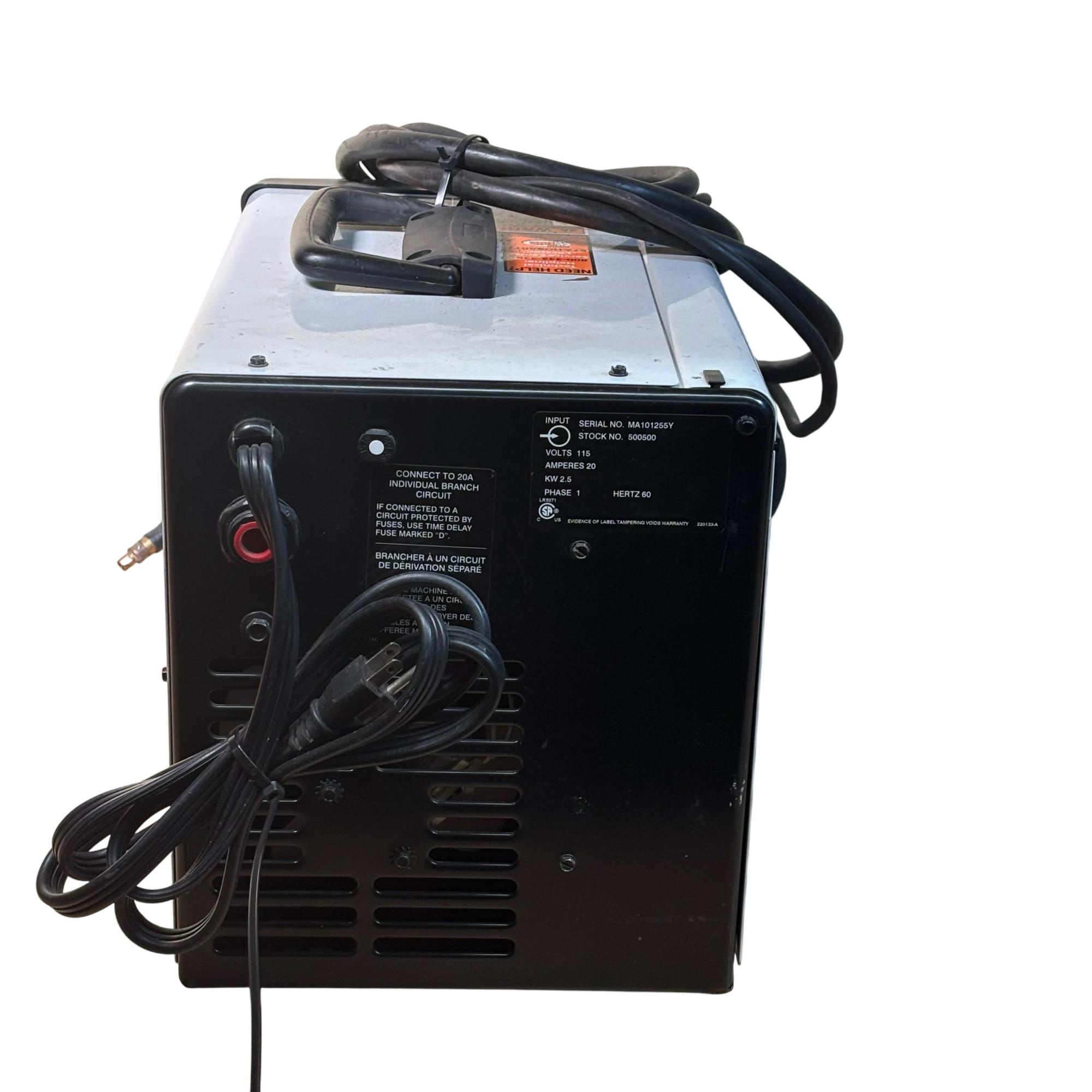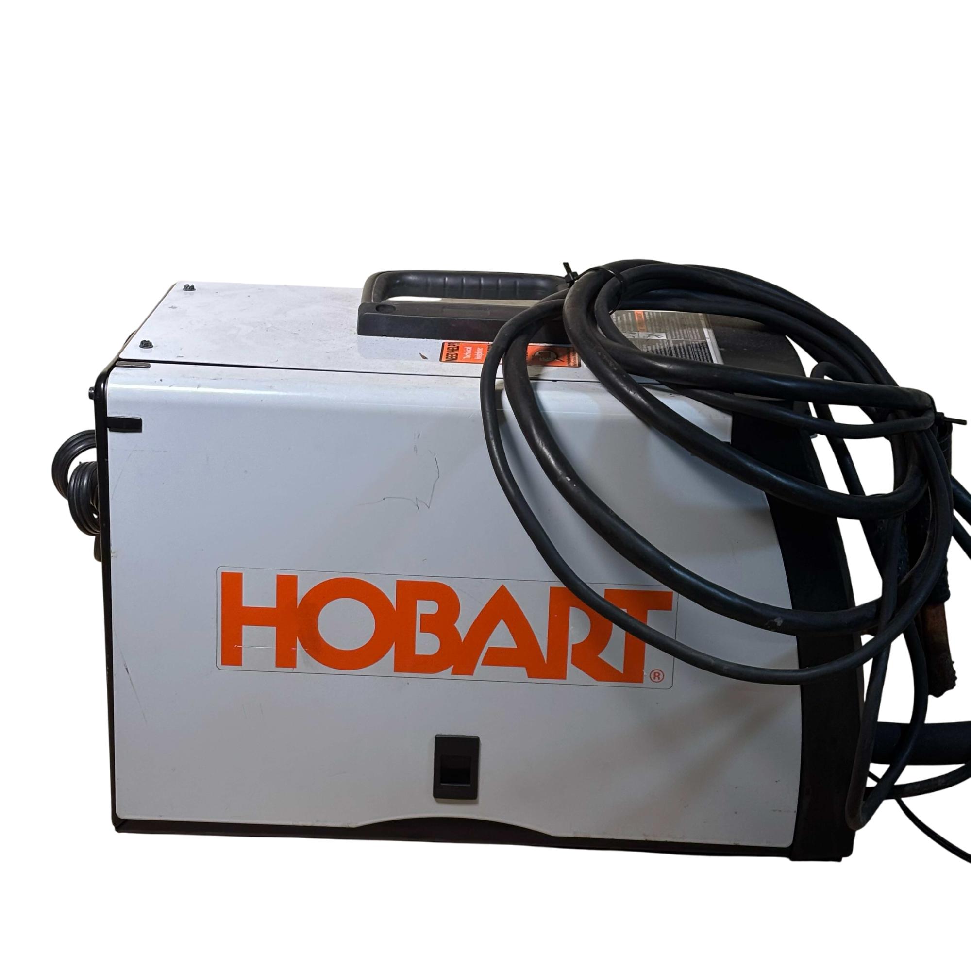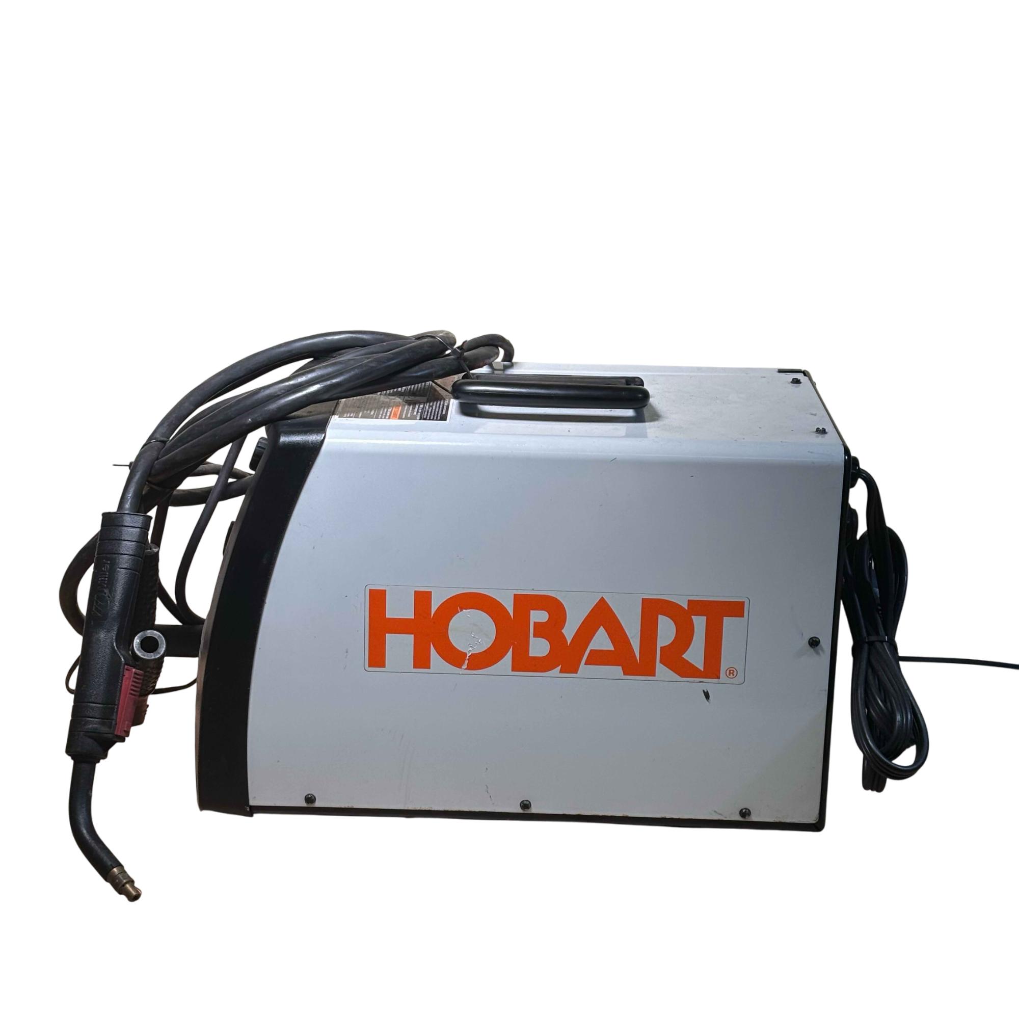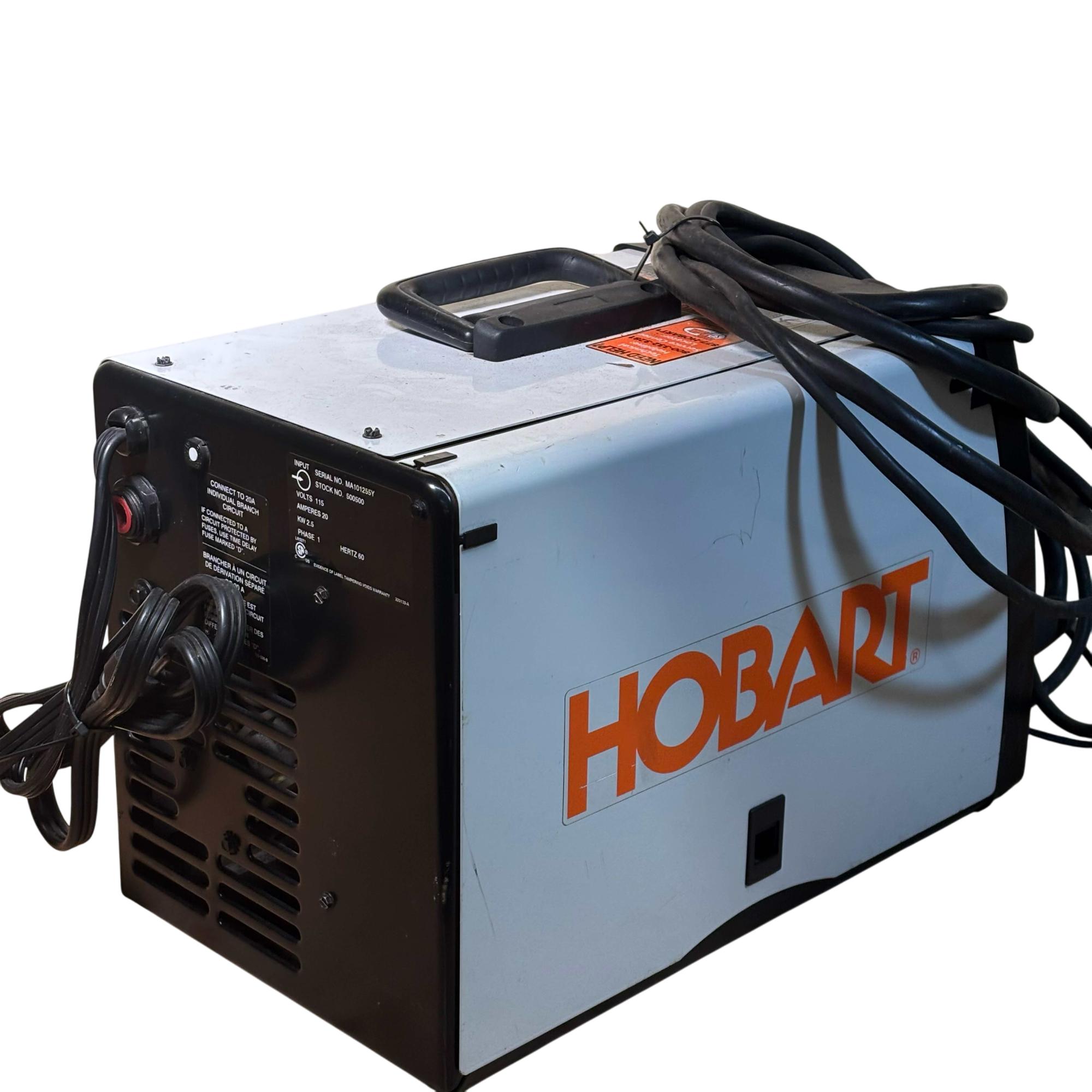 Hobart Handler 140 MIG Welder, Model 500500, is designed for reliable welding performance with a 115-volt, 20-amp power requirement. This welder features a sturdy white housing with black wiring components visible on the exterior, providing durability and ease of operation. Ideal for hobbyists and light industrial tasks, it supports single-phase, 60-hertz power supply to deliver consistent welding output.