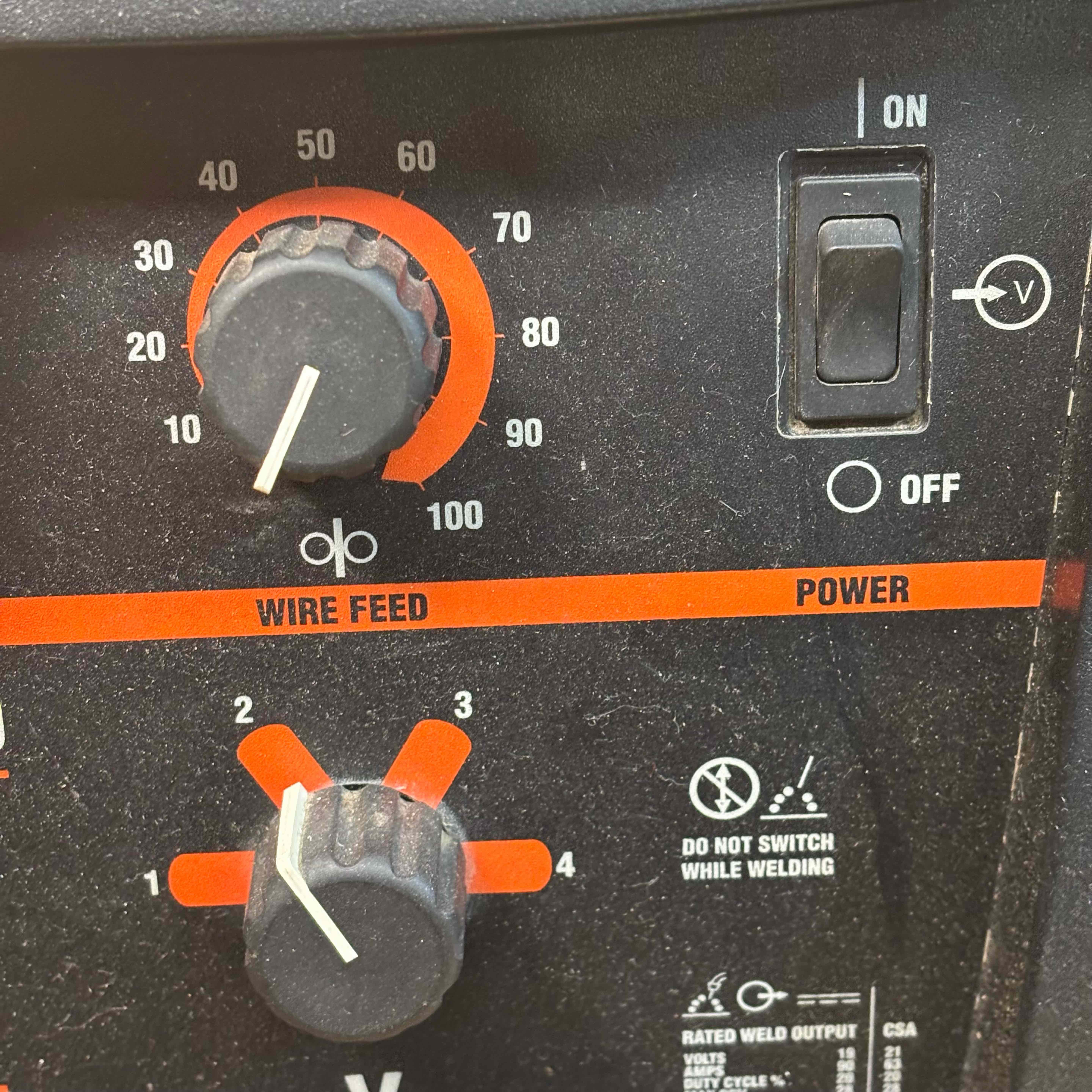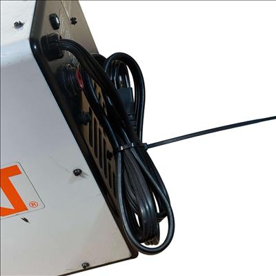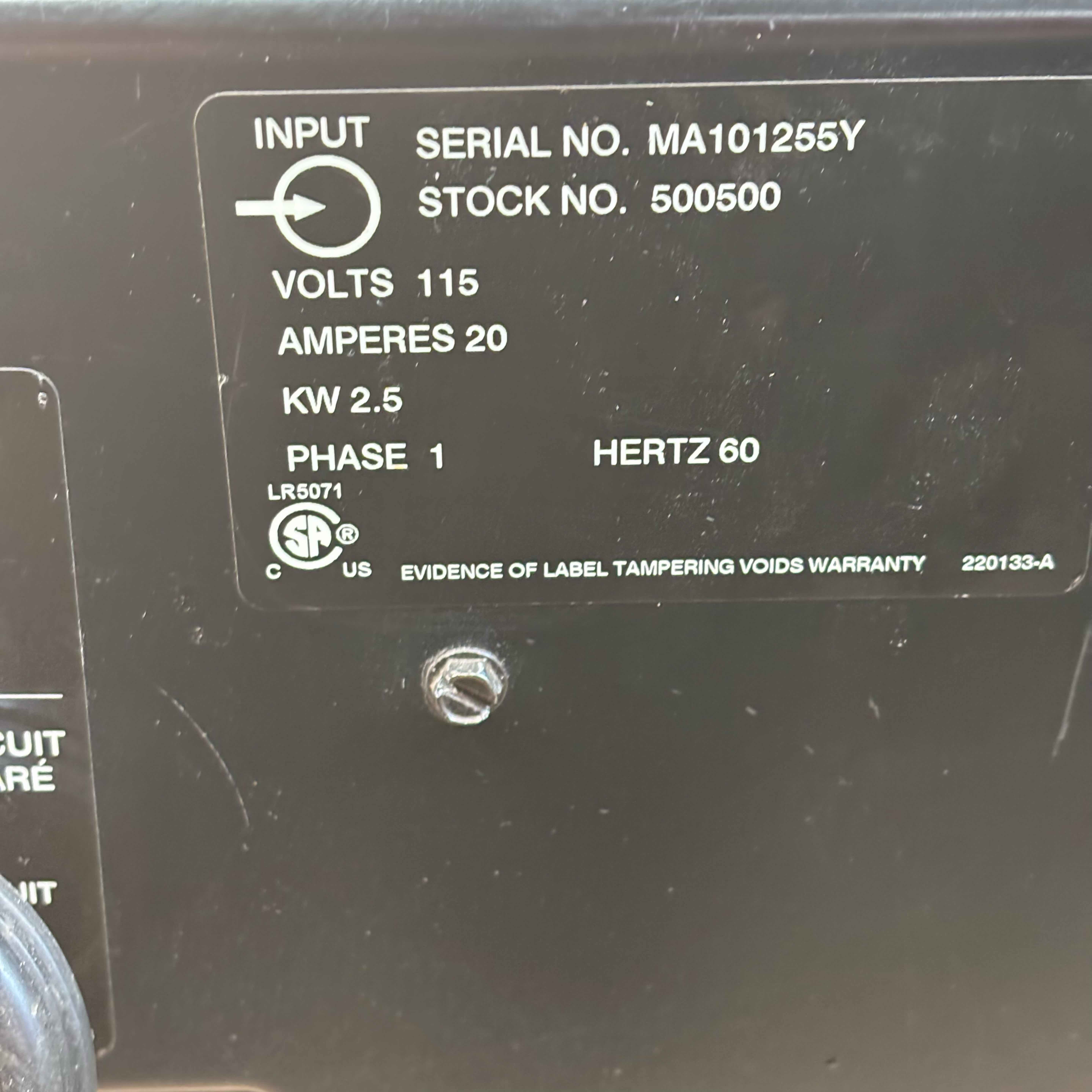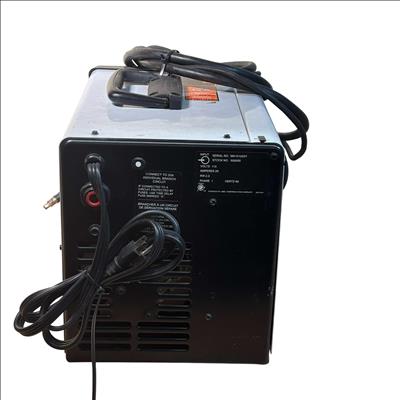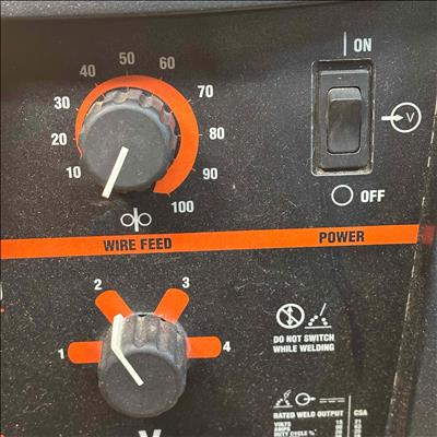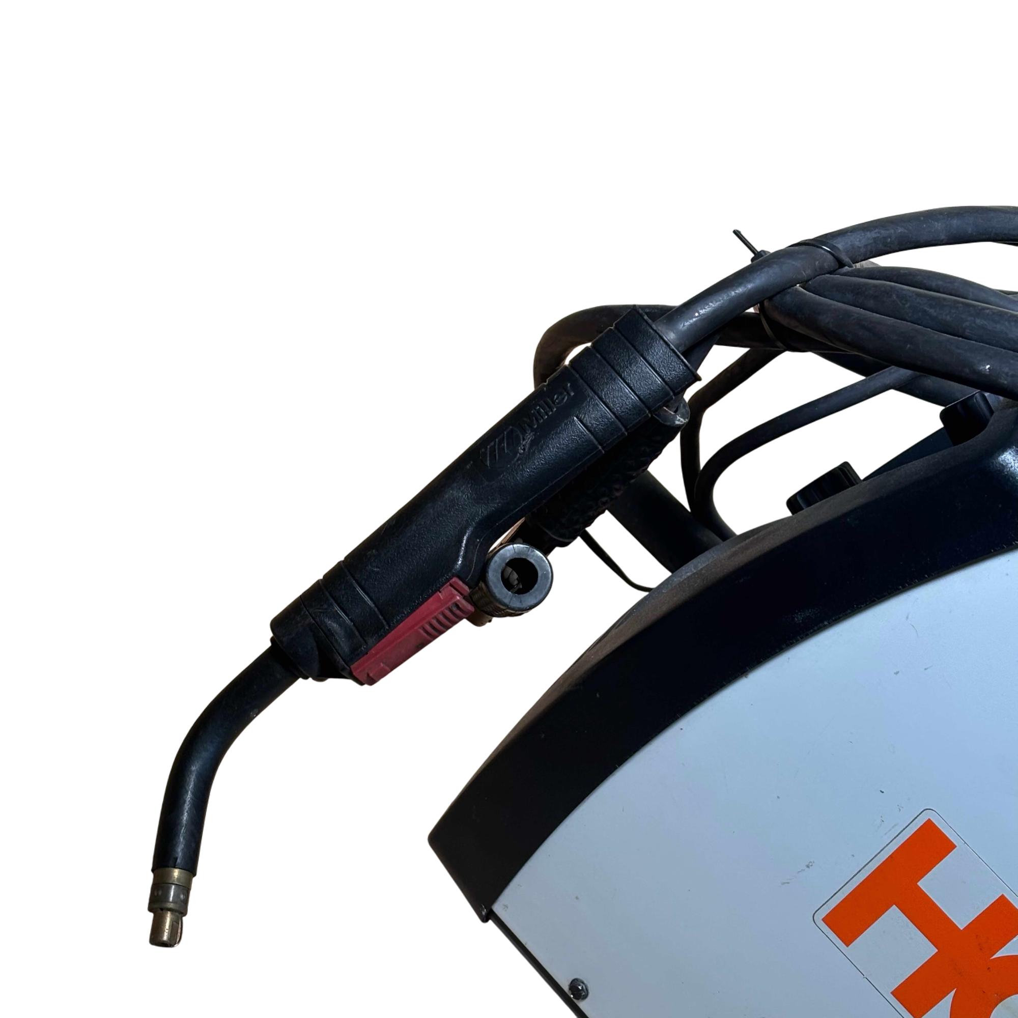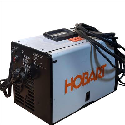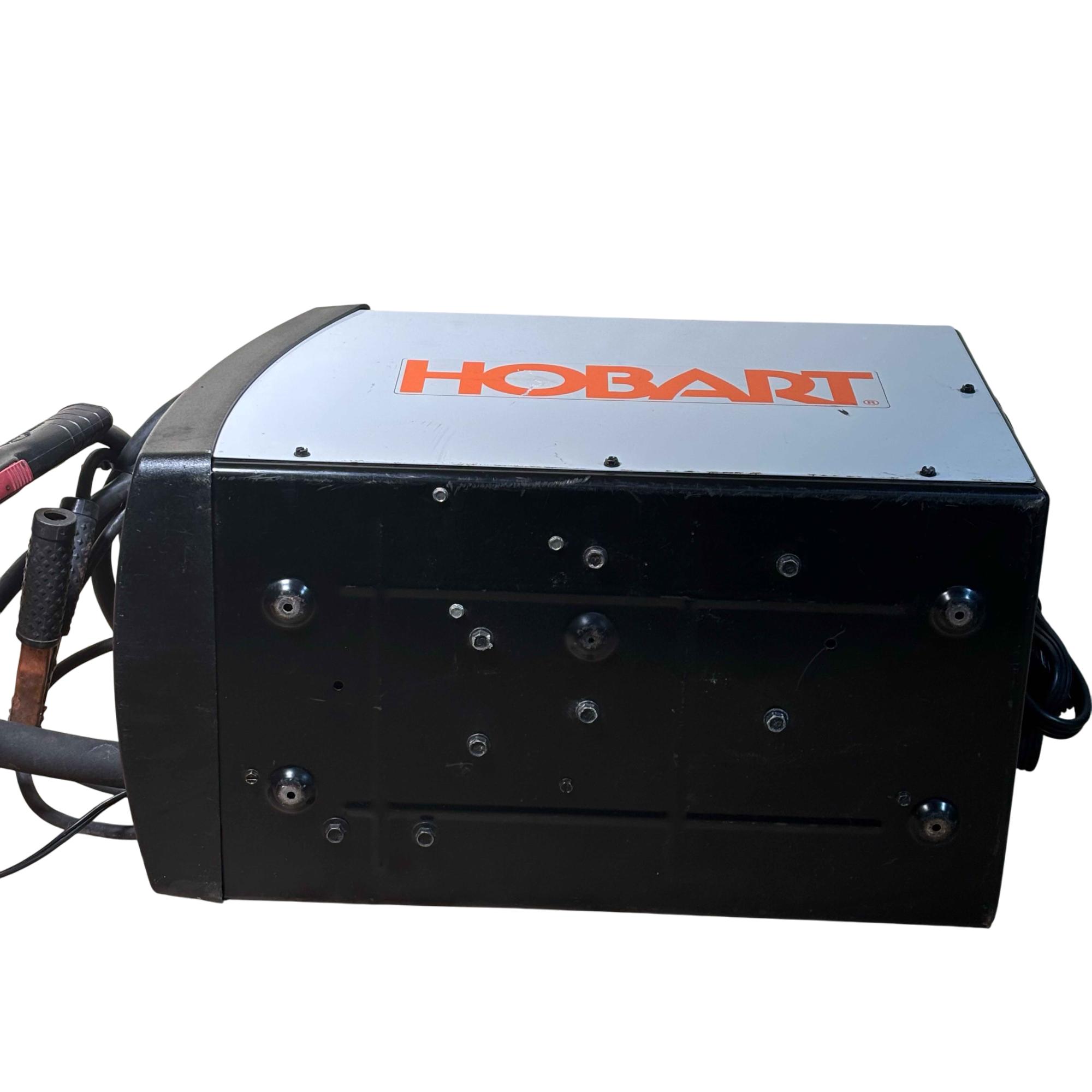 Hobart Handler 140 MIG Welder, Model 500500, is designed for reliable welding performance with a 115-volt, 20-amp power requirement. This welder features a sturdy white housing with black wiring components visible on the exterior, providing durability and ease of operation. Ideal for hobbyists and light industrial tasks, it supports single-phase, 60-hertz power supply to deliver consistent welding output.