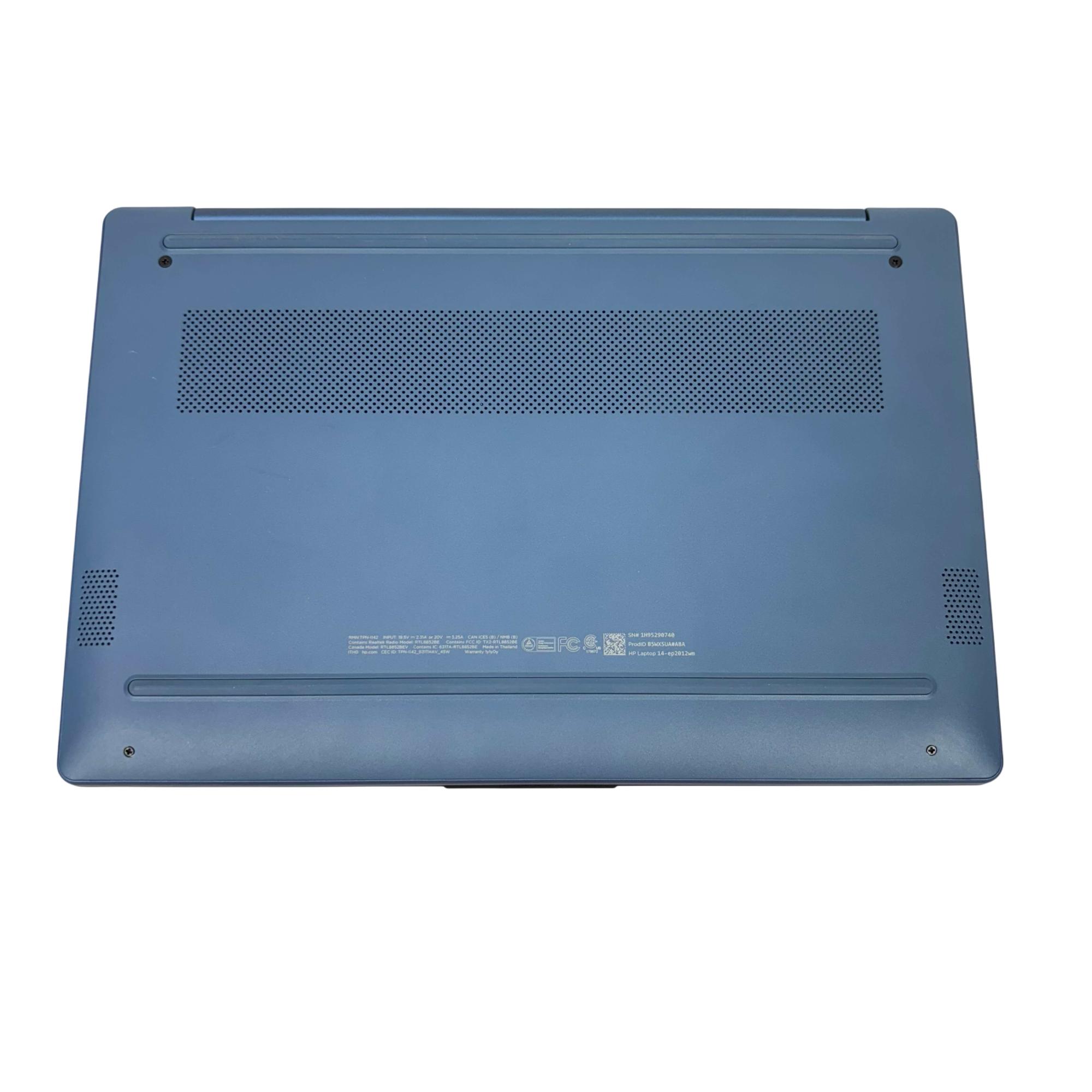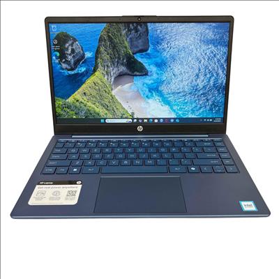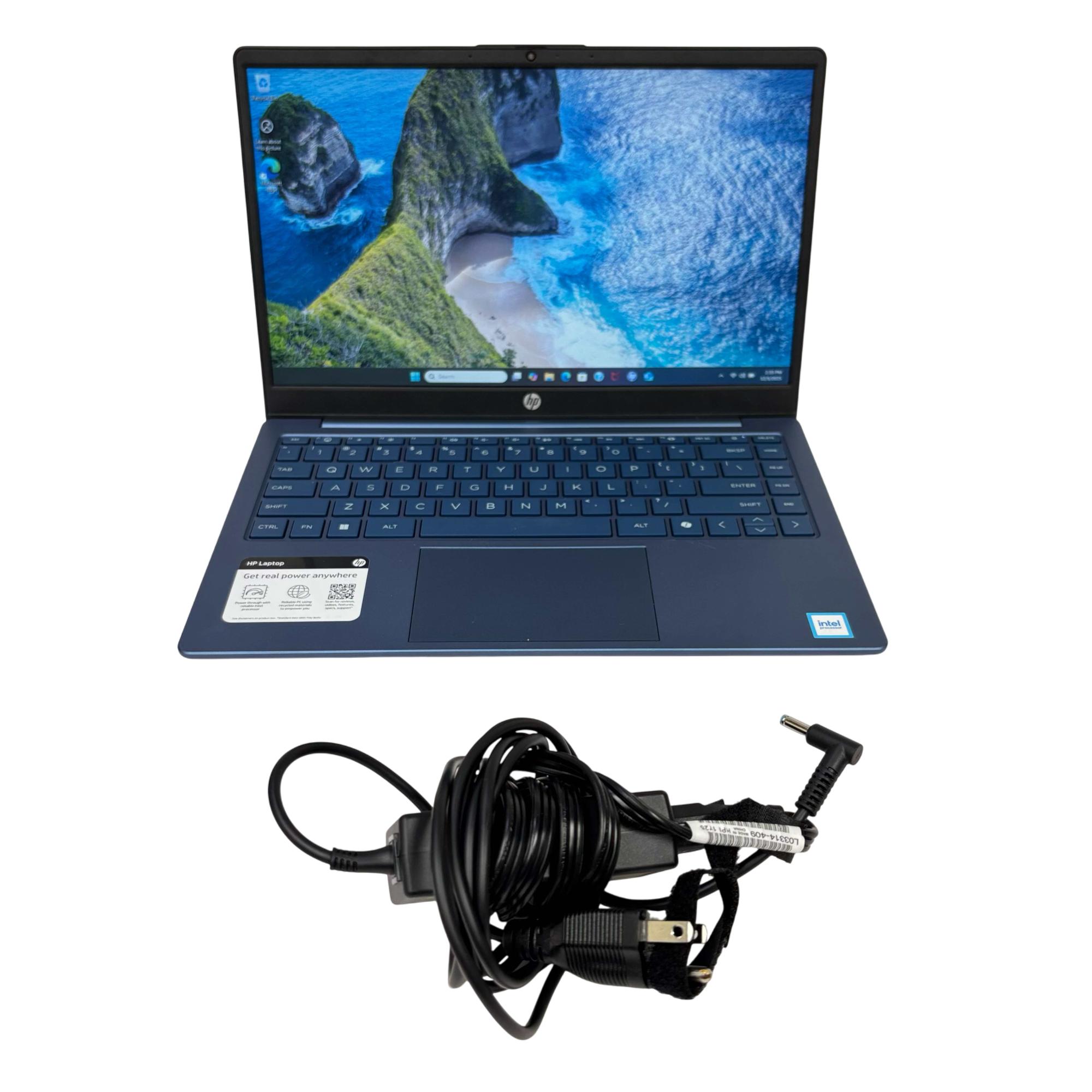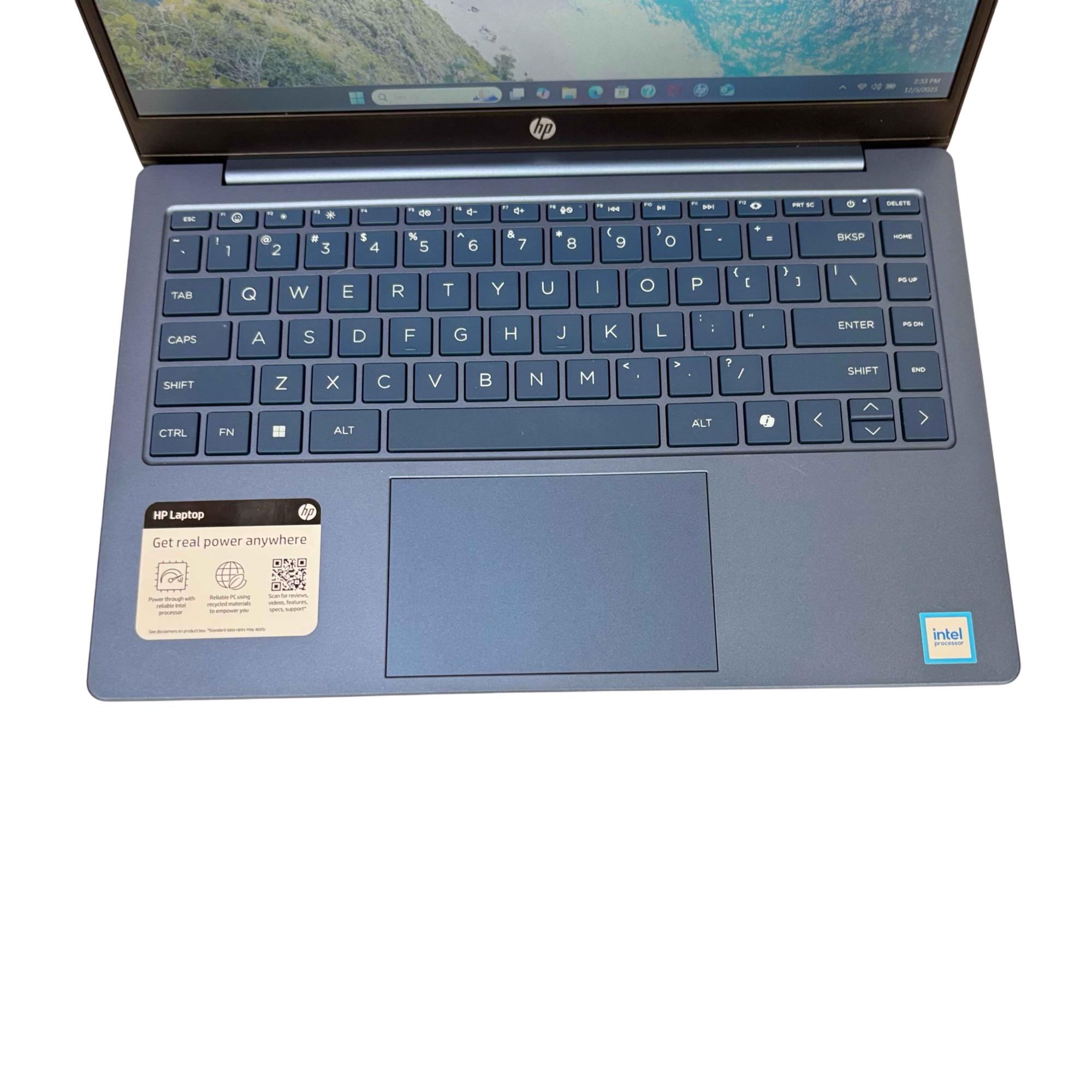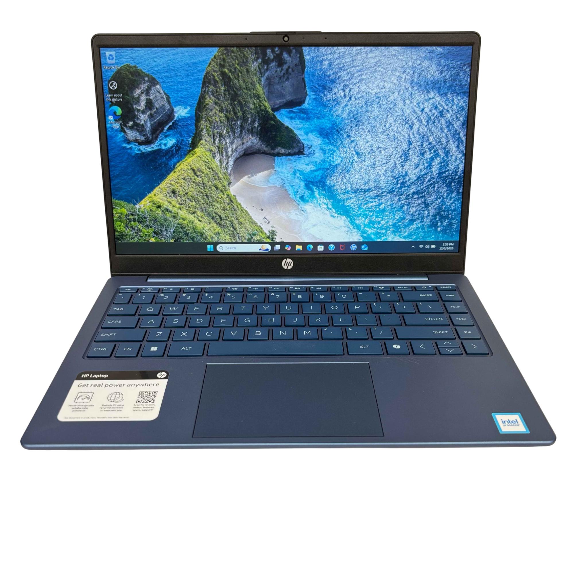 This HP Laptop features a vibrant 14-inch display and is powered by an Intel processor that ensures smooth and efficient computing. This model includes a 128GB solid state drive for fast data access. It's sleek blue design reflects a modern and professional aesthetic suitable for everyday use and multitasking.