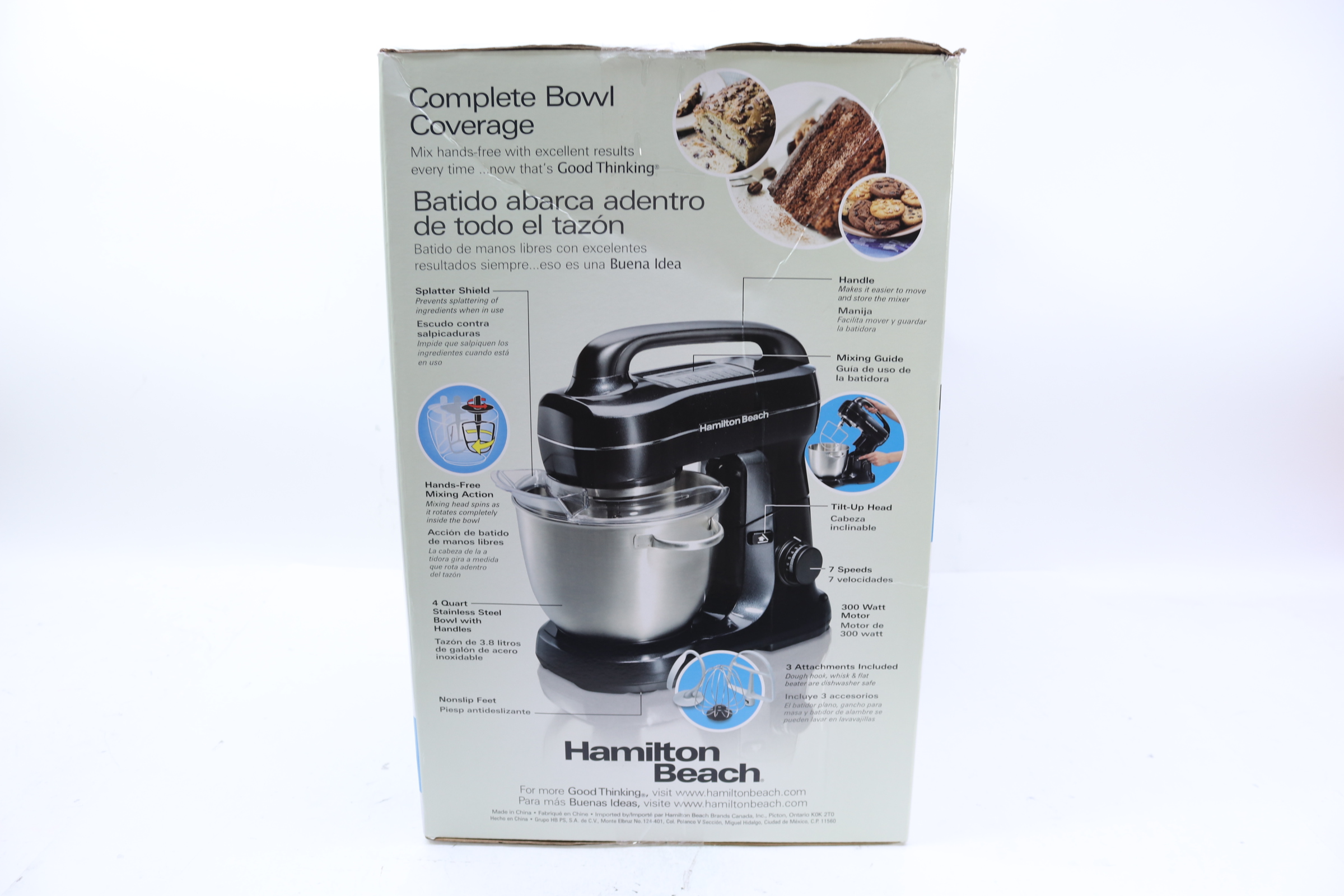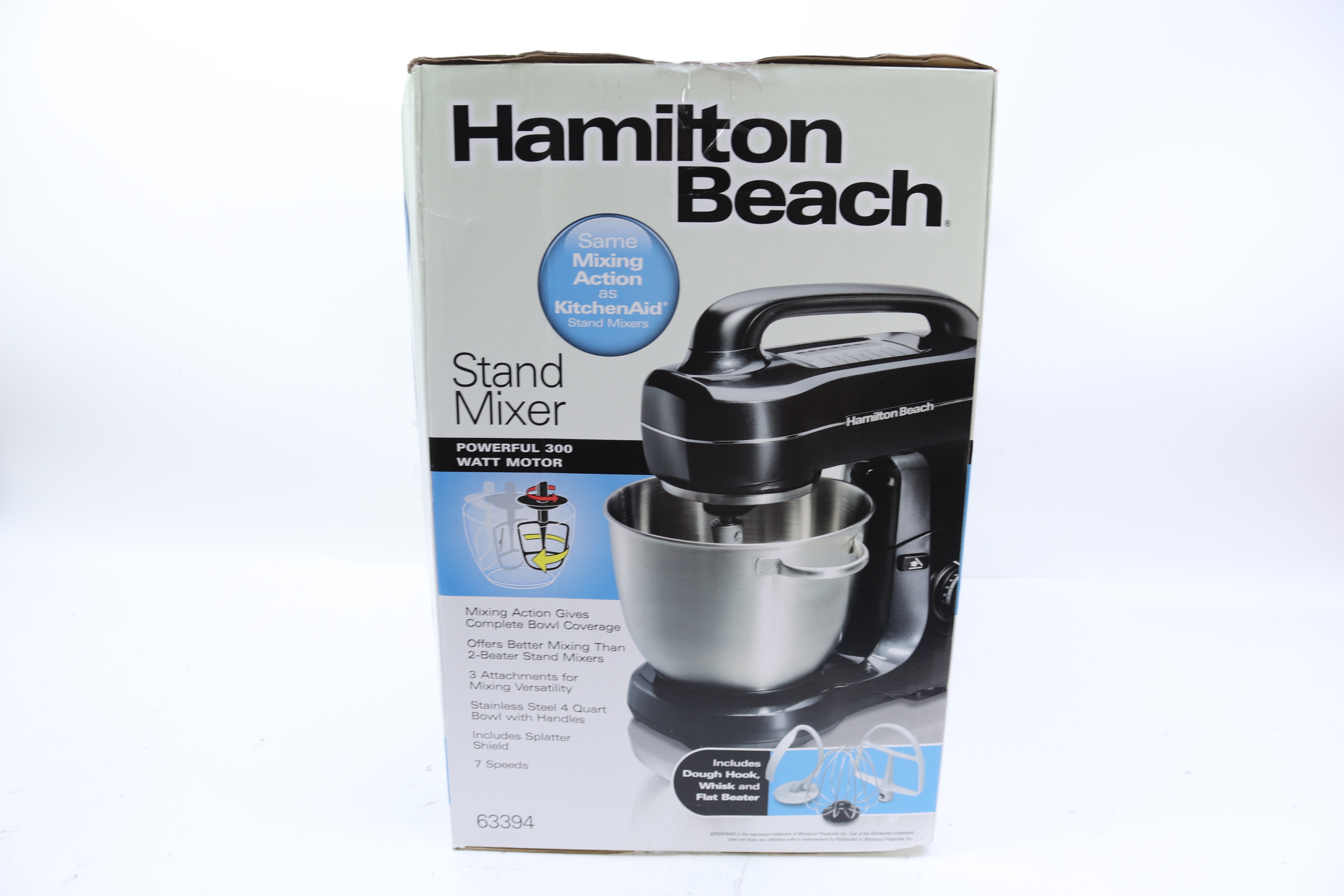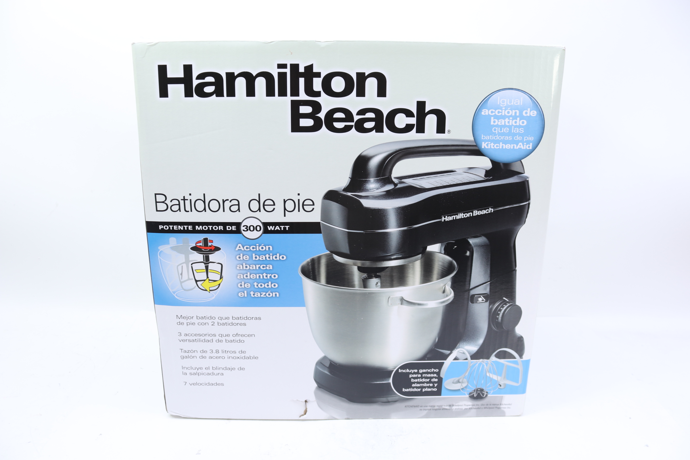 Speed up your baking with this 300W Hamilton Beach stand mixer. Its thorough mixing action provides complete bowl coverage for full blending of ingredients, and it includes a dough hook and flat beater for preparing diverse dishes. This Hamilton Beach stand mixer has seven speeds for excellent control and power.