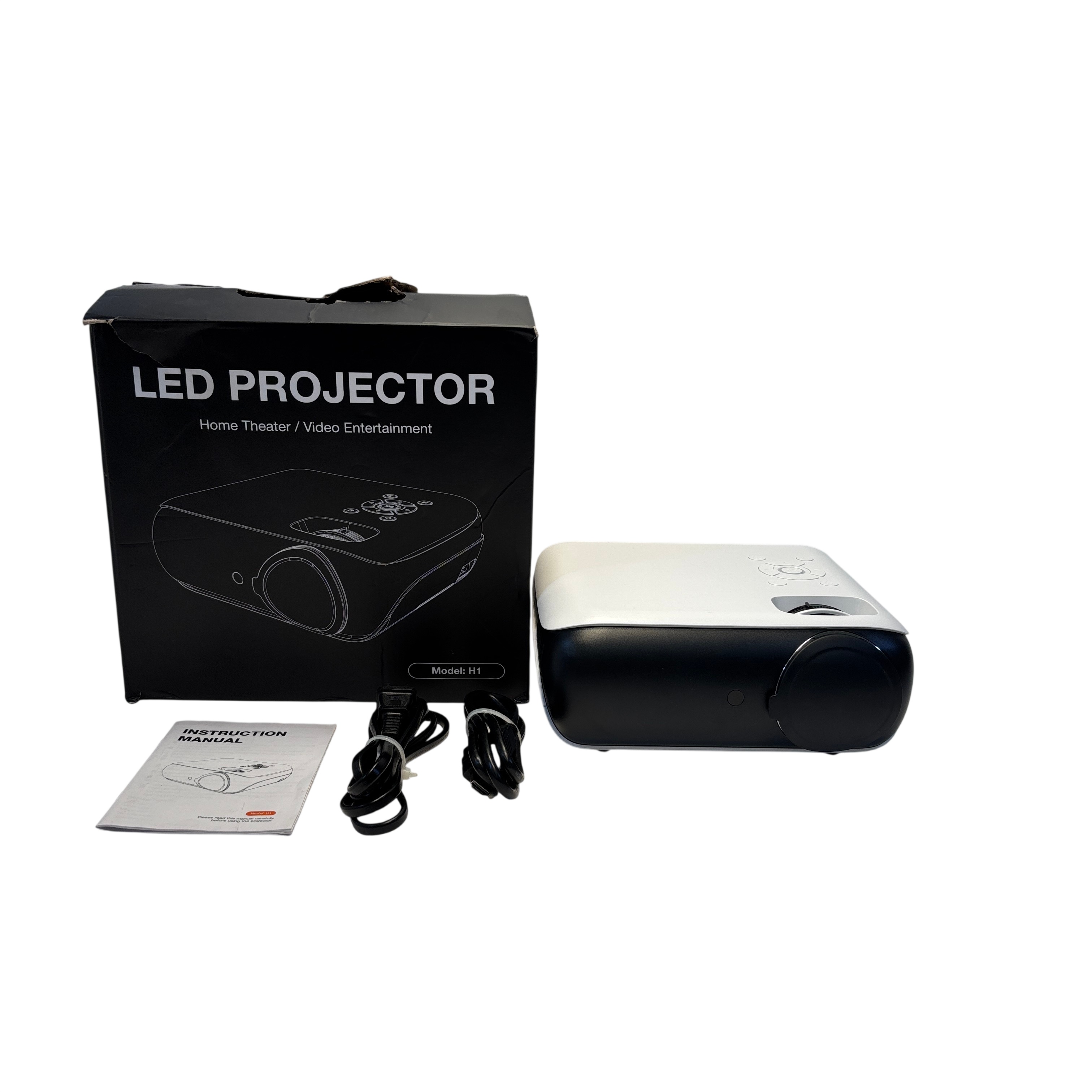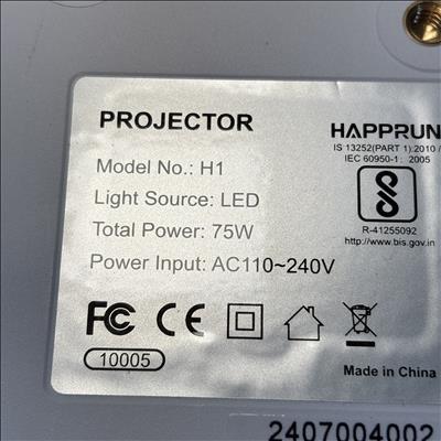 The Happrun H1 LED Projector is a compact and versatile home theater device designed for video entertainment. Featuring a bright LED light source with a total power of 75W and wide voltage compatibility from AC110 to 240V, this projector delivers reliable performance for various viewing environments. The package includes the projector unit, power cable, and an instruction manual, making it easy to set up and use. Its sleek black and white design and moderate size make it suitable for home or office use, providing an affordable solution for immersive video projection.