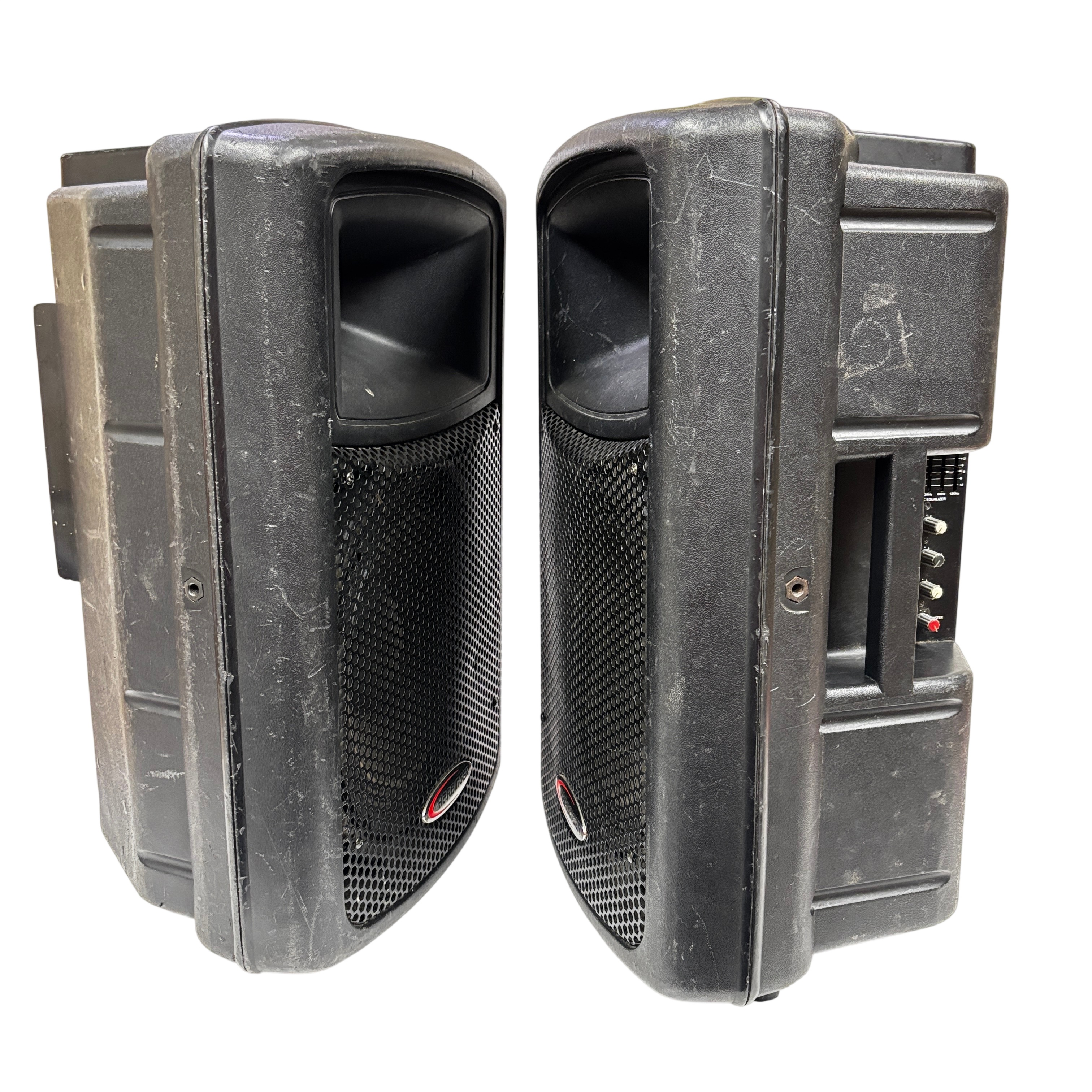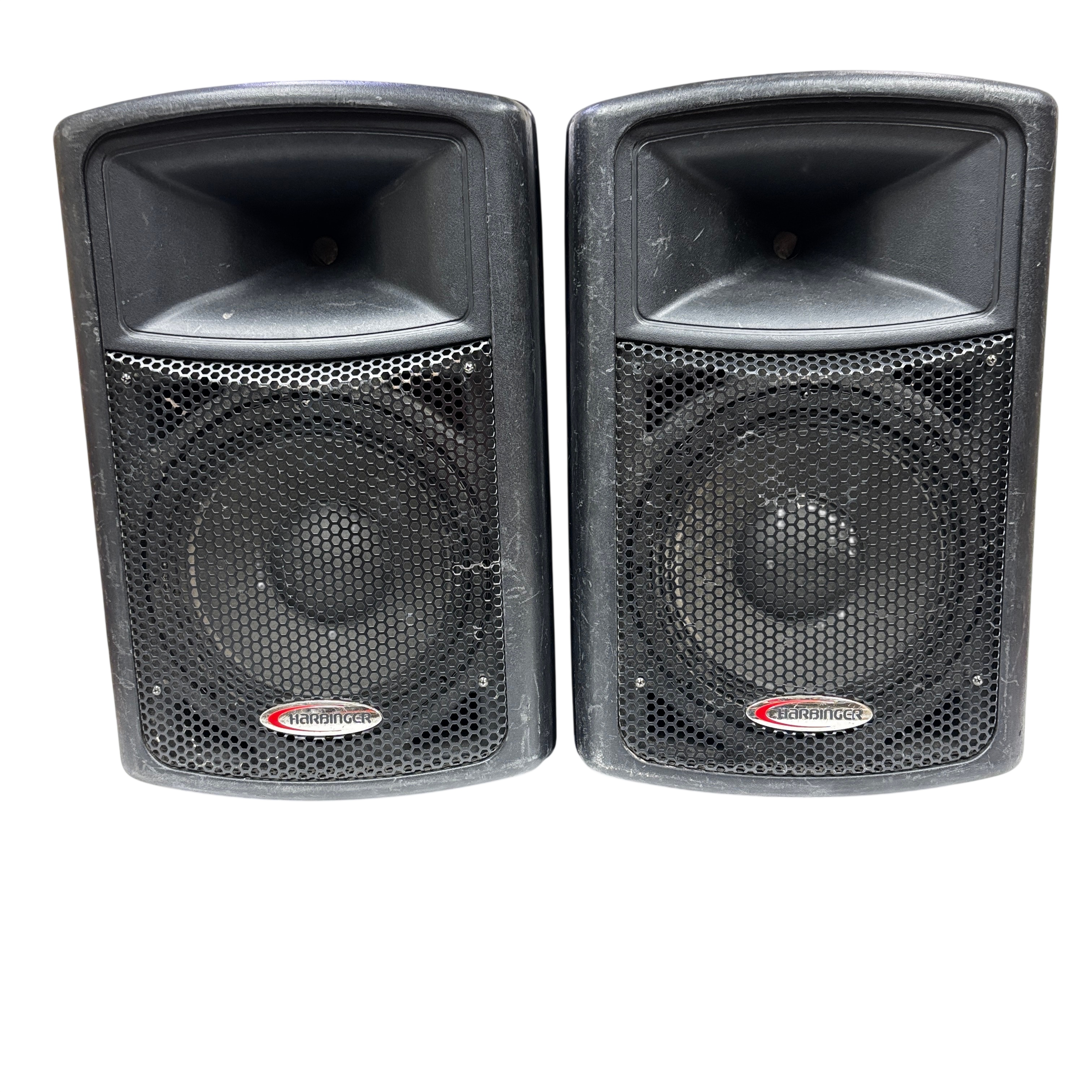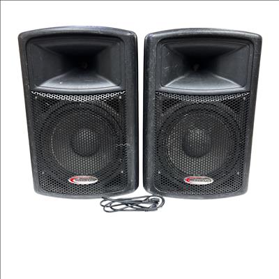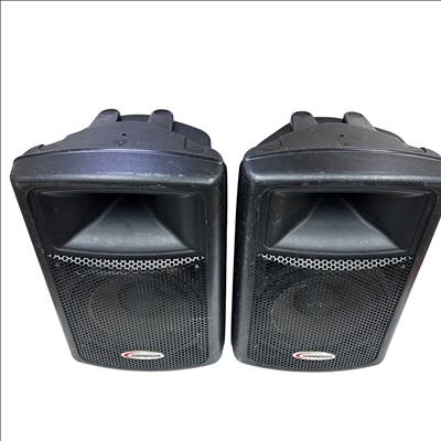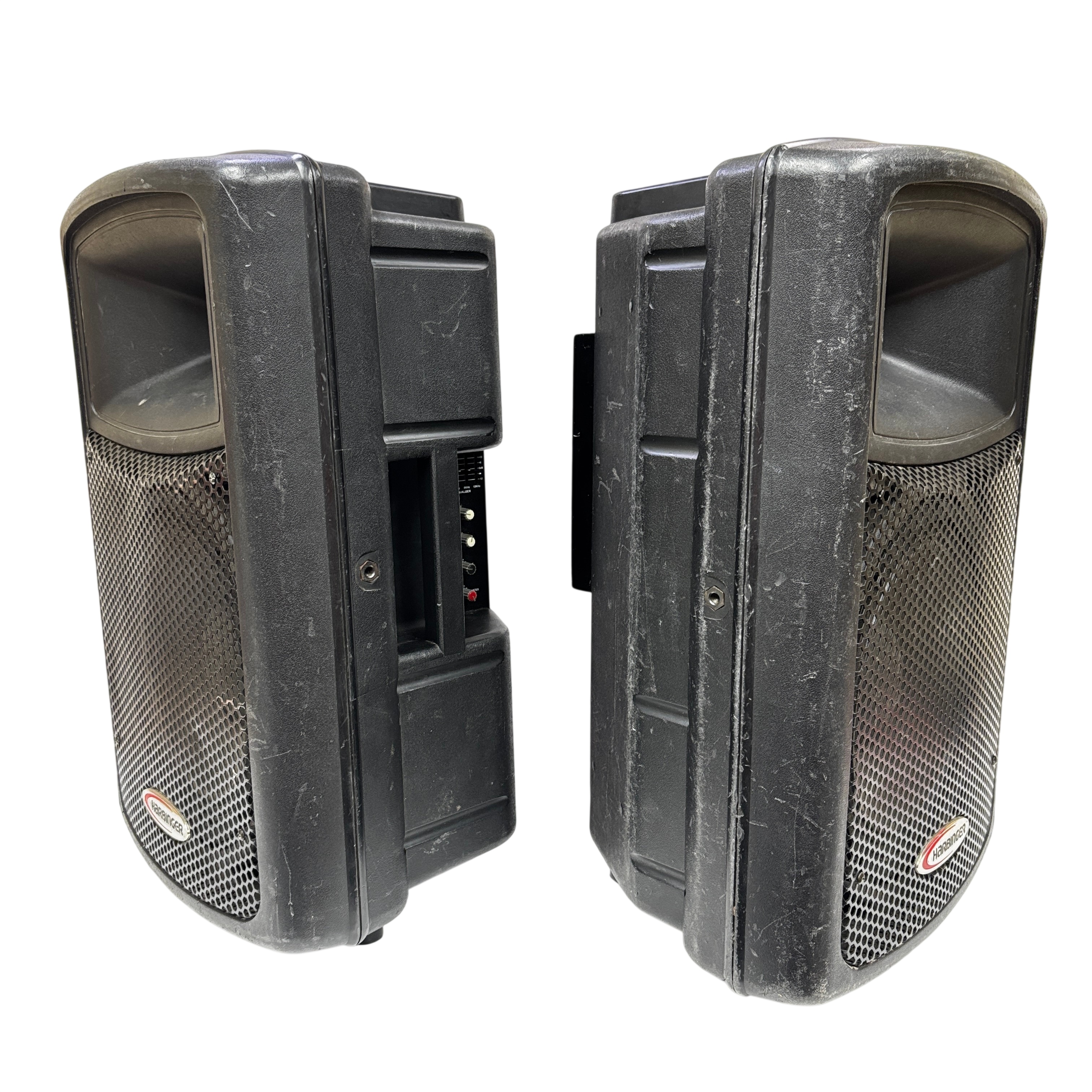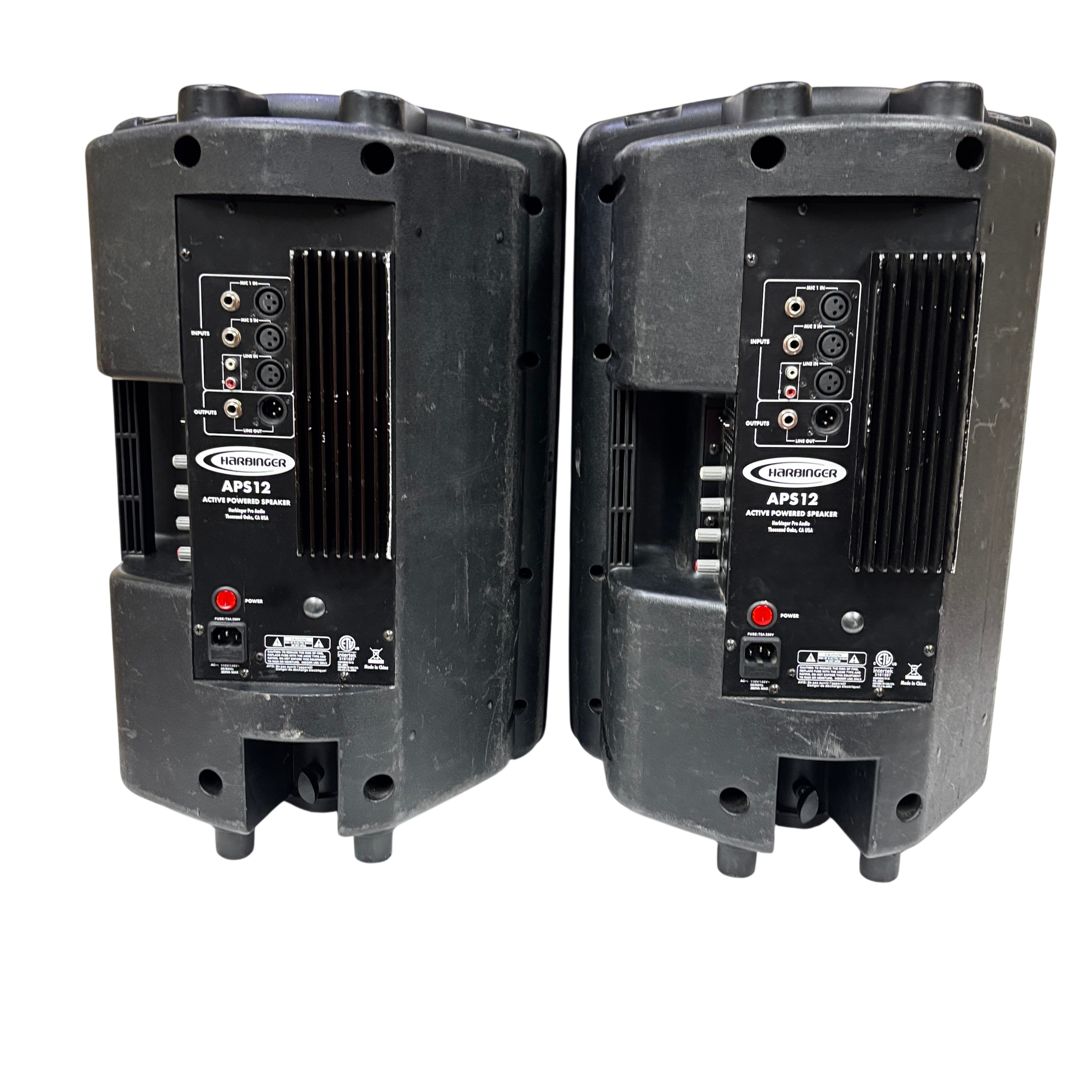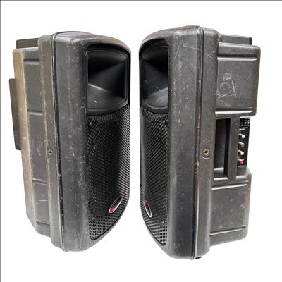 These Harbinger APS12 Active Powered Speakers deliver robust sound quality suitable for various audio applications. This pair of speakers features a durable black plastic construction and versatile input options, making them ideal for live performances, DJ setups, and public speaking events. Despite visible wear, these speakers are fully functional and ready to enhance your audio experience.