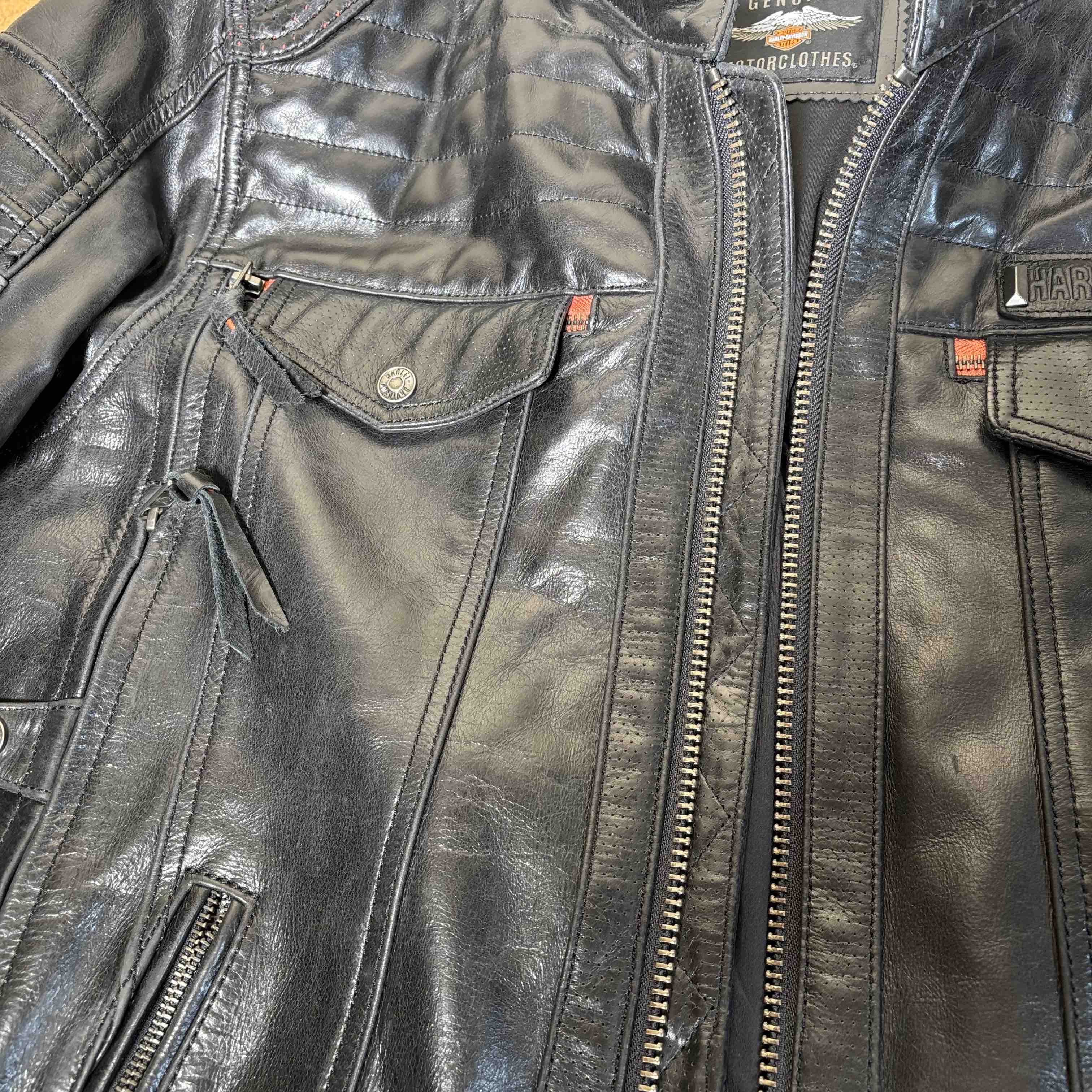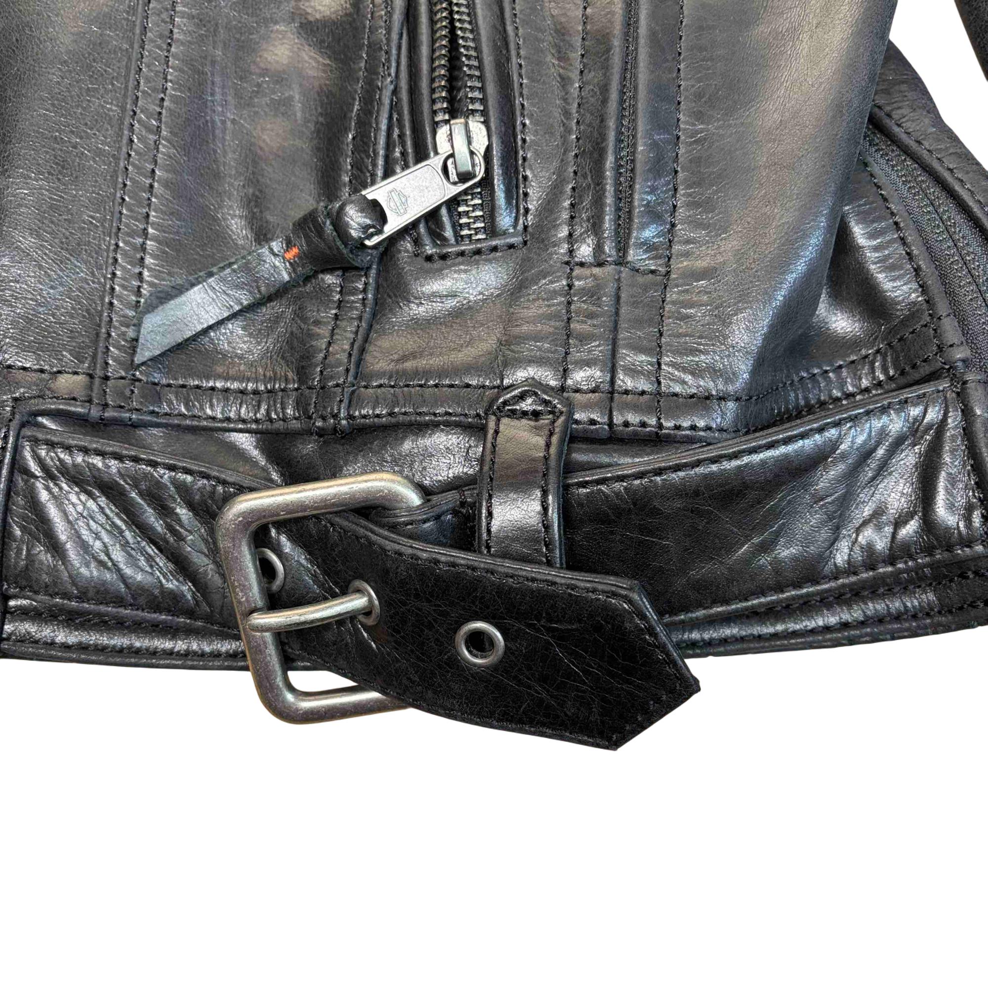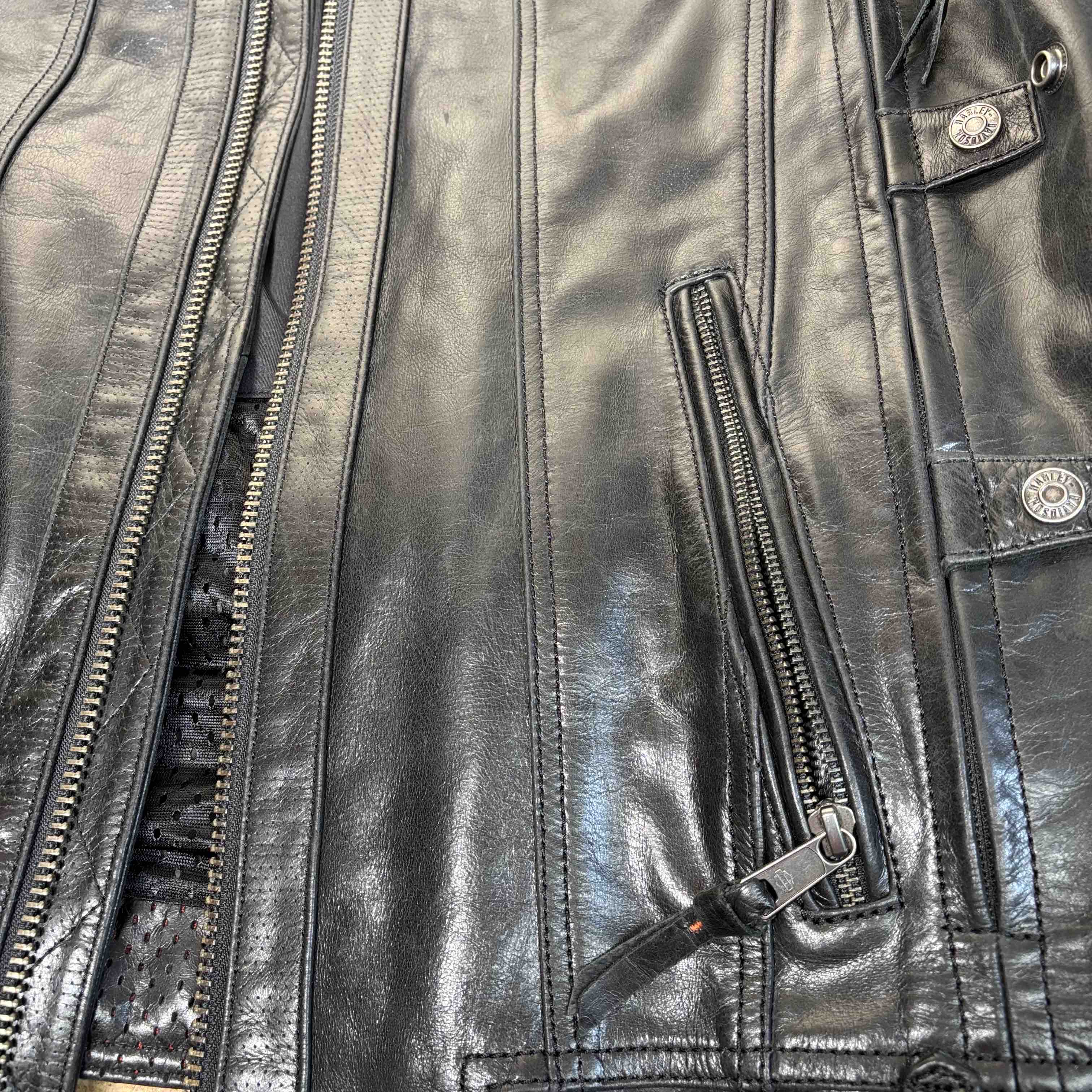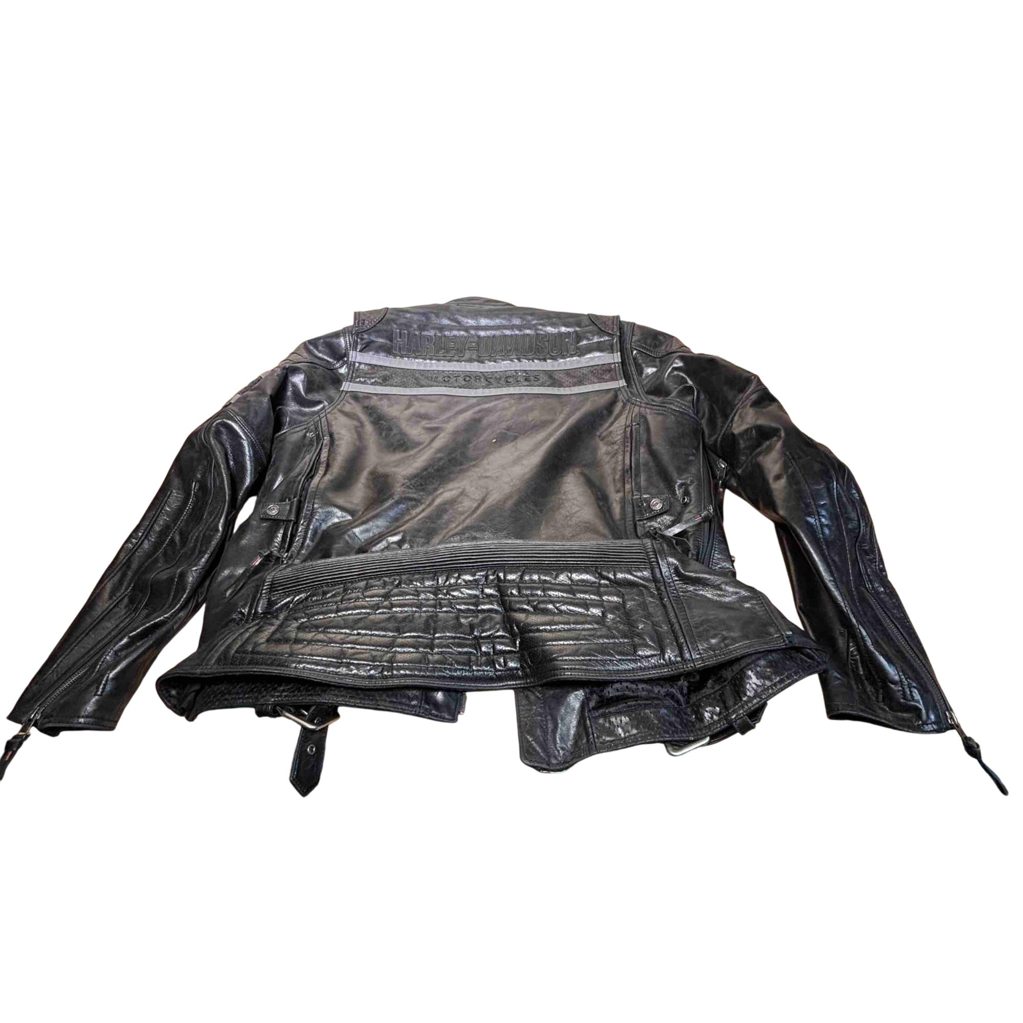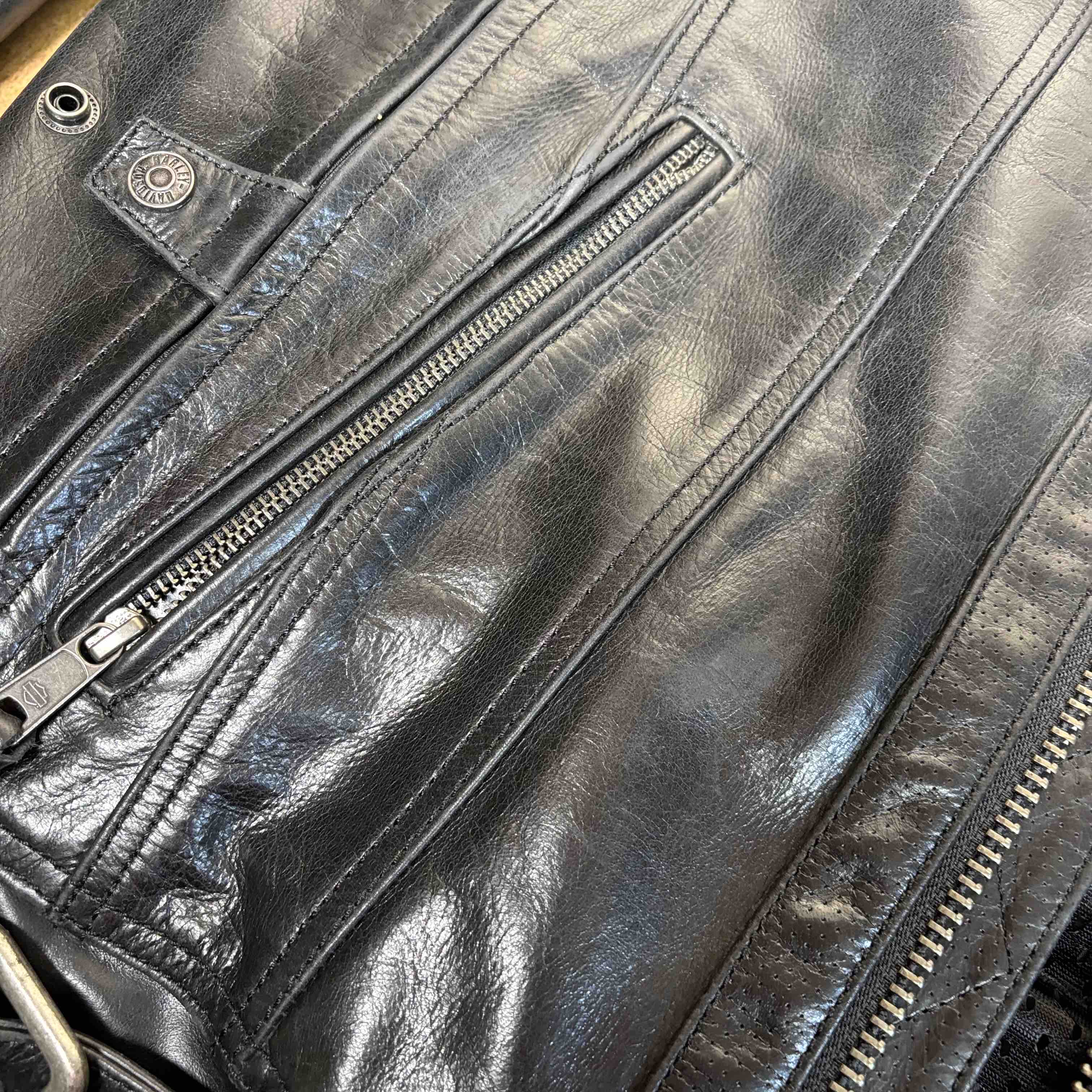 Ride in iconic style and superior comfort with the Harley-Davidson Triple Vent System Wick Twister Leather Jacket. Crafted from genuine black leather, this motorcycle jacket offers excellent ventilation, rugged durability, and standout details like branded snaps, buckles, and silver zippers. A must-have for Harley enthusiasts, its perfect for hitting the road or elevating your everyday look.