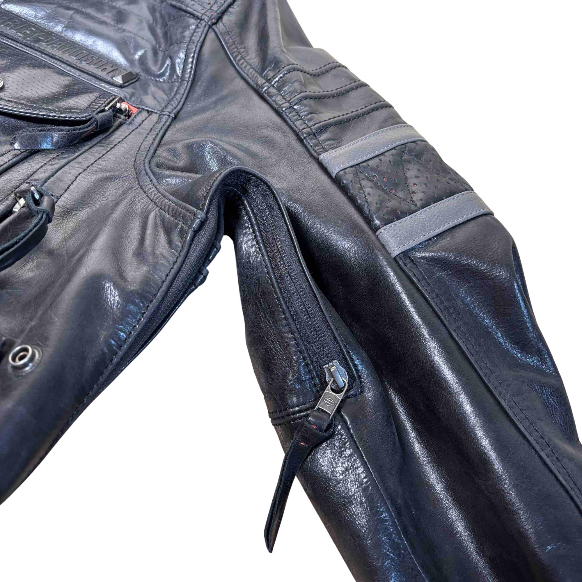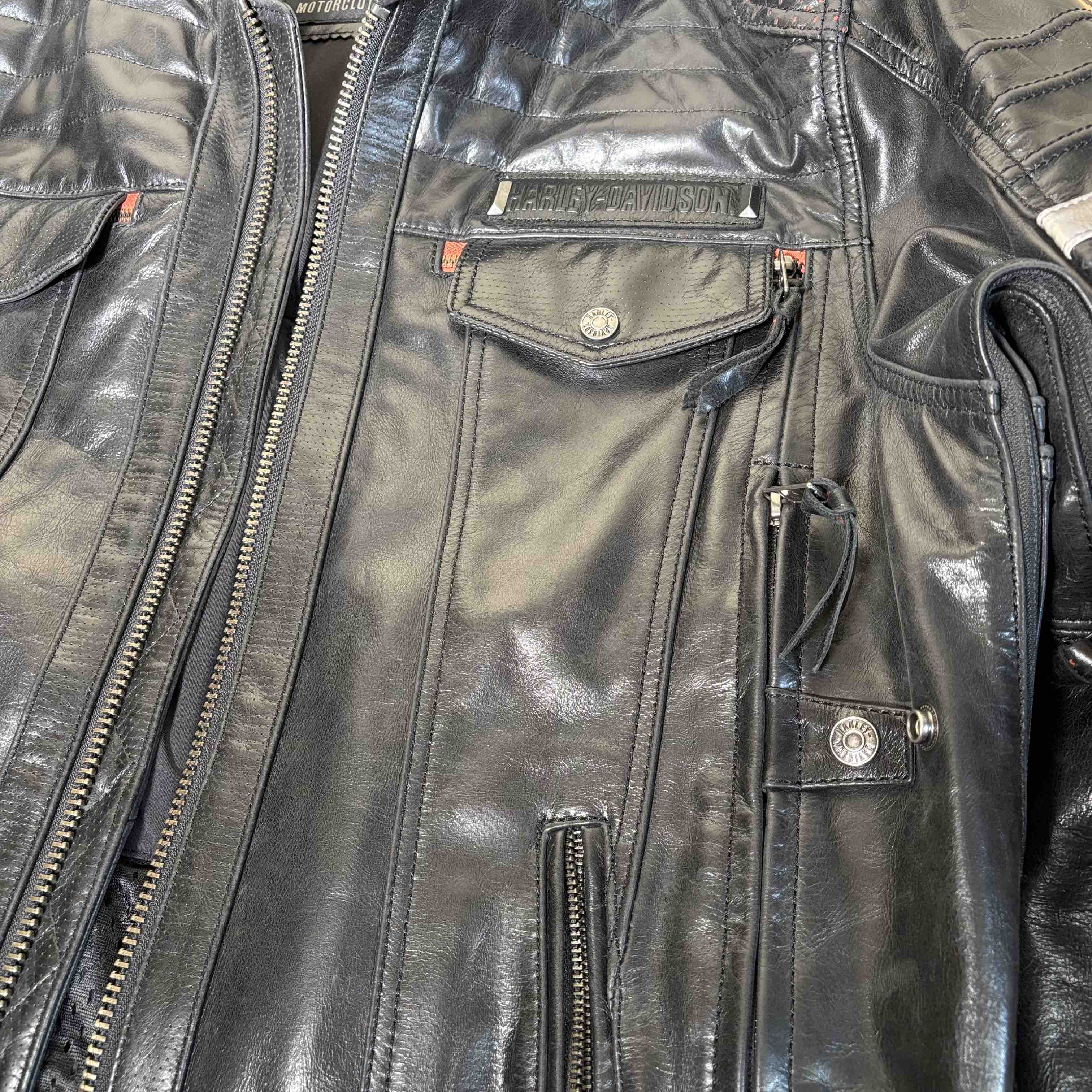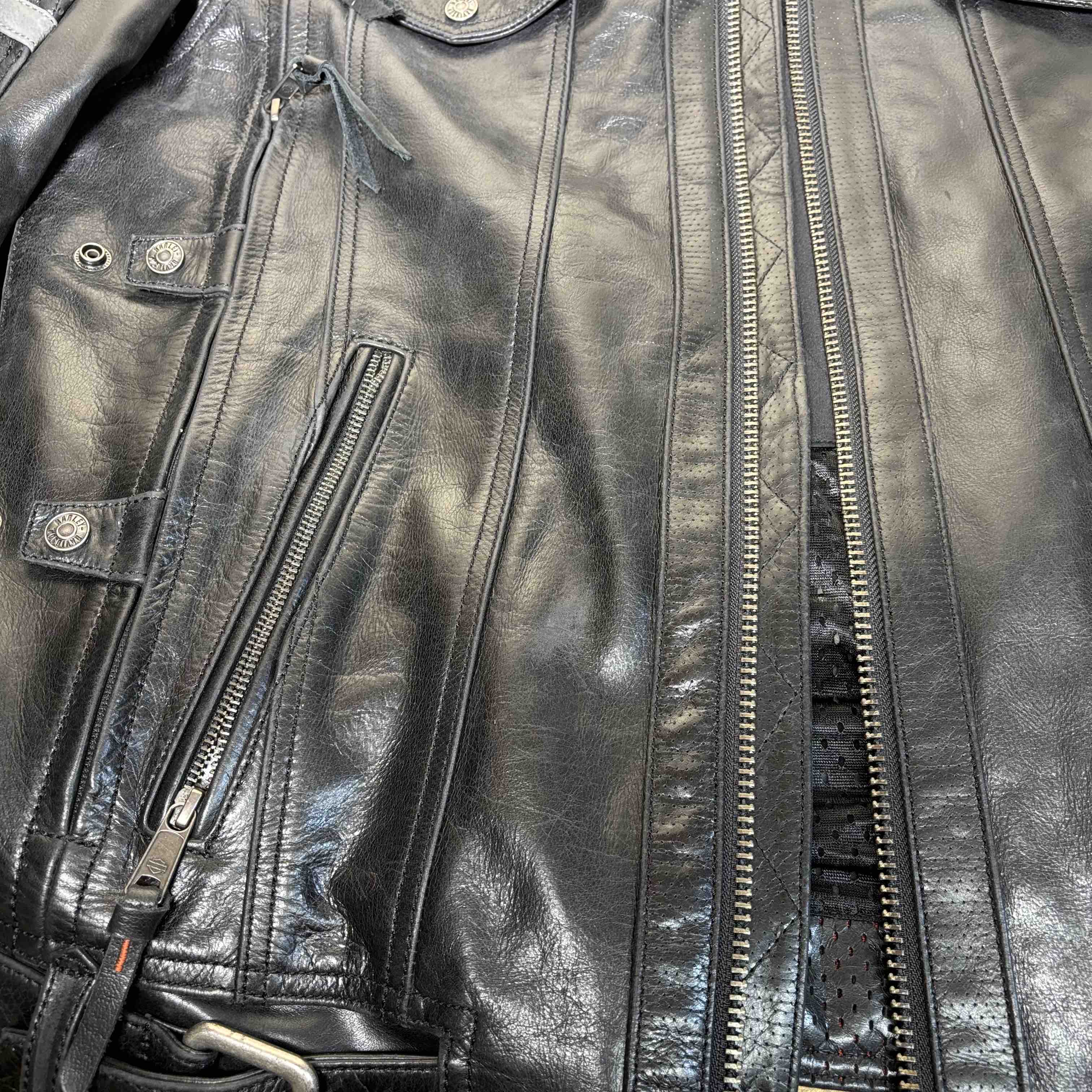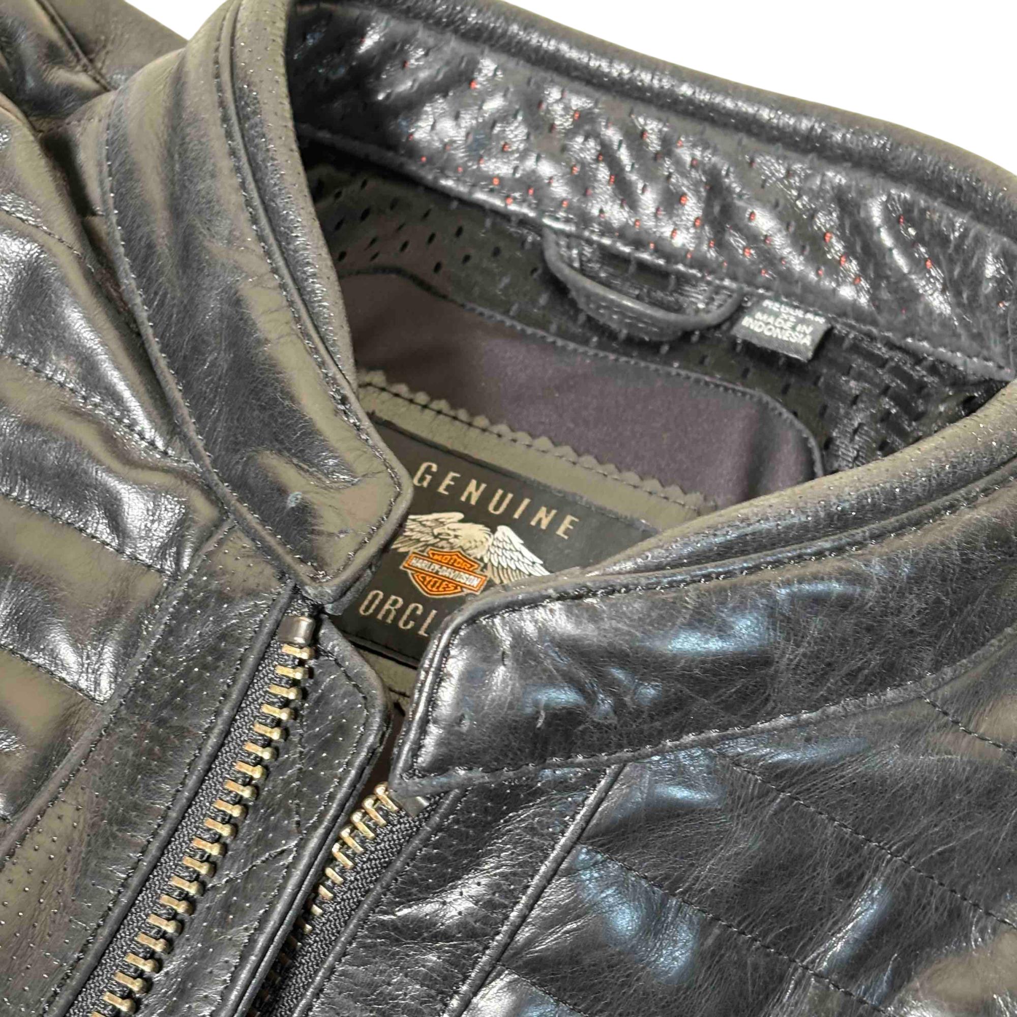 Ride in iconic style and superior comfort with the Harley-Davidson Triple Vent System Wick Twister Leather Jacket. Crafted from genuine black leather, this motorcycle jacket offers excellent ventilation, rugged durability, and standout details like branded snaps, buckles, and silver zippers. A must-have for Harley enthusiasts, its perfect for hitting the road or elevating your everyday look.