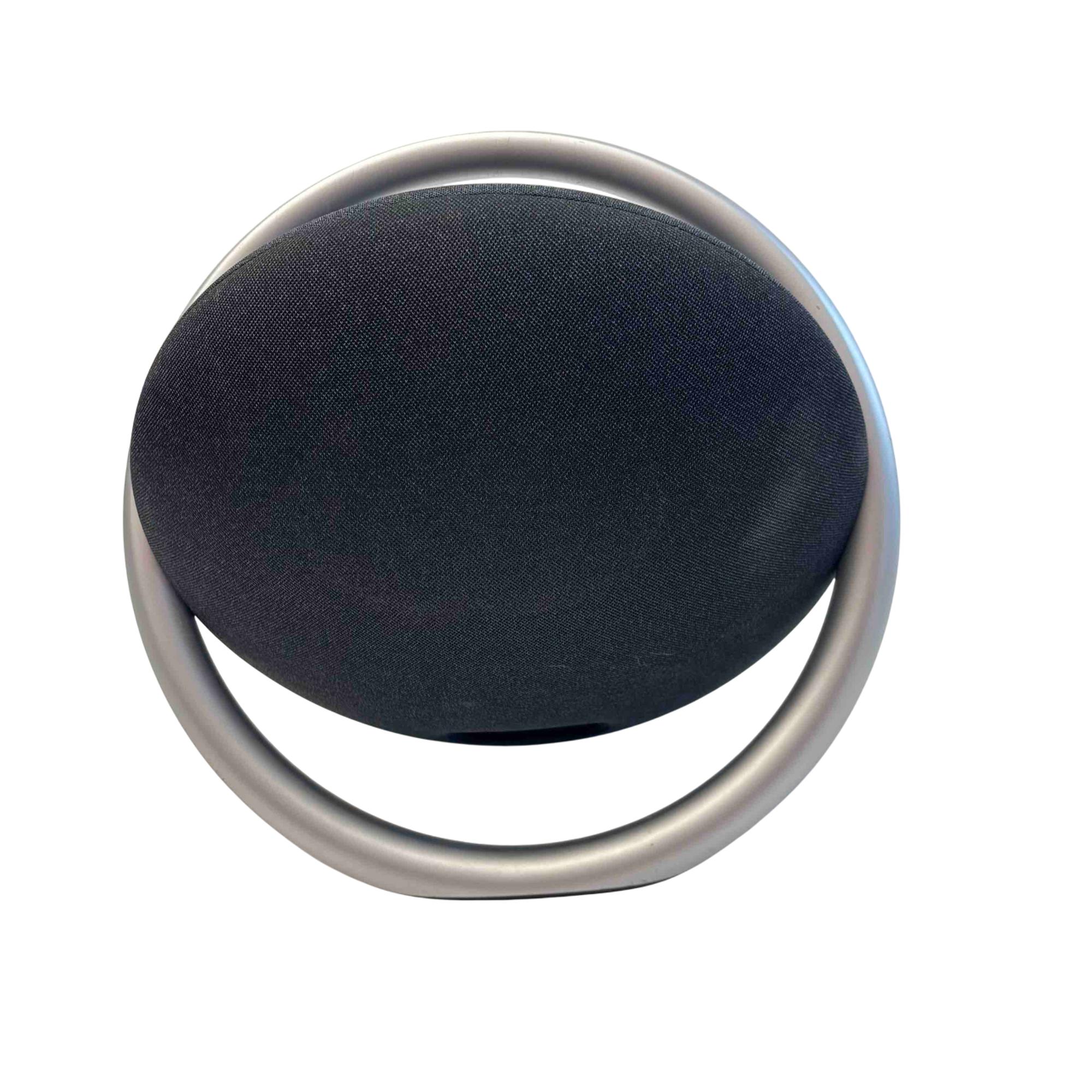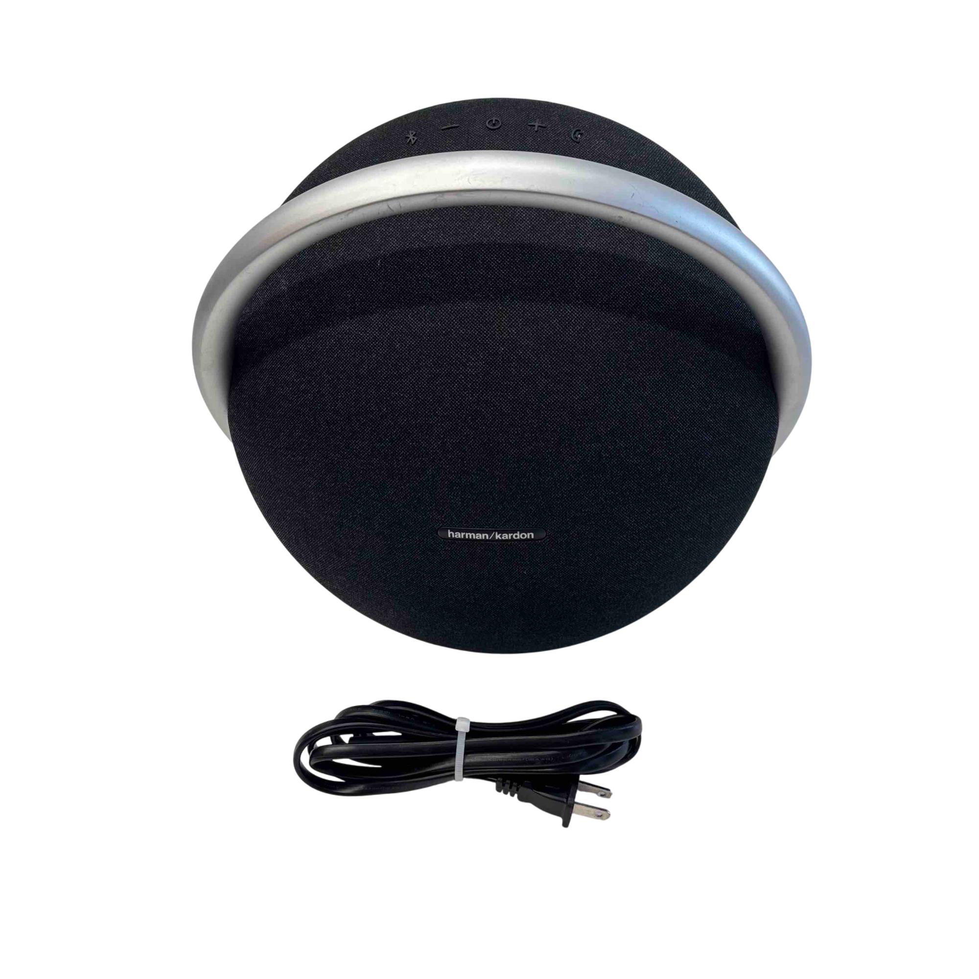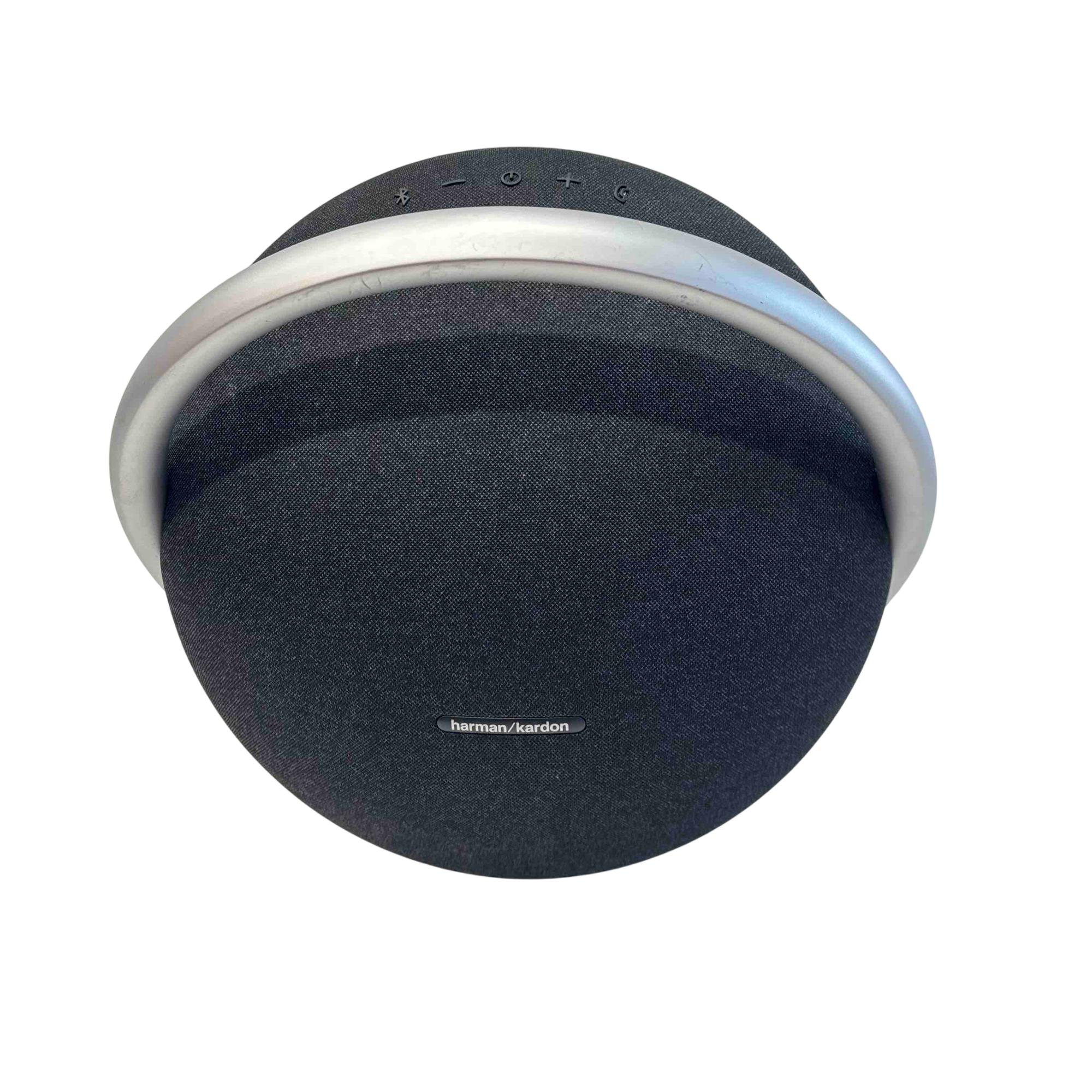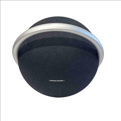 Harman Kardon Onyx Studio 8 Portable Bluetooth Speaker, Black features a sleek black design with a distinctive silver handle and ring, delivering premium audio quality. This wireless speaker offers rich, immersive sound and portability, making it ideal for both indoor and outdoor use. Engineered by Harman Kardon, it combines stylish aesthetics with powerful performance for an exceptional listening experience.